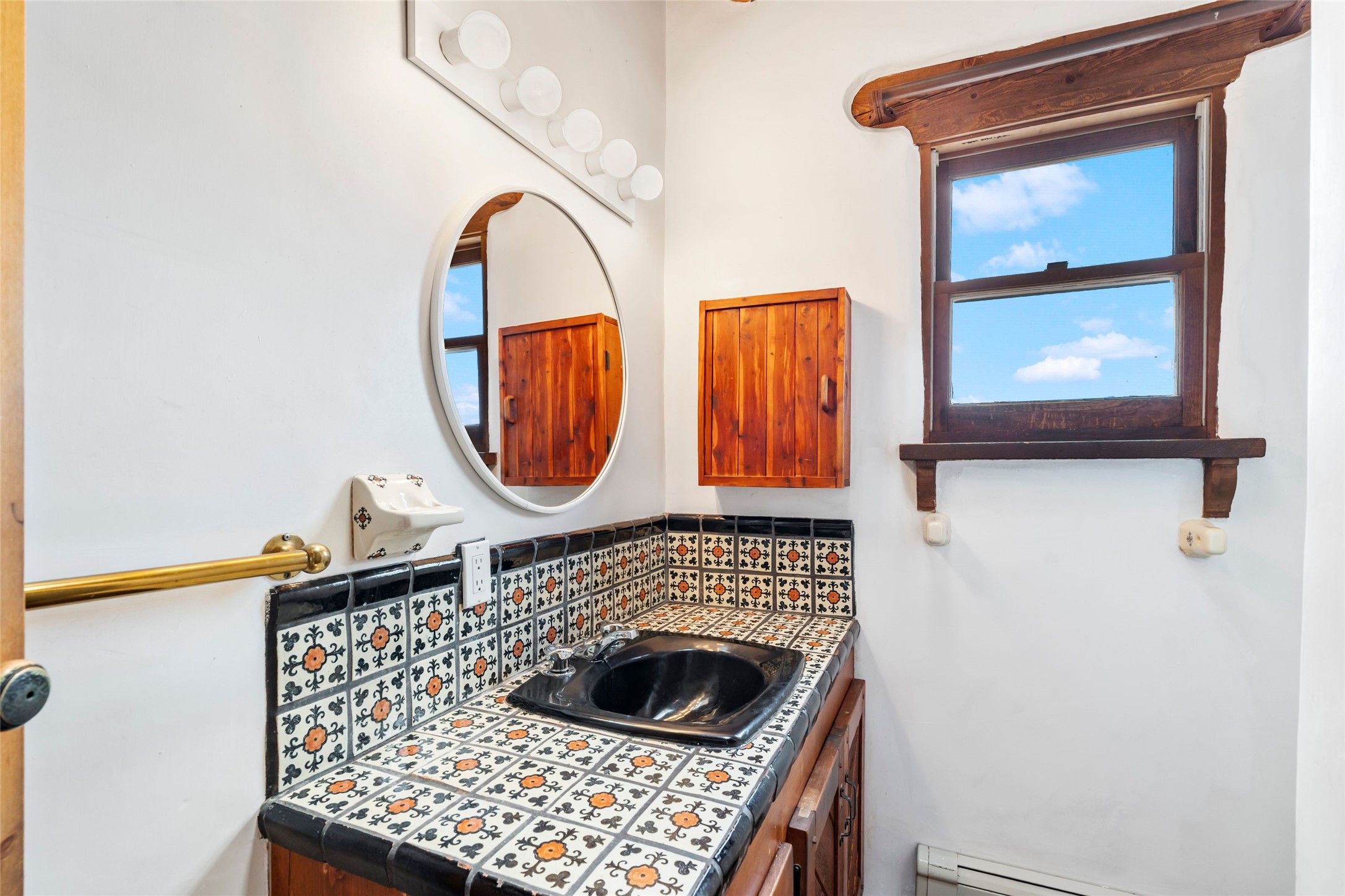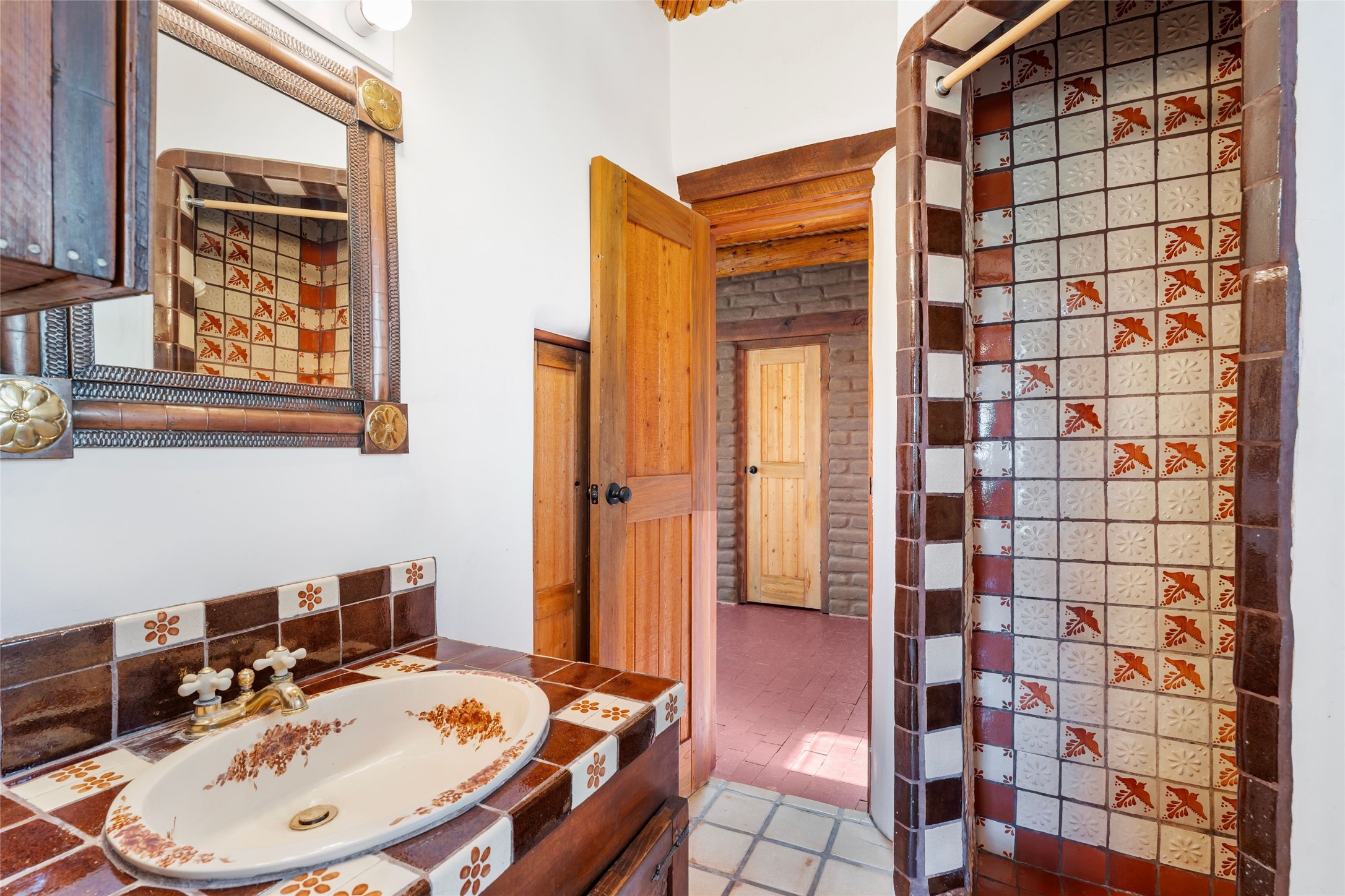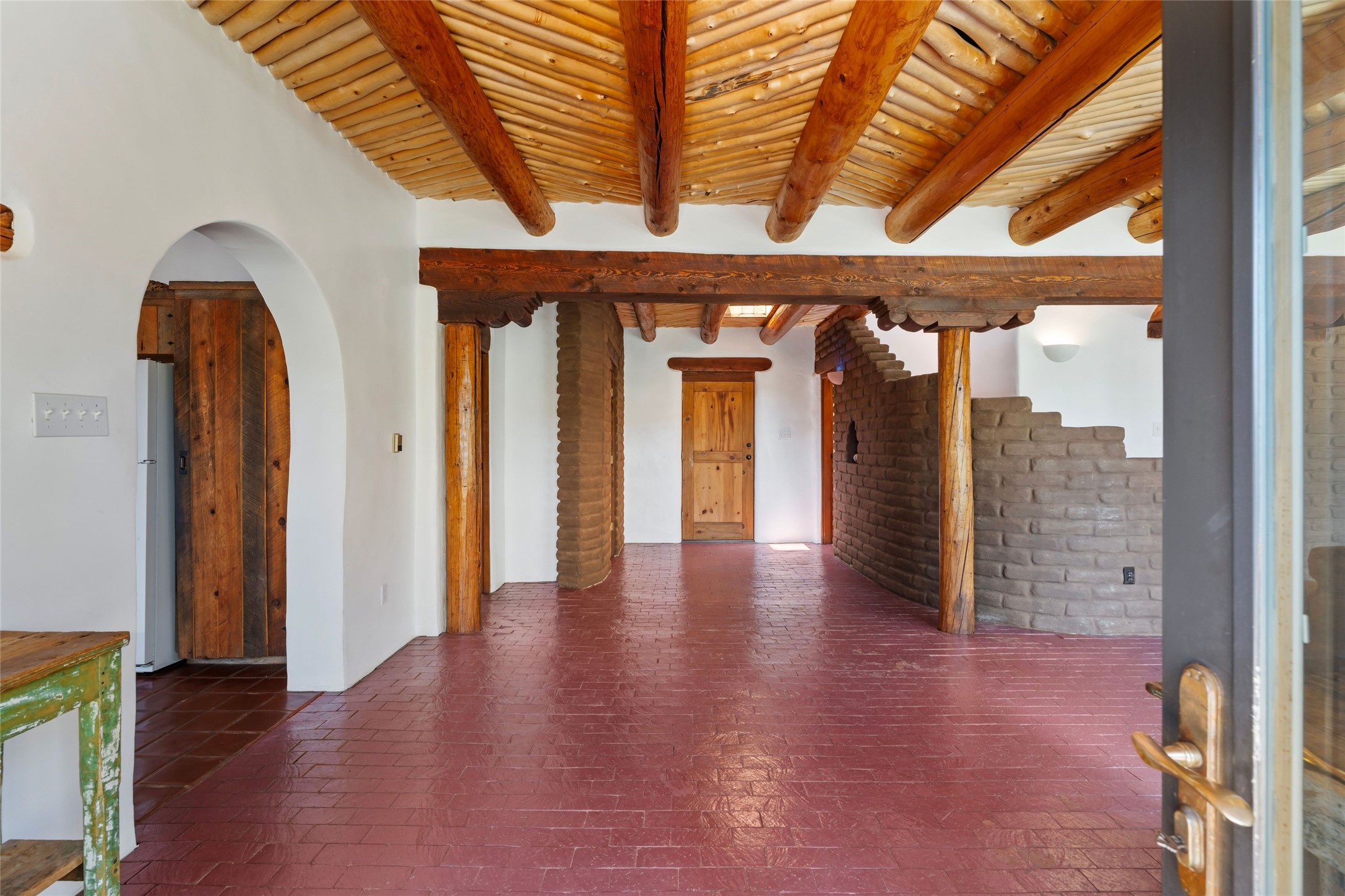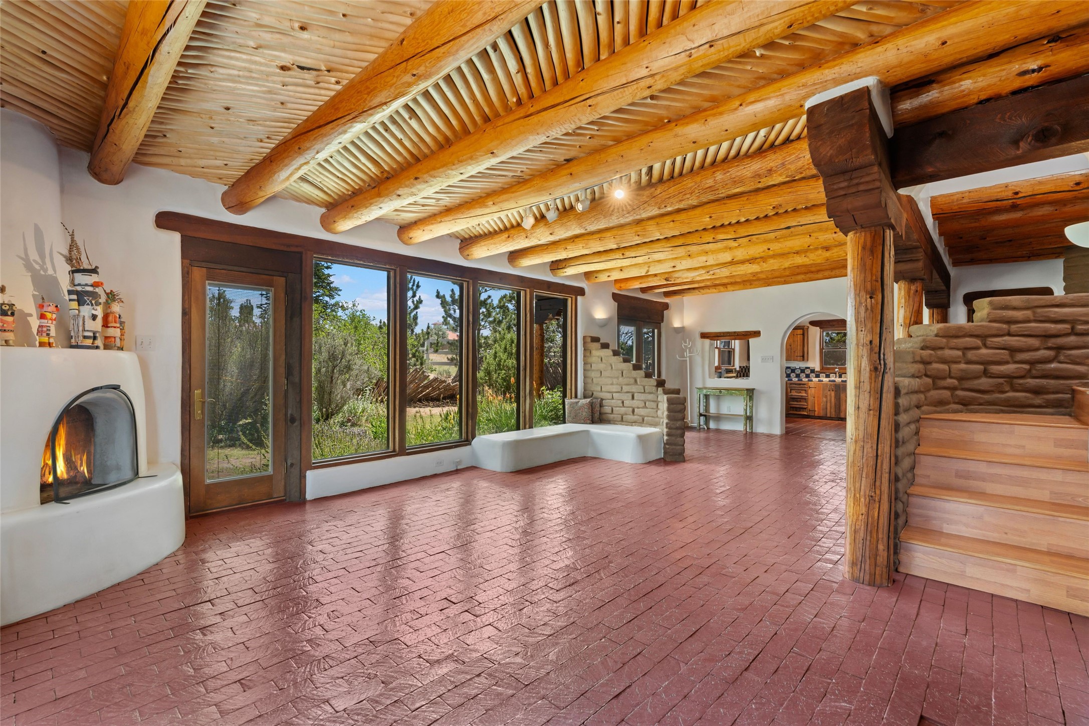 Sited on two and a half acres in a pastoral setting with pretty Sangre de Cristo mountain views, this charming Pueblo style adobe home offers traditional architectural details such as beautiful wood ceilings of vigas and latillas, also coved ceilings with vigas, plaster walls, solid wood doors, wooden lintels, brick and Saltillo tile floors, Talavera tile, and a kiva fireplace. The property features beautiful large pine trees, an enclosed yard with pretty plantings and lovely flower gardens, and a synthetic wood deck. The owner has added an art studio, which has blackout window coverings, so it can be used as a dark room as well. The original infrastructure was upgraded, the electrical system, new mechanical room added with hot water tank and boiler, roof and stucco, and the well was recently maintained with new pressure tanks installed. There's also a small horse barn on the lot.