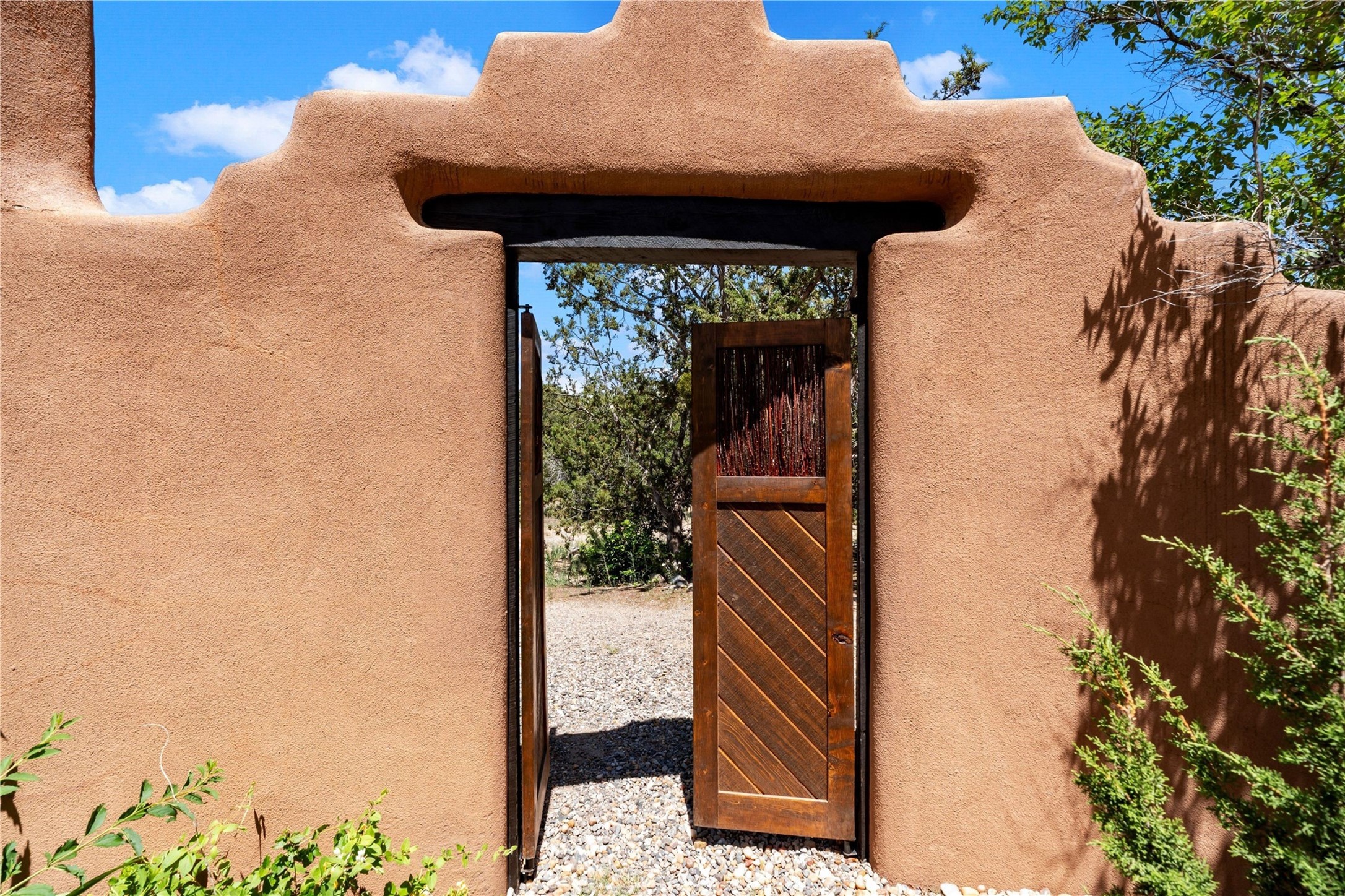 Sited on two and a half acres in a bucolic rural setting with pretty Sangre de Cristo mountain views, this charming Pueblo style adobe home offers traditional architectural details such as beautiful wood ceilings of vigas and latillas, also coved ceilings with vigas, plaster walls, solid wood doors, wooden lintels, brick and Saltillo tile floors, Talavera tile, and a kiva fireplace. The property features beautiful large pine trees, an enclosed yard with perennial plantings and lovely flower gardens, and a synthetic wood deck. The studio space is fitted with blackout window coverings, so it can be used as a dark room as well. The original infrastructure has been upgraded: the electrical system, new mechanical room with boiler and water heater, roof and stucco, and the well was recently maintained with new pressure tanks installed. There's also a small horse barn on the lot. Quintessential Santa Fe!