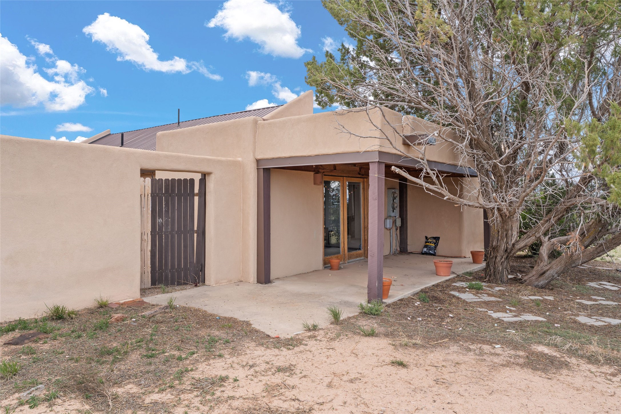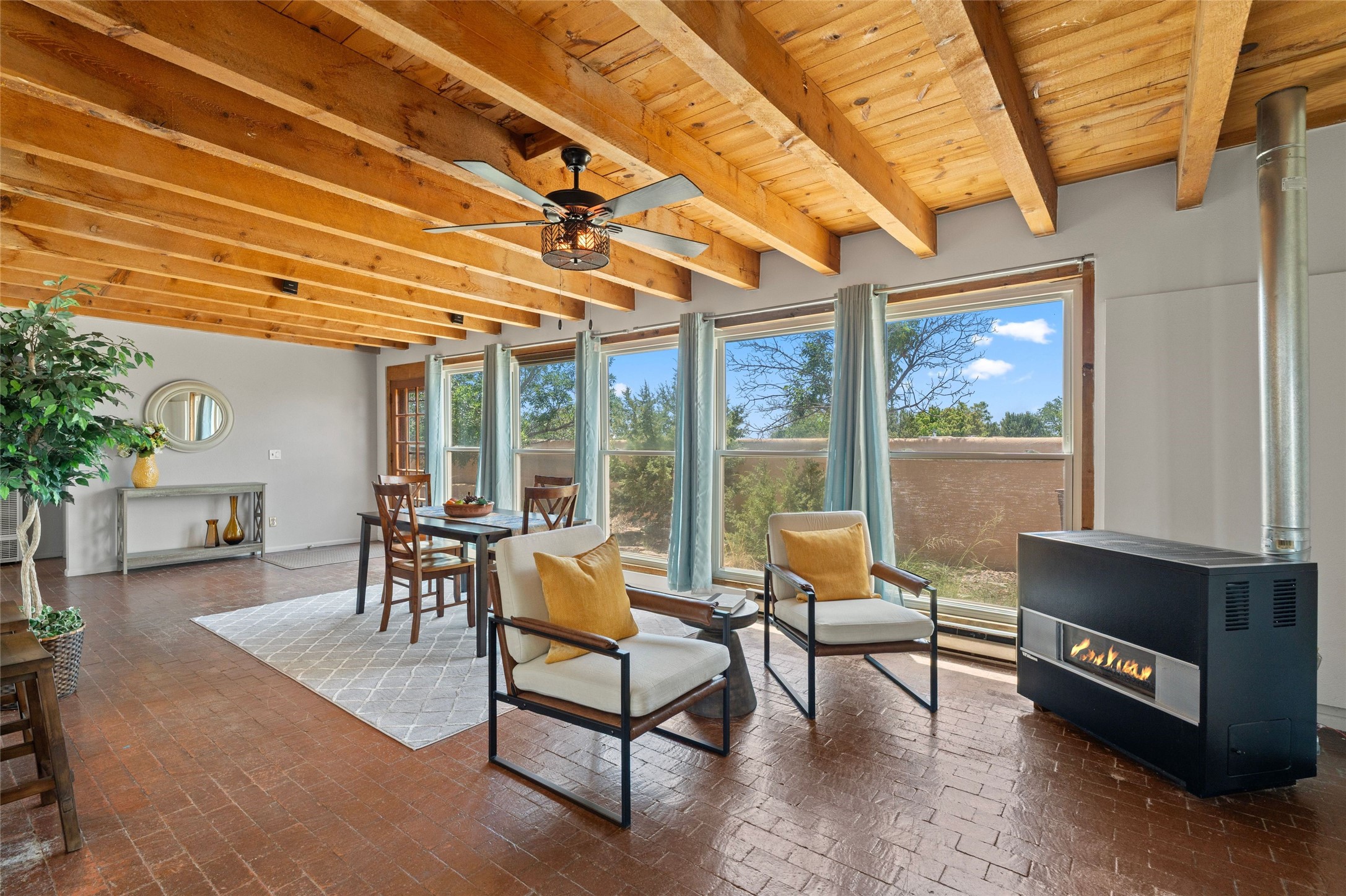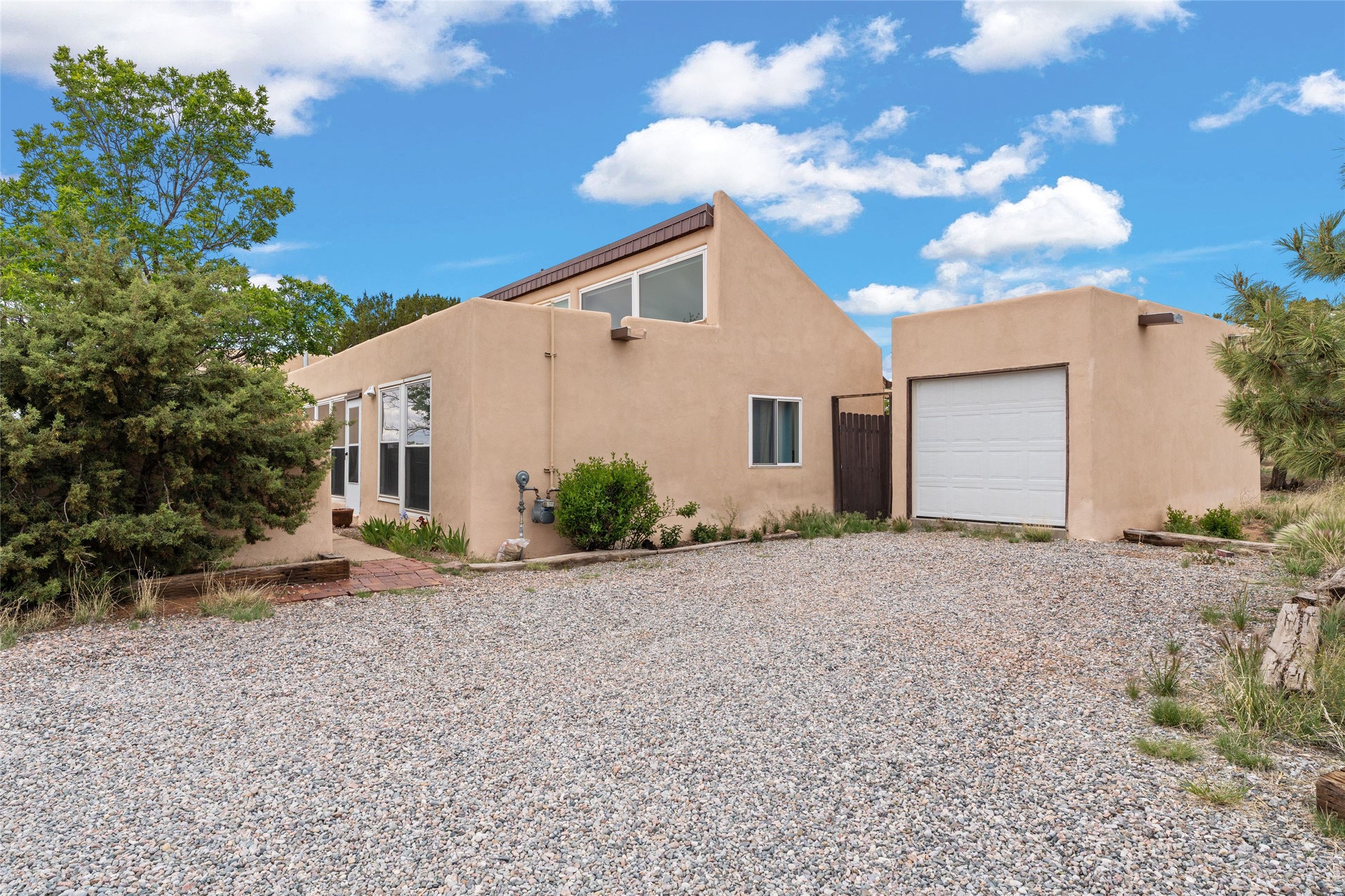 Set on 1.66 acres with peaceful rural surroundings, this classic Santa Fe home blends Southwestern charm with versatile living space just 17 minutes from the historic Plaza. Featuring 2 bedrooms and 2 bathrooms across 1,626 square feet, the home showcases signature regional details including brick floors, wood-beamed ceilings, and an open-concept layout that invites natural light and easy flow between living, dining, and kitchen areas. The kitchen offers warm wood cabinetry, granite countertops, and a breakfast bar that opens to the main living space -- ideal for everyday living or entertaining. French doors from a flexible bonus room lead outside, creating a perfect spot for a home office, art studio, or reading nook. Outdoor living is equally inviting with natural landscaping, mature trees, and room to expand gardens or create patios to suit your lifestyle. A detached one-car garage provides additional storage or workshop potential. Residents enjoy a shared well, a new septic tank installed in 2023, and high-speed internet access. Located just 3.8 miles from Eldorado's shopping and dining conveniences, this property combines the quiet of a country setting with proximity to Santa Fe amenities. Annual HOA dues of $610 cover road maintenance and community upkeep. This property offers a rare opportunity to enjoy Santa Fe's distinctive character and natural beauty in a serene, spacious setting -- ready to make your own.