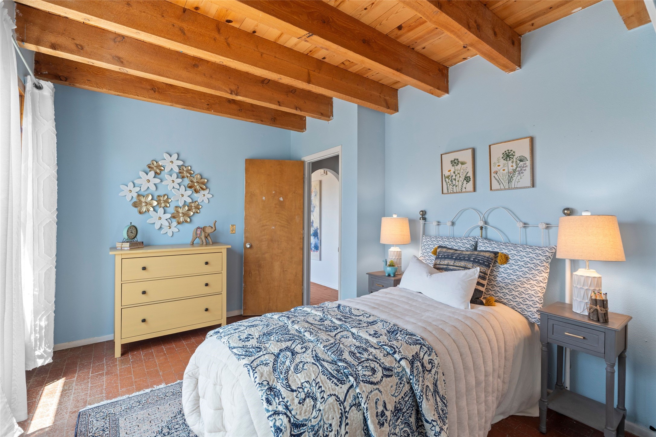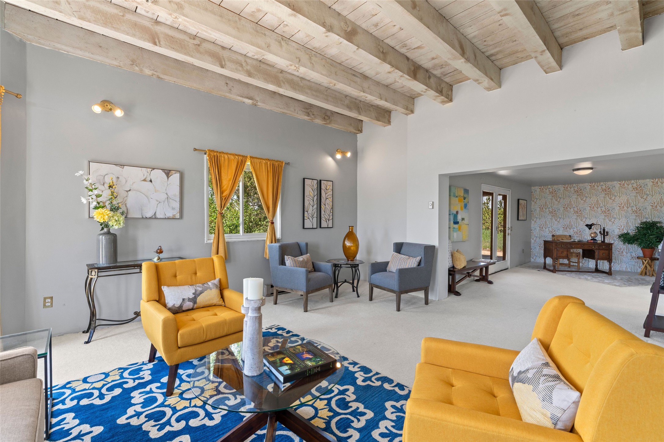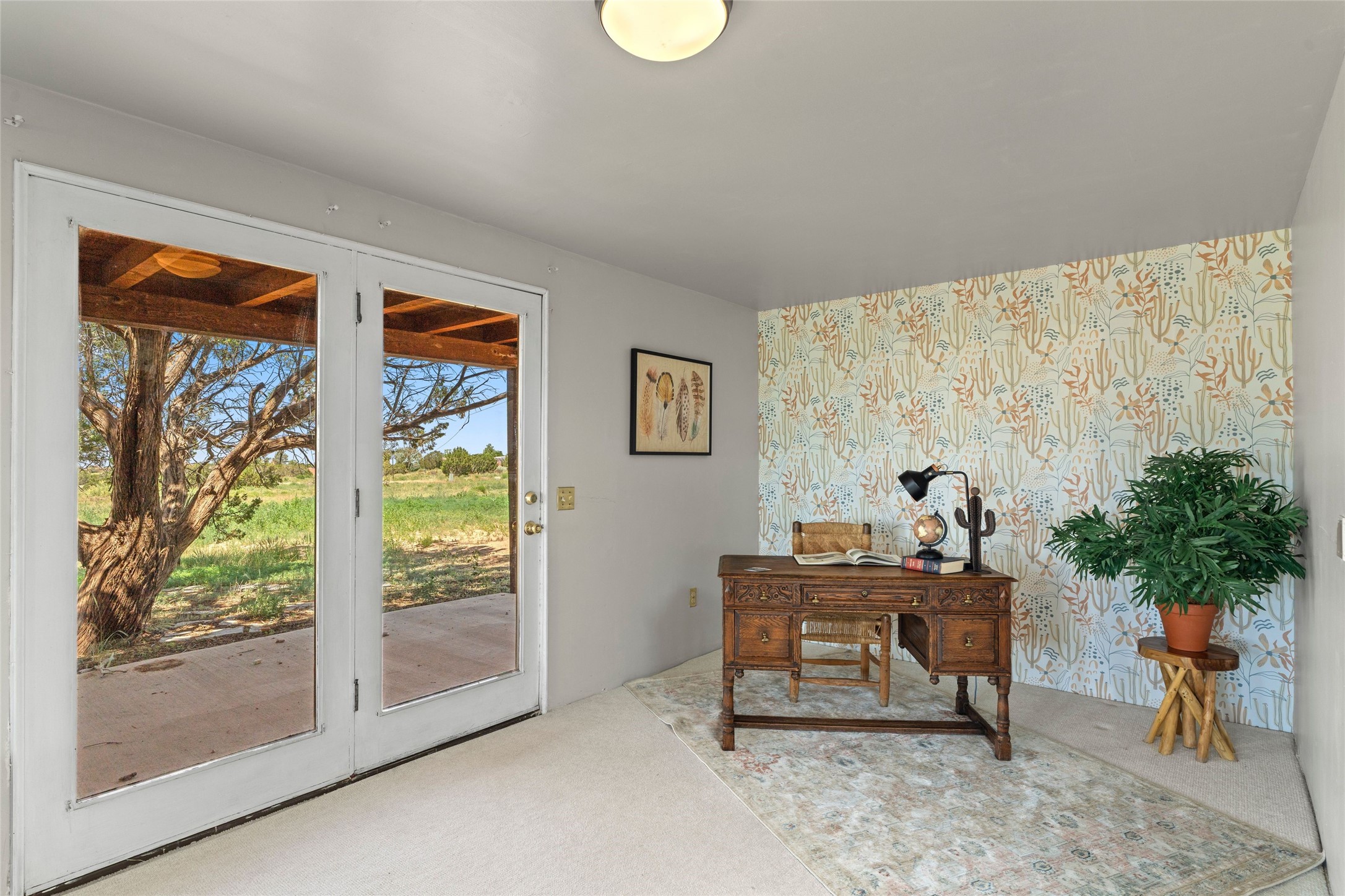Set on 1.66 acres with peaceful rural surroundings, this classic Santa Fe home blends Southwestern charm with versatile living space just 17 minutes from the historic Plaza. Featuring 2 bedrooms and 2 bathrooms across 1,626 square feet, the home showcases signature regional details including brick floors, wood-beamed ceilings, and an open-concept layout that invites natural light and easy flow between living, dining, and kitchen areas. The kitchen offers warm wood cabinetry, granite countertops, and a breakfast bar that opens to the main living space -- ideal for everyday living or entertaining. French doors from a flexible bonus room lead outside, creating a perfect spot for a home office, art studio, or reading nook. Outdoor living is equally inviting with natural landscaping, mature trees, and room to expand gardens or create patios to suit your lifestyle. A detached one-car garage provides additional storage or workshop potential. Residents enjoy a shared well, a new septic tank installed in 2023, and high-speed internet access. Located just 3.8 miles from Eldorado's shopping and dining conveniences, this property combines the quiet of a country setting with proximity to Santa Fe amenities. Annual HOA dues of $610 cover road maintenance and community upkeep. This property offers a rare opportunity to enjoy Santa Fe's distinctive character and natural beauty in a serene, spacious setting -- ready to make your own.