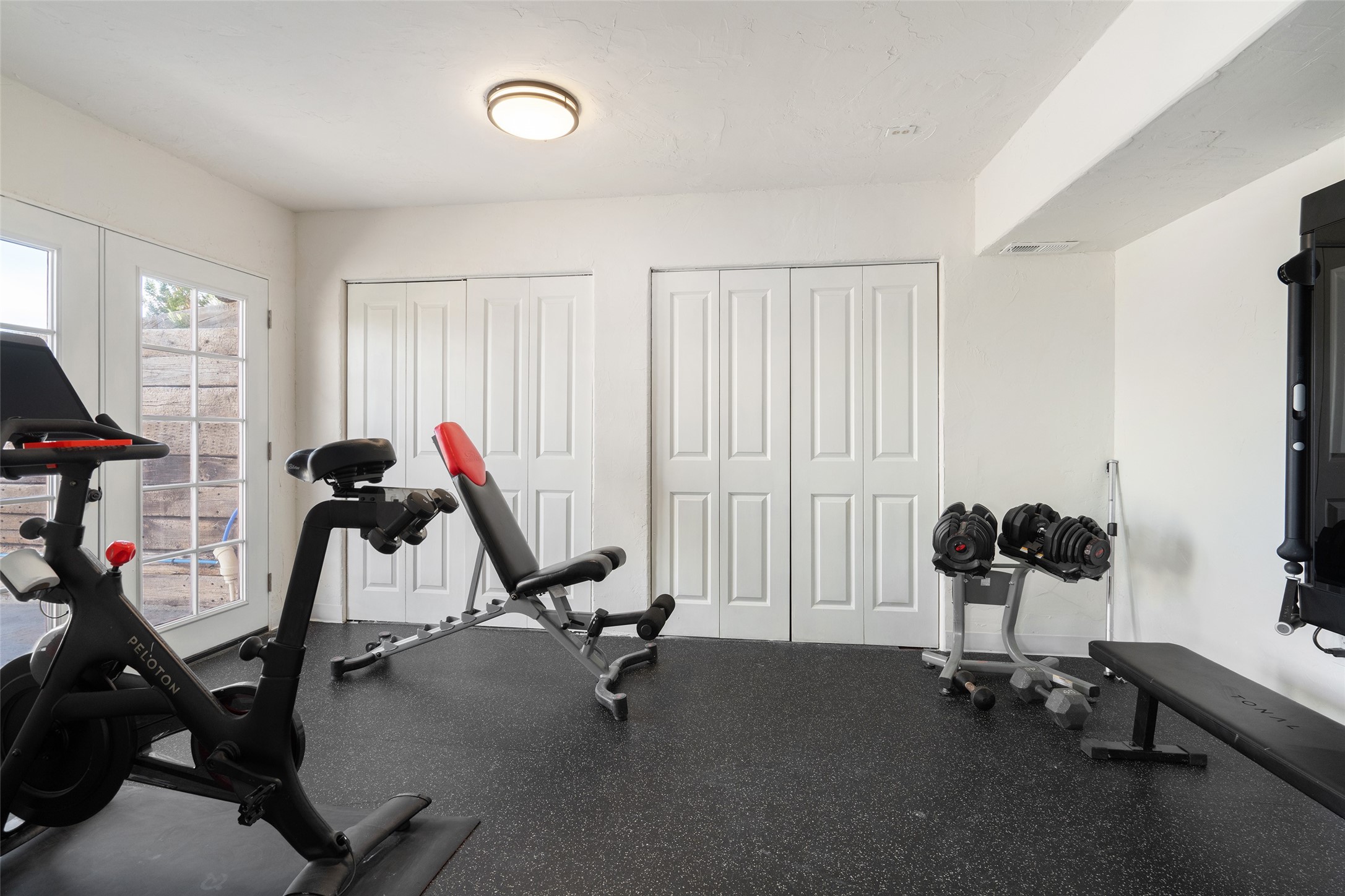 What you need to know - No HOA fees, Views for miles, Horses allowed and around 25 min to Plaza, Canyon Road, or Railyard, and 50 min from ABQ Intl Airport. This home has been renovated to accentuate traditional Santa Fe features -- walnut hardwood floors and locally hand-forged chandeliers have been added to the 10-foot ceilings with vigas and stone accent walls. The kitchen now has high-end appliances, granite countertops, and a Lacunza wood-burning stove, blending beauty and function. The open concept living, dining, and kitchen area is filled with natural light from expansive windows overlooking the surrounding landscape Talavera tile risers lead to the owner's suite, which encompasses the entire upstairs. Relax with the Mr. Steam dream shower and 2-person jetted tub surrounded by marble flooring, or watch the sunset from one of the balconies. On the main floor you'll find two bedrooms, both with outdoor access, and a shared bathroom and office space located by the entrance. Downstairs there is another bedroom, workout space, storage, laundry, meditation room with kiva and a fully equipped theater room - all of which stays with home. The rest of the space is open to your imagination - kids play room, art studio... The productive well features a new pump, cistern, and multi-stage filtration system. Programmable mini splits provide year-round comfort, while owned solar panels help keep energy costs low. The regraded and graveled driveway, along with an excavated pad, offers ample space for RVs or recreational toys, and potential for a horse barn or casita. Sitting on 16 acres of gently rolling hills dotted with juniper, mountain mahogany, and pion--it offers exceptional privacy, yet easy access to amenities.