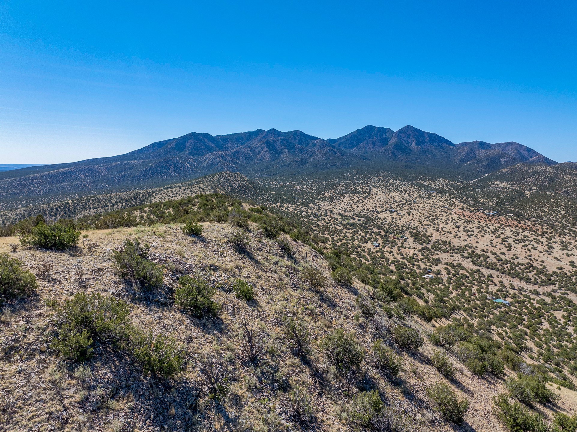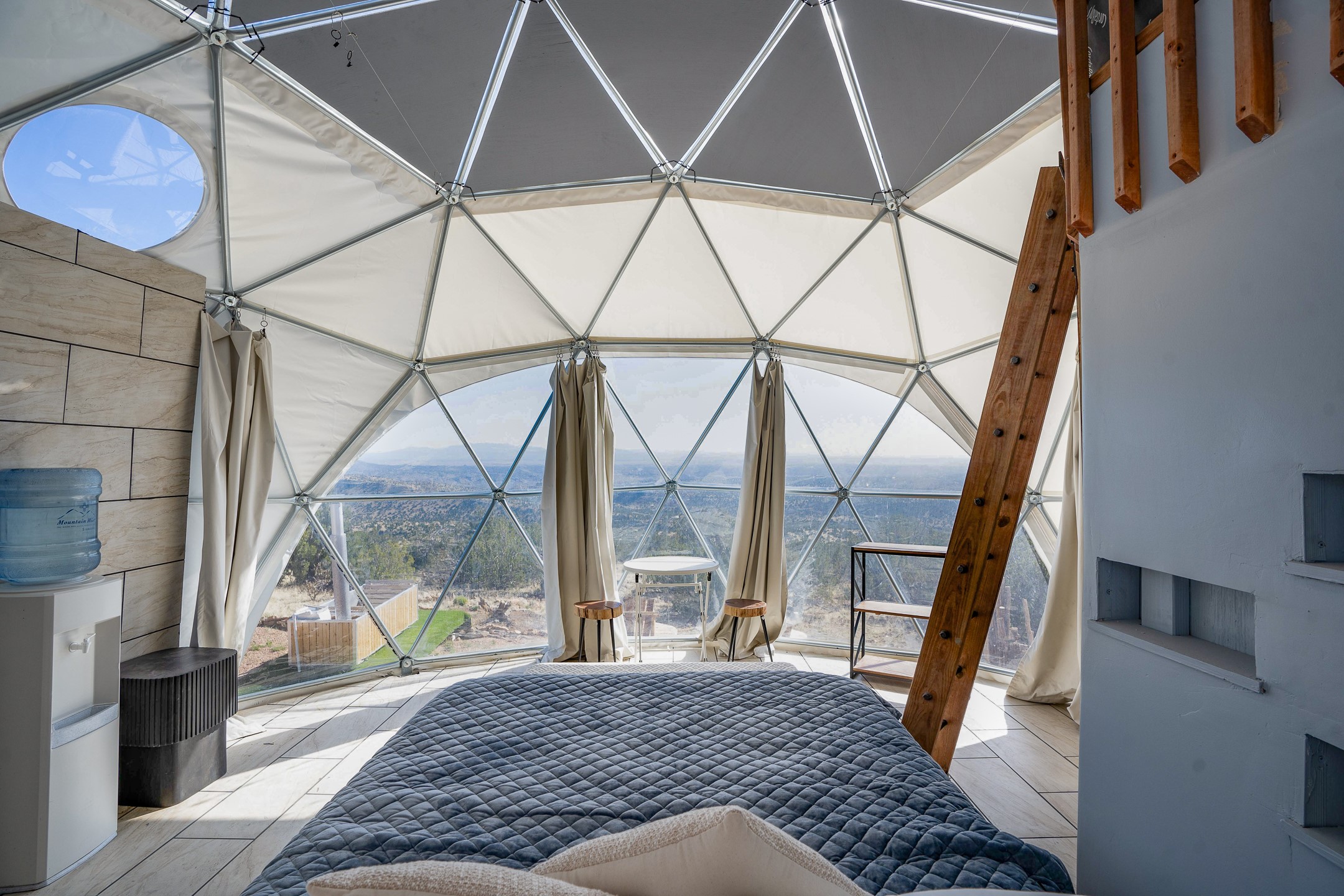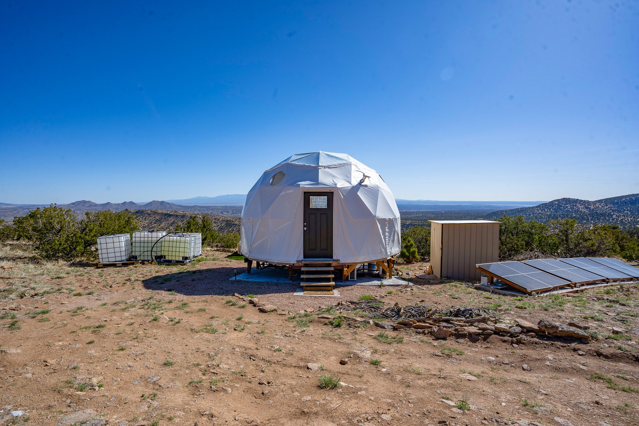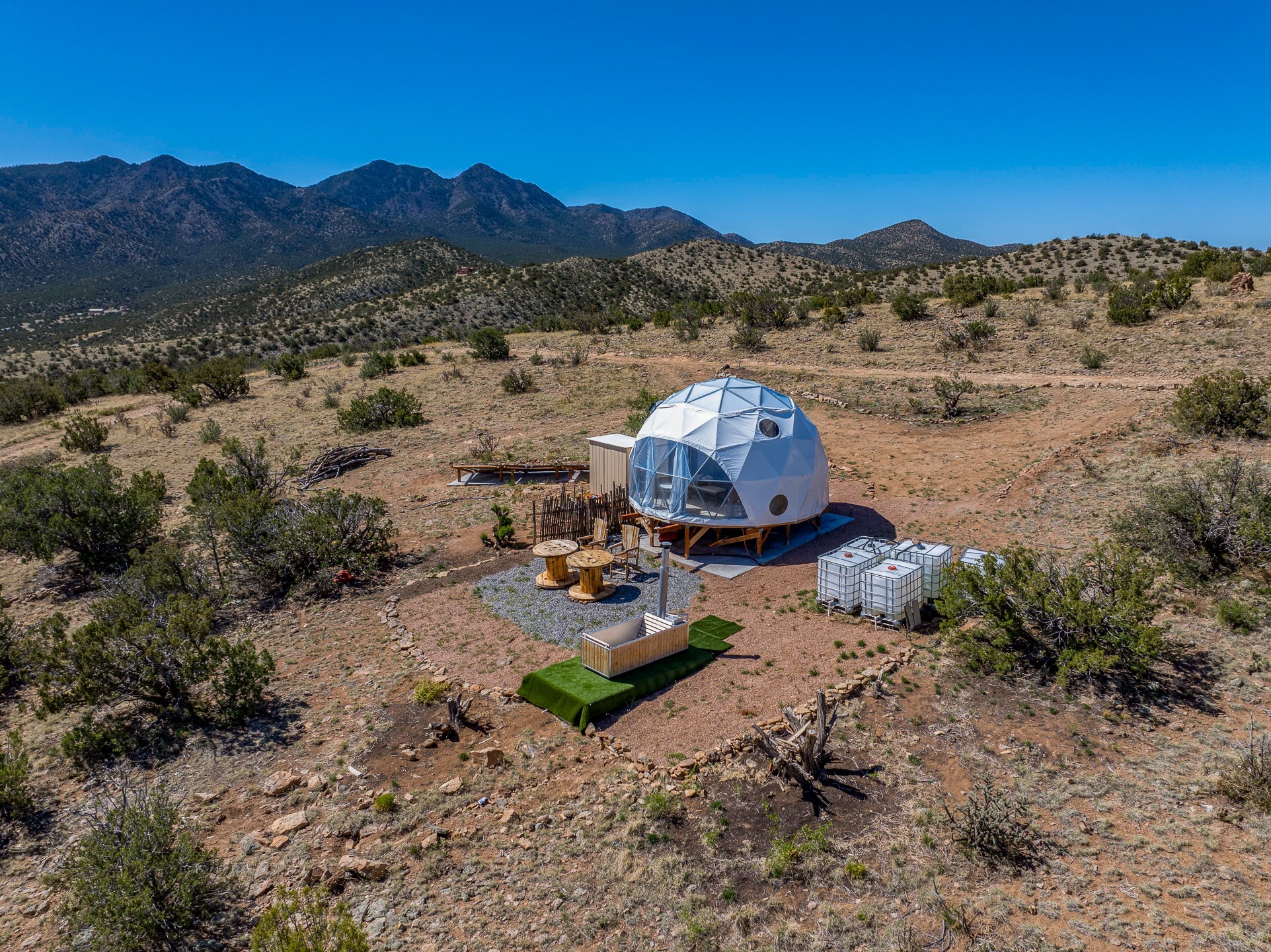 Two hundred and thirty mountain top acres with a PVC dome featuring all modern conveniences near Madrid. On two lots with two wells, this private getaway awaits the adventurous soul who wants to get above it all while still being connected. With 360 degree views from the mountain top, and the dome sited on a slope with amazing views of the Sangre de Cristo's, buyers will find this to be an incomparable view property. This far out, the Milky Way will shine bright, and the wood fired hot tub is the perfect place to stargaze from after a day of exploring the mountain. The dome has a small kitchen, bathroom, loft storage area, mini-split for heating and cooling, a luxurious glamping hideout or a cozy full time home. The solar system is modern and robust, and sewage is handled by an innovative bio-gas system. Closer than it feels, the property is just a half mile from the pavement, but that half mile is a steep and rocky climb, and a 4x4 with some clearance is recommended.