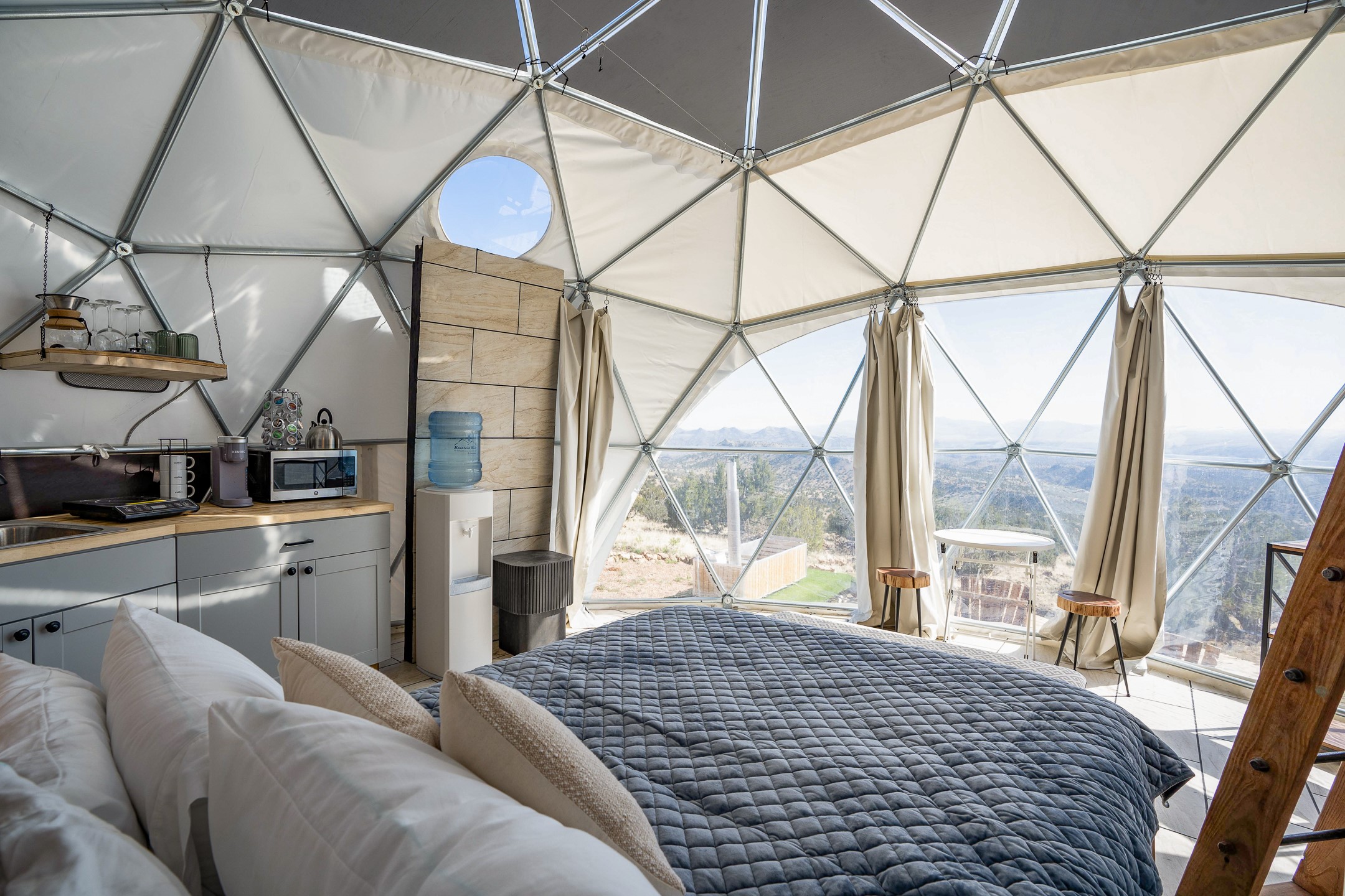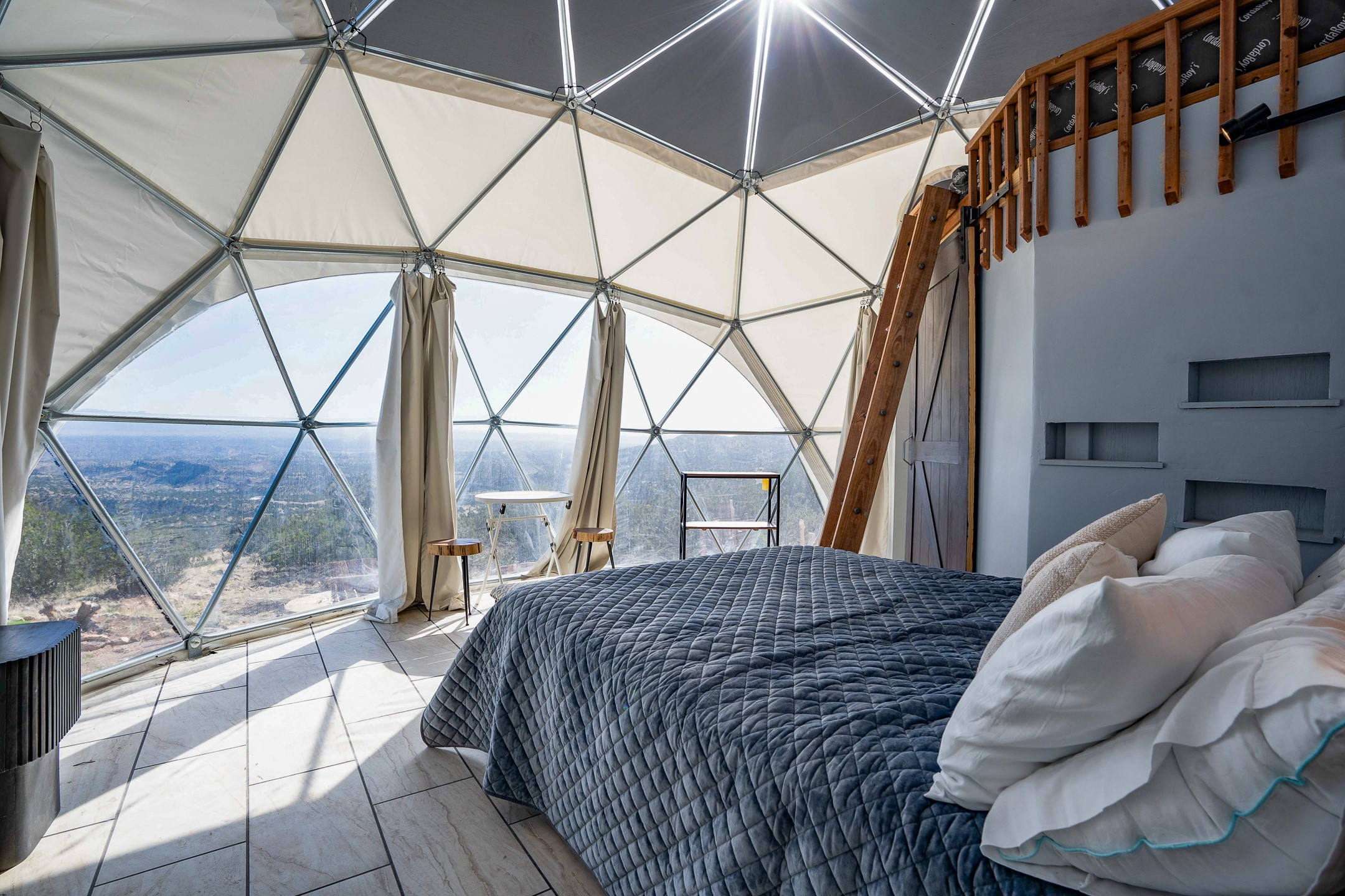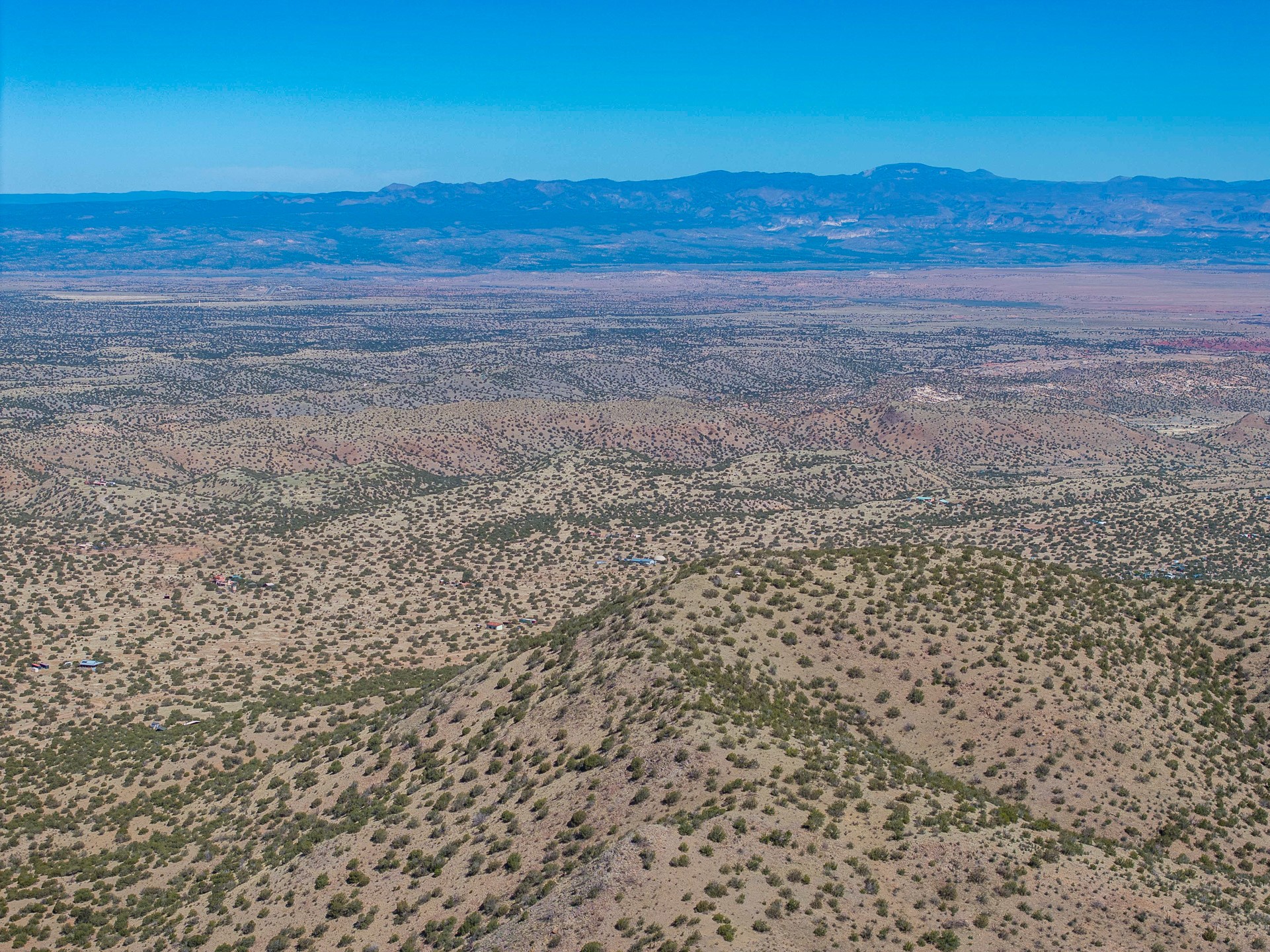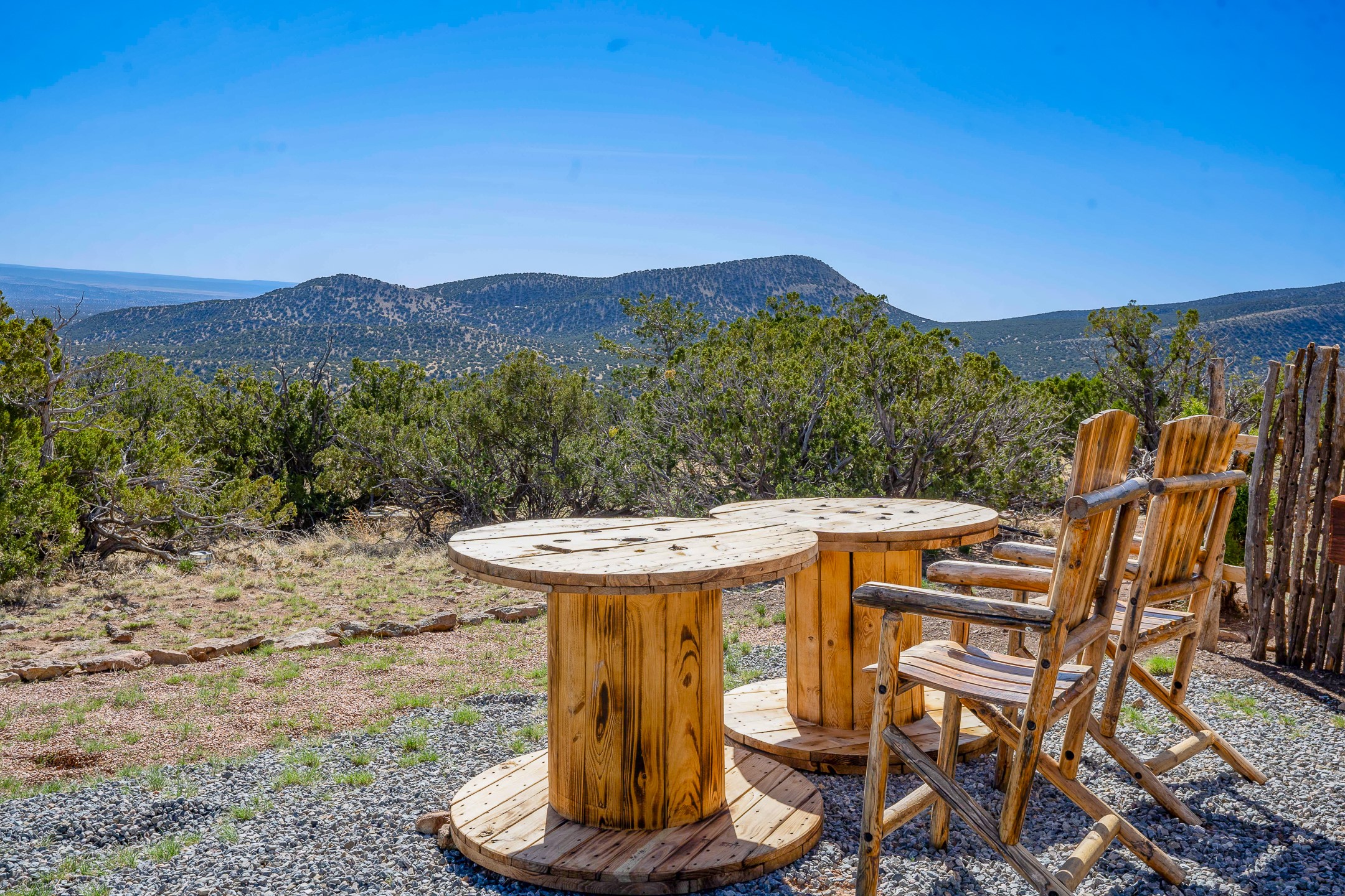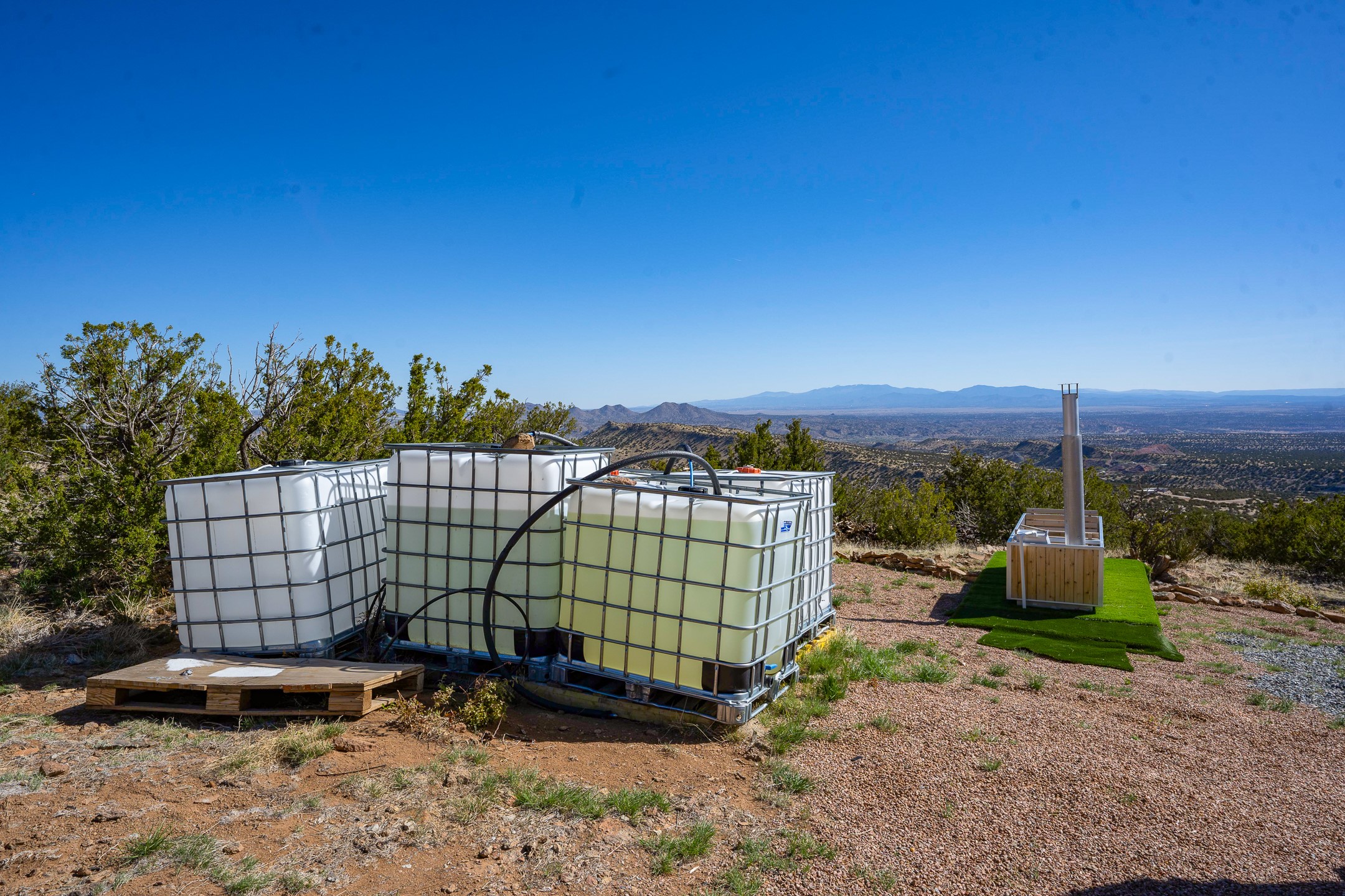 Two hundred and thirty mountain top acres with a PVC dome featuring all modern conveniences near Madrid. On two lots with two wells, this private getaway awaits the adventurous soul who wants to get above it all while still being connected. With 360 degree views from the mountain top, and the dome sited on a slope with amazing views of the Sangre de Cristo's, buyers will find this to be an incomparable view property. This far out, the Milky Way will shine bright, and the wood fired hot tub is the perfect place to stargaze from after a day of exploring the mountain. The dome has a small kitchen, bathroom, loft storage area, mini-split for heating and cooling, a luxurious glamping hideout or a cozy full time home. The solar system is modern and robust, and sewage is handled by an innovative bio-gas system. Closer than it feels, the property is just a half mile from the pavement, but that half mile is a steep and rocky climb, and a 4x4 with some clearance is recommended.