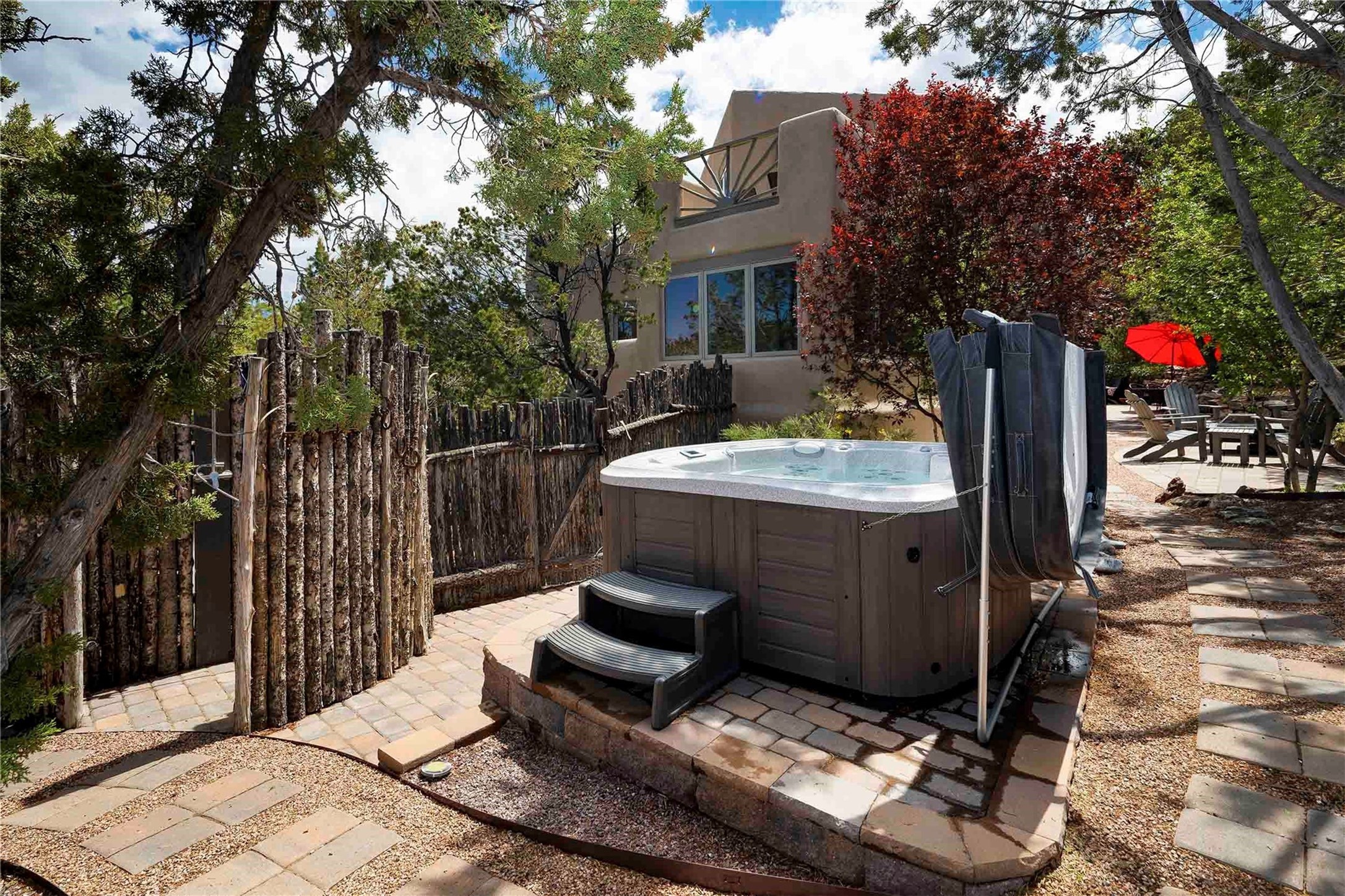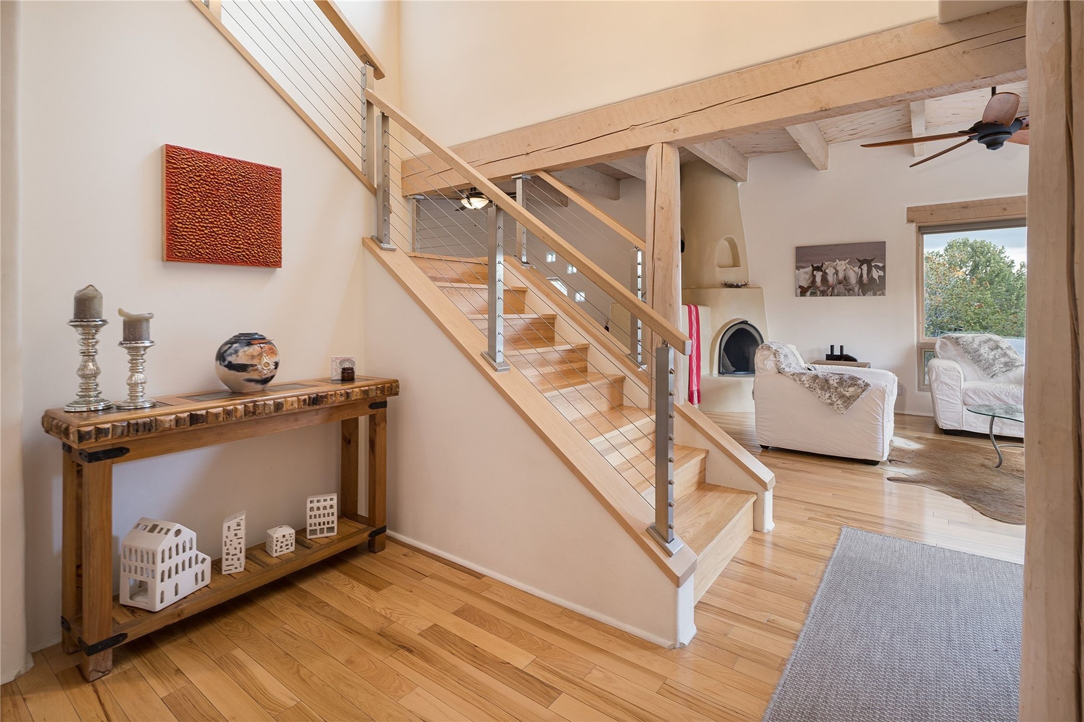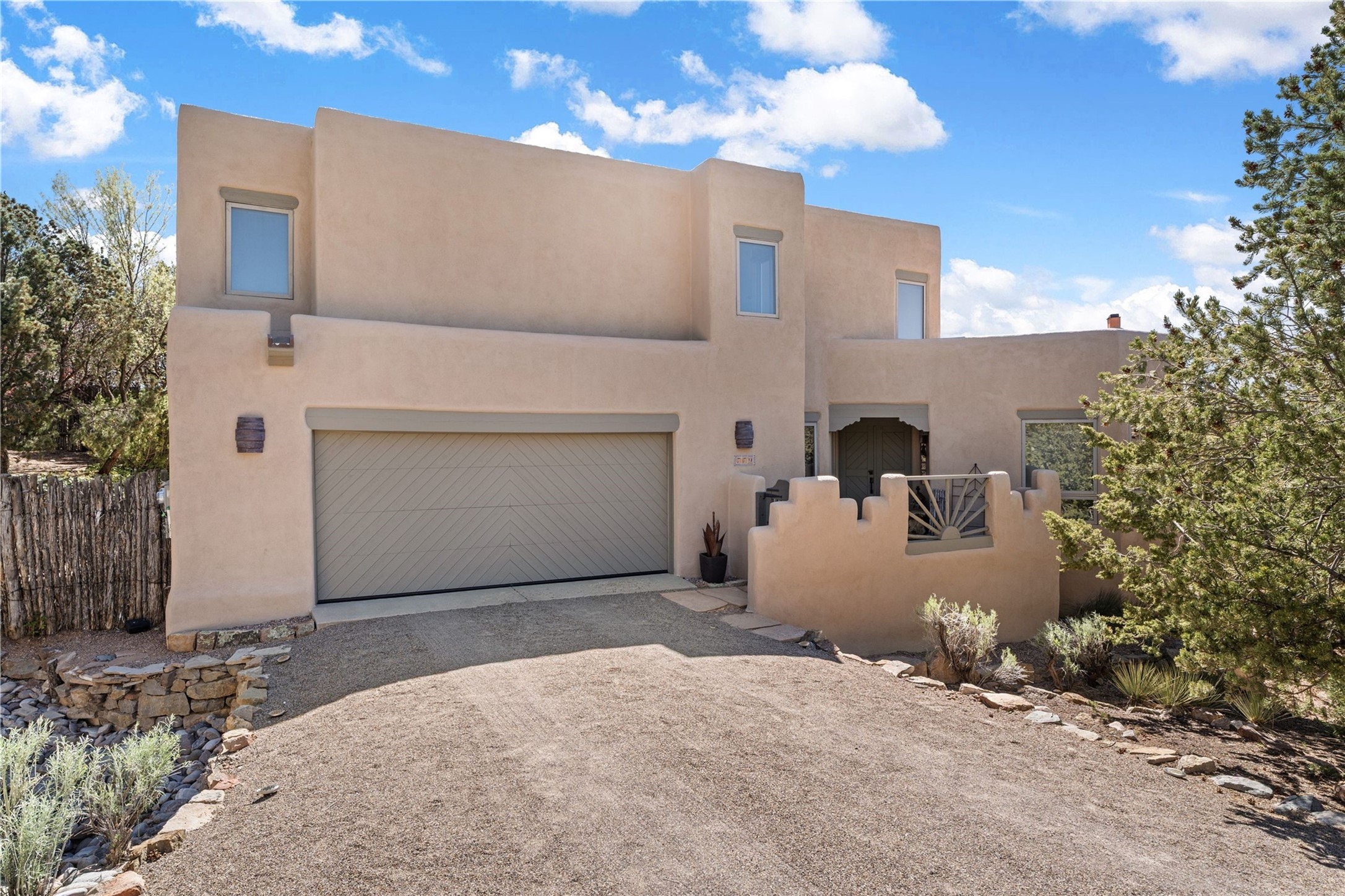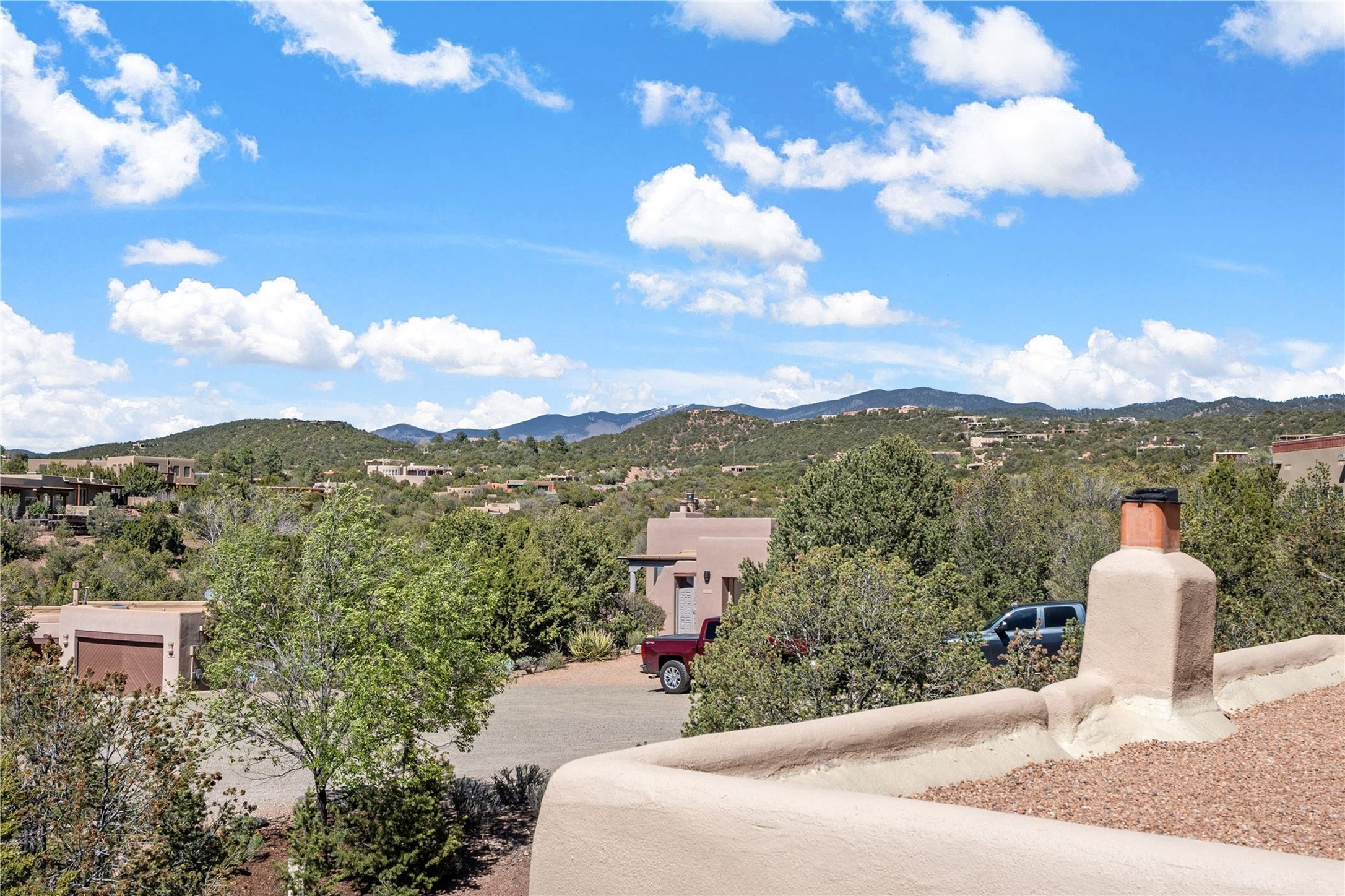 Set in the North Hills above Historic downtown Santa Fe, this serene, sophisticated home is an expressive mix of Soft Contemporary and Traditional styles. Gorgeous hardwood floors sweep from the foyer through the living/dining area with its double-sided kiva fireplace and adjacent deck. The kitchen continues the home's handsome palette with chocolate-colored countertops, maple cabinets and a sun-bathed alcove for casual meals. A few steps down from the kitchen is a den, with adjacent Laundry/Mudroom and double-door access to the sheltered back patio. A sleek, custom staircase leads to the home's four bedrooms. A soothing sanctuary, the Primary bedroom has a coved ceiling, fireplace, private view deck and ensuite, remodeled bath with walk-in, glass-walled shower. In the back garden, a moss rock wall borders an expansive, paver patio, with water feature. The atmosphere turns magical as the path glides toward the lower garden with its outdoor shower and hot tub. A new, high-efficiency boiler, solar and on-demand hot water heater add to the appeal of this refined offering. Residents of the Estancia Primera community enjoy an outdoor pool, tennis courts, and clubhouse. Walking trails enable quick access to downtown. Hiking trails and the Ski Basin are a short drive away.