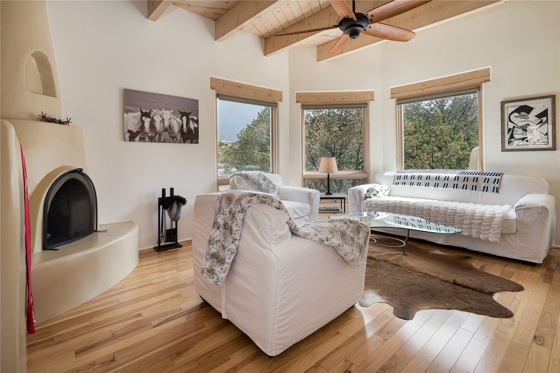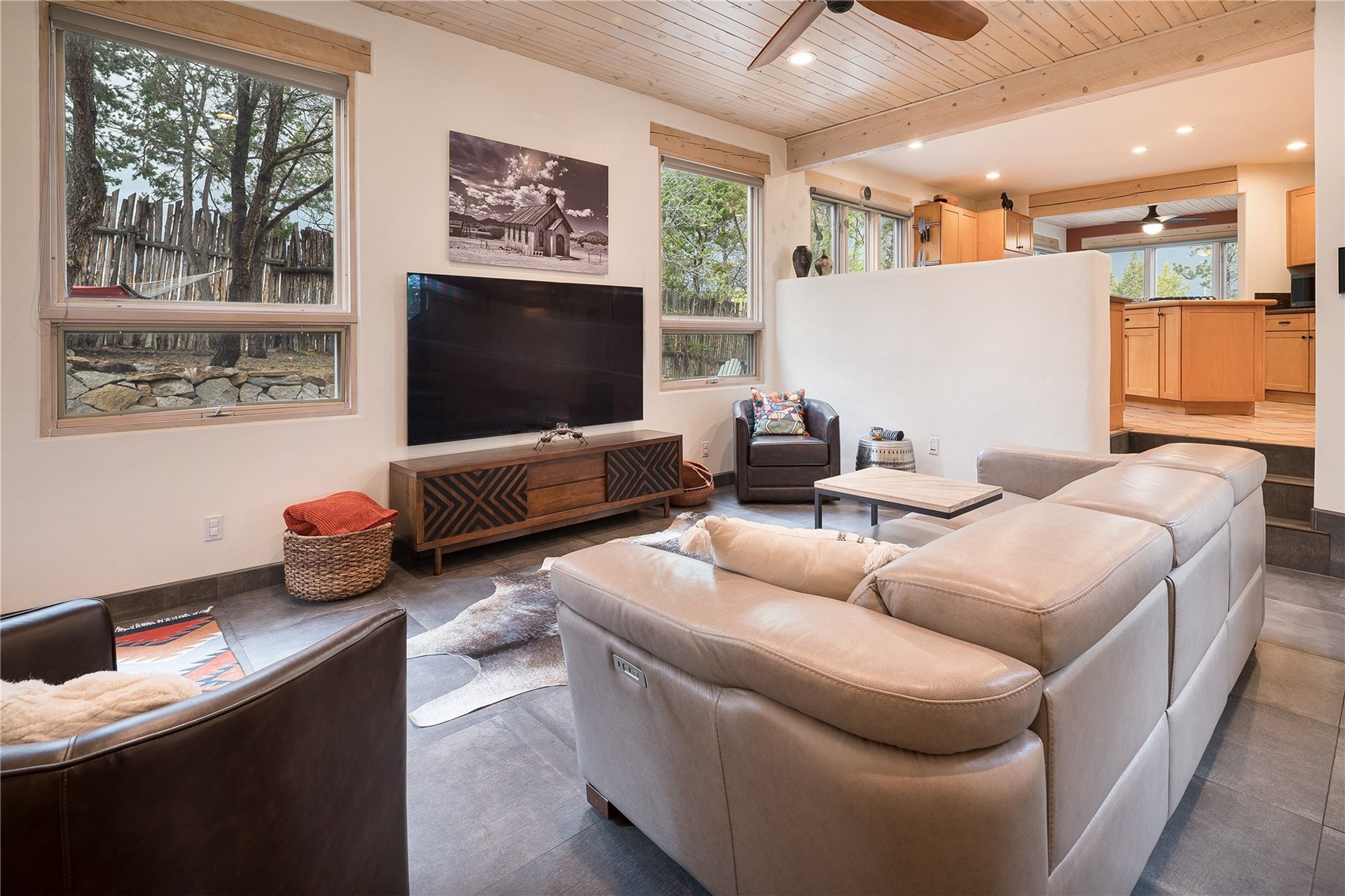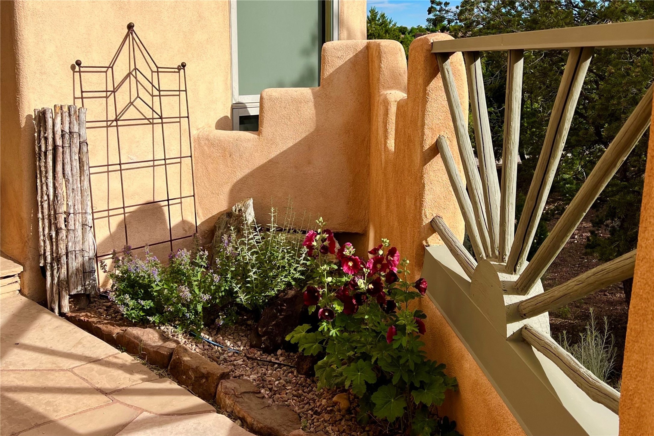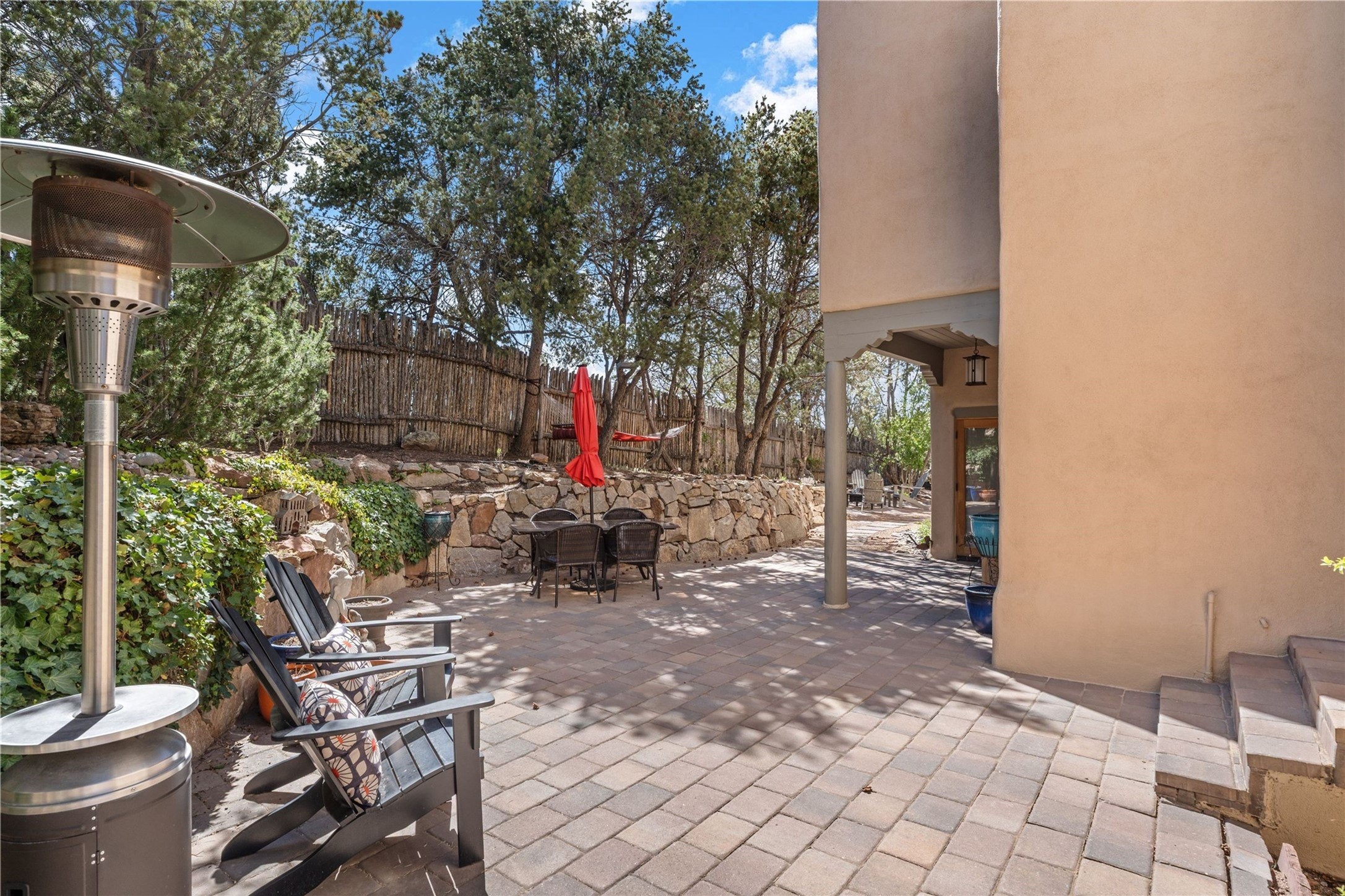 Set in the North Hills above Historic downtown Santa Fe, this serene, sophisticated home is an expressive mix of Soft Contemporary and Traditional styles. Gorgeous hardwood floors sweep from the foyer through the living/dining area with its double-sided kiva fireplace and adjacent deck. The kitchen continues the home's handsome palette with chocolate-colored countertops, maple cabinets and a sun-bathed alcove for casual meals. A few steps down from the kitchen is a den, with adjacent Laundry/Mudroom and double-door access to the sheltered back patio. A sleek, custom staircase leads to the home's four bedrooms. A soothing sanctuary, the Primary bedroom has a coved ceiling, fireplace, private view deck and ensuite, remodeled bath with walk-in, glass-walled shower. In the back garden, a moss rock wall borders an expansive, paver patio, with water feature. The atmosphere turns magical as the path glides toward the lower garden with its outdoor shower and hot tub. A new, high-efficiency boiler, solar and on-demand hot water heater add to the appeal of this refined offering. Residents of the Estancia Primera community enjoy an outdoor pool, tennis courts, and clubhouse. Walking trails enable quick access to downtown. Hiking trails and the Ski Basin are a short drive away.