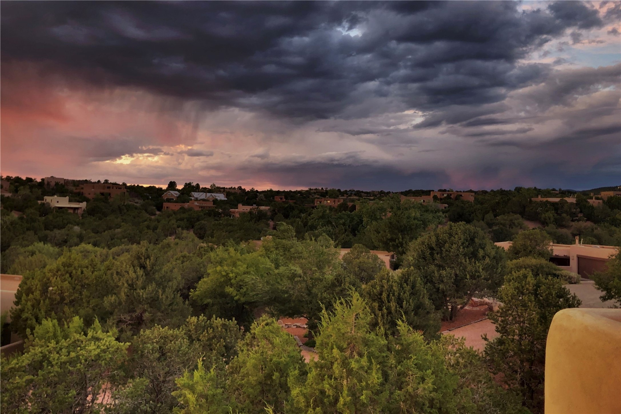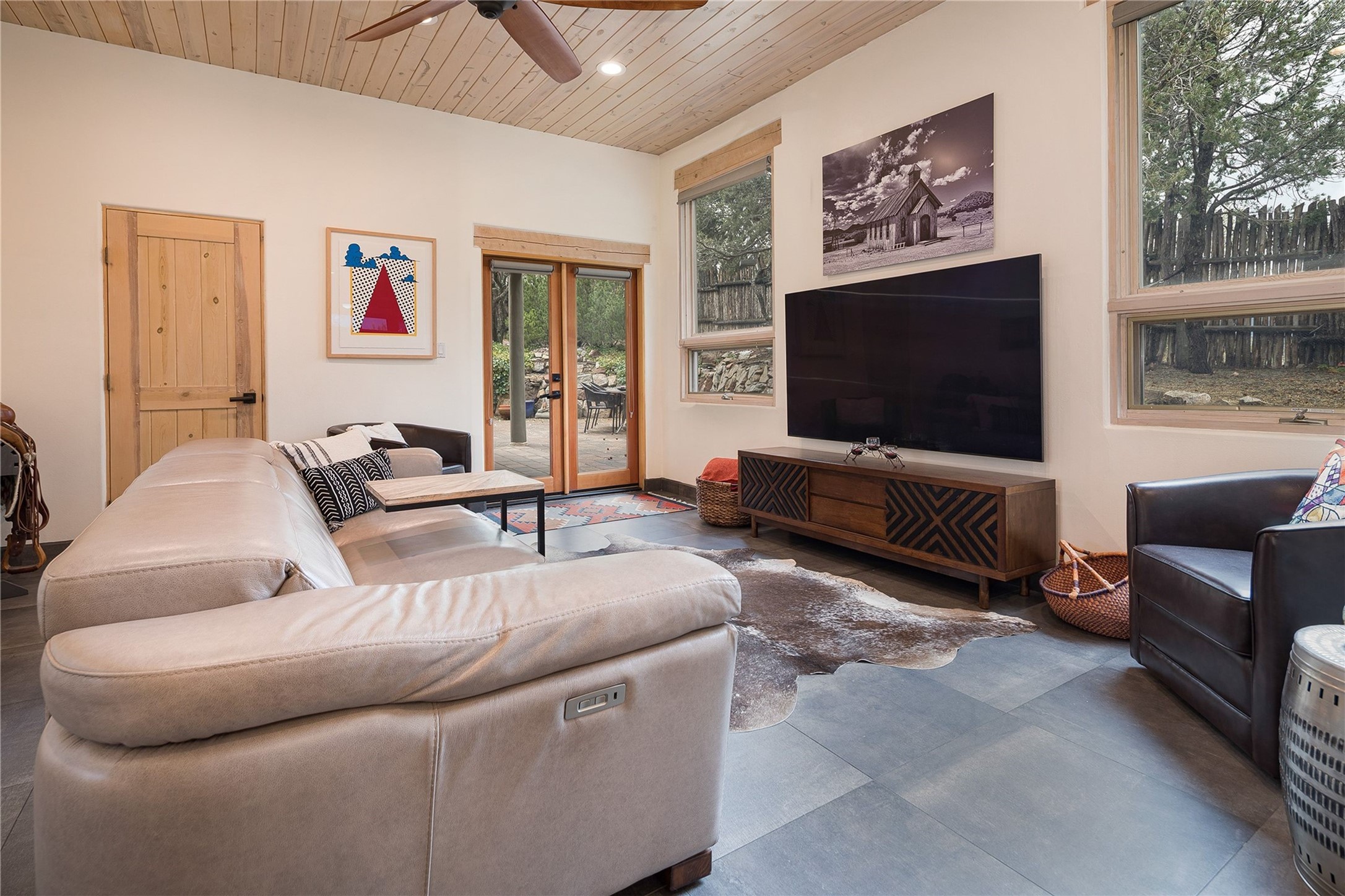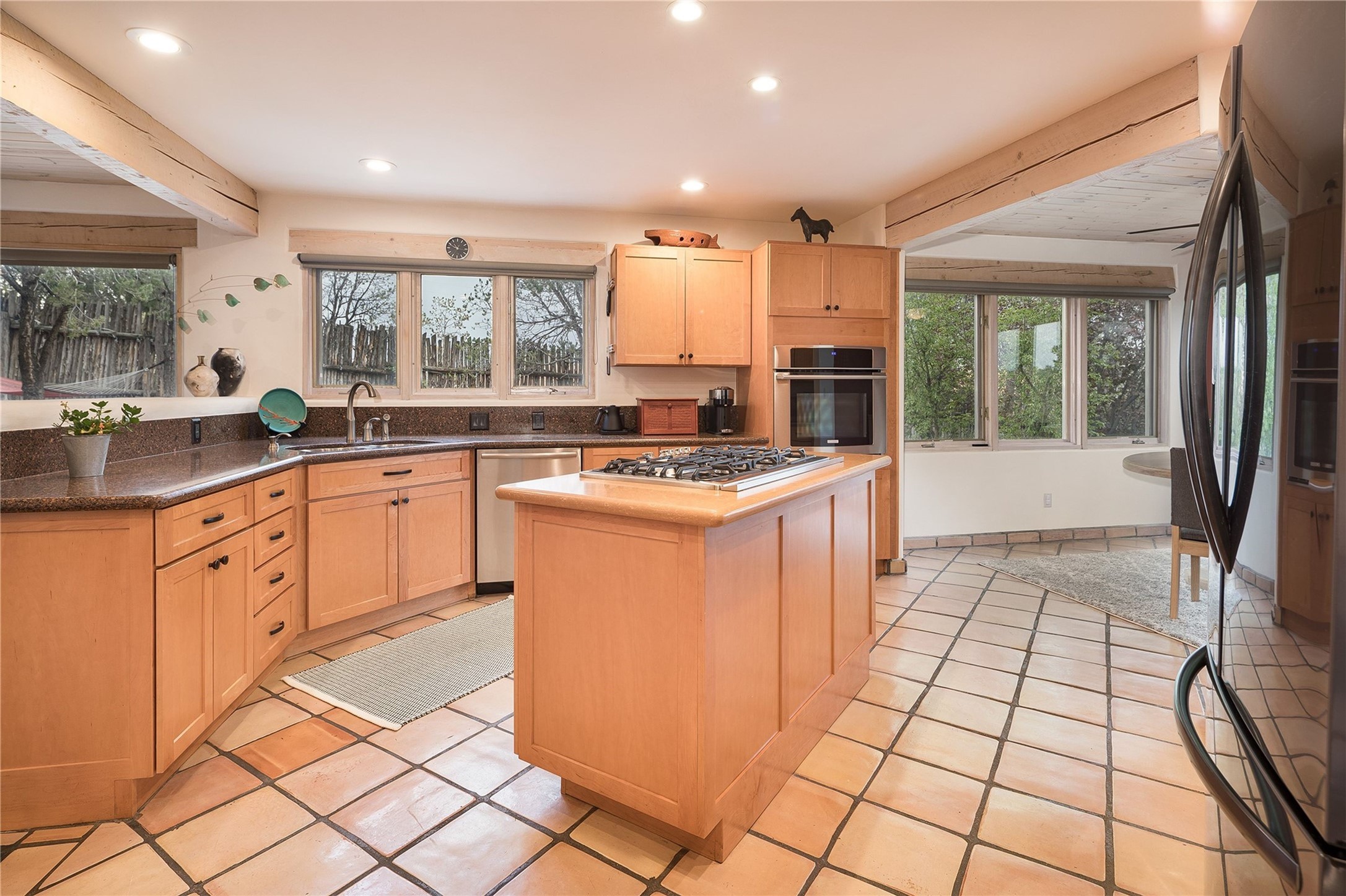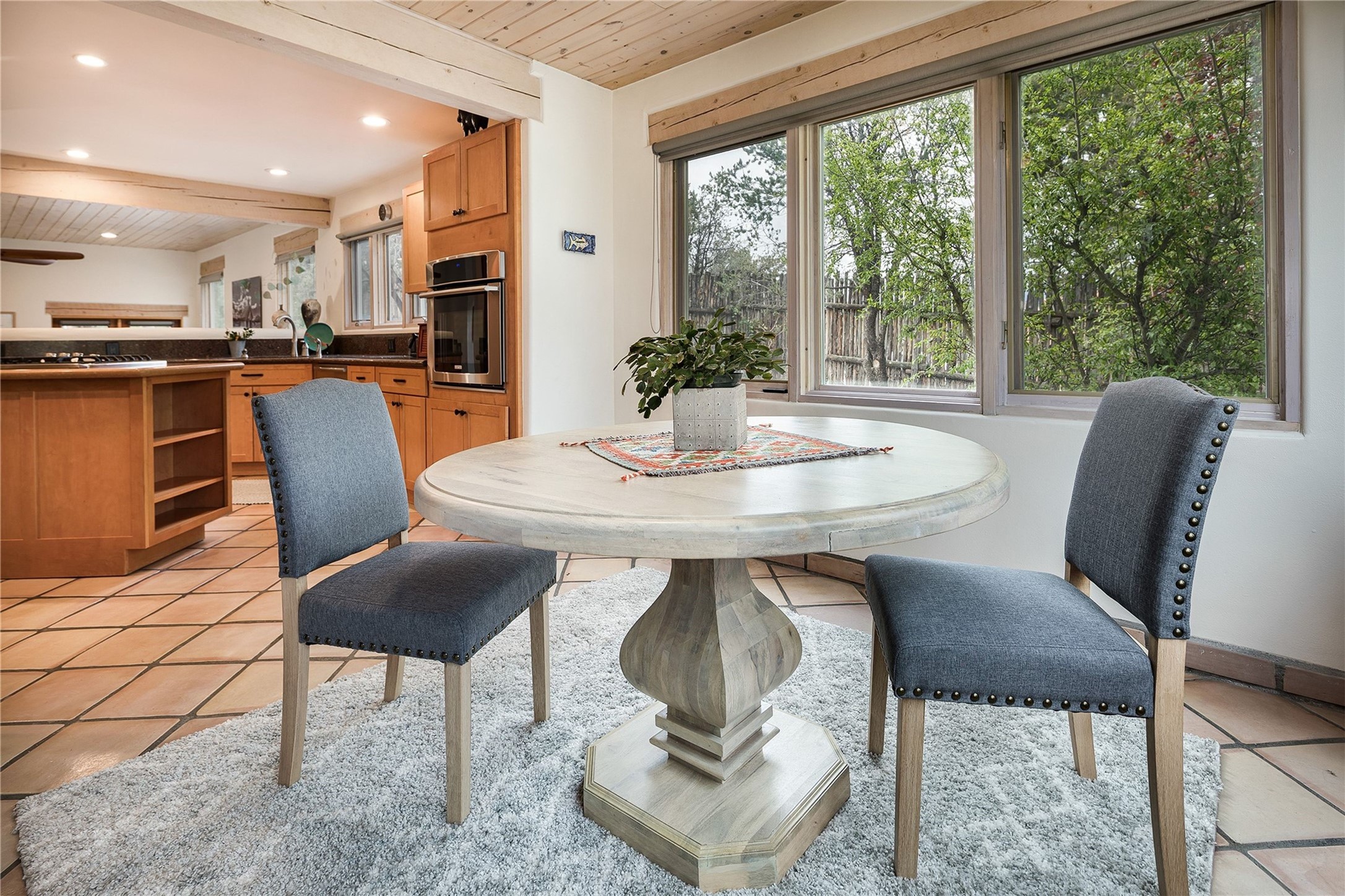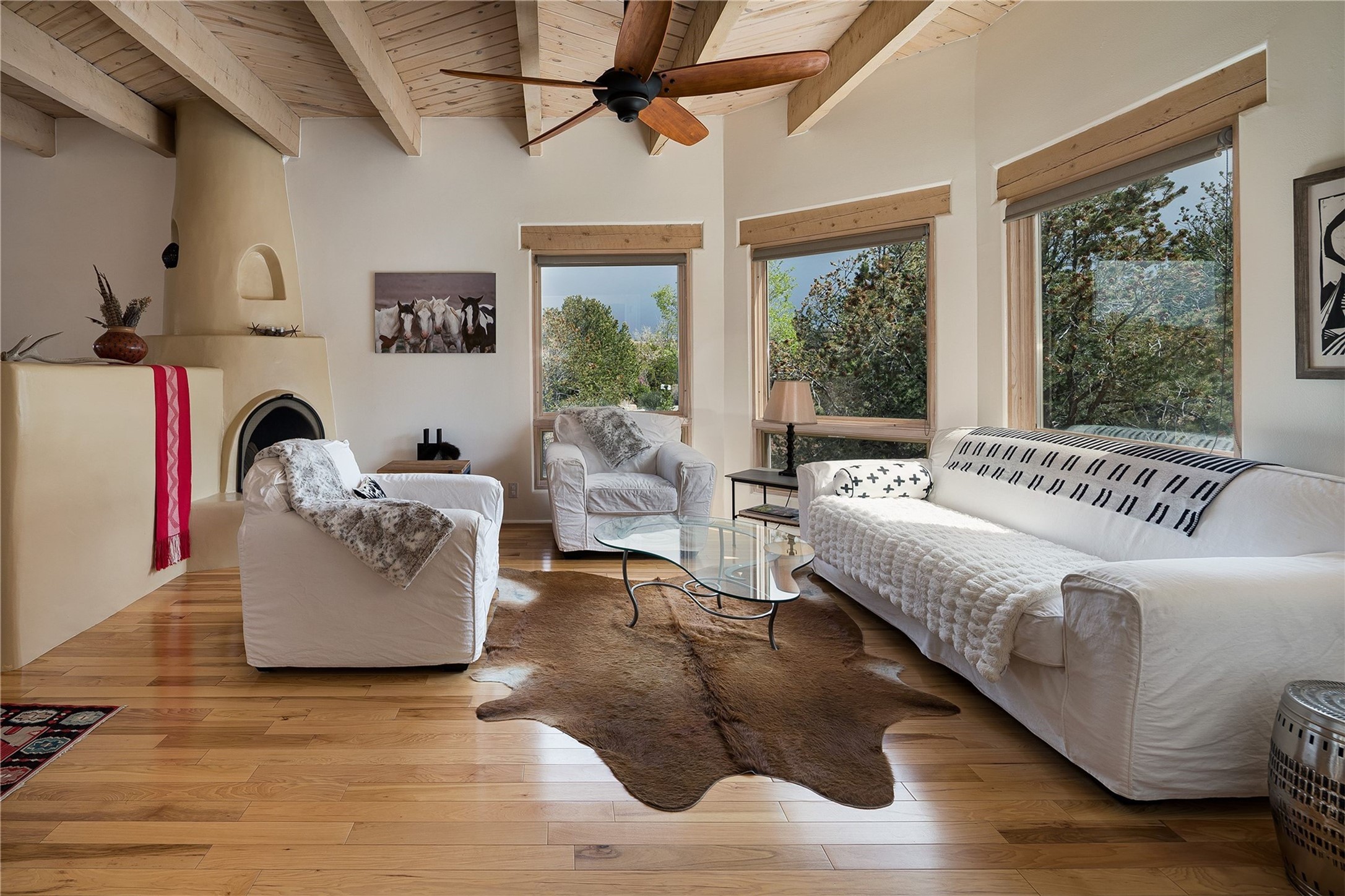Set in the North Hills above Historic downtown Santa Fe, this serene, sophisticated home is an expressive mix of Soft Contemporary and Traditional styles. Gorgeous hardwood floors sweep from the foyer through the living/dining area with its double-sided kiva fireplace and adjacent deck. The kitchen continues the home's handsome palette with chocolate-colored countertops, maple cabinets and a sun-bathed alcove for casual meals. A few steps down from the kitchen is a den, with adjacent Laundry/Mudroom and double-door access to the sheltered back patio. A sleek, custom staircase leads to the home's four bedrooms. A soothing sanctuary, the Primary bedroom has a coved ceiling, fireplace, private view deck and ensuite, remodeled bath with walk-in, glass-walled shower. In the back garden, a moss rock wall borders an expansive, paver patio, with water feature. The atmosphere turns magical as the path glides toward the lower garden with its outdoor shower and hot tub. A new, high-efficiency boiler, solar and on-demand hot water heater add to the appeal of this refined offering. Residents of the Estancia Primera community enjoy an outdoor pool, tennis courts, and clubhouse. Walking trails enable quick access to downtown. Hiking trails and the Ski Basin are a short drive away.