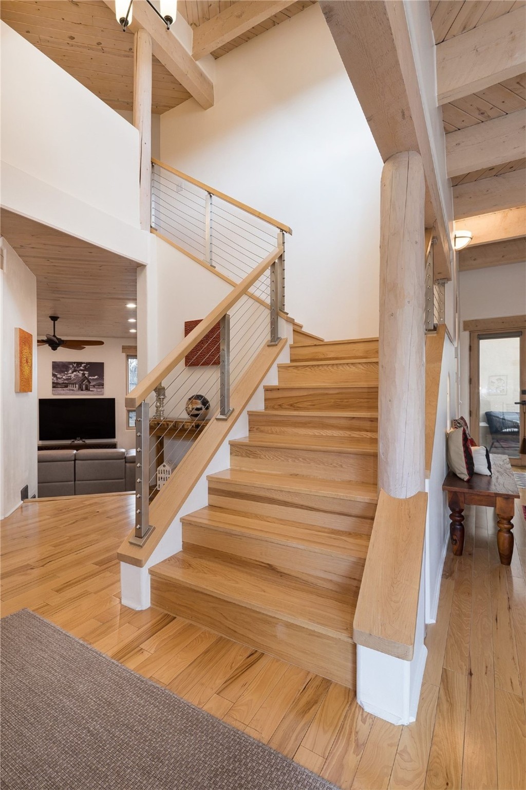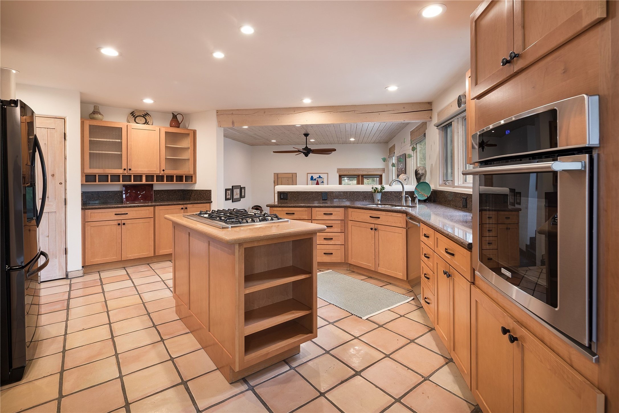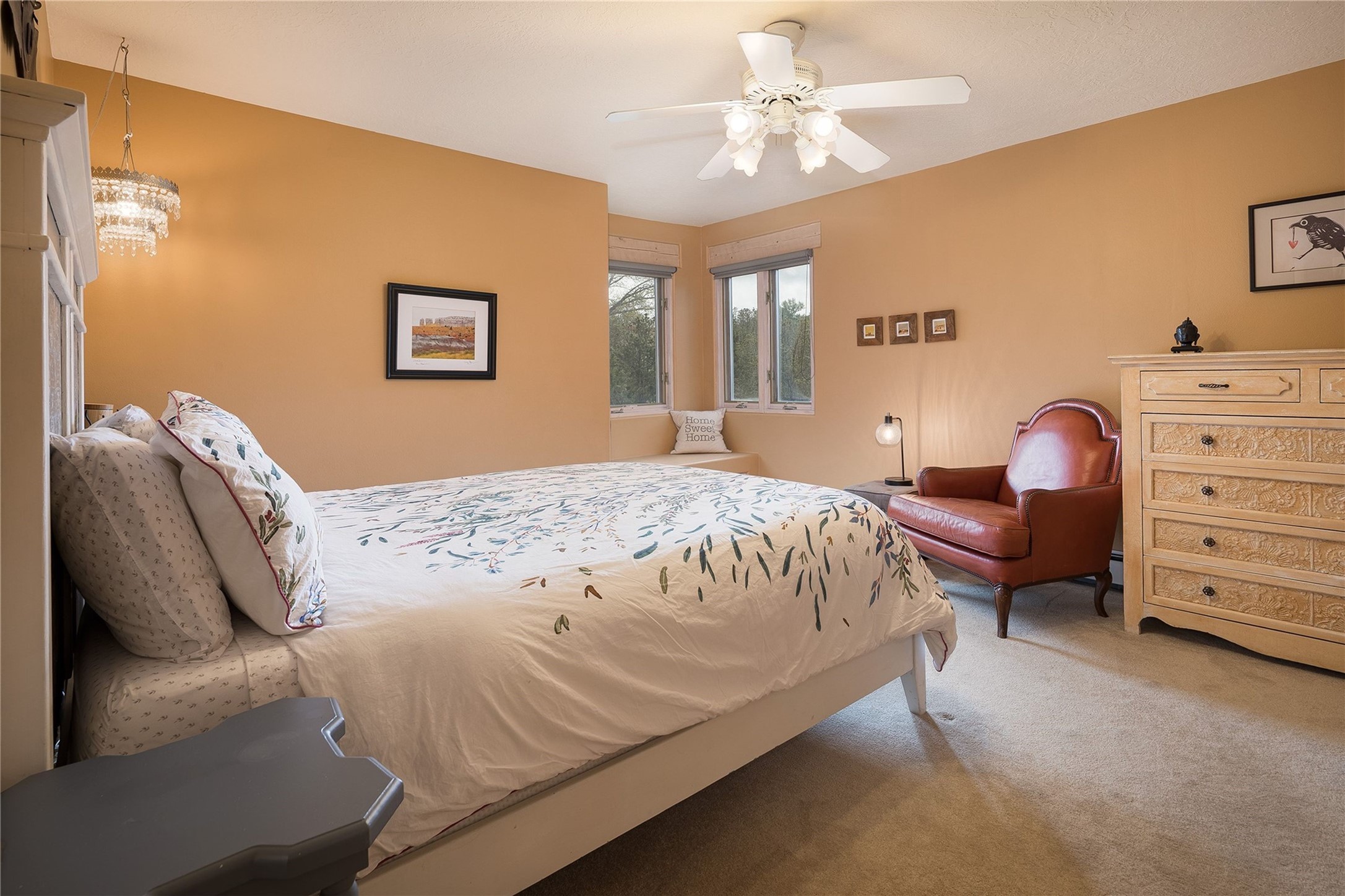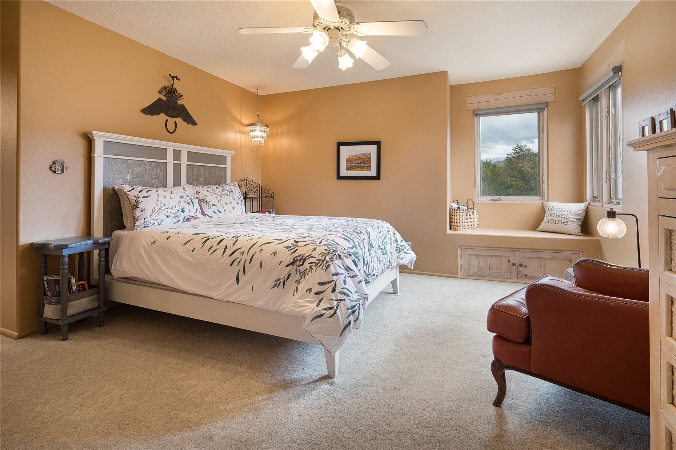 Set in the North Hills above Historic downtown Santa Fe, this serene, sophisticated home is an expressive mix of Soft Contemporary and Traditional styles. Gorgeous hardwood floors sweep from the foyer through the living/dining area with its double-sided kiva fireplace and adjacent deck. The kitchen continues the home's handsome palette with chocolate-colored countertops, maple cabinets and a sun-bathed alcove for casual meals. A few steps down from the kitchen is a den, with adjacent Laundry/Mudroom and double-door access to the sheltered back patio. A sleek, custom staircase leads to the home's four bedrooms. A soothing sanctuary, the Primary bedroom has a coved ceiling, fireplace, private view deck and ensuite, remodeled bath with walk-in, glass-walled shower. In the back garden, a moss rock wall borders an expansive, paver patio, with water feature. The atmosphere turns magical as the path glides toward the lower garden with its outdoor shower and hot tub. A new, high-efficiency boiler, solar and on-demand hot water heater add to the appeal of this refined offering. Residents of the Estancia Primera community enjoy an outdoor pool, tennis courts, and clubhouse. Walking trails enable quick access to downtown. Hiking trails and the Ski Basin are a short drive away.