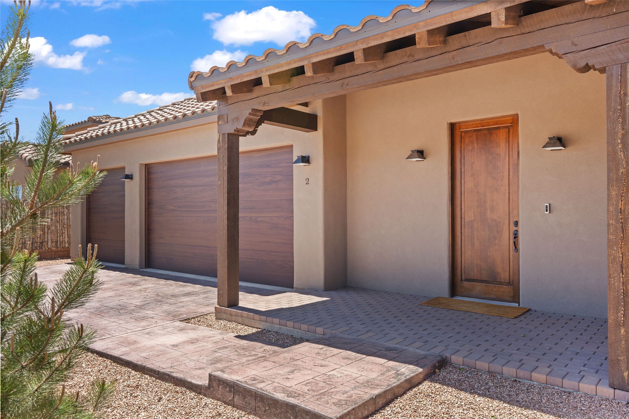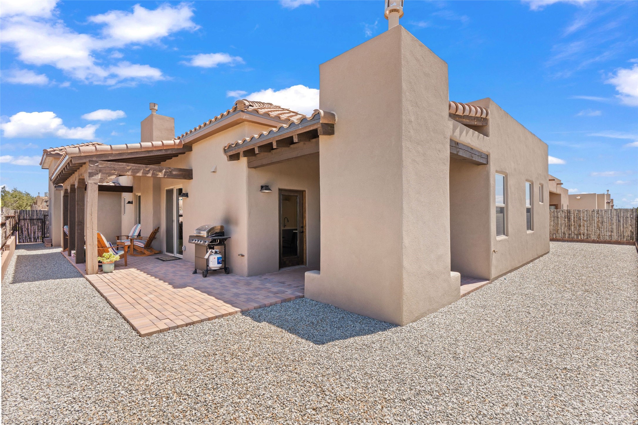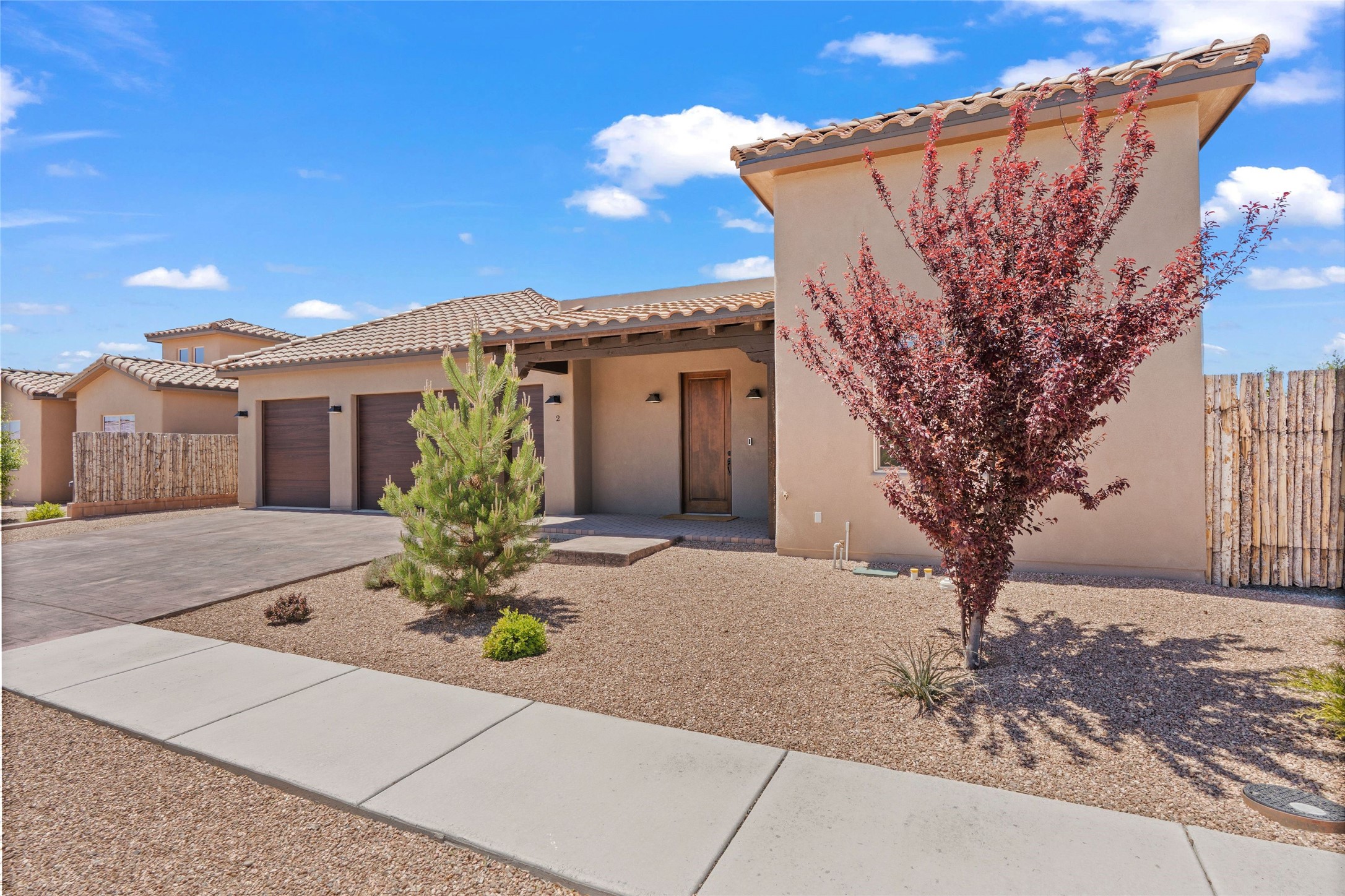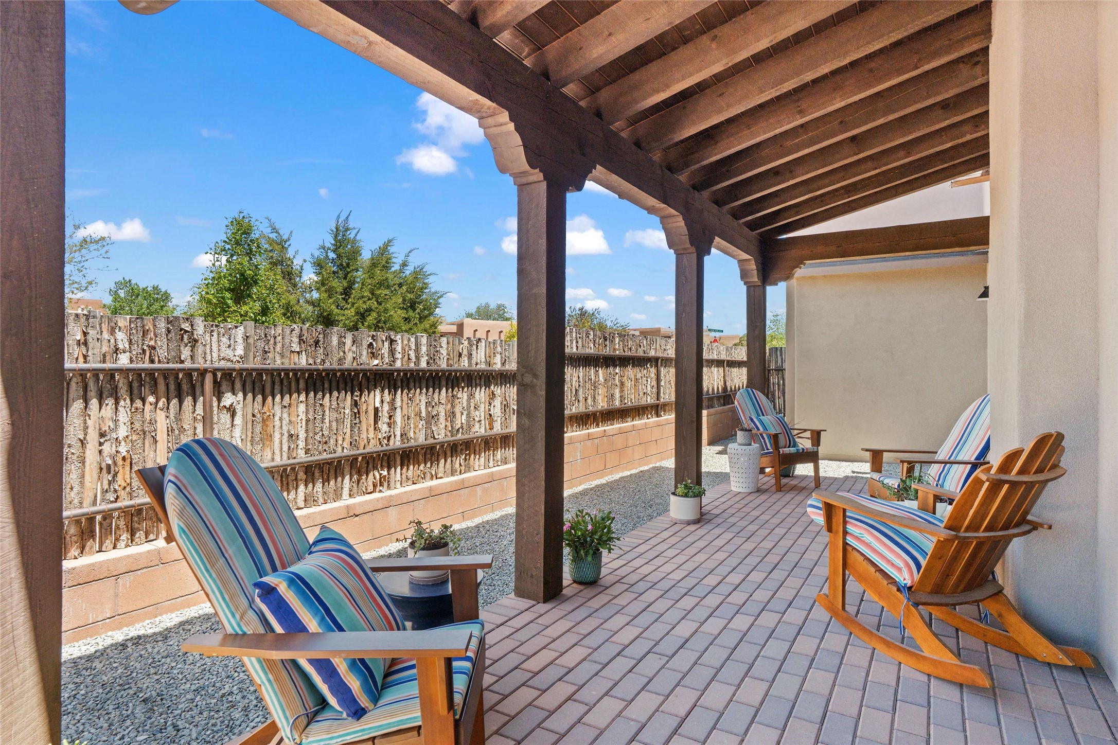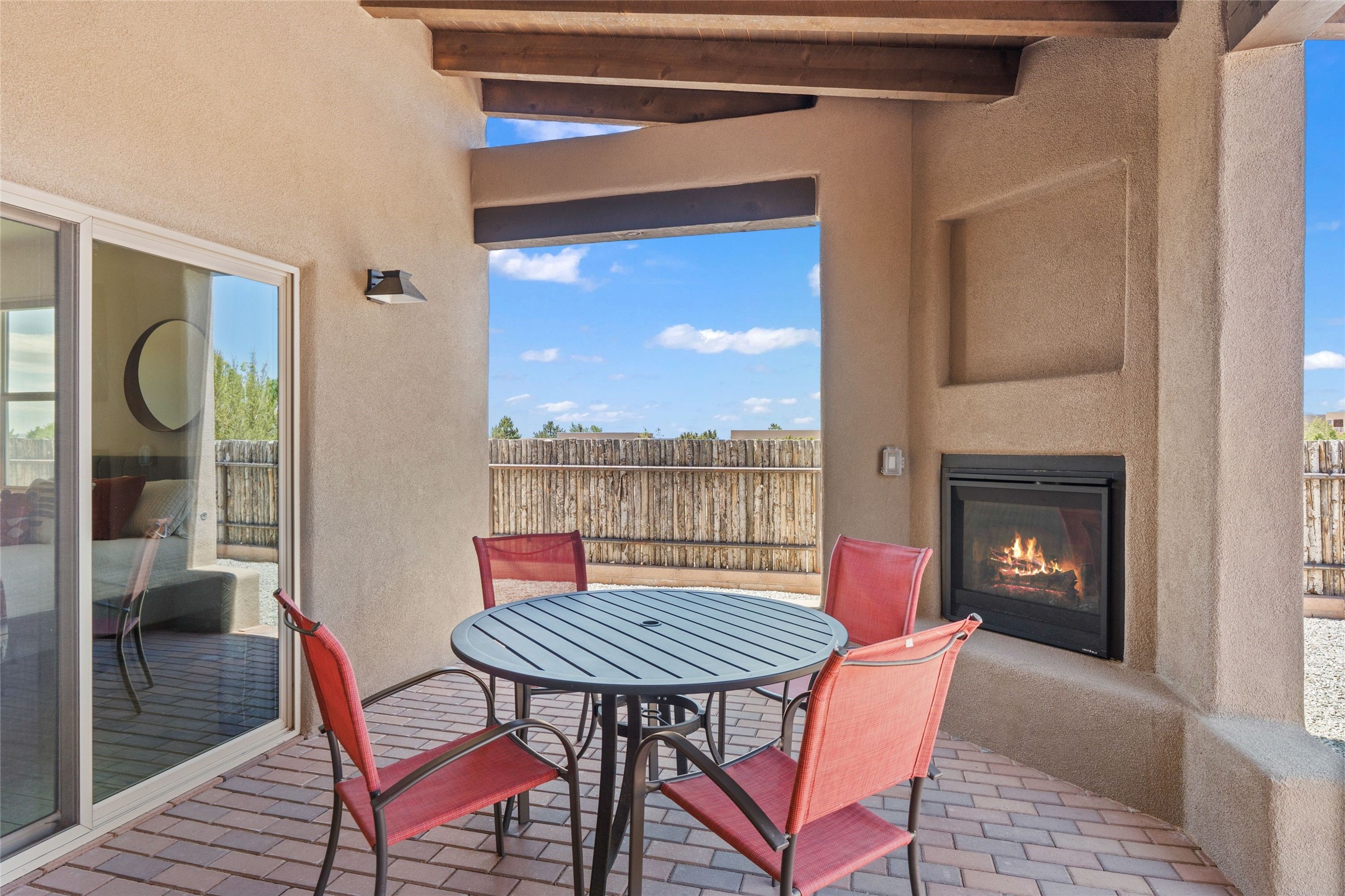 Outstanding property nestled in the community of La Pradera. This 3 bedroom, 4 bath residence offers modern luxury and an effortless living environment. Built just three years ago & lightly lived in - this residence boasts a large chef's kitchen including quartz countertops, subway tile backsplash, island with secondary sink, dual ovens, a sleek black stainless steel appliance package, & pantry. Relax & enjoy the open floor plan with high ceilings, square vigas, as well as a cozy gas fireplace in the living room. The kitchen & dining areas are adjacent to the living room, providing great functionality with plenty of space for entertaining. The wonderful high-end finishes throughout this home were personally selected by the discerning homeowners. Each of the three bedrooms feature an ensuite bathroom, ensuring privacy & additional comfort. The bedroom off the entry has a Kiva fireplace & lots of natural light. The other secondary bedroom has a large walk-in closet. The spacious primary suite includes a walk-in closet, a luxurious bathroom with walk-in shower, soaking tub, & dual sinks. Large laundry room with sink & many built-ins add to the convenience & ease of this highly desirable property. This well-designed home features tile floors throughout, as well an abundant amount of storage. The property has a three car garage with My Q garage door openers, two storage closets, pre-wiring for an EV charger, & a tankless water heater. The Nest thermostat & Ring doorbell adds a touch of smart home integration. Multiple covered patios with brick flooring, & a gas fireplace adds to the ambiance of the outdoor spaces - creating an inviting space to enjoy year round. With only one neighboring home, this property enjoys a prime location next to a beautifully landscaped open space & backs onto one of the many scenic walking trails. This home is also set farther from I-25 than many others in the neighborhood. Close to many south side restaurants & shops. It's a must see!