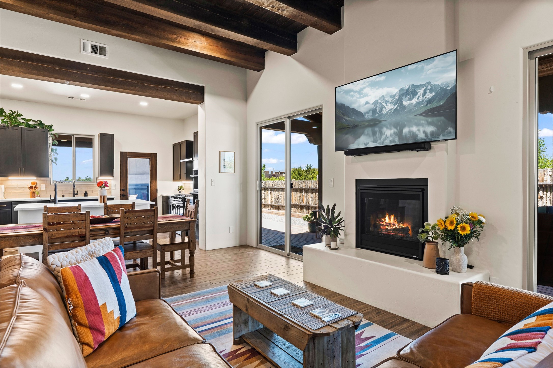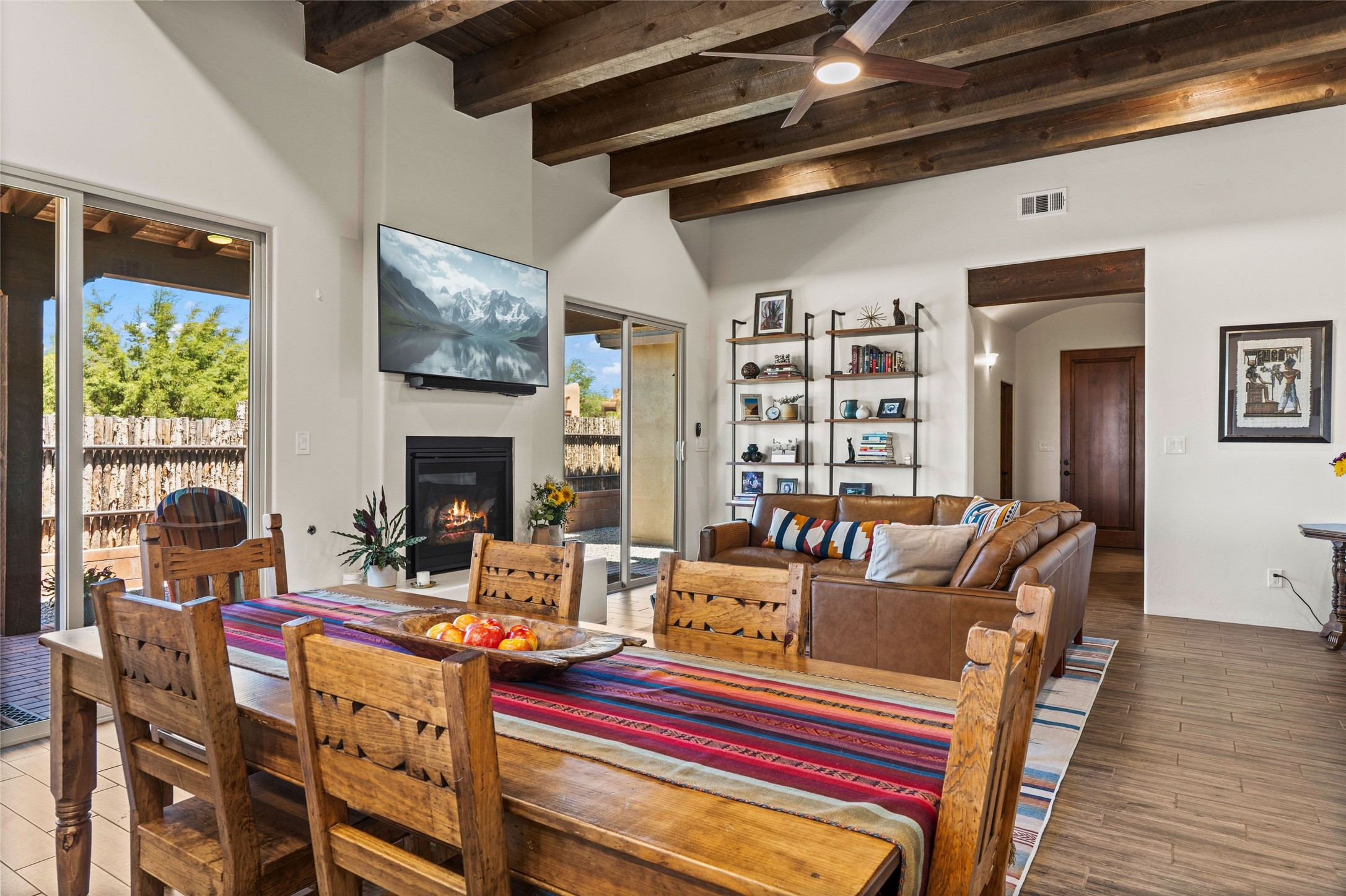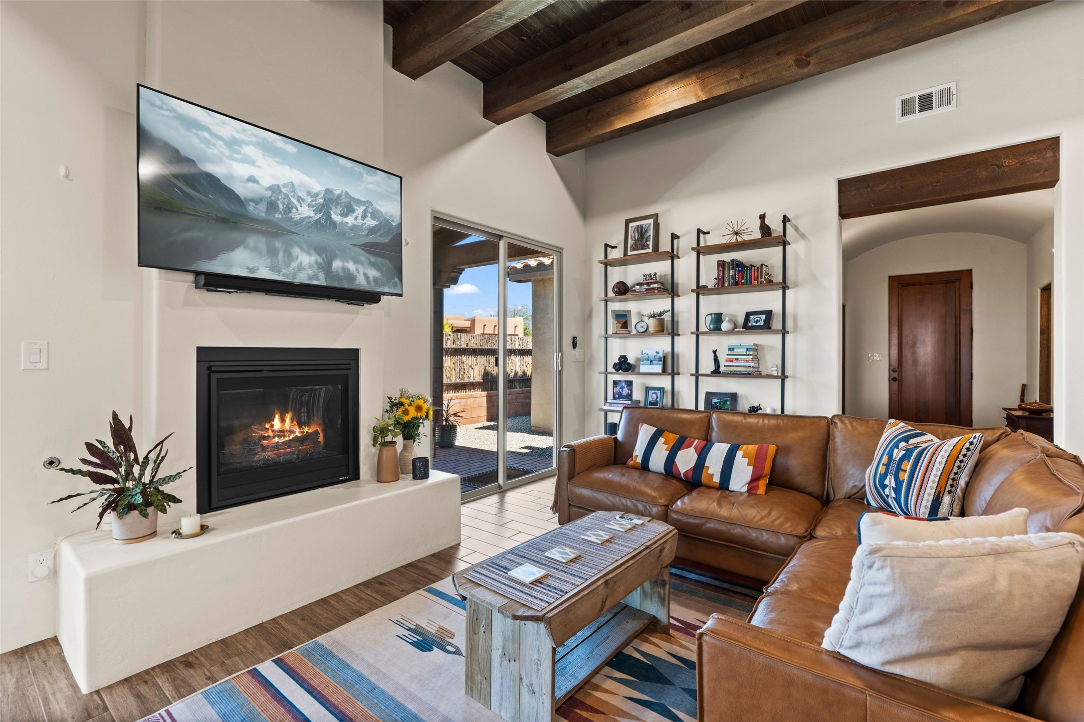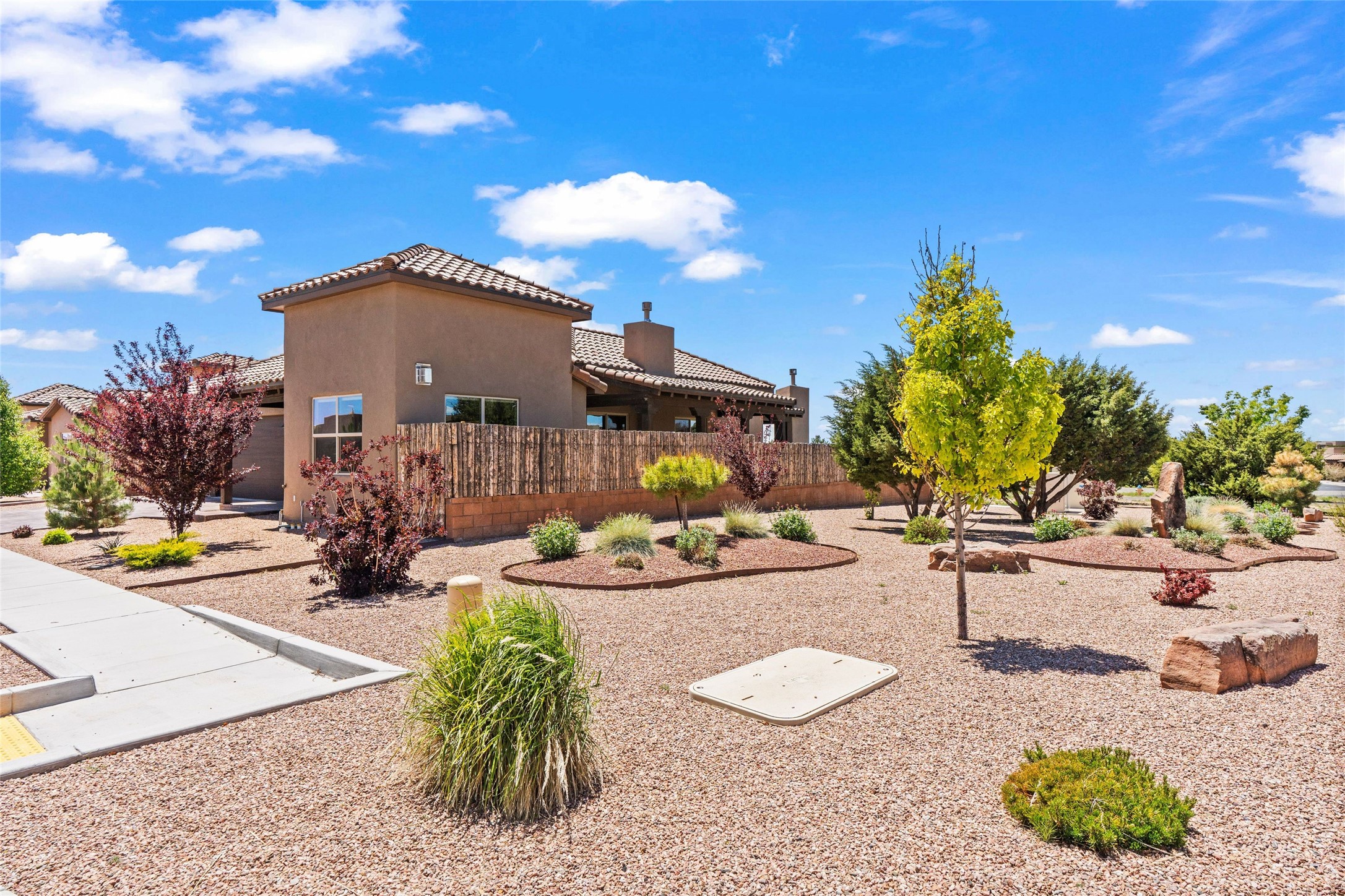 Outstanding property nestled in the community of La Pradera. This 3 bedroom, 4 bath residence offers modern luxury and an effortless living environment. Built just three years ago & lightly lived in - this residence boasts a large chef's kitchen including quartz countertops, subway tile backsplash, island with secondary sink, dual ovens, a sleek black stainless steel appliance package, & pantry. Relax & enjoy the open floor plan with high ceilings, square vigas, as well as a cozy gas fireplace in the living room. The kitchen & dining areas are adjacent to the living room, providing great functionality with plenty of space for entertaining. The wonderful high-end finishes throughout this home were personally selected by the discerning homeowners. Each of the three bedrooms feature an ensuite bathroom, ensuring privacy & additional comfort. The bedroom off the entry has a Kiva fireplace & lots of natural light. The other secondary bedroom has a large walk-in closet. The spacious primary suite includes a walk-in closet, a luxurious bathroom with walk-in shower, soaking tub, & dual sinks. Large laundry room with sink & many built-ins add to the convenience & ease of this highly desirable property. This well-designed home features tile floors throughout, as well an abundant amount of storage. The property has a three car garage with My Q garage door openers, two storage closets, pre-wiring for an EV charger, & a tankless water heater. The Nest thermostat & Ring doorbell adds a touch of smart home integration. Multiple covered patios with brick flooring, & a gas fireplace adds to the ambiance of the outdoor spaces - creating an inviting space to enjoy year round. With only one neighboring home, this property enjoys a prime location next to a beautifully landscaped open space & backs onto one of the many scenic walking trails. This home is also set farther from I-25 than many others in the neighborhood. Close to many south side restaurants & shops. It's a must see!