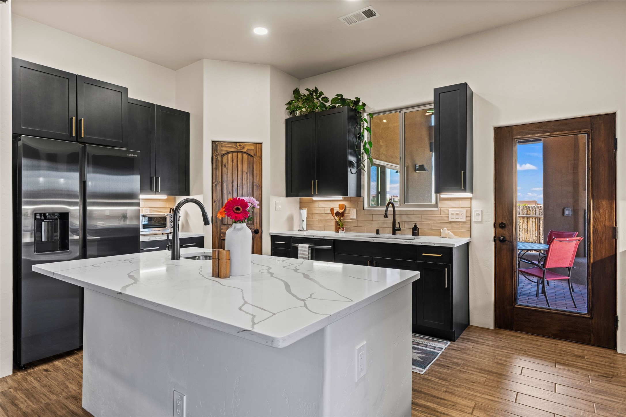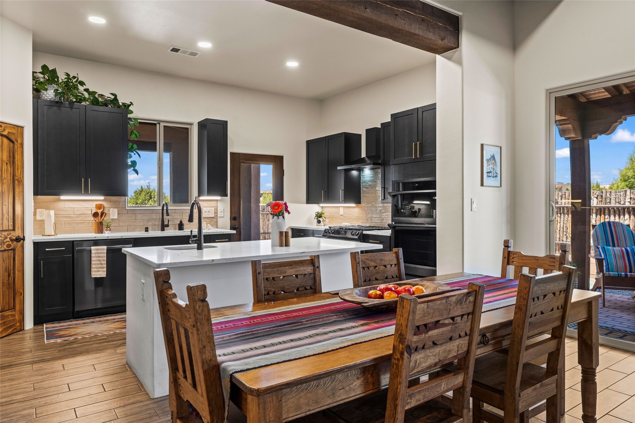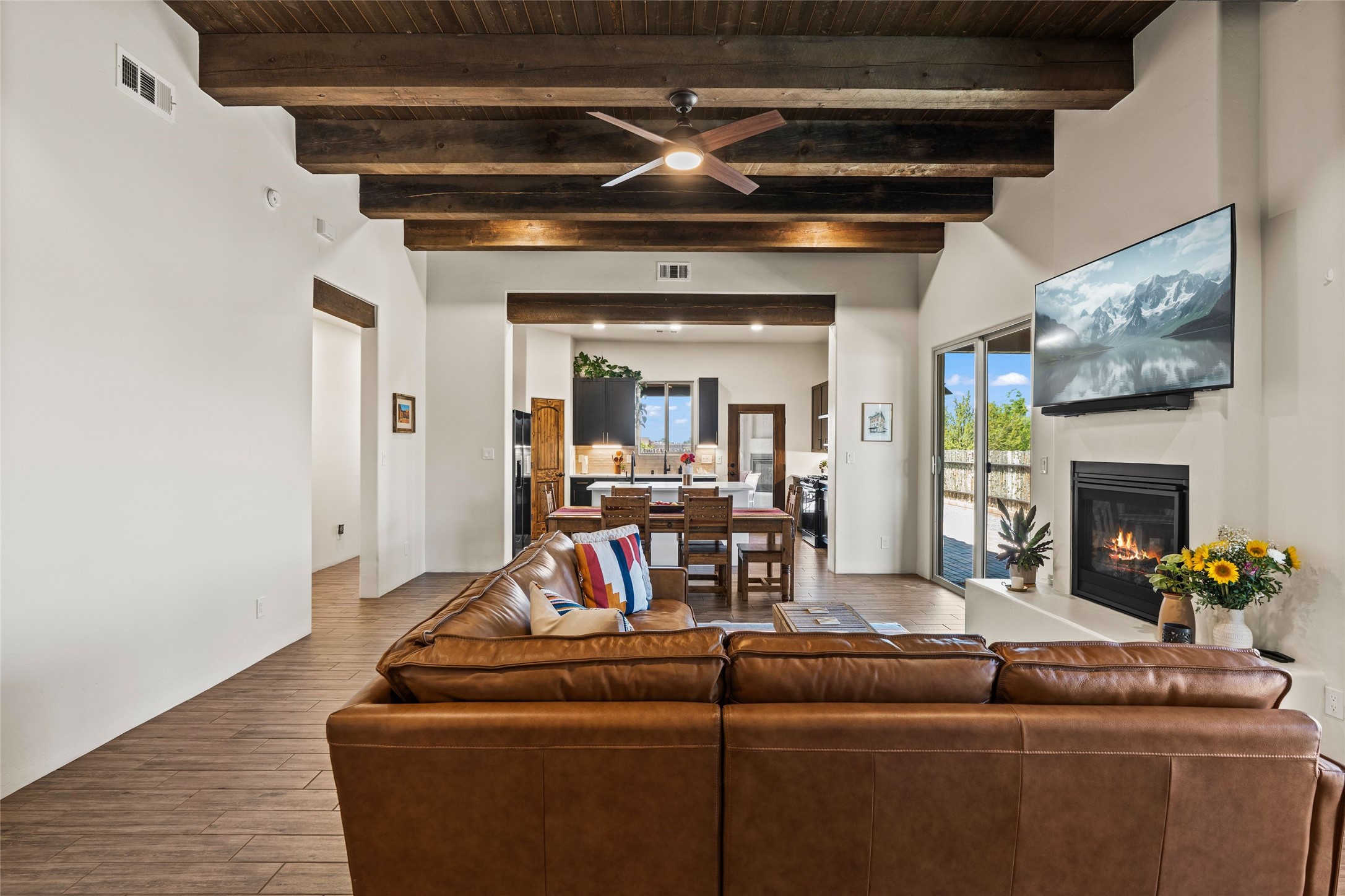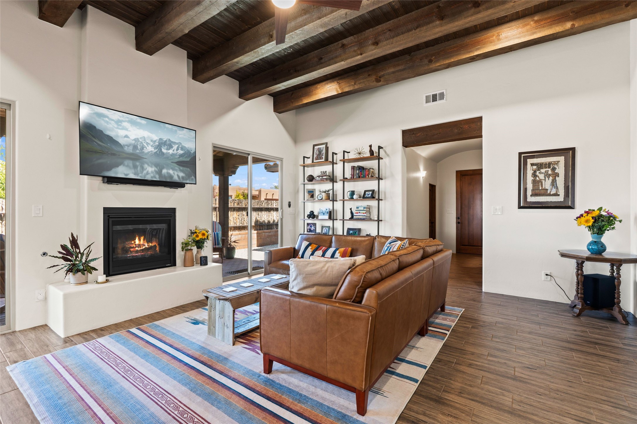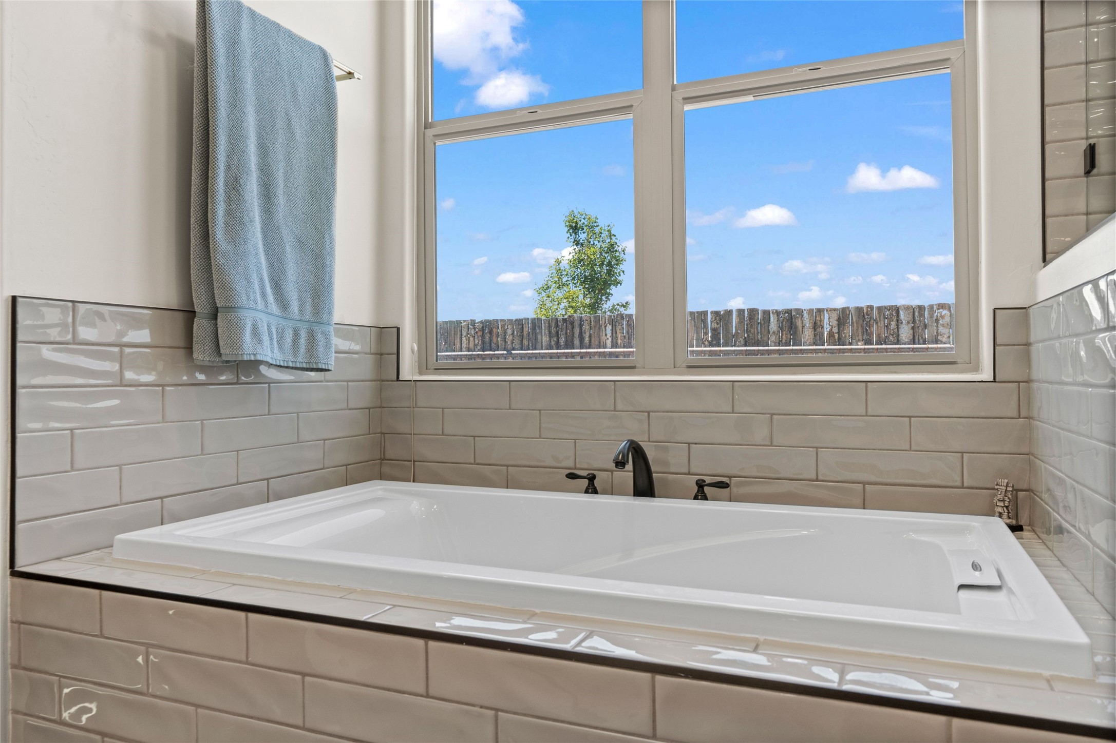 Outstanding property nestled in the community of La Pradera. This 3 bedroom, 4 bath residence offers modern luxury and an effortless living environment. Built just three years ago & lightly lived in - this residence boasts a large chef's kitchen including quartz countertops, subway tile backsplash, island with secondary sink, dual ovens, a sleek black stainless steel appliance package, & pantry. Relax & enjoy the open floor plan with high ceilings, square vigas, as well as a cozy gas fireplace in the living room. The kitchen & dining areas are adjacent to the living room, providing great functionality with plenty of space for entertaining. The wonderful high-end finishes throughout this home were personally selected by the discerning homeowners. Each of the three bedrooms feature an ensuite bathroom, ensuring privacy & additional comfort. The bedroom off the entry has a Kiva fireplace & lots of natural light. The other secondary bedroom has a large walk-in closet. The spacious primary suite includes a walk-in closet, a luxurious bathroom with walk-in shower, soaking tub, & dual sinks. Large laundry room with sink & many built-ins add to the convenience & ease of this highly desirable property. This well-designed home features tile floors throughout, as well an abundant amount of storage. The property has a three car garage with My Q garage door openers, two storage closets, pre-wiring for an EV charger, & a tankless water heater. The Nest thermostat & Ring doorbell adds a touch of smart home integration. Multiple covered patios with brick flooring, & a gas fireplace adds to the ambiance of the outdoor spaces - creating an inviting space to enjoy year round. With only one neighboring home, this property enjoys a prime location next to a beautifully landscaped open space & backs onto one of the many scenic walking trails. This home is also set farther from I-25 than many others in the neighborhood. Close to many south side restaurants & shops. It's a must see!