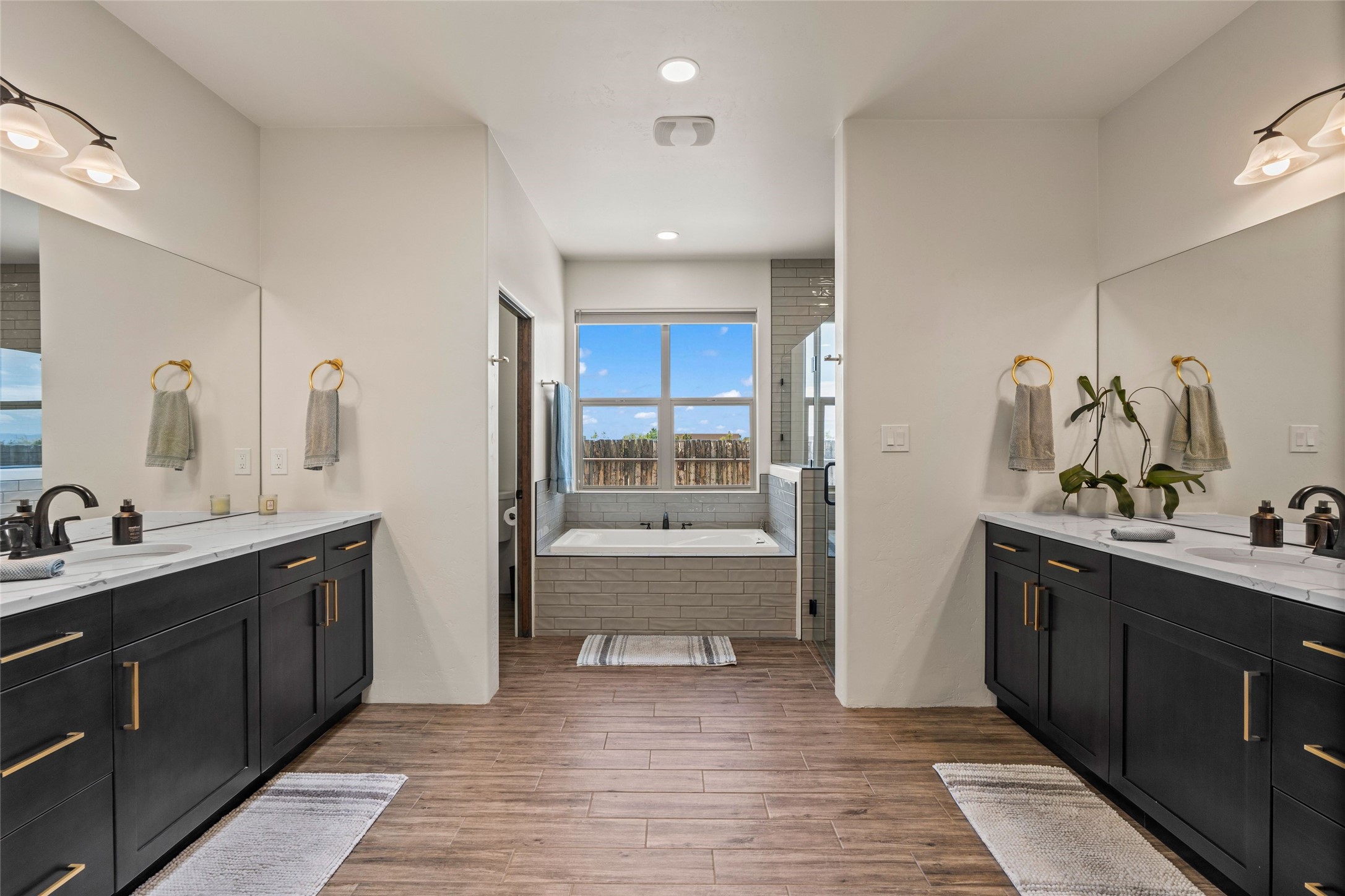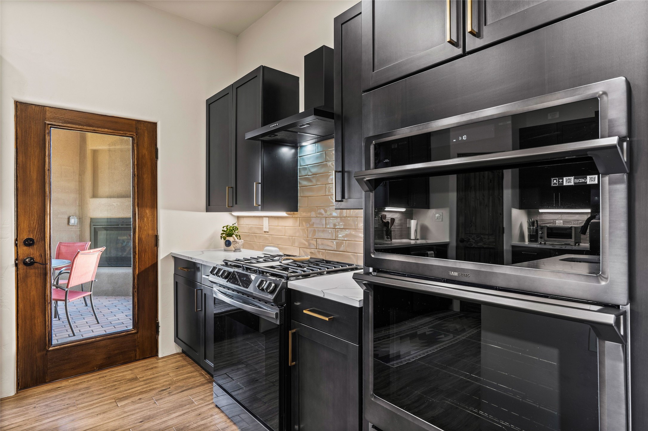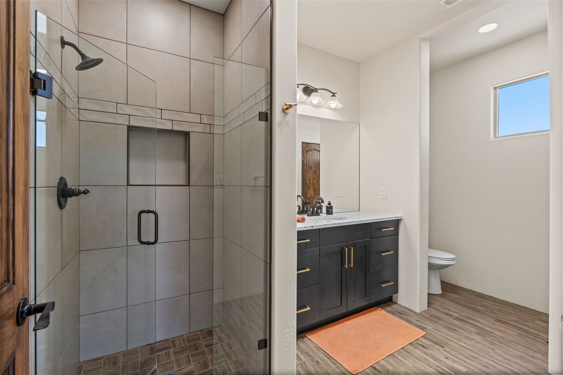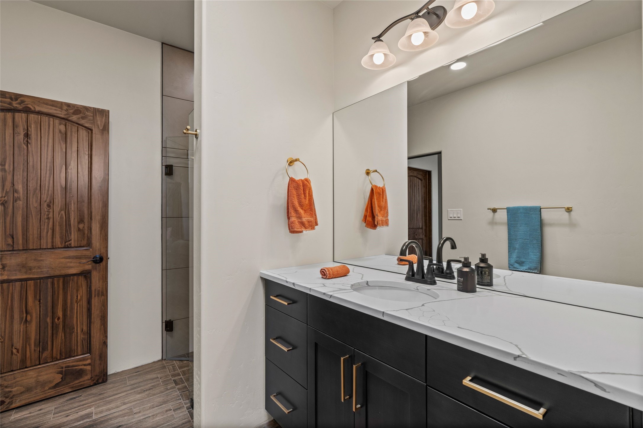 Outstanding property nestled in the community of La Pradera. This 3 bedroom, 4 bath residence offers modern luxury and an effortless living environment. Built just three years ago & lightly lived in - this residence boasts a large chef's kitchen including quartz countertops, subway tile backsplash, island with secondary sink, dual ovens, a sleek black stainless steel appliance package, & pantry. Relax & enjoy the open floor plan with high ceilings, square vigas, as well as a cozy gas fireplace in the living room. The kitchen & dining areas are adjacent to the living room, providing great functionality with plenty of space for entertaining. The wonderful high-end finishes throughout this home were personally selected by the discerning homeowners. Each of the three bedrooms feature an ensuite bathroom, ensuring privacy & additional comfort. The bedroom off the entry has a Kiva fireplace & lots of natural light. The other secondary bedroom has a large walk-in closet. The spacious primary suite includes a walk-in closet, a luxurious bathroom with walk-in shower, soaking tub, & dual sinks. Large laundry room with sink & many built-ins add to the convenience & ease of this highly desirable property. This well-designed home features tile floors throughout, as well an abundant amount of storage. The property has a three car garage with My Q garage door openers, two storage closets, pre-wiring for an EV charger, & a tankless water heater. The Nest thermostat & Ring doorbell adds a touch of smart home integration. Multiple covered patios with brick flooring, & a gas fireplace adds to the ambiance of the outdoor spaces - creating an inviting space to enjoy year round. With only one neighboring home, this property enjoys a prime location next to a beautifully landscaped open space & backs onto one of the many scenic walking trails. This home is also set farther from I-25 than many others in the neighborhood. Close to many south side restaurants & shops. It's a must see!