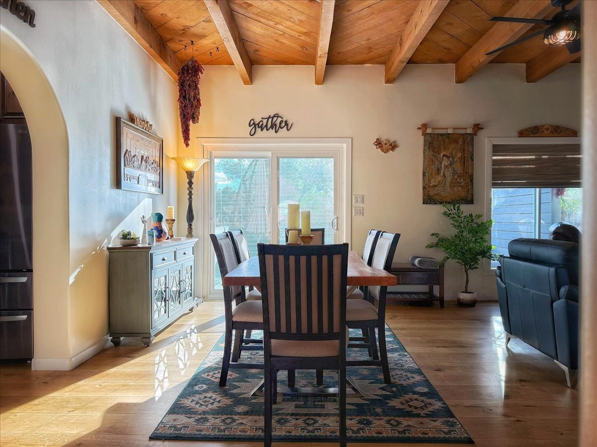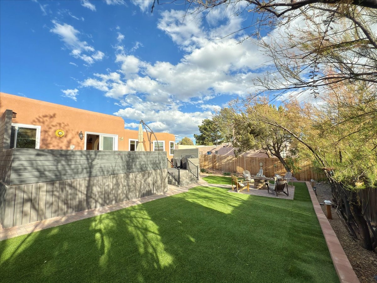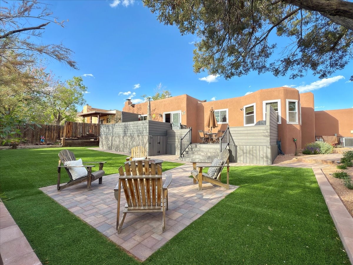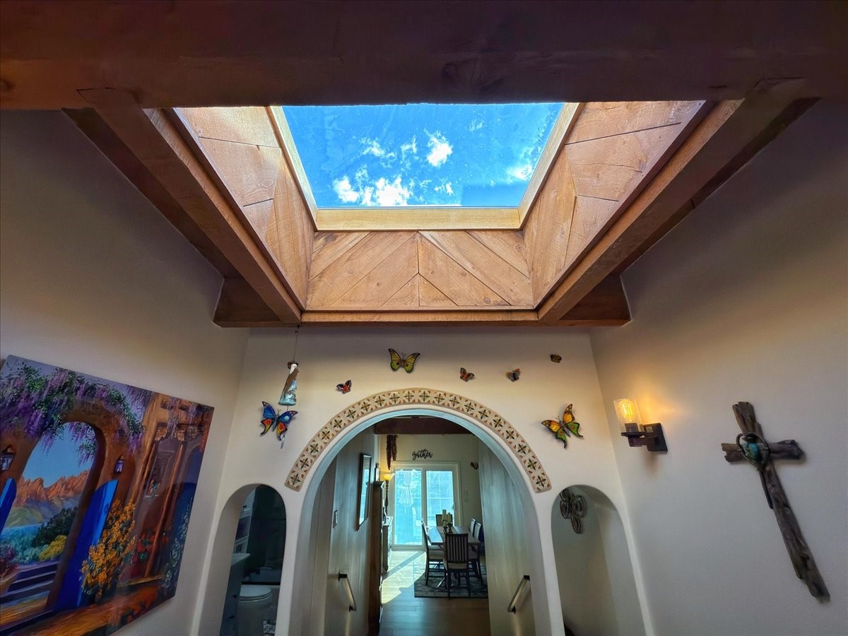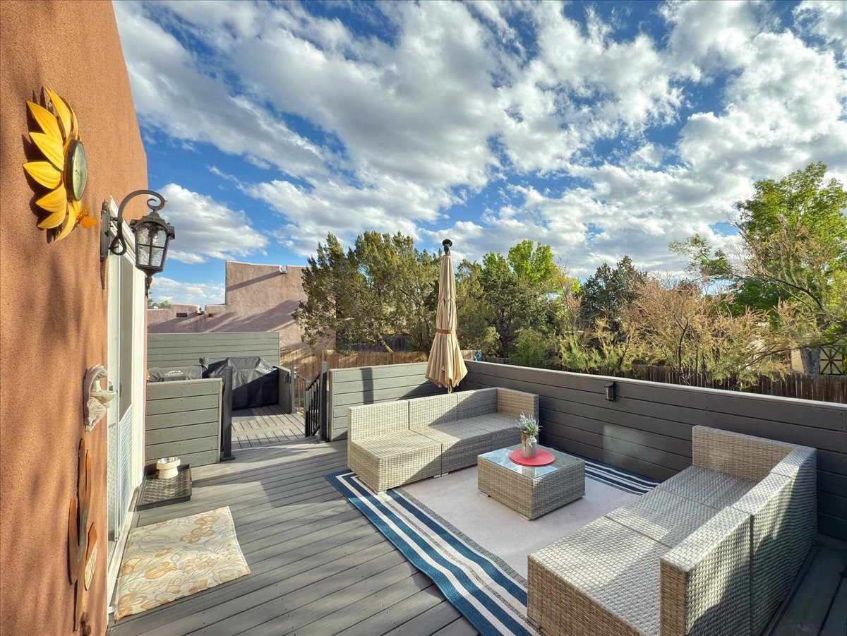 Elegant Santa Fe Retreat in Coveted Candelero Neighborhood. Step into timeless Santa Fe elegance with this beautifully refreshed, custom residence--where classic charm meets modern luxury. Nestled in the heart of Santa Fe, this spacious home invites you in with a grand entry hall bathed in natural light from a large skylight and accented with refined architectural details. Inside, you'll find expansive living spaces adorned with authentic Saltillo tile and wood flooring. Soaring, beamed ceilings with tongue-and-groove detailing elevate the living room's ambiance, while French doors open to a brand-new deck--ideal for alfresco dining and upscale entertaining under the New Mexico sky. The thoughtfully designed split-bedroom floor plan offers both privacy and flow, and the generously sized kitchen features a charming round breakfast nook framed by windows--perfect for morning coffee or quiet reflection.Every detail speaks of quality and care:New furnace (2022)Champion windows throughout (2023) with a transferable lifetime warrantyNew central A/C unit (2024)The fully fenced backyard is an oasis with a Trex deck and turf. This peaceful, private sanctuary is ready for your personal touches.This exquisite home embodies Santa Fe living--rich in style, comfort, and convenience. Your luxurious Southwest lifestyle begins here.
