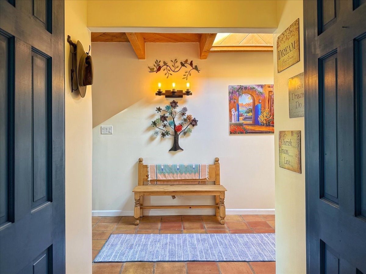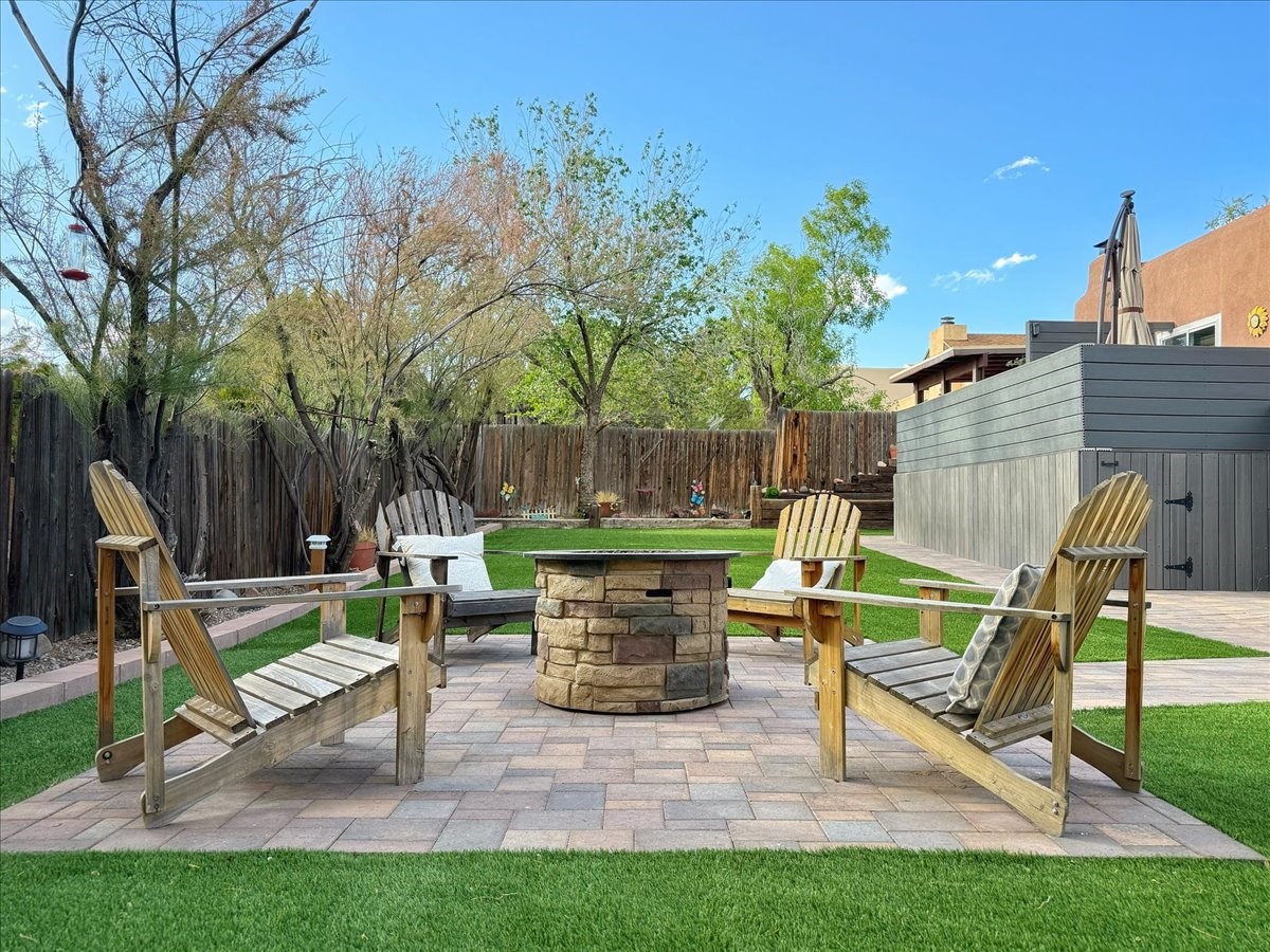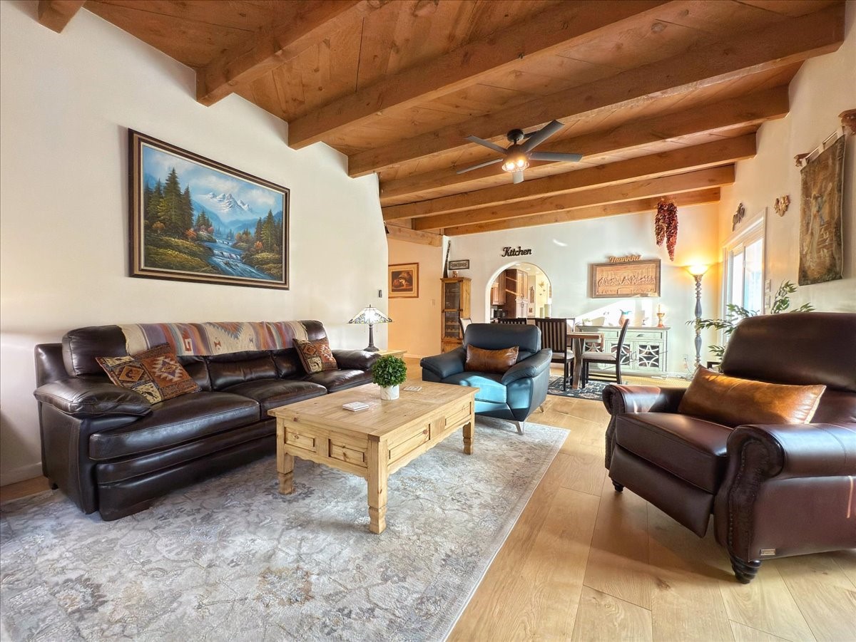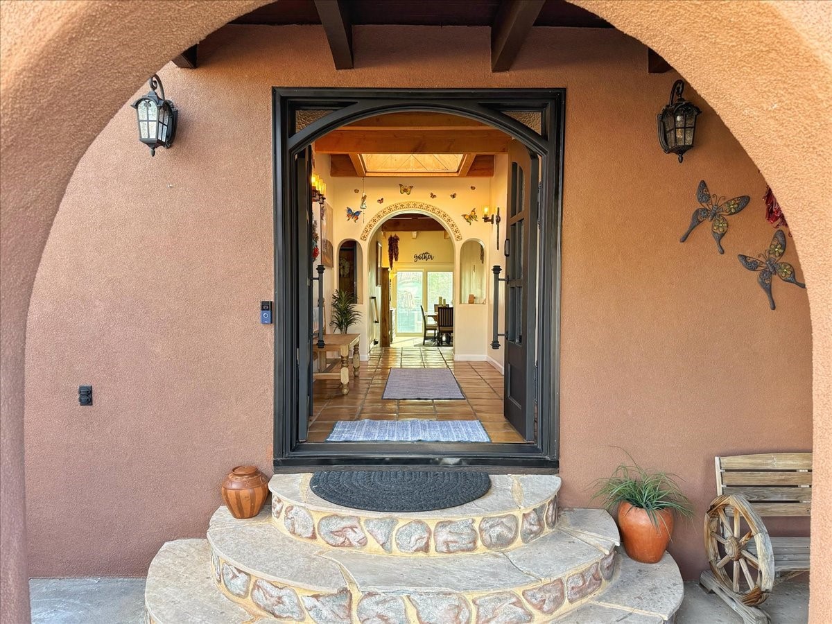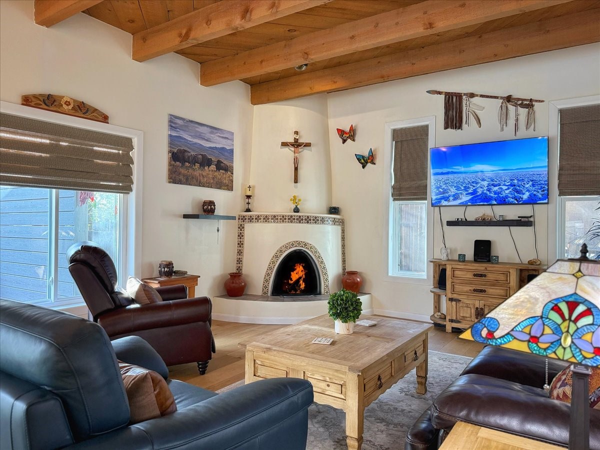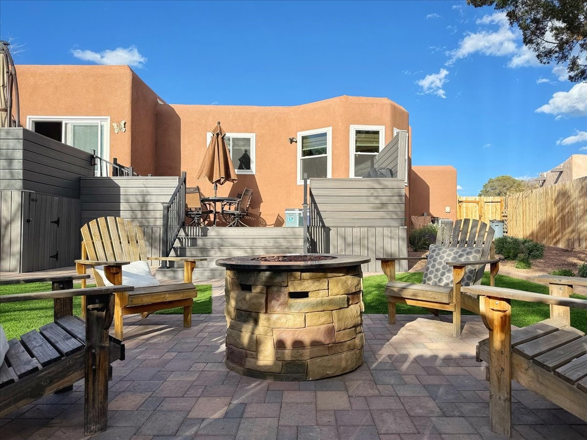Elegant Santa Fe Retreat in Coveted Candelero Neighborhood. Step into timeless Santa Fe elegance with this beautifully refreshed, custom residence--where classic charm meets modern luxury. Nestled in the heart of Santa Fe, this spacious home invites you in with a grand entry hall bathed in natural light from a large skylight and accented with refined architectural details. Inside, you'll find expansive living spaces adorned with authentic Saltillo tile and wood flooring. Soaring, beamed ceilings with tongue-and-groove detailing elevate the living room's ambiance, while French doors open to a brand-new deck--ideal for alfresco dining and upscale entertaining under the New Mexico sky. The thoughtfully designed split-bedroom floor plan offers both privacy and flow, and the generously sized kitchen features a charming round breakfast nook framed by windows--perfect for morning coffee or quiet reflection.Every detail speaks of quality and care:New furnace (2022)Champion windows throughout (2023) with a transferable lifetime warrantyNew central A/C unit (2024)The fully fenced backyard is an oasis with a Trex deck and turf. This peaceful, private sanctuary is ready for your personal touches.This exquisite home embodies Santa Fe living--rich in style, comfort, and convenience. Your luxurious Southwest lifestyle begins here.