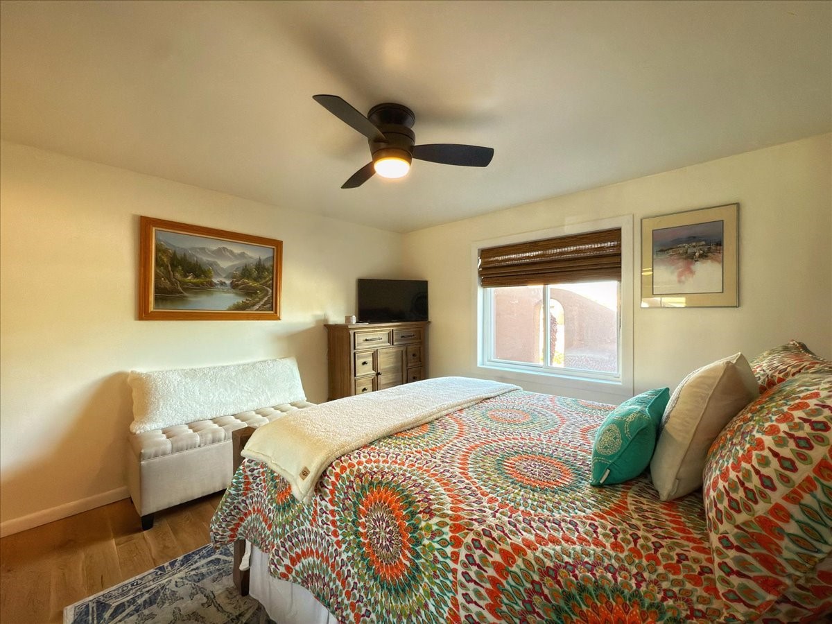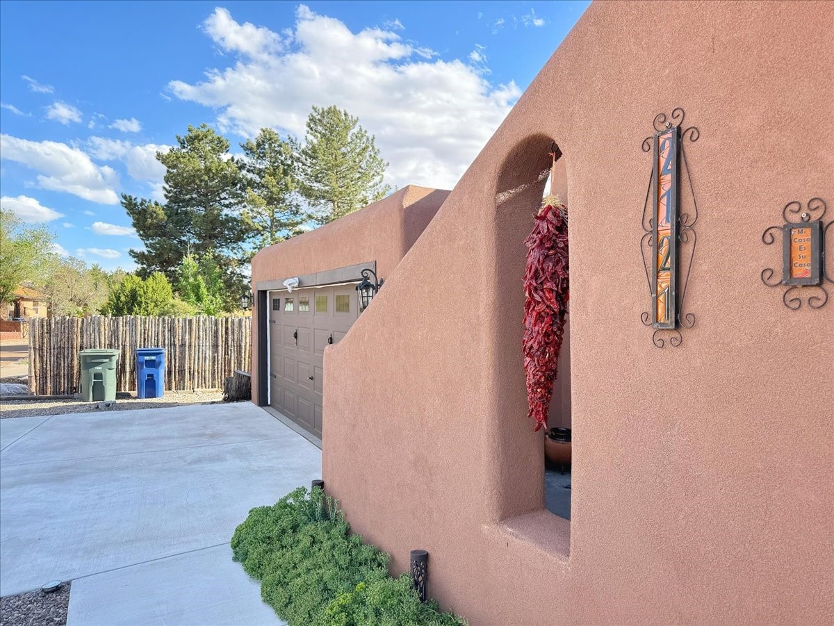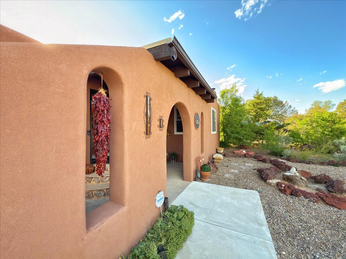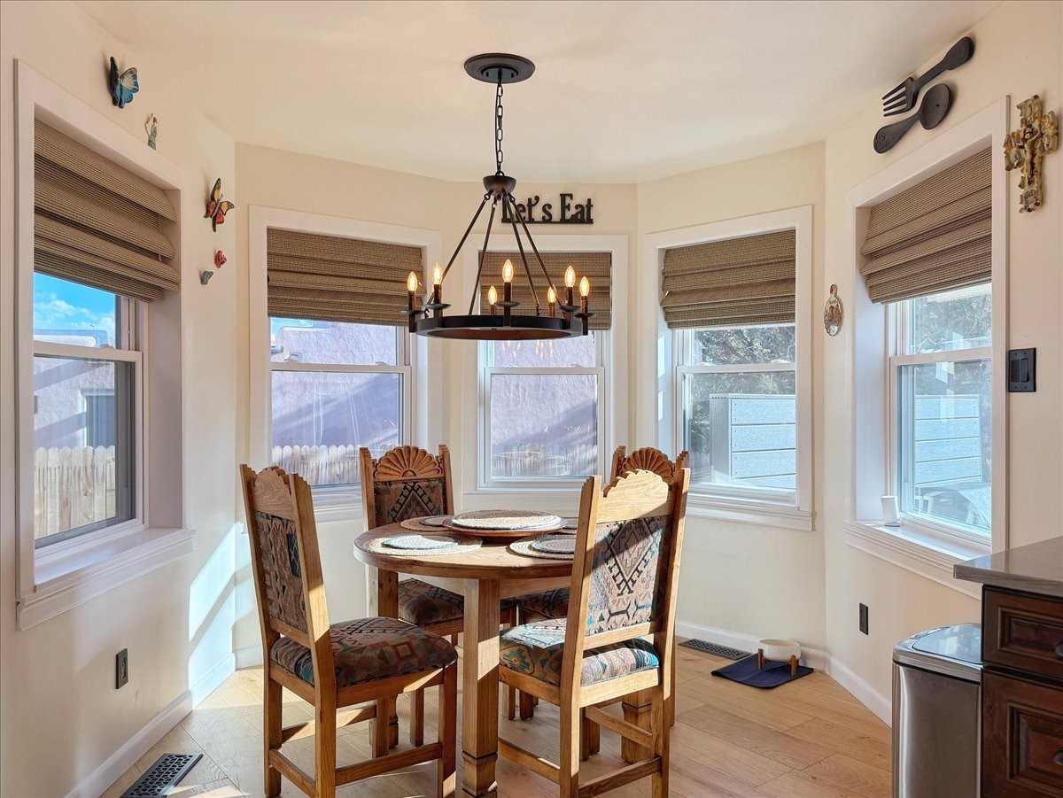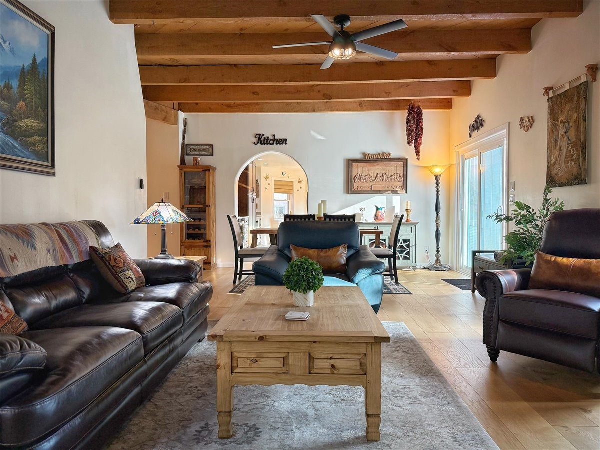 Elegant Santa Fe Retreat in Coveted Candelero Neighborhood. Step into timeless Santa Fe elegance with this beautifully refreshed, custom residence--where classic charm meets modern luxury. Nestled in the heart of Santa Fe, this spacious home invites you in with a grand entry hall bathed in natural light from a large skylight and accented with refined architectural details. Inside, you'll find expansive living spaces adorned with authentic Saltillo tile and wood flooring. Soaring, beamed ceilings with tongue-and-groove detailing elevate the living room's ambiance, while French doors open to a brand-new deck--ideal for alfresco dining and upscale entertaining under the New Mexico sky. The thoughtfully designed split-bedroom floor plan offers both privacy and flow, and the generously sized kitchen features a charming round breakfast nook framed by windows--perfect for morning coffee or quiet reflection.Every detail speaks of quality and care:New furnace (2022)Champion windows throughout (2023) with a transferable lifetime warrantyNew central A/C unit (2024)The fully fenced backyard is an oasis with a Trex deck and turf. This peaceful, private sanctuary is ready for your personal touches.This exquisite home embodies Santa Fe living--rich in style, comfort, and convenience. Your luxurious Southwest lifestyle begins here.