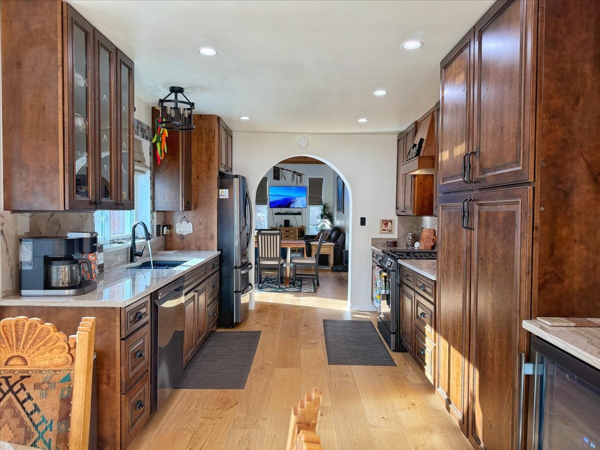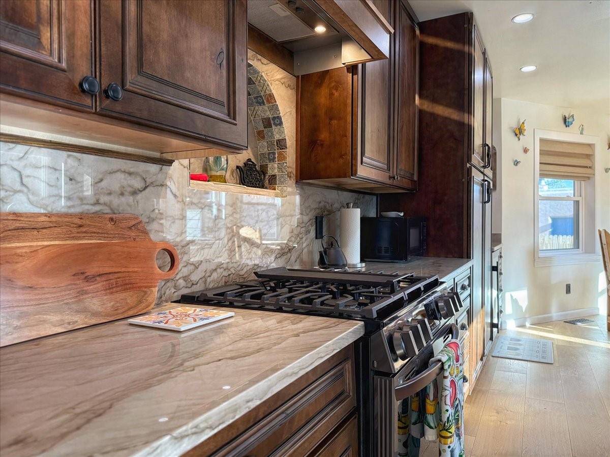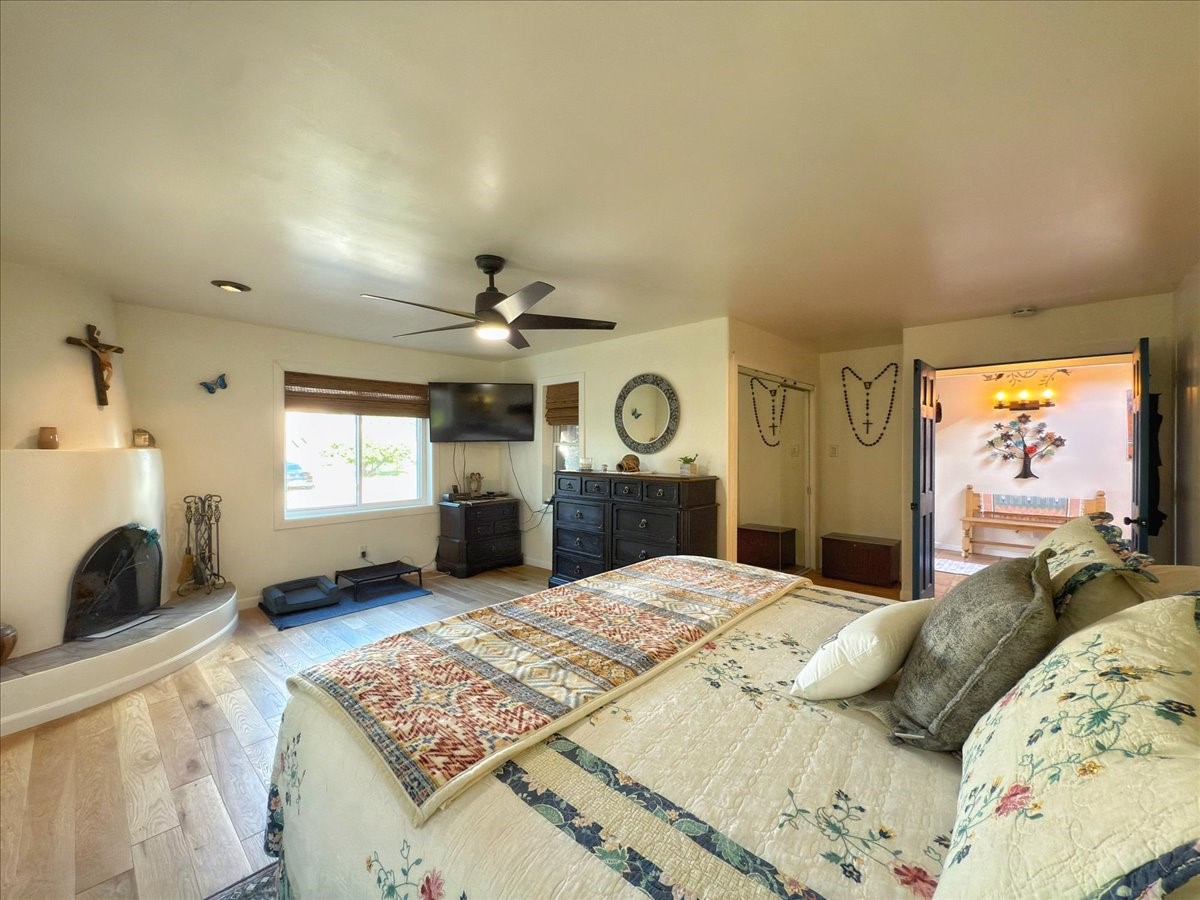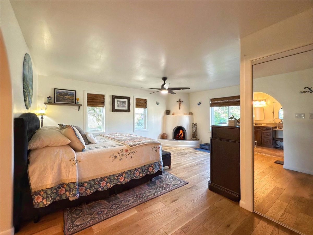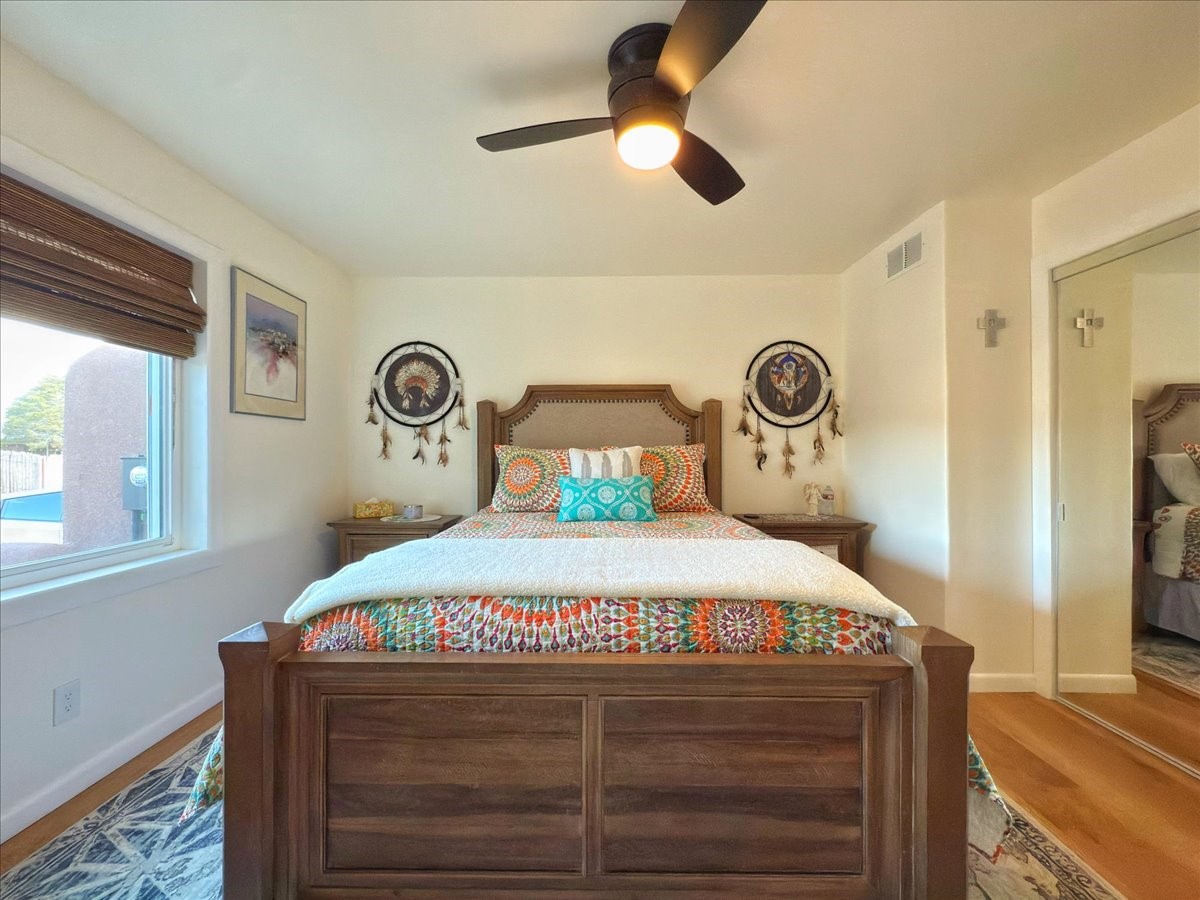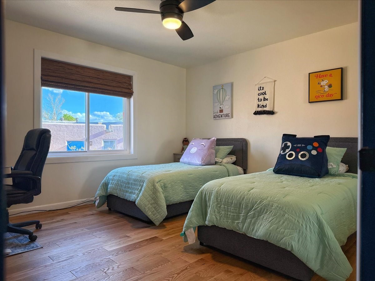 Elegant Santa Fe Retreat in Coveted Candelero Neighborhood. Step into timeless Santa Fe elegance with this beautifully refreshed, custom residence--where classic charm meets modern luxury. Nestled in the heart of Santa Fe, this spacious home invites you in with a grand entry hall bathed in natural light from a large skylight and accented with refined architectural details. Inside, you'll find expansive living spaces adorned with authentic Saltillo tile and wood flooring. Soaring, beamed ceilings with tongue-and-groove detailing elevate the living room's ambiance, while French doors open to a brand-new deck--ideal for alfresco dining and upscale entertaining under the New Mexico sky. The thoughtfully designed split-bedroom floor plan offers both privacy and flow, and the generously sized kitchen features a charming round breakfast nook framed by windows--perfect for morning coffee or quiet reflection.Every detail speaks of quality and care:New furnace (2022)Champion windows throughout (2023) with a transferable lifetime warrantyNew central A/C unit (2024)The fully fenced backyard is an oasis with a Trex deck and turf. This peaceful, private sanctuary is ready for your personal touches.This exquisite home embodies Santa Fe living--rich in style, comfort, and convenience. Your luxurious Southwest lifestyle begins here.