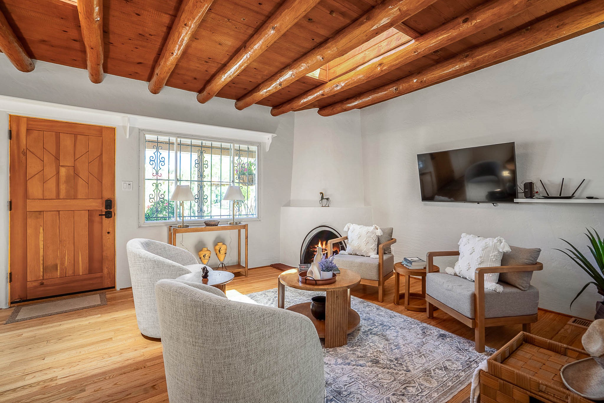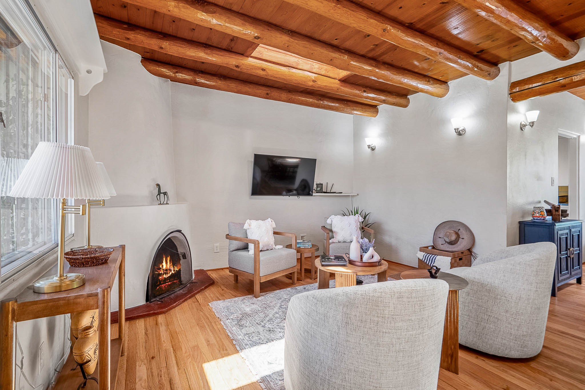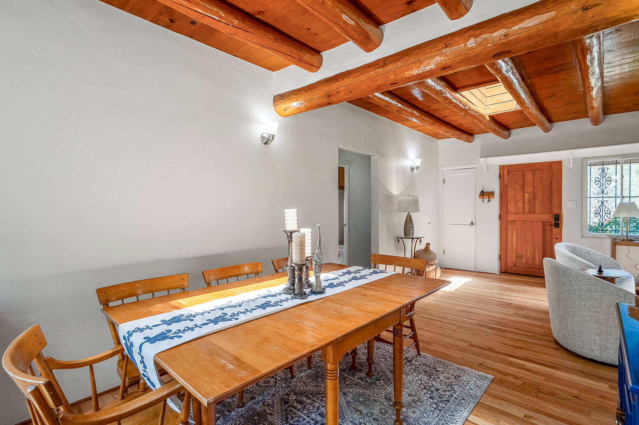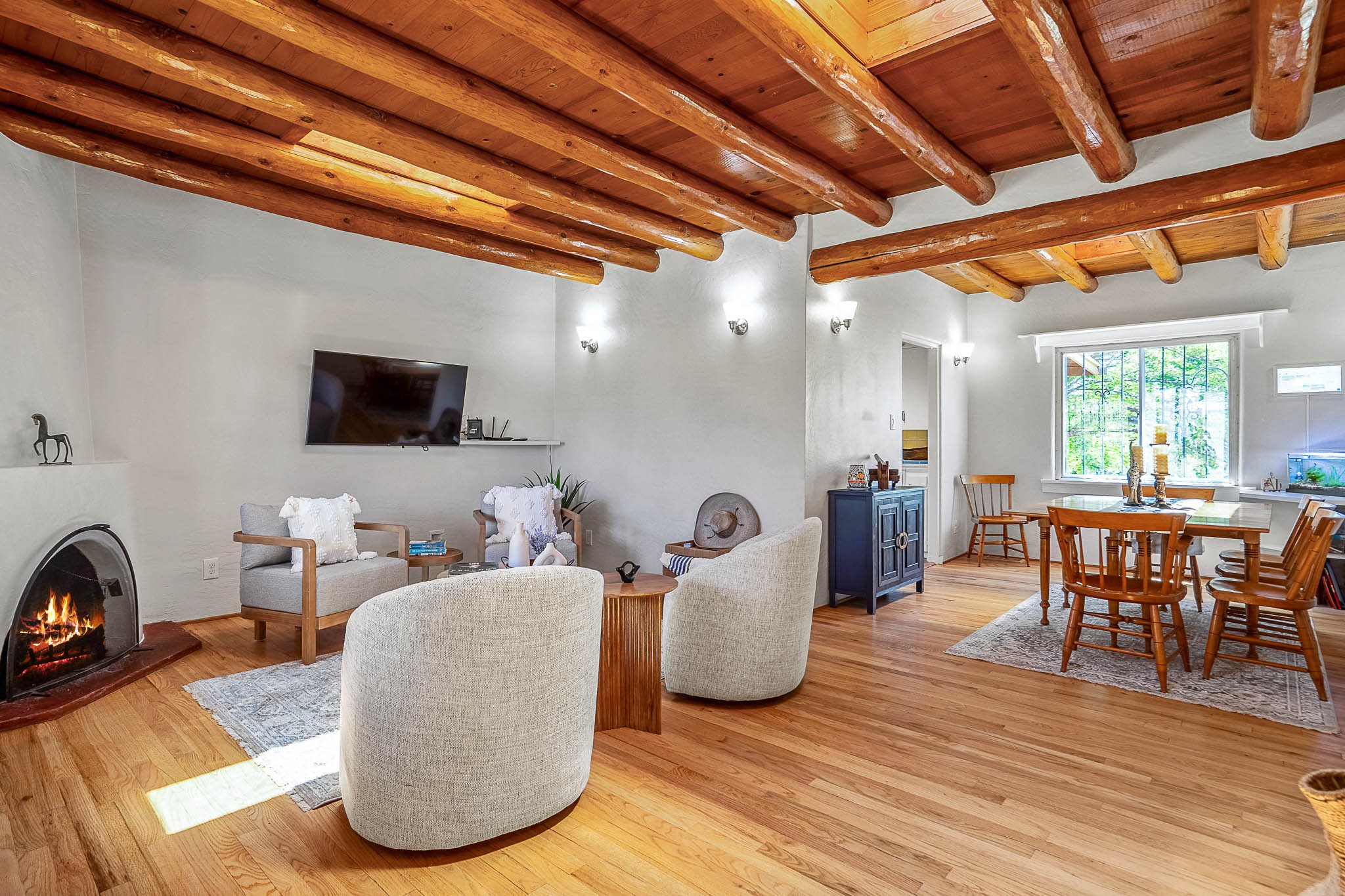 Classic Stamm located in the highly desirable Casa Linda neighborhood. This charming two-bedroom, one-bathroom home is situated within a well established Stamm neighborhood, known for its classic architectural style and central location.Inside, the residence boasts beautiful exposed vigas, original oak hardwood floors throughout (except in the kitchen), and a welcoming kiva wood-burning fireplace, complemented by a traditional nicho. The original solid wood front door has been thoughtfully restored, enhancing the home's unique character and creating a warm and inviting entry.This property also offers modern conveniences such as central cooling, forced air heating, a tankless water heater, and the added benefit of an electric car charger. Recent updates include a newer roof with a transferable 5-year warranty, and for future expansion, blueprints for a primary suite addition & carport are also included. The home is set on a spacious lot, providing ample outdoor living space.Given the desirability of Stamm homes in this area, they tend to be highly sought after and sell quickly. Schedule a showing today!
