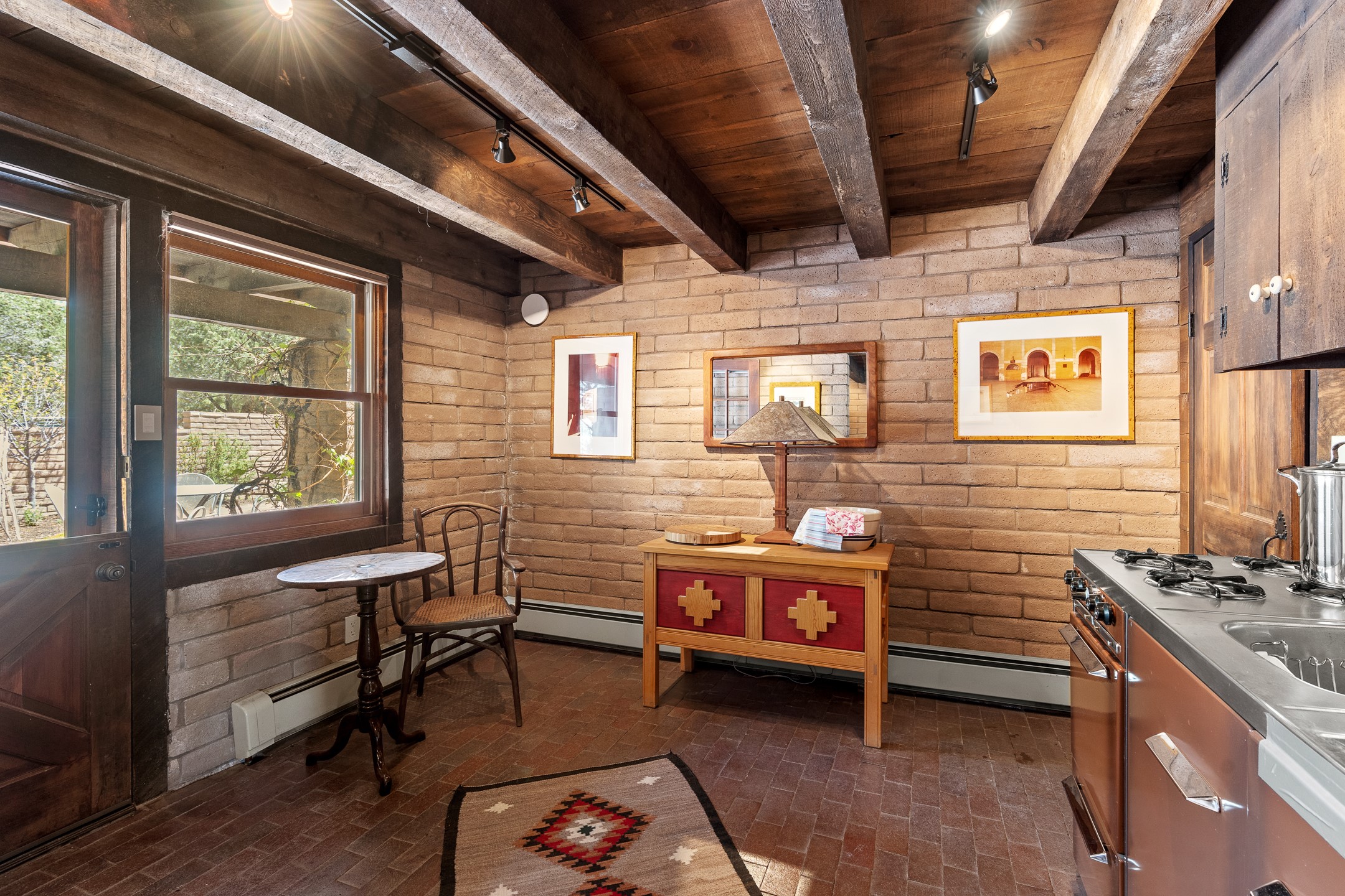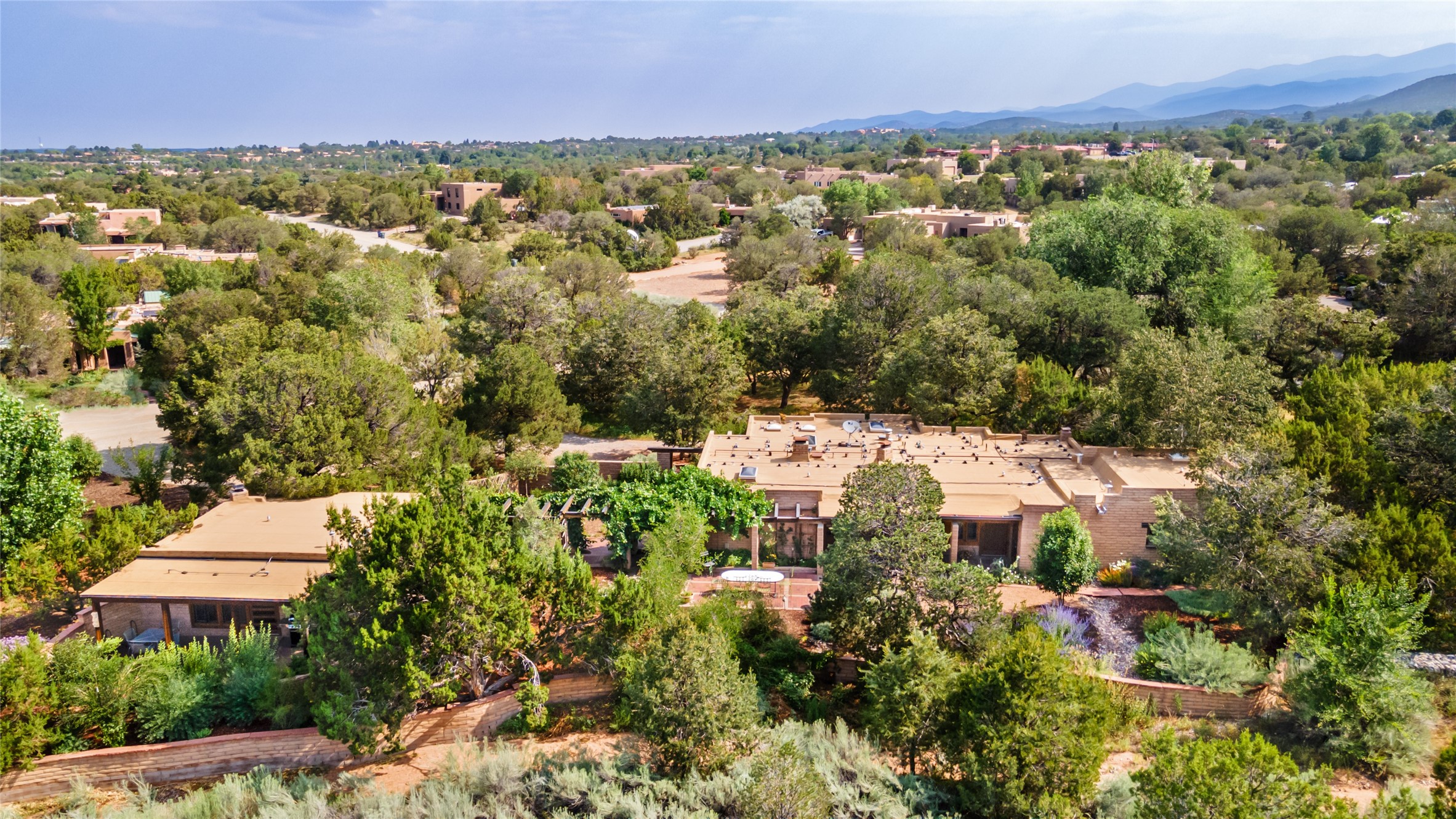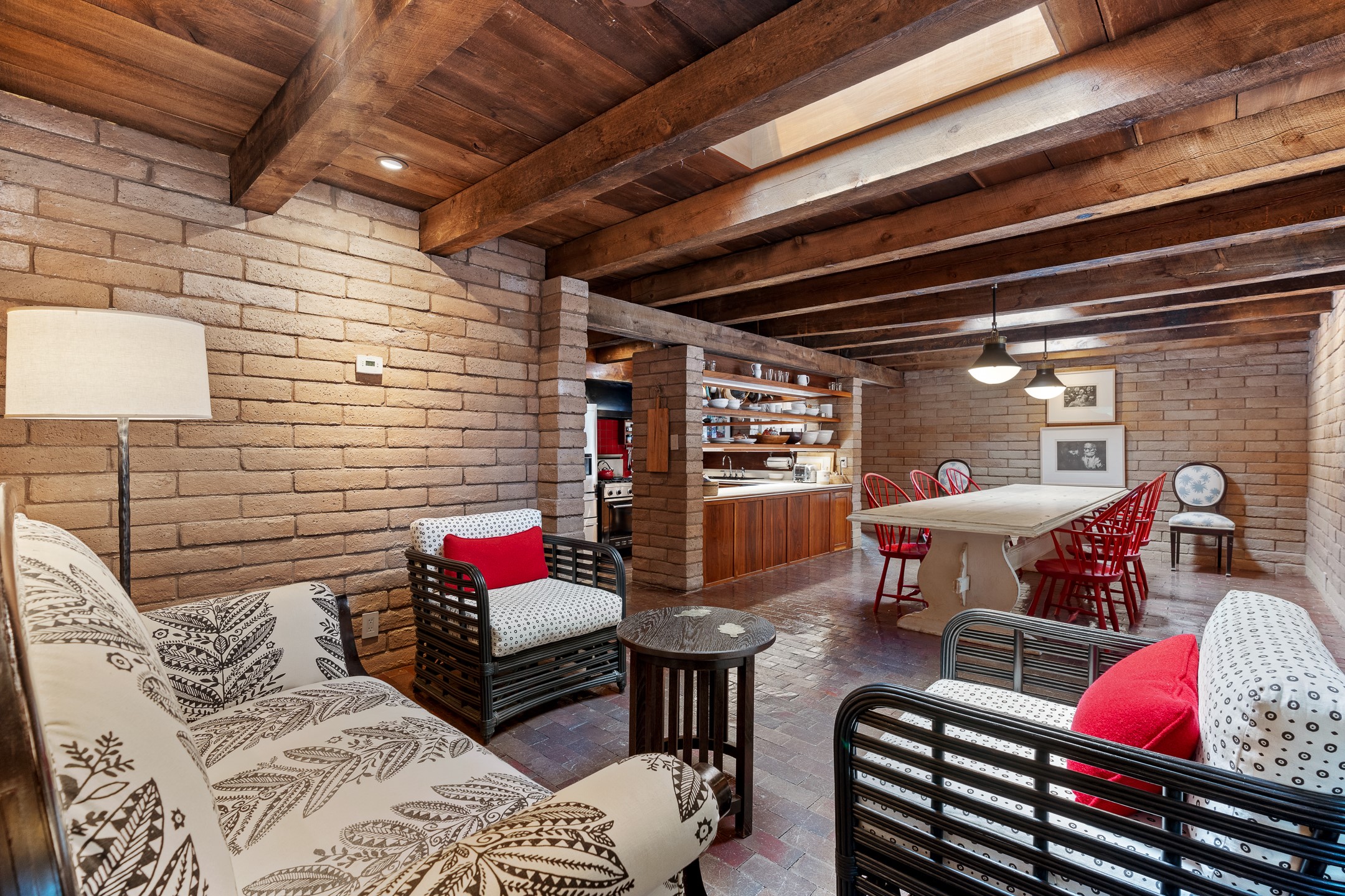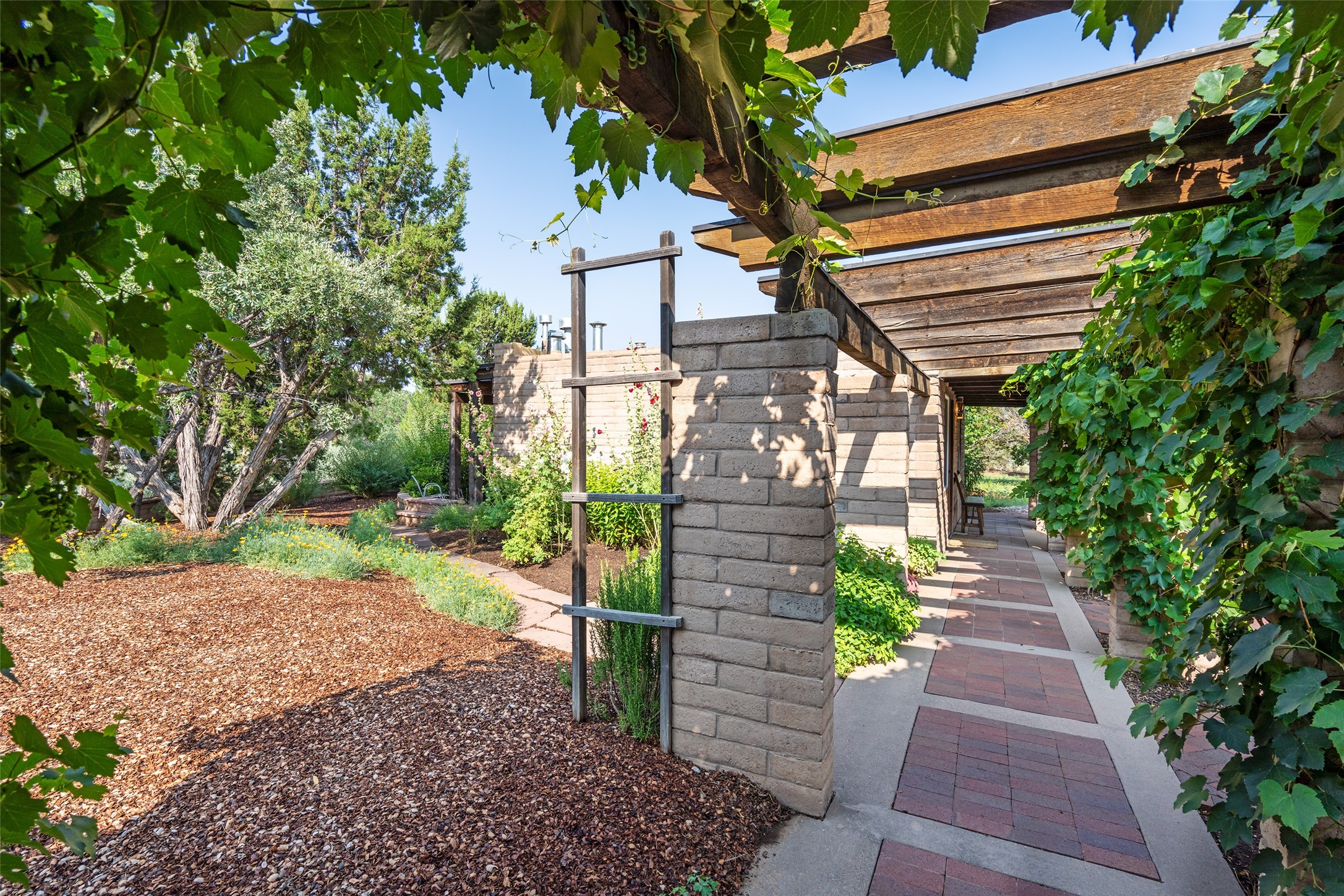 Nestled on 1.46 acres in the coveted Sol Y Lomas neighborhood, this exceptional property blends the earthy beauty of the Southwest with organic lines reminiscent of Frank Lloyd Wright. Thoughtfully curated by a master gardener, the grounds bloom with color and life--an oasis of natural wonder. Lovingly owned by the same family since 1978, the property includes an updated 2-bedroom, 2-bathroom main house (2,063 sq. ft.) and a charming 1-bedroom, 1-bathroom guest house (563 sq. ft.), connected by a breezeway draped in grapevines. Inside the main house, brick flooring and beamed ceilings carry a sense of grounded elegance throughout. At the heart of the home is the kitchen, with open shelving that connects seamlessly to the generous dining and sitting areas--perfect for casual gatherings or quiet evenings. The main living room, with views of the lush front courtyard, is anchored by a wood-burning fireplace and exudes warmth and comfort. The primary suite also features a fireplace and direct access to the western patio, inviting you to enjoy the surrounding beauty. Its bathroom is filled with natural light and includes a sculpted vessel soaking tub and a glass-walled walk-in shower. The guest bedroom, currently used as an office, offers yet another fireplace and the same warm, organic charm. The guest house feels like a step back in time, with its vintage full kitchen, spacious bedroom with ensuite bath, and access to a private patio--ideal for guests or creative retreat space. With timeless presence and inspired design, this remarkable property is a sanctuary of comfort, natural elegance, and casual sophistication.