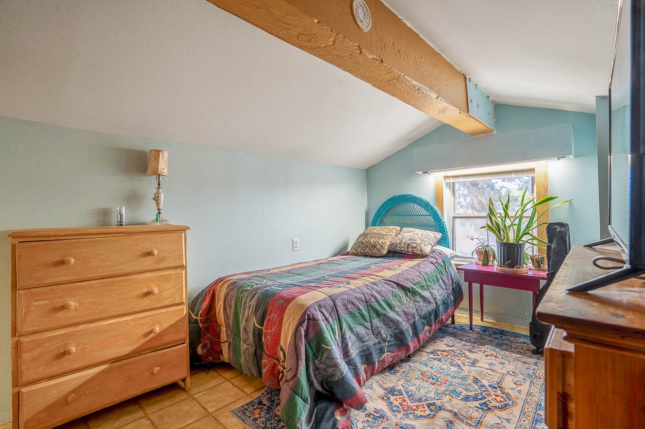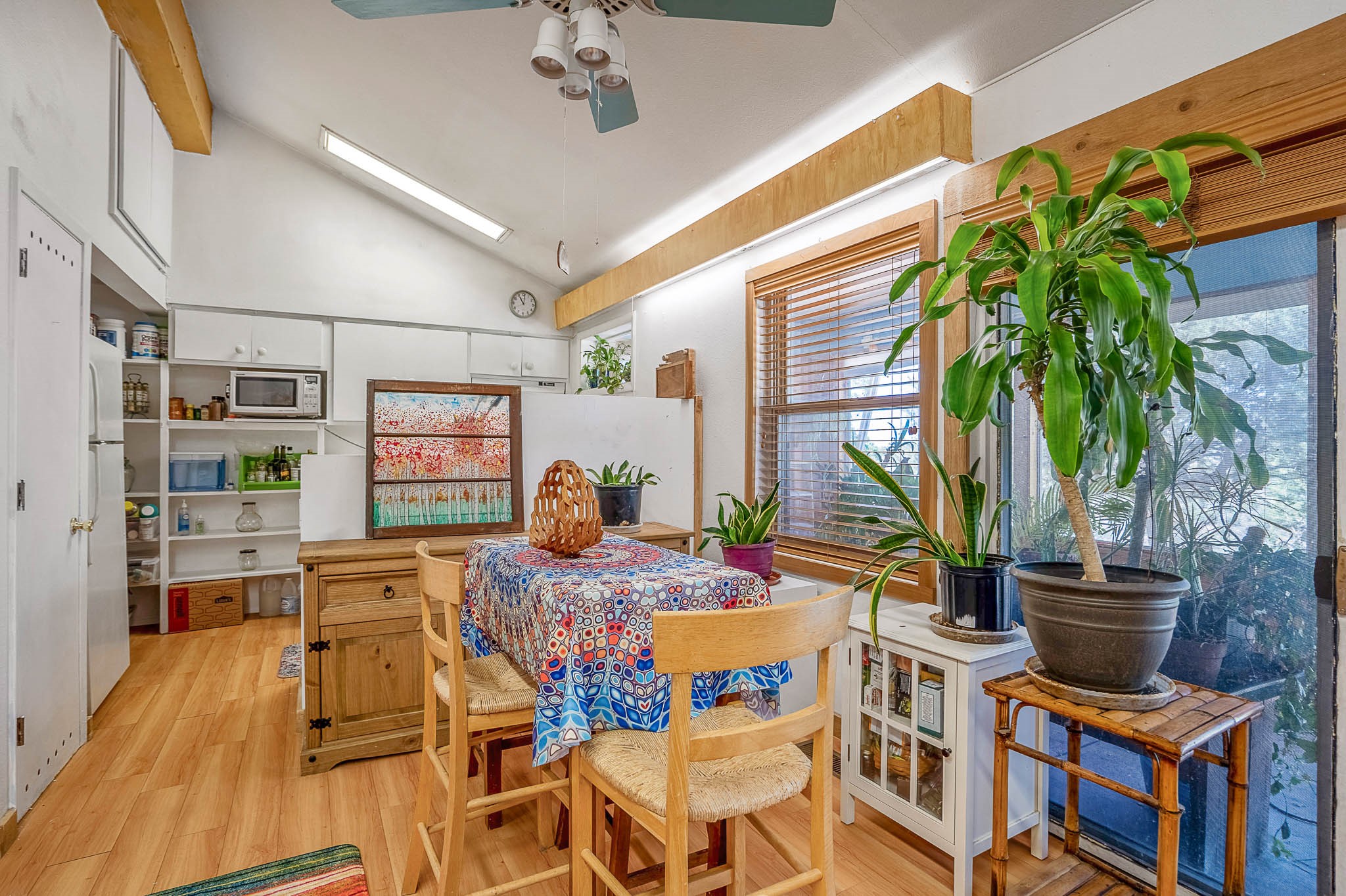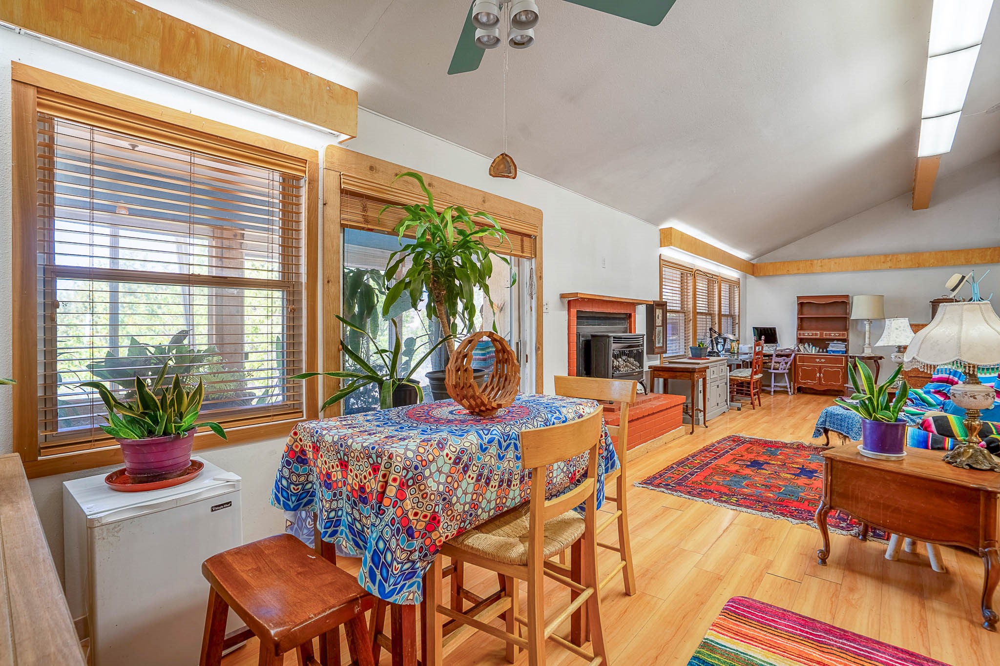 Discover this unique Cochiti Lake home, extensively remodeled in the early 90s to create an expansive, open great room with a soaring vaulted ceiling. The removal of the attic and most interior walls bathes the space in abundant natural light. This inviting home features two bedrooms, including a charming upper-floor loft, and two convenient ground-floor bathrooms. The modest kitchen has open shelving and an attached greenhouse offers year-round gardening potential. Outside, a lush, green backyard with fruit trees offers breathtaking views overlooking the Rio Grande Valley, Sandia Peak, and the Jemez Mountains. Enjoy the convenience of a 1-car garage, large storage shed, and proximity to golf and the serene no-wake lake.