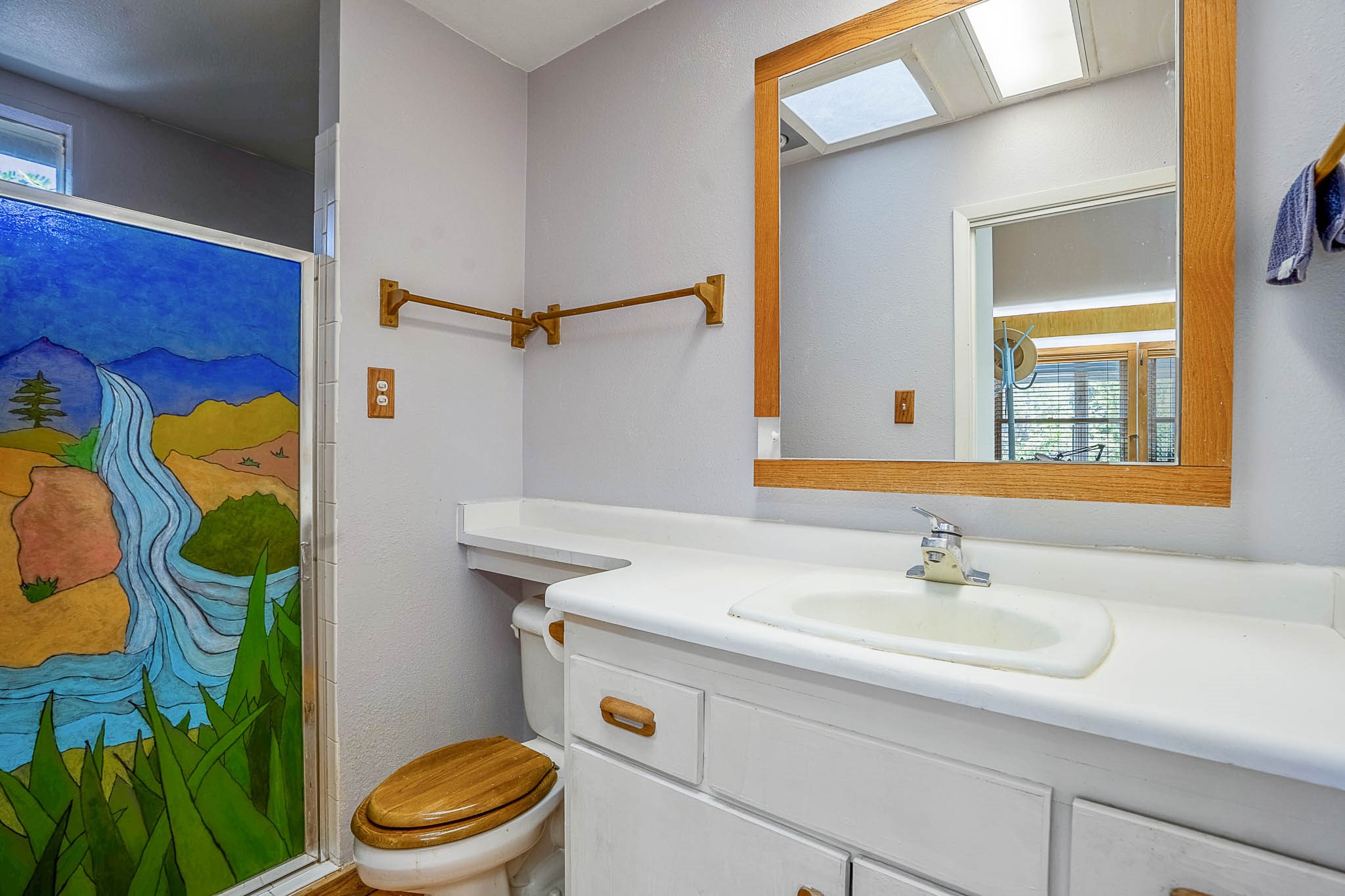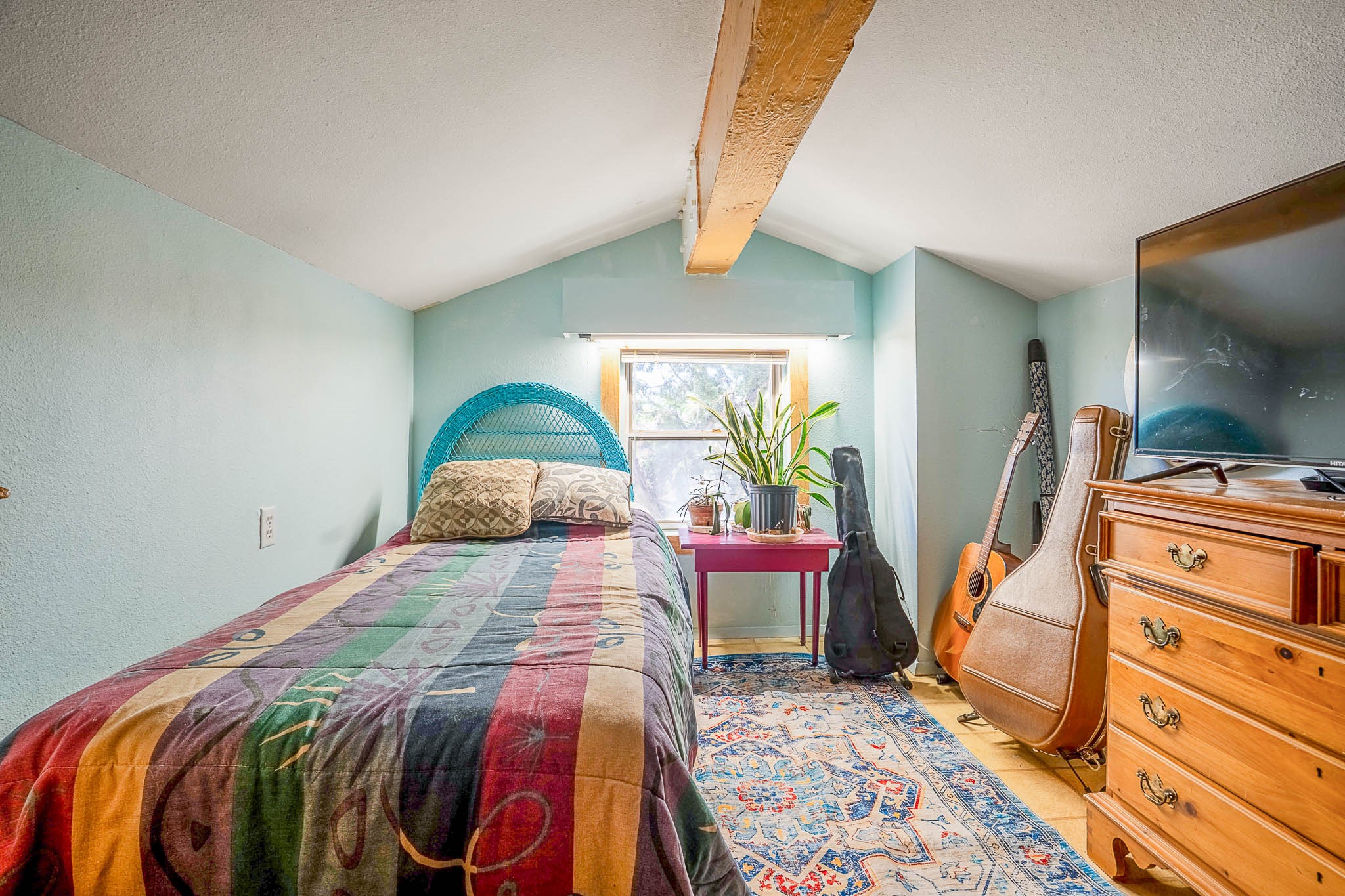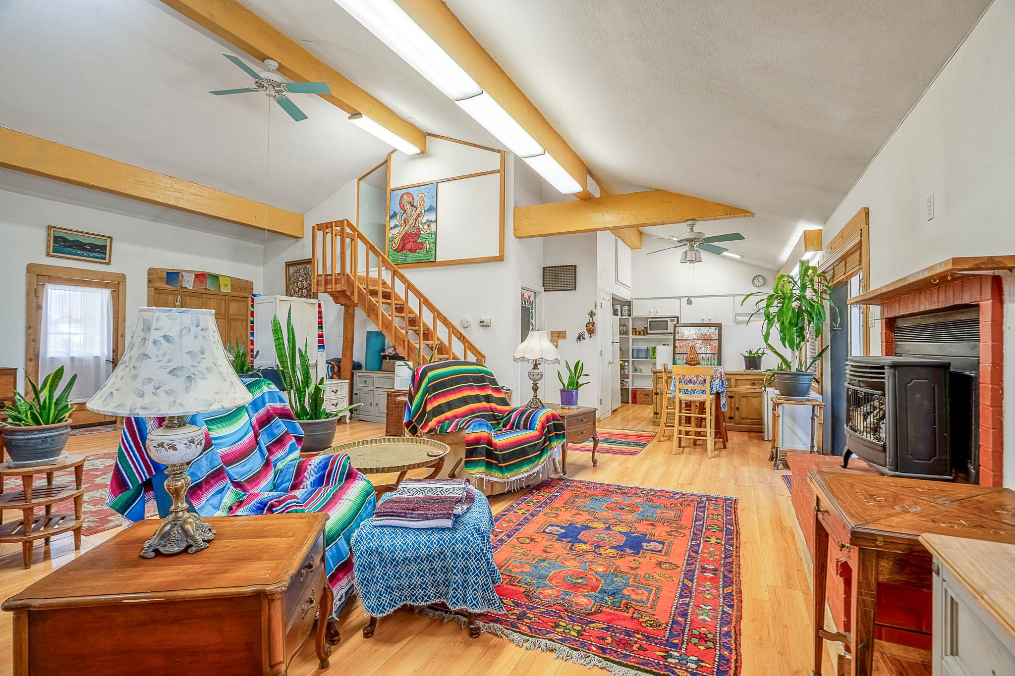 Discover this unique Cochiti Lake home, extensively remodeled in the early 90s to create an expansive, open great room with a soaring vaulted ceiling. The removal of the attic and most interior walls bathes the space in abundant natural light. This inviting home features two bedrooms, including a charming upper-floor loft, and two convenient ground-floor bathrooms. The modest kitchen has open shelving and an attached greenhouse offers year-round gardening potential. Outside, a lush, green backyard with fruit trees offers breathtaking views overlooking the Rio Grande Valley, Sandia Peak, and the Jemez Mountains. Enjoy the convenience of a 1-car garage, large storage shed, and proximity to golf and the serene no-wake lake.