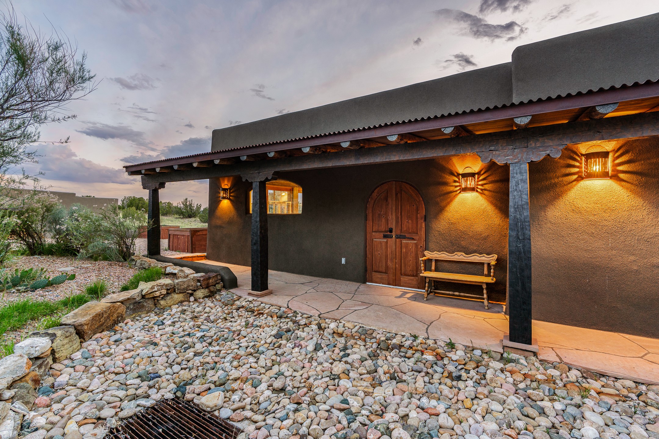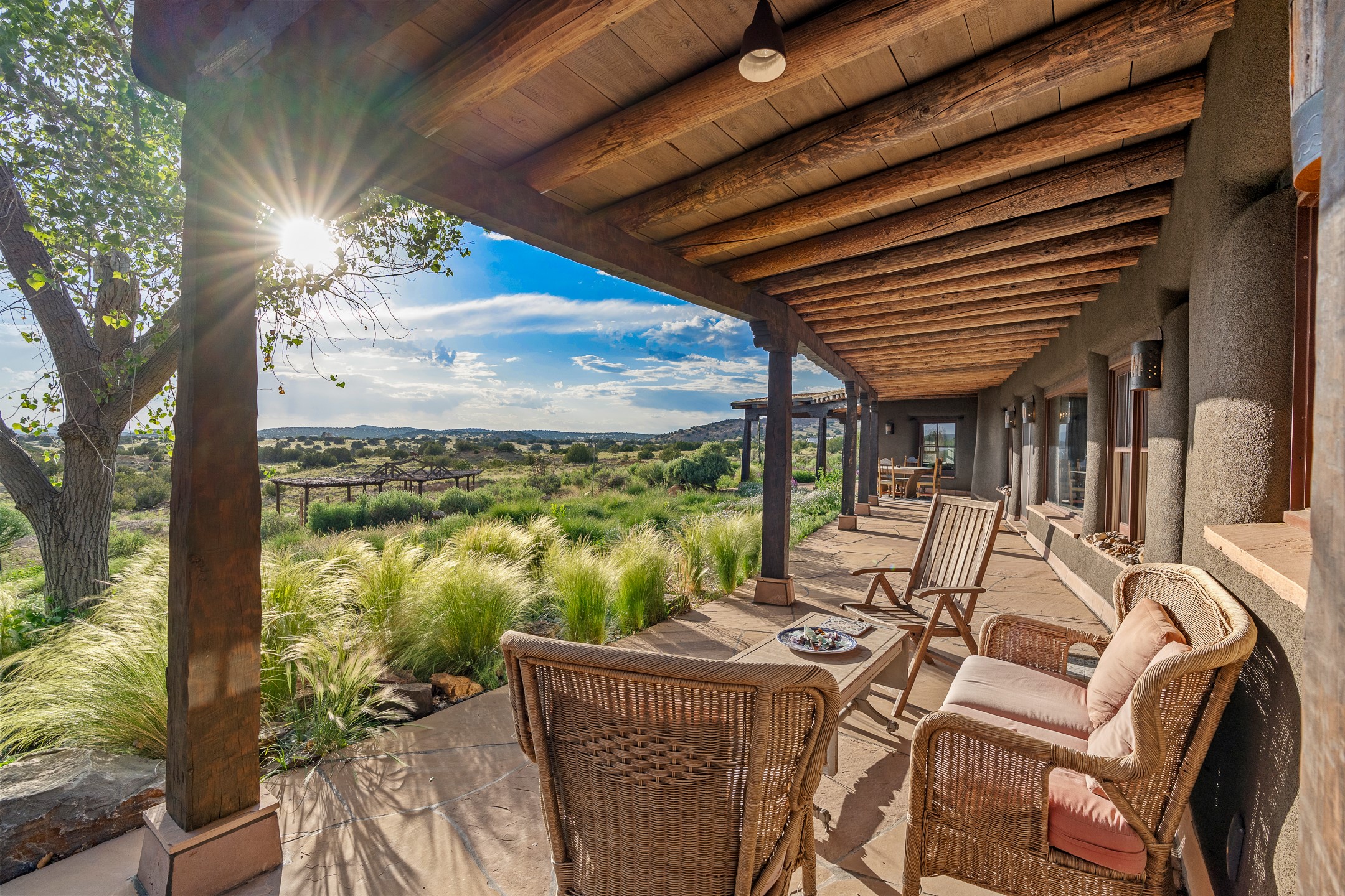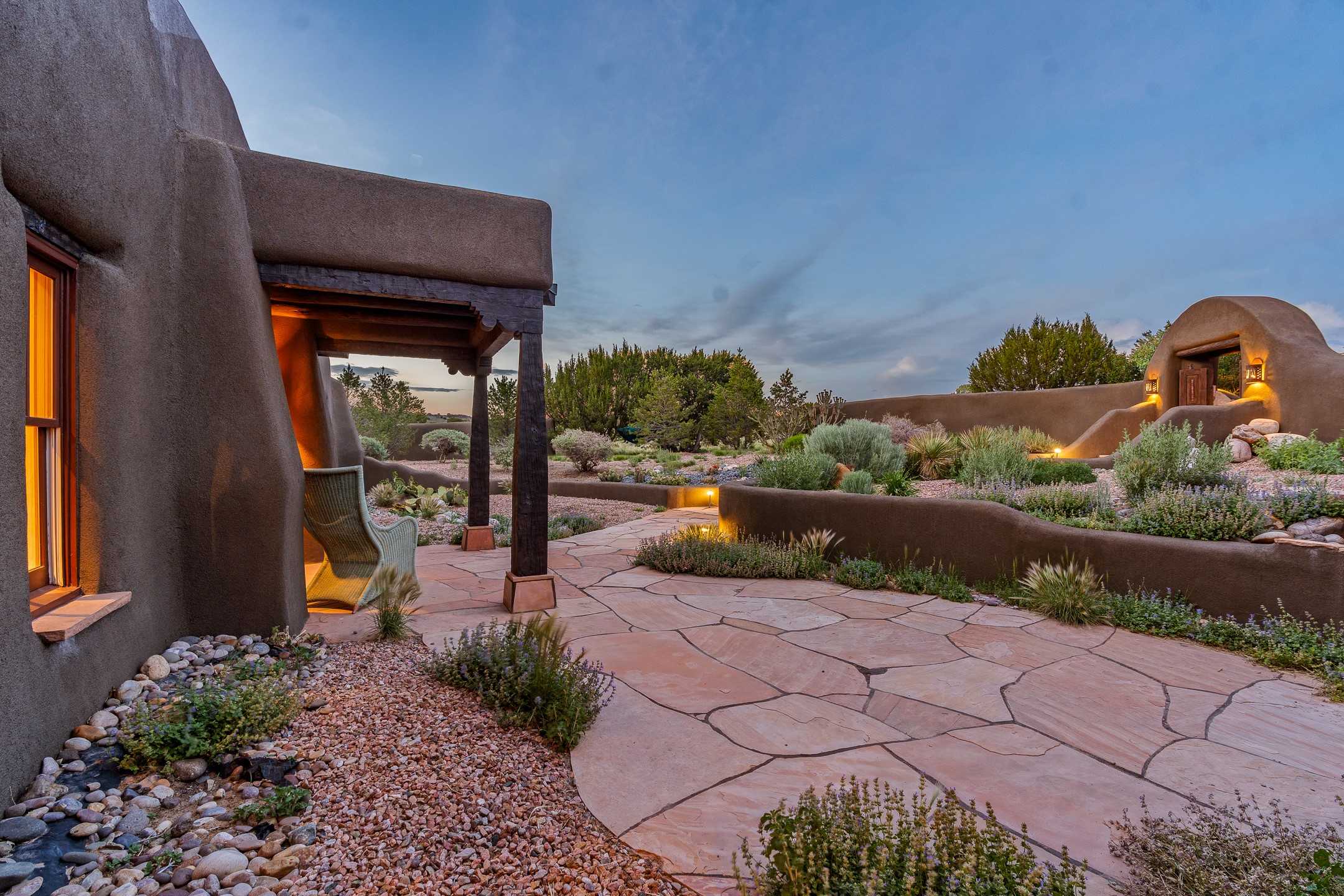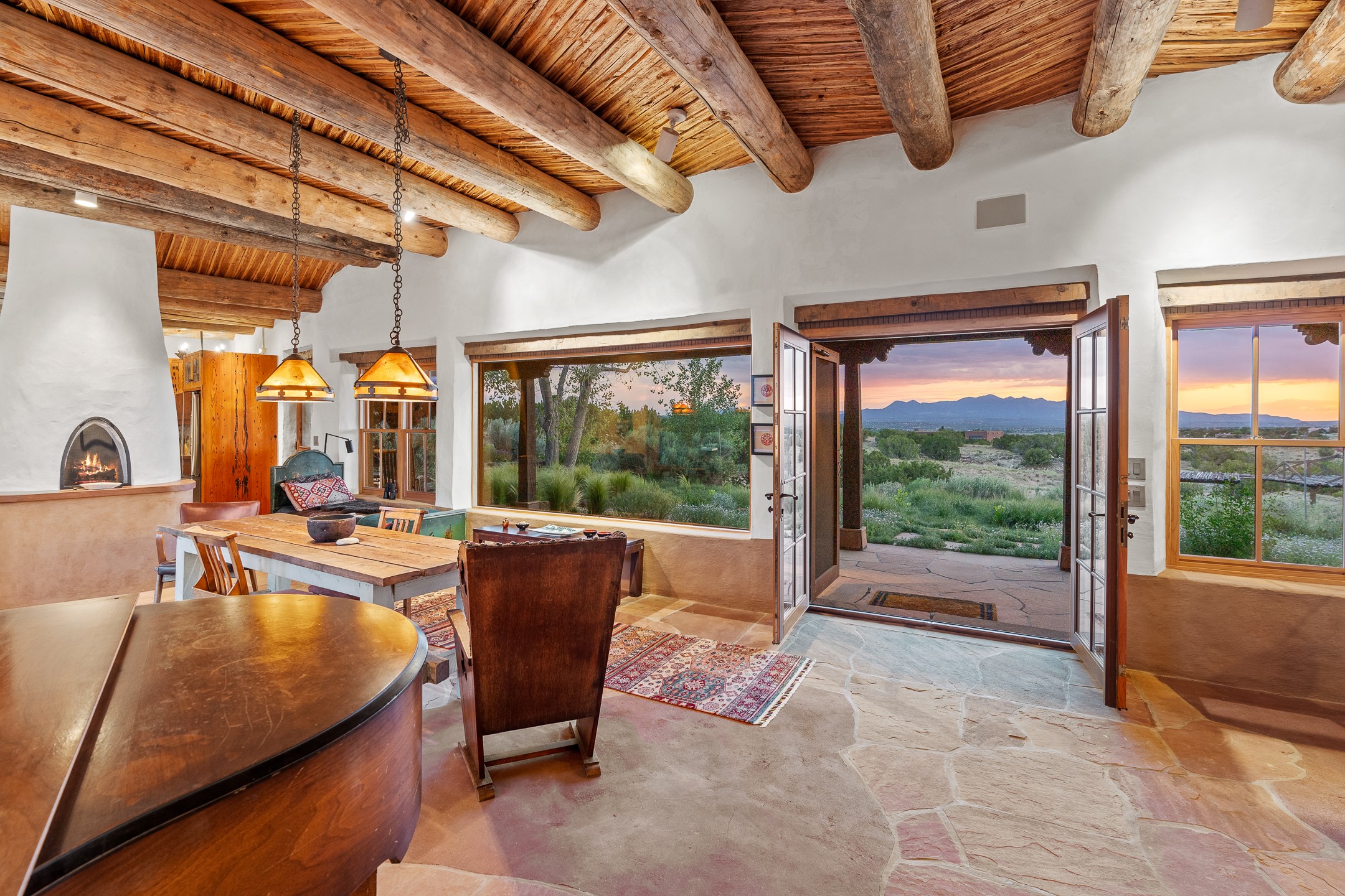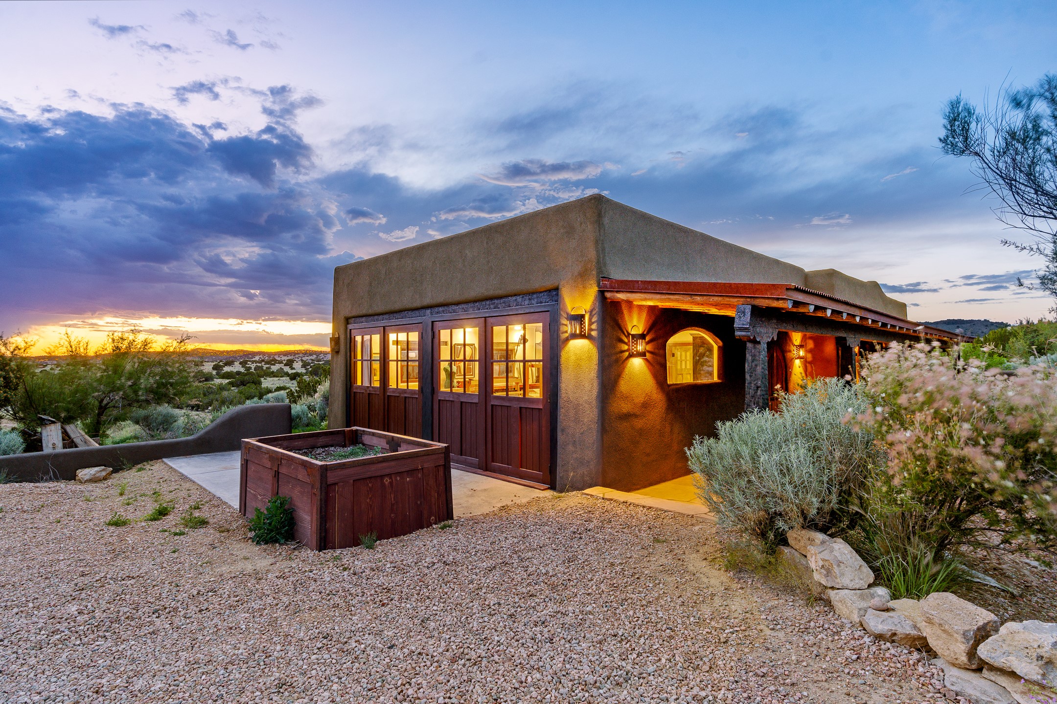 Stunning exemplary Architectural Masterpiece in Galisteo, constructed of solid adobe on 4.95 scenic acres with spectacular Ortiz Mountain views from almost every room. This gorgeous compound, recently refurbished, includes a main residence, guest house, art studio, and 1200 Sq. Ft of portal. Seamlessly integrating authentic techniques and materials with timeless and soulful elements, this home offers all the beauty, harmony and serenity one could desire. An Old Mexican archway and wooden gate lead to a zen-like courtyard with established xeriscaping. The traditional Latilla entry opens to a pitched ceiling of massive, antique, hand-hewn vigas with Arkansas split-cedar herringbone inlay. Adobe poured floors with flagstone. Clay slip wainscoted interior walls with plaster. Hand-adzed posts, beams and lintels. 80 year old hand-crafted, carved wood doors. Huge picture window and French doors to the portal. The kitchen showcases 100 year old river-retrieved heart of pine thunderbolt kitchen cabinets, Italian Bruno travertine counters, spacious island, sculptural double kiva, Viking range and cooktop, and walk-in pantry. Split bedroom plan offers maximum privacy. Primary suite is a true sanctuary with expansive, inspiring views, and an ensuite bath with double vanity, soaking tub for deep relaxation and walk-in shower. Detached Casita has an open kitchen and living area with French doors, bedroom with French doors, bath with double sink, and private portal with a kiva. The casita joins a heated and cooled attached Art studio, with carriage doors, making it possible to use as a garage. The portal leads to a charming study or sleeping nook. Professionally landscaped, there are two driveways and many quaint and private sitting areas surrounding the home, including an extraordinary Ramada with fire pit and hammocks to gaze at the stars. The adjoining walking trail leads to ancient pueblo ruins. Galisteo amenities include: community center, monthly brunches, 2 playgrounds, fire department, hiking, art tour, and Bosque River Reserve. 22 Solar panel array, whole house water purification, and underfloor heating. All baths have Noche travertine.