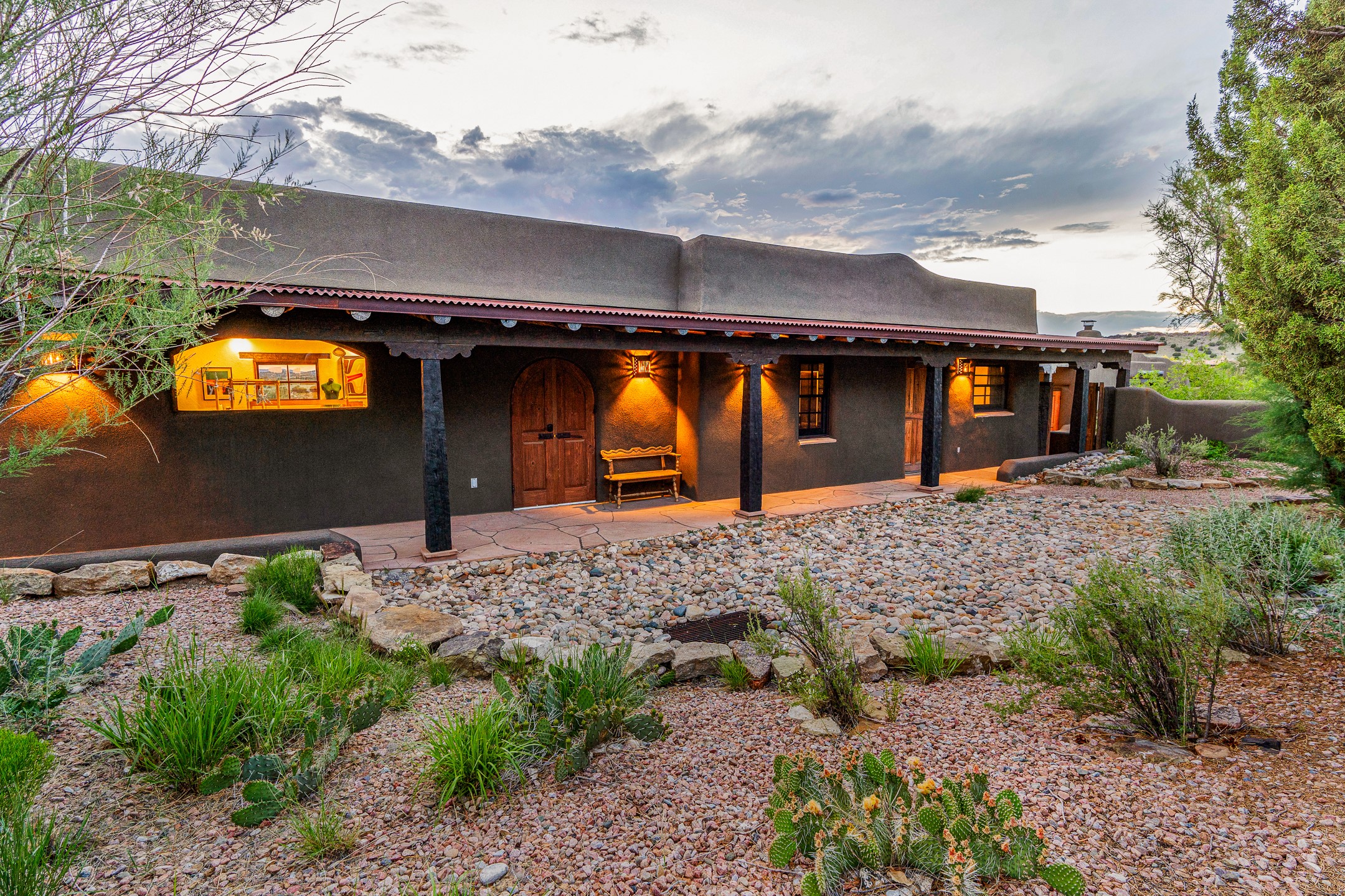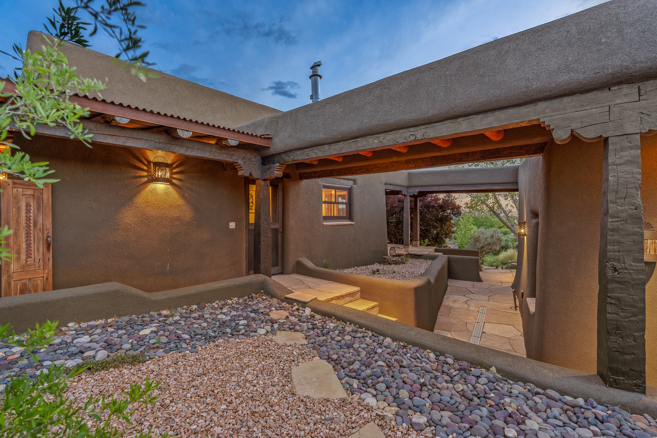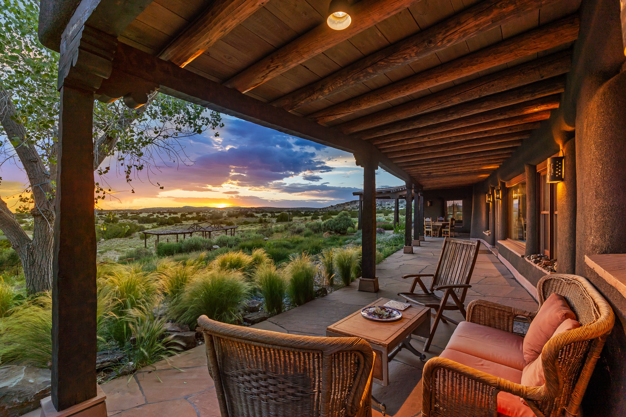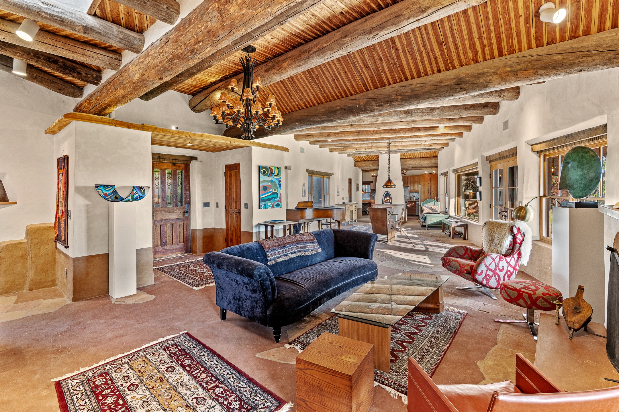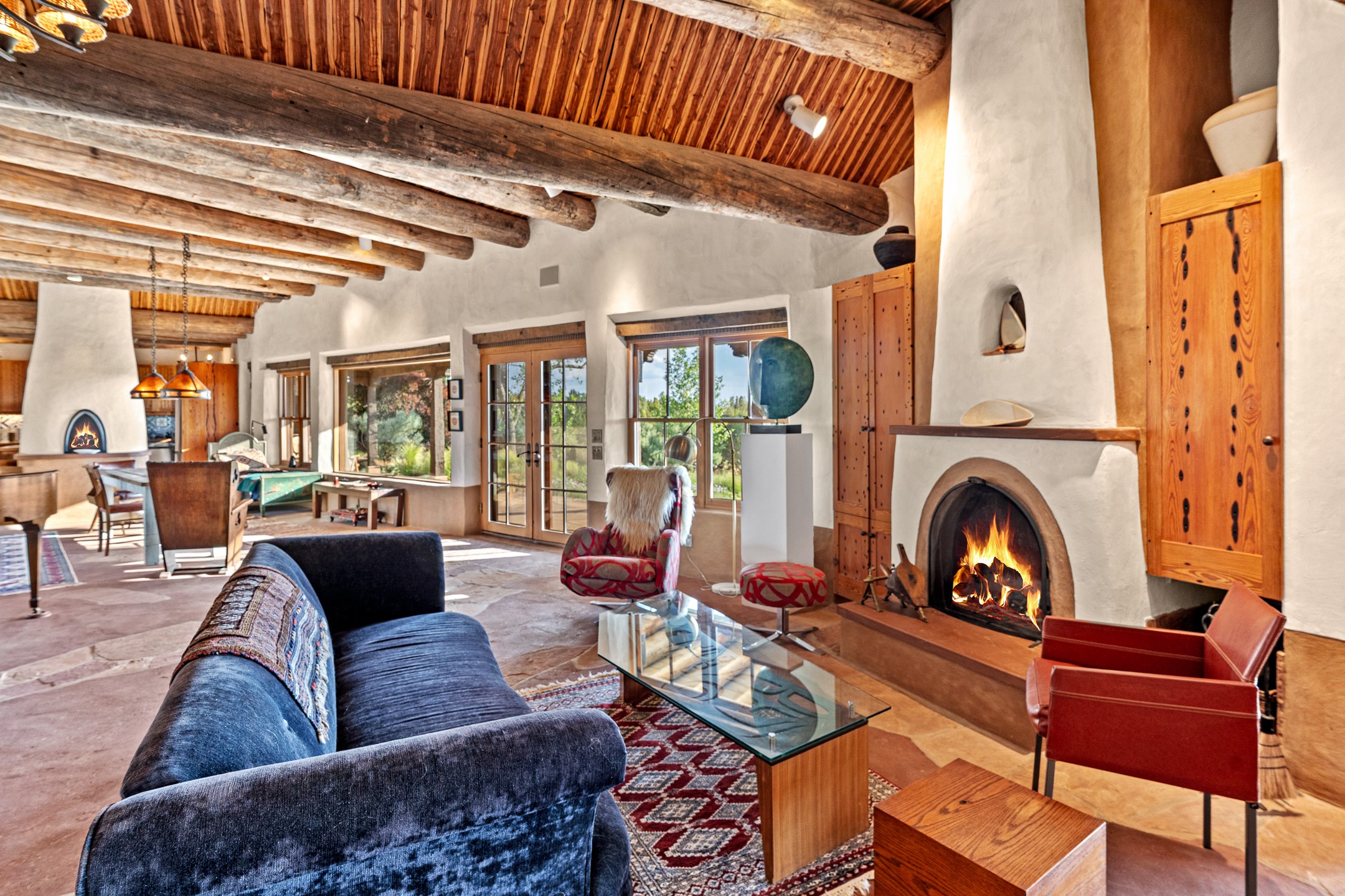 Stunning exemplary Architectural Masterpiece in Galisteo, constructed of solid adobe on 4.95 scenic acres with spectacular Ortiz Mountain views from almost every room. This gorgeous compound, recently refurbished, includes a main residence, guest house, art studio, and 1200 Sq. Ft of portal. Seamlessly integrating authentic techniques and materials with timeless and soulful elements, this home offers all the beauty, harmony and serenity one could desire. An Old Mexican archway and wooden gate lead to a zen-like courtyard with established xeriscaping. The traditional Latilla entry opens to a pitched ceiling of massive, antique, hand-hewn vigas with Arkansas split-cedar herringbone inlay. Adobe poured floors with flagstone. Clay slip wainscoted interior walls with plaster. Hand-adzed posts, beams and lintels. 80 year old hand-crafted, carved wood doors. Huge picture window and French doors to the portal. The kitchen showcases 100 year old river-retrieved heart of pine thunderbolt kitchen cabinets, Italian Bruno travertine counters, spacious island, sculptural double kiva, Viking range and cooktop, and walk-in pantry. Split bedroom plan offers maximum privacy. Primary suite is a true sanctuary with expansive, inspiring views, and an ensuite bath with double vanity, soaking tub for deep relaxation and walk-in shower. Detached Casita has an open kitchen and living area with French doors, bedroom with French doors, bath with double sink, and private portal with a kiva. The casita joins a heated and cooled attached Art studio, with carriage doors, making it possible to use as a garage. The portal leads to a charming study or sleeping nook. Professionally landscaped, there are two driveways and many quaint and private sitting areas surrounding the home, including an extraordinary Ramada with fire pit and hammocks to gaze at the stars. The adjoining walking trail leads to ancient pueblo ruins. Galisteo amenities include: community center, monthly brunches, 2 playgrounds, fire department, hiking, art tour, and Bosque River Reserve. 22 Solar panel array, whole house water purification, and underfloor heating. All baths have Noche travertine.