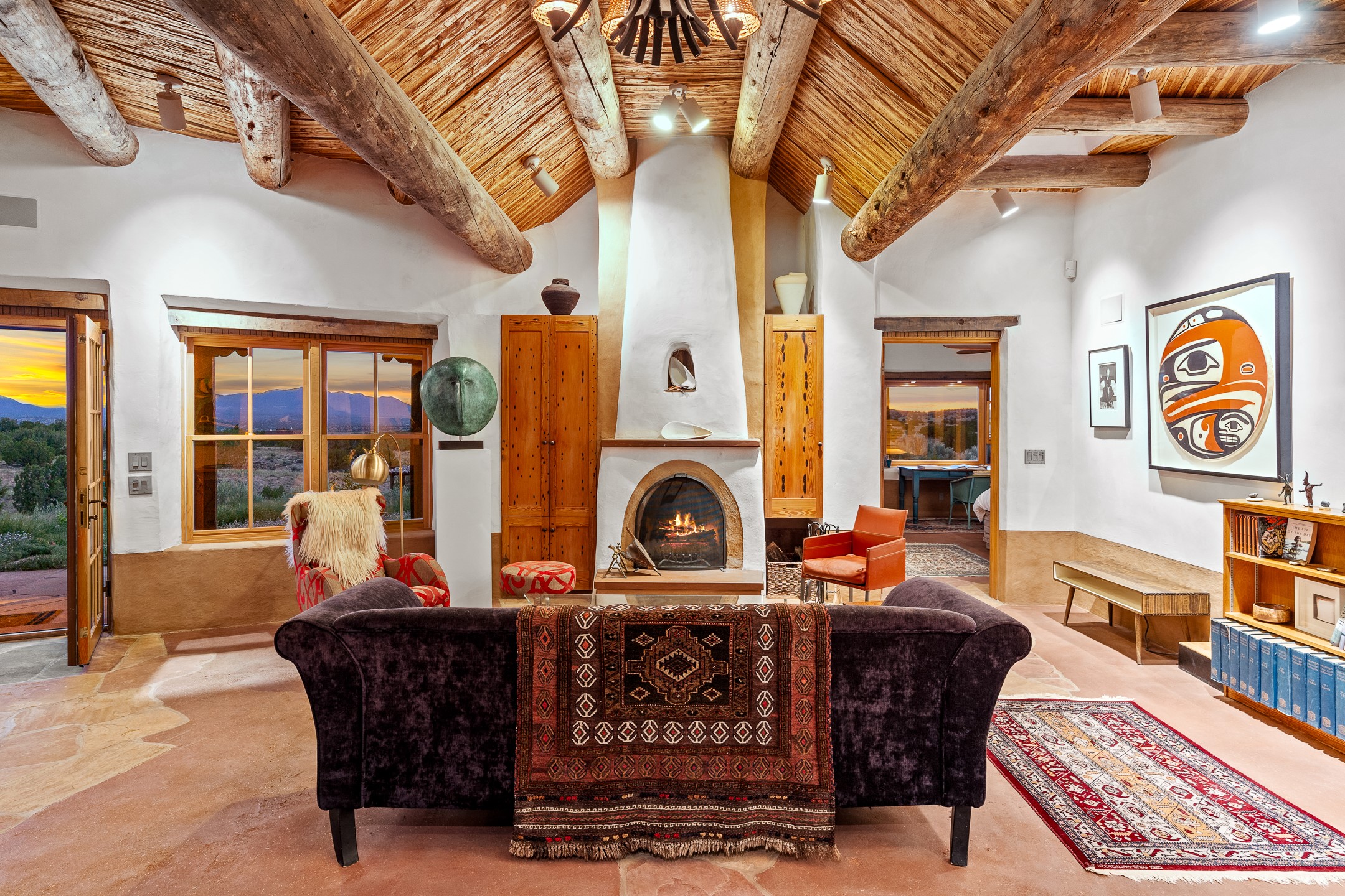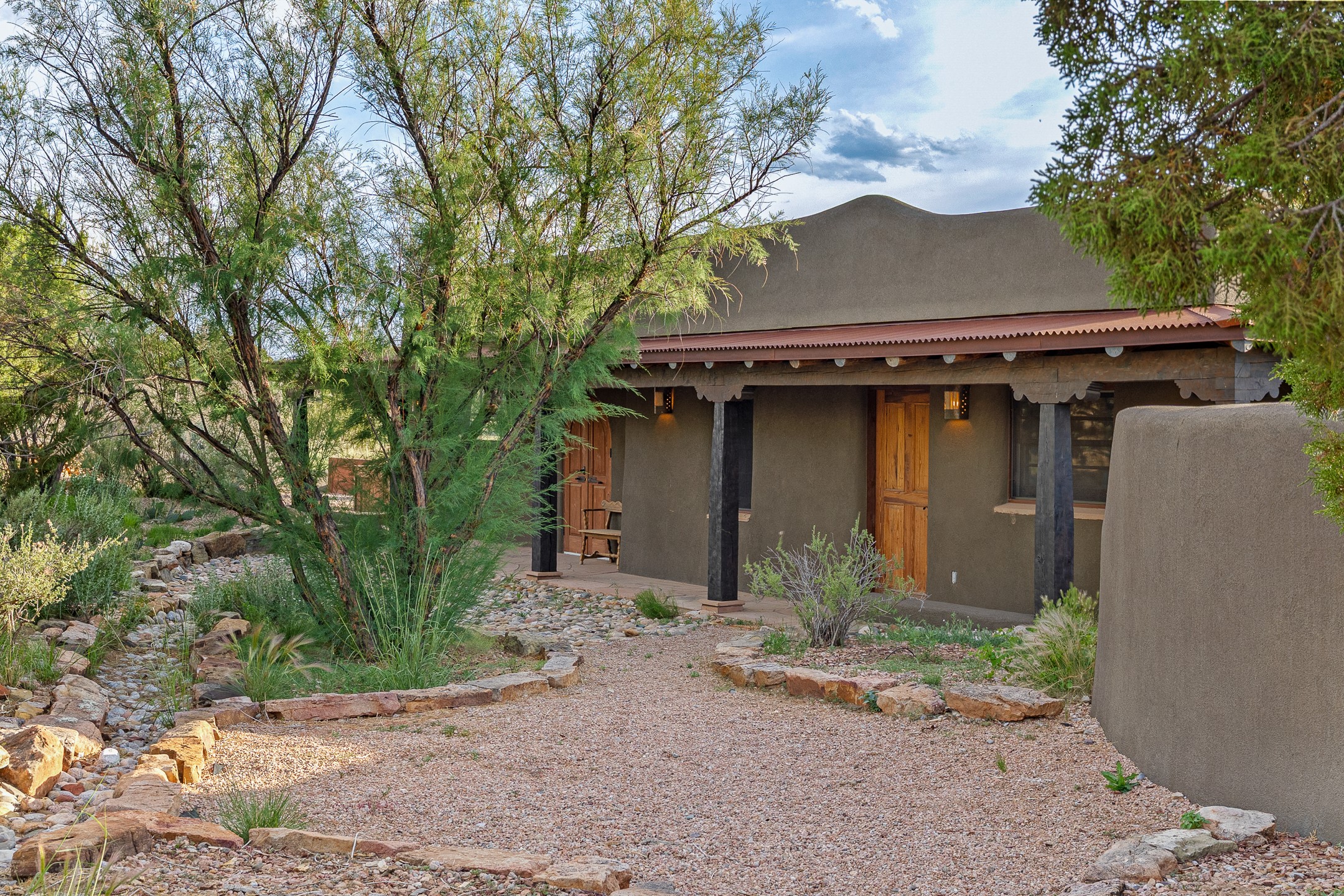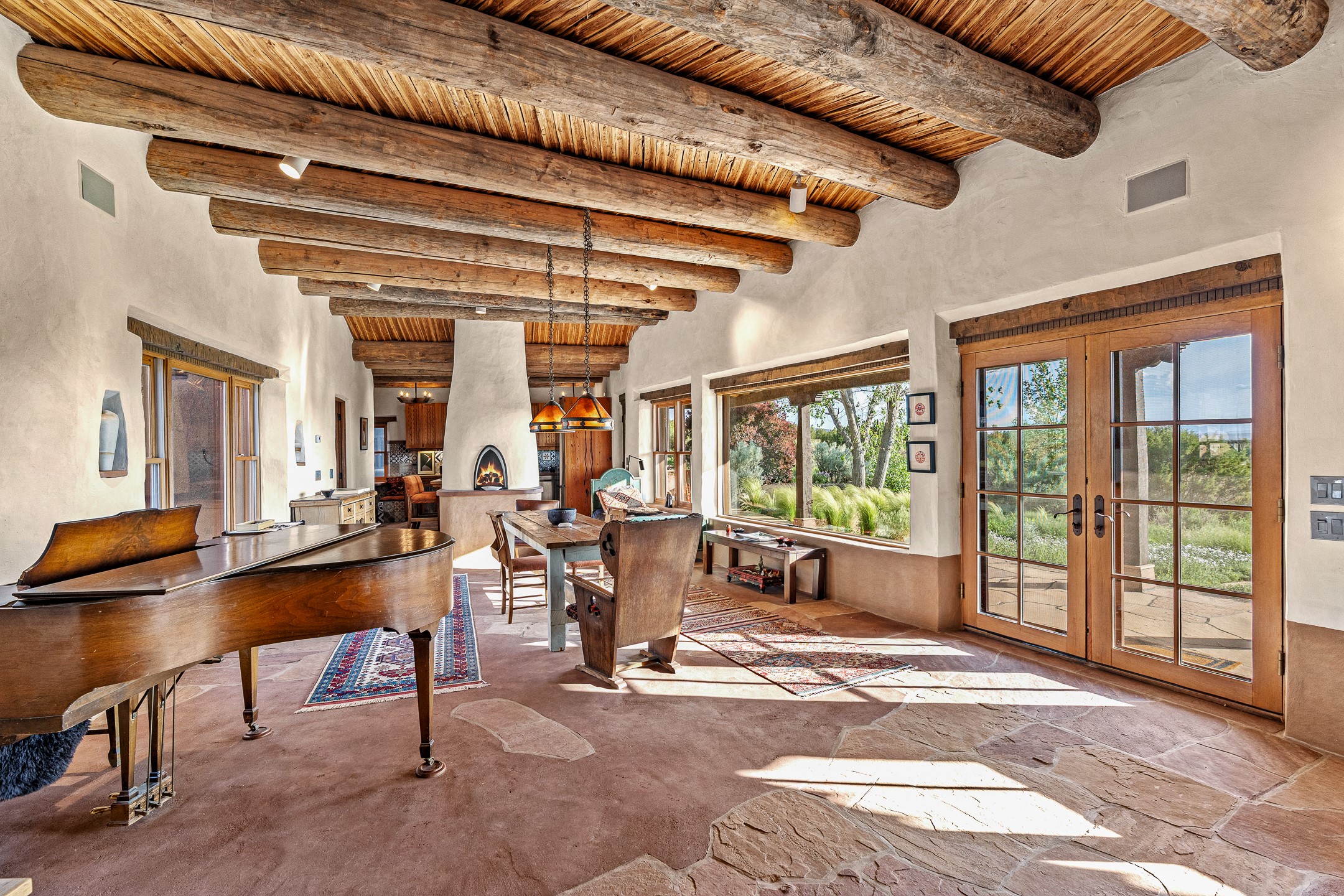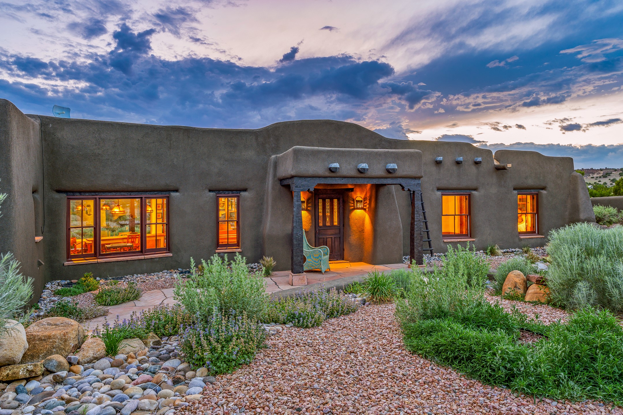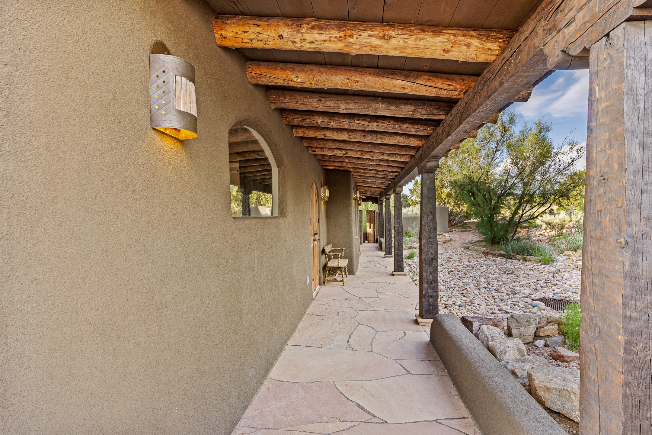 Stunning exemplary Architectural Masterpiece in Galisteo, constructed of solid adobe on 4.95 scenic acres with spectacular Ortiz Mountain views from almost every room. This gorgeous compound, recently refurbished, includes a main residence, guest house, art studio, and 1200 Sq. Ft of portal. Seamlessly integrating authentic techniques and materials with timeless and soulful elements, this home offers all the beauty, harmony and serenity one could desire. An Old Mexican archway and wooden gate lead to a zen-like courtyard with established xeriscaping. The traditional Latilla entry opens to a pitched ceiling of massive, antique, hand-hewn vigas with Arkansas split-cedar herringbone inlay. Adobe poured floors with flagstone. Clay slip wainscoted interior walls with plaster. Hand-adzed posts, beams and lintels. 80 year old hand-crafted, carved wood doors. Huge picture window and French doors to the portal. The kitchen showcases 100 year old river-retrieved heart of pine thunderbolt kitchen cabinets, Italian Bruno travertine counters, spacious island, sculptural double kiva, Viking range and cooktop, and walk-in pantry. Split bedroom plan offers maximum privacy. Primary suite is a true sanctuary with expansive, inspiring views, and an ensuite bath with double vanity, soaking tub for deep relaxation and walk-in shower. Detached Casita has an open kitchen and living area with French doors, bedroom with French doors, bath with double sink, and private portal with a kiva. The casita joins a heated and cooled attached Art studio, with carriage doors, making it possible to use as a garage. The portal leads to a charming study or sleeping nook. Professionally landscaped, there are two driveways and many quaint and private sitting areas surrounding the home, including an extraordinary Ramada with fire pit and hammocks to gaze at the stars. The adjoining walking trail leads to ancient pueblo ruins. Galisteo amenities include: community center, monthly brunches, 2 playgrounds, fire department, hiking, art tour, and Bosque River Reserve. 22 Solar panel array, whole house water purification, and underfloor heating. All baths have Noche travertine.