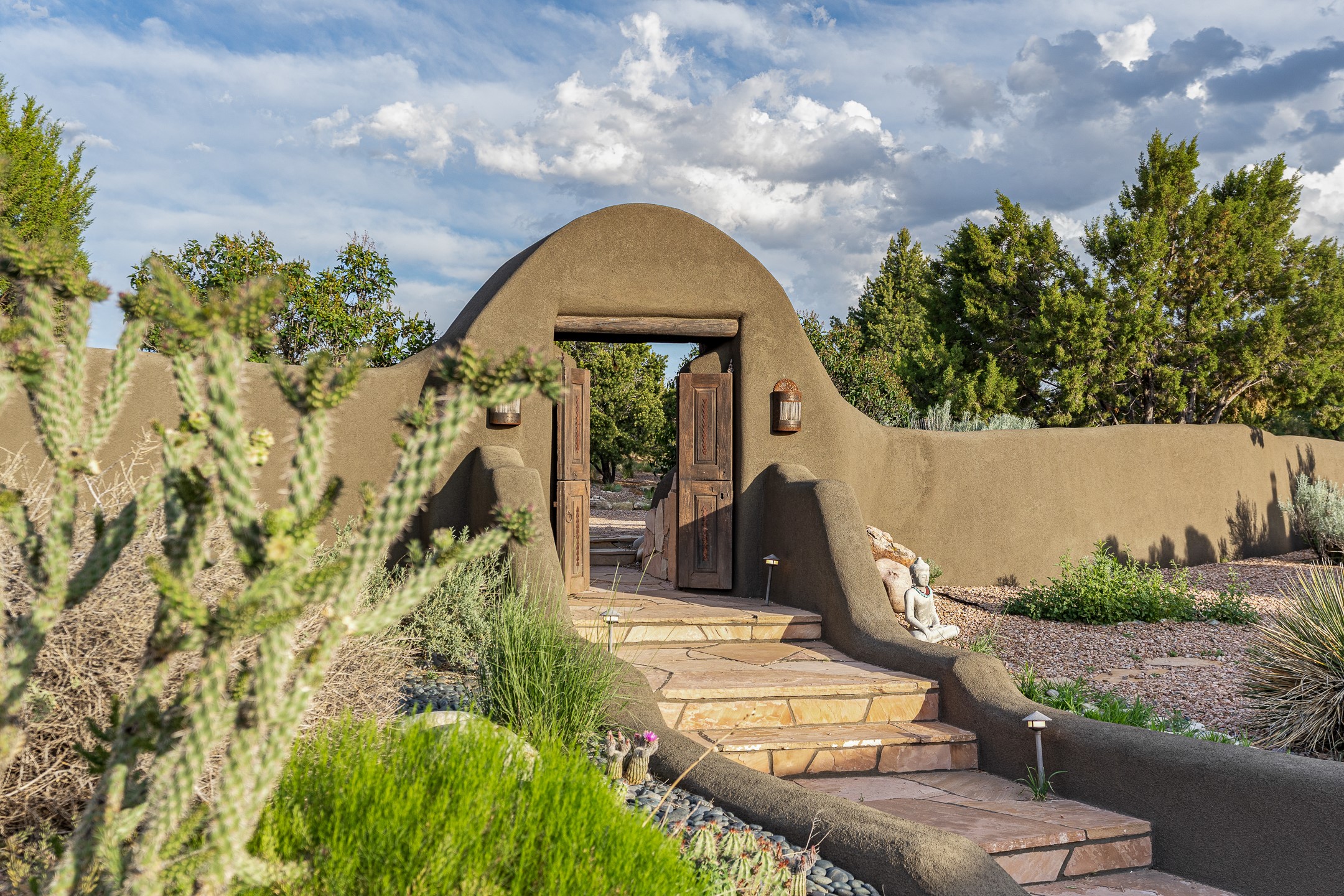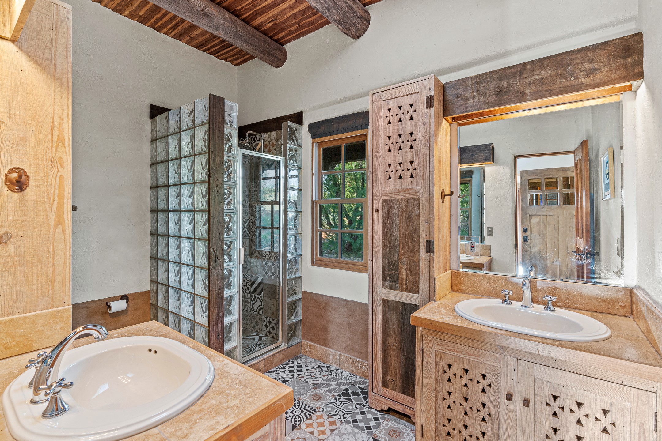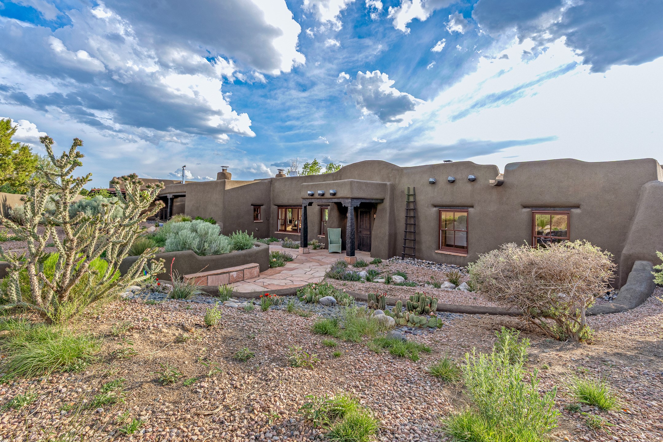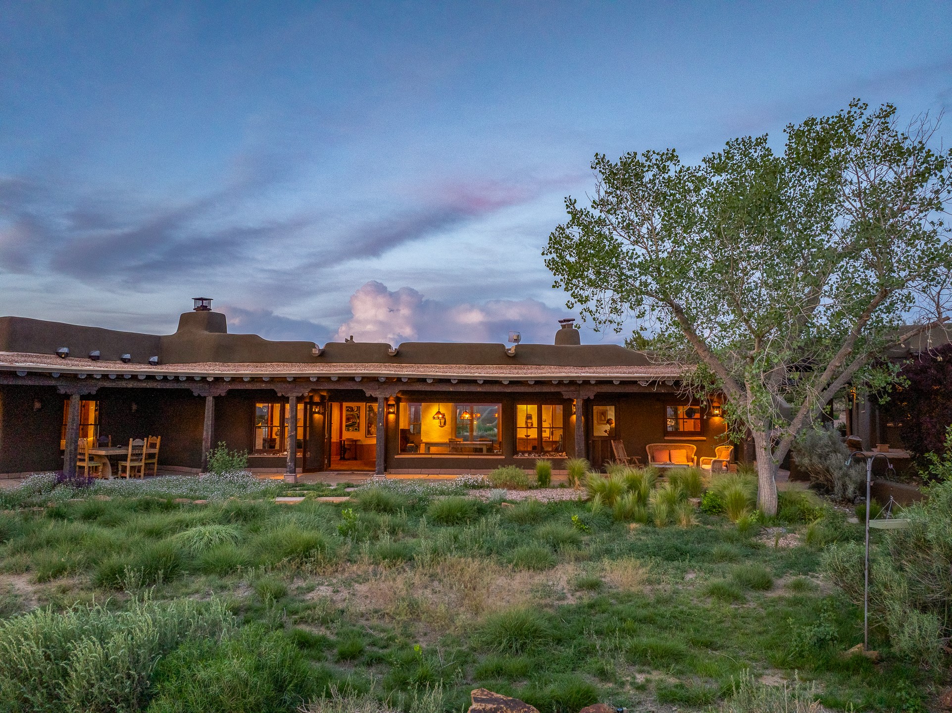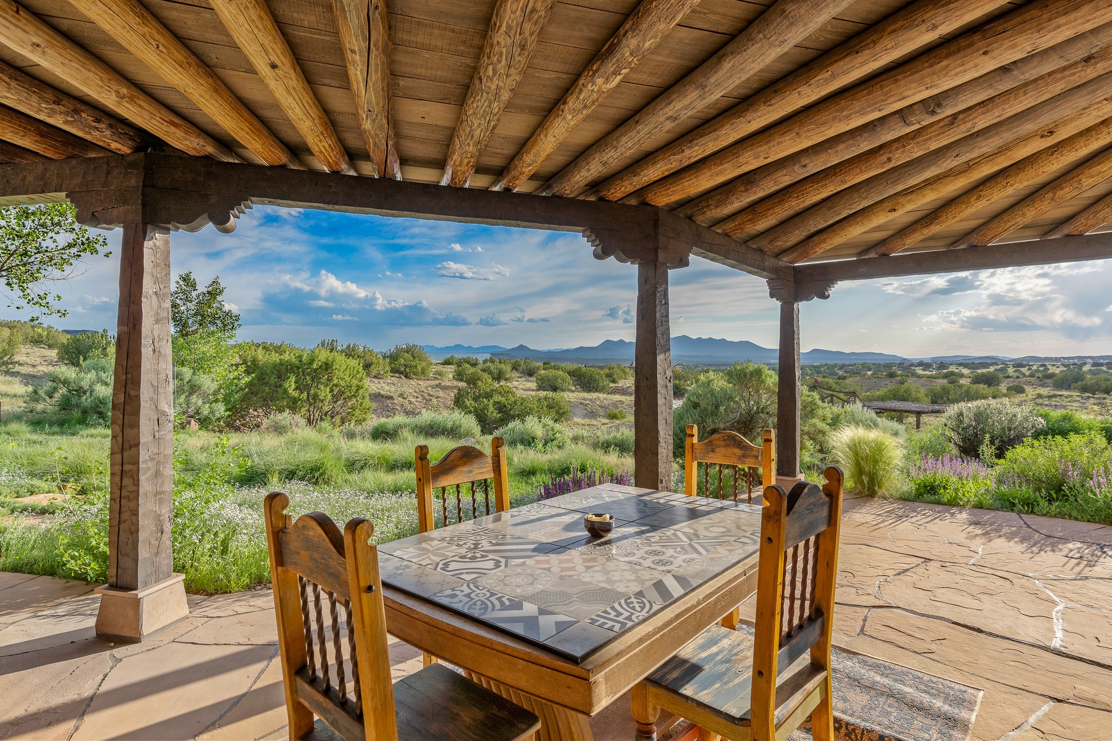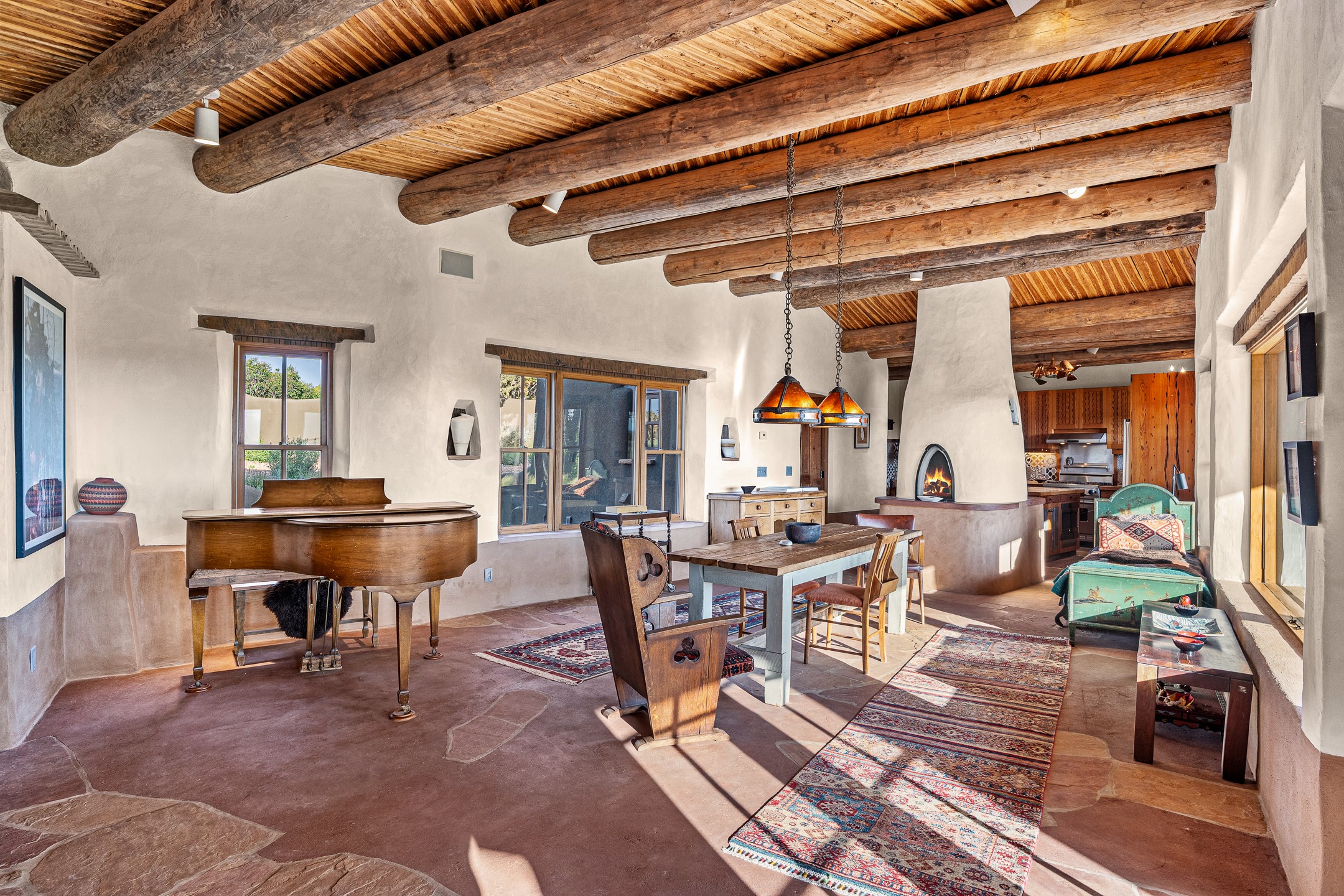 Stunning exemplary Architectural Masterpiece in Galisteo, constructed of solid adobe on 4.95 scenic acres with spectacular Ortiz Mountain views from almost every room. This gorgeous compound, recently refurbished, includes a main residence, guest house, art studio, and 1200 Sq. Ft of portal. Seamlessly integrating authentic techniques and materials with timeless and soulful elements, this home offers all the beauty, harmony and serenity one could desire. An Old Mexican archway and wooden gate lead to a zen-like courtyard with established xeriscaping. The traditional Latilla entry opens to a pitched ceiling of massive, antique, hand-hewn vigas with Arkansas split-cedar herringbone inlay. Adobe poured floors with flagstone. Clay slip wainscoted interior walls with plaster. Hand-adzed posts, beams and lintels. 80 year old hand-crafted, carved wood doors. Huge picture window and French doors to the portal. The kitchen showcases 100 year old river-retrieved heart of pine thunderbolt kitchen cabinets, Italian Bruno travertine counters, spacious island, sculptural double kiva, Viking range and cooktop, and walk-in pantry. Split bedroom plan offers maximum privacy. Primary suite is a true sanctuary with expansive, inspiring views, and an ensuite bath with double vanity, soaking tub for deep relaxation and walk-in shower. Detached Casita has an open kitchen and living area with French doors, bedroom with French doors, bath with double sink, and private portal with a kiva. The casita joins a heated and cooled attached Art studio, with carriage doors, making it possible to use as a garage. The portal leads to a charming study or sleeping nook. Professionally landscaped, there are two driveways and many quaint and private sitting areas surrounding the home, including an extraordinary Ramada with fire pit and hammocks to gaze at the stars. The adjoining walking trail leads to ancient pueblo ruins. Galisteo amenities include: community center, monthly brunches, 2 playgrounds, fire department, hiking, art tour, and Bosque River Reserve. 22 Solar panel array, whole house water purification, and underfloor heating. All baths have Noche travertine.
