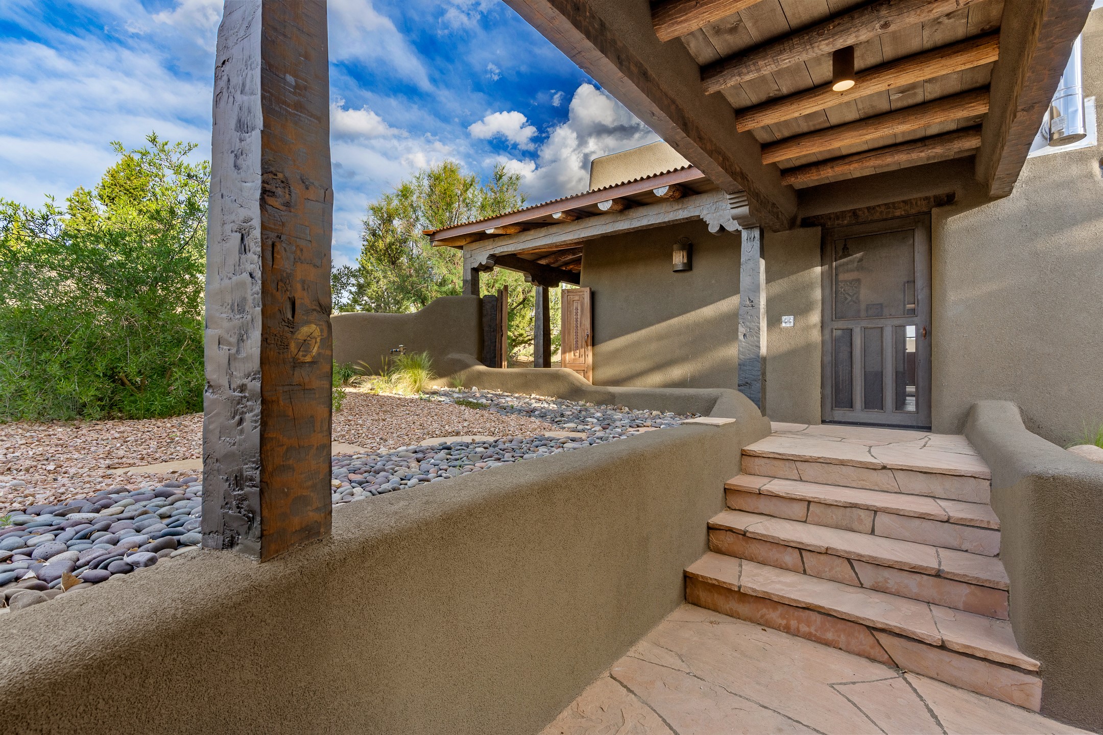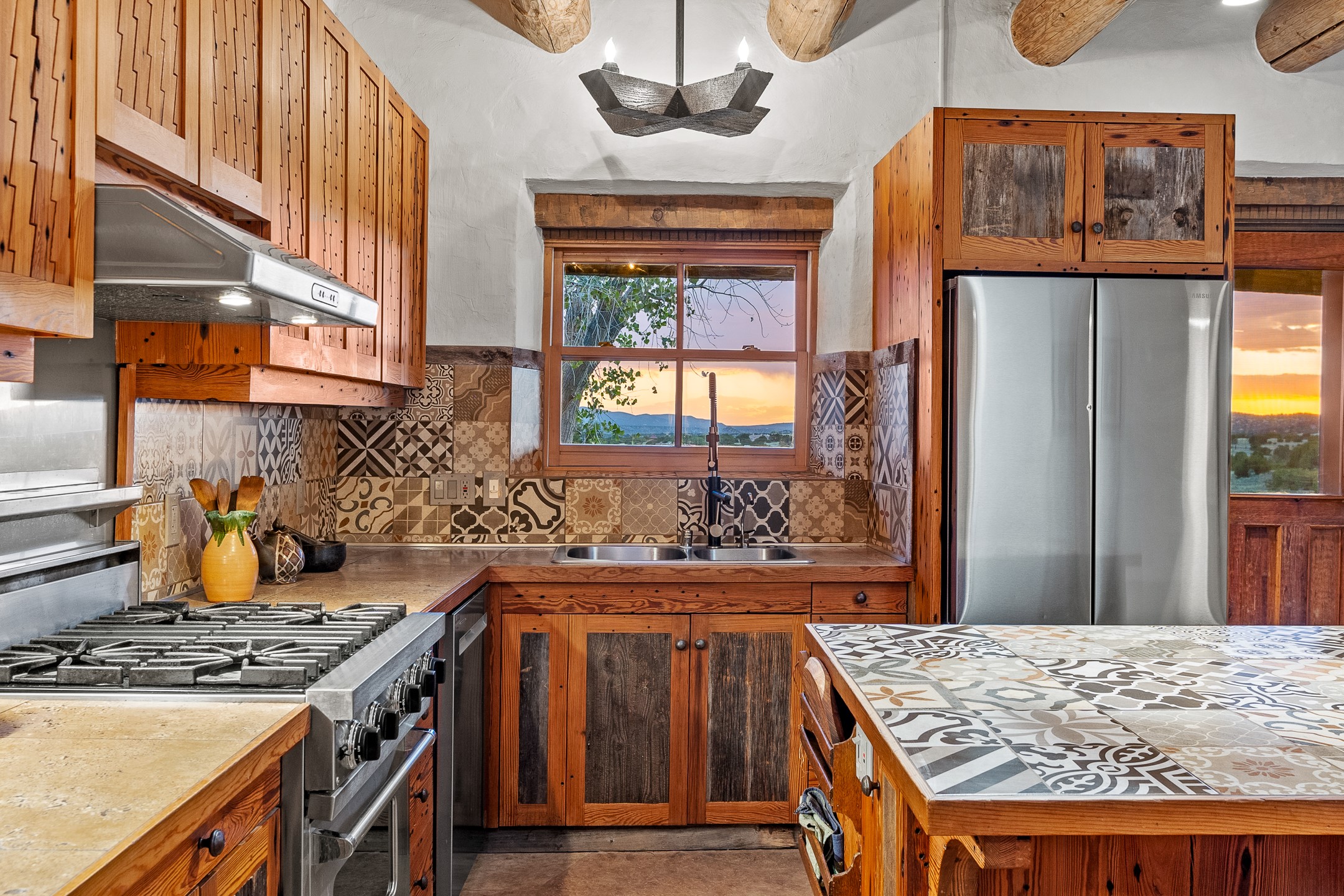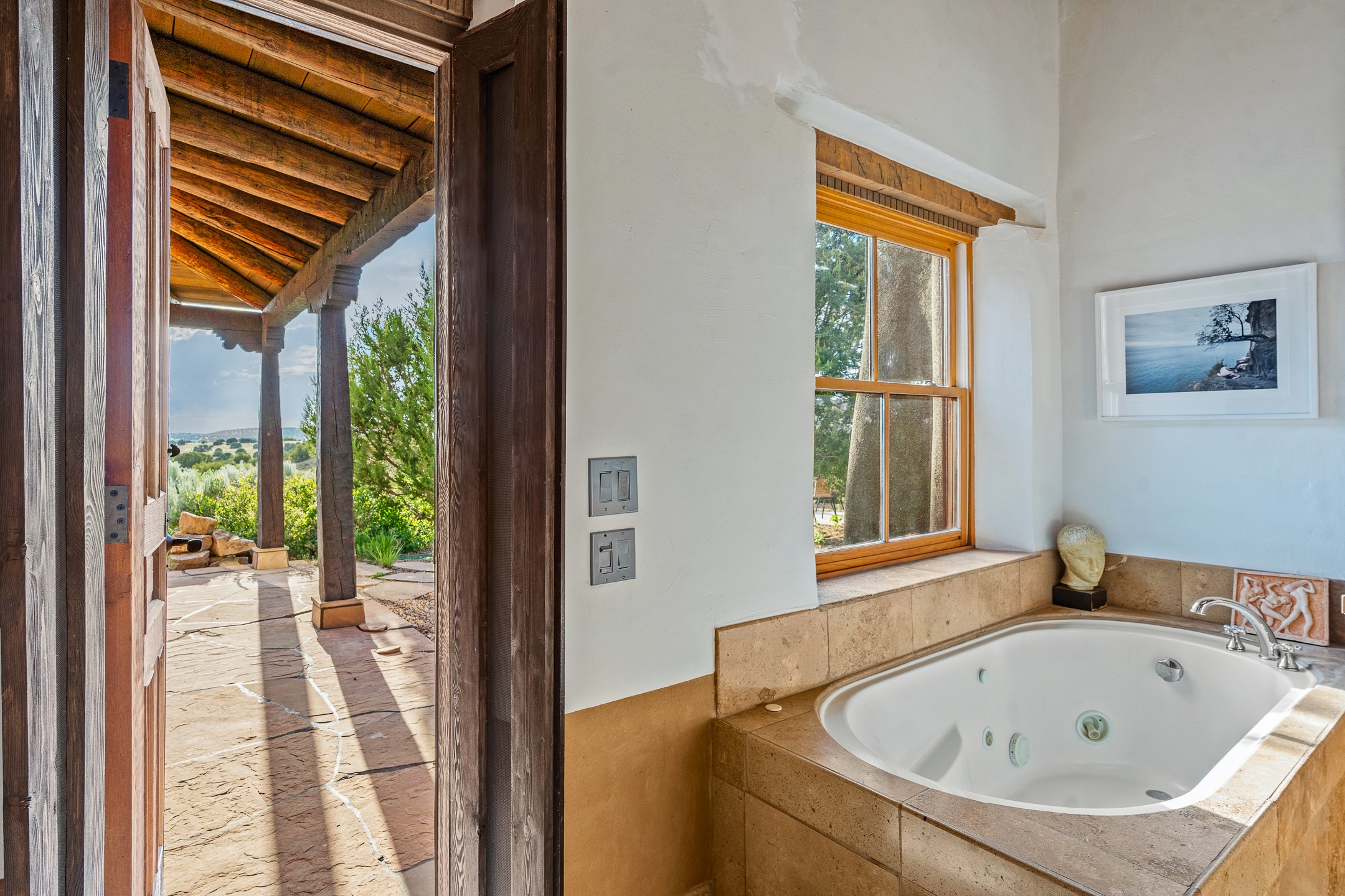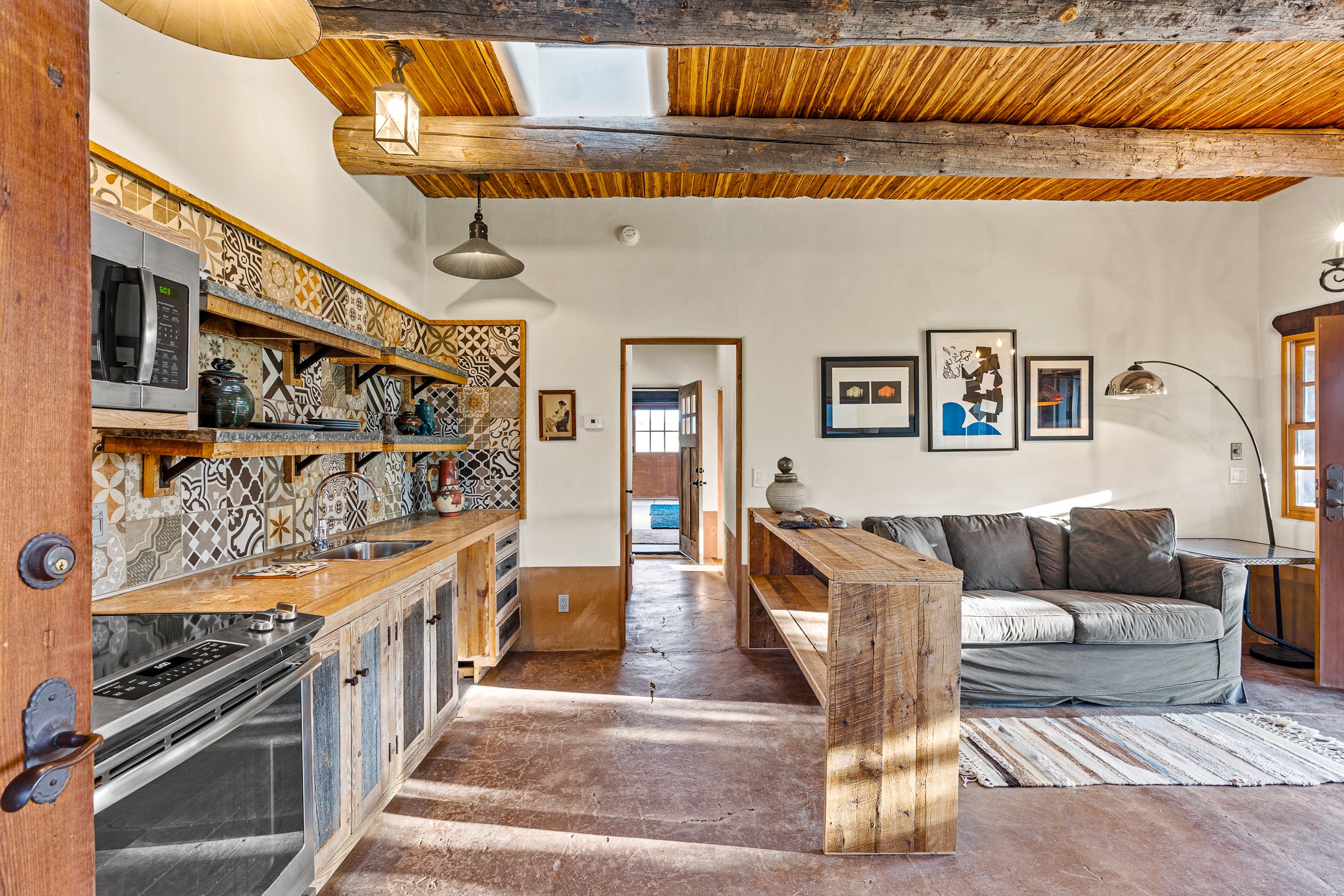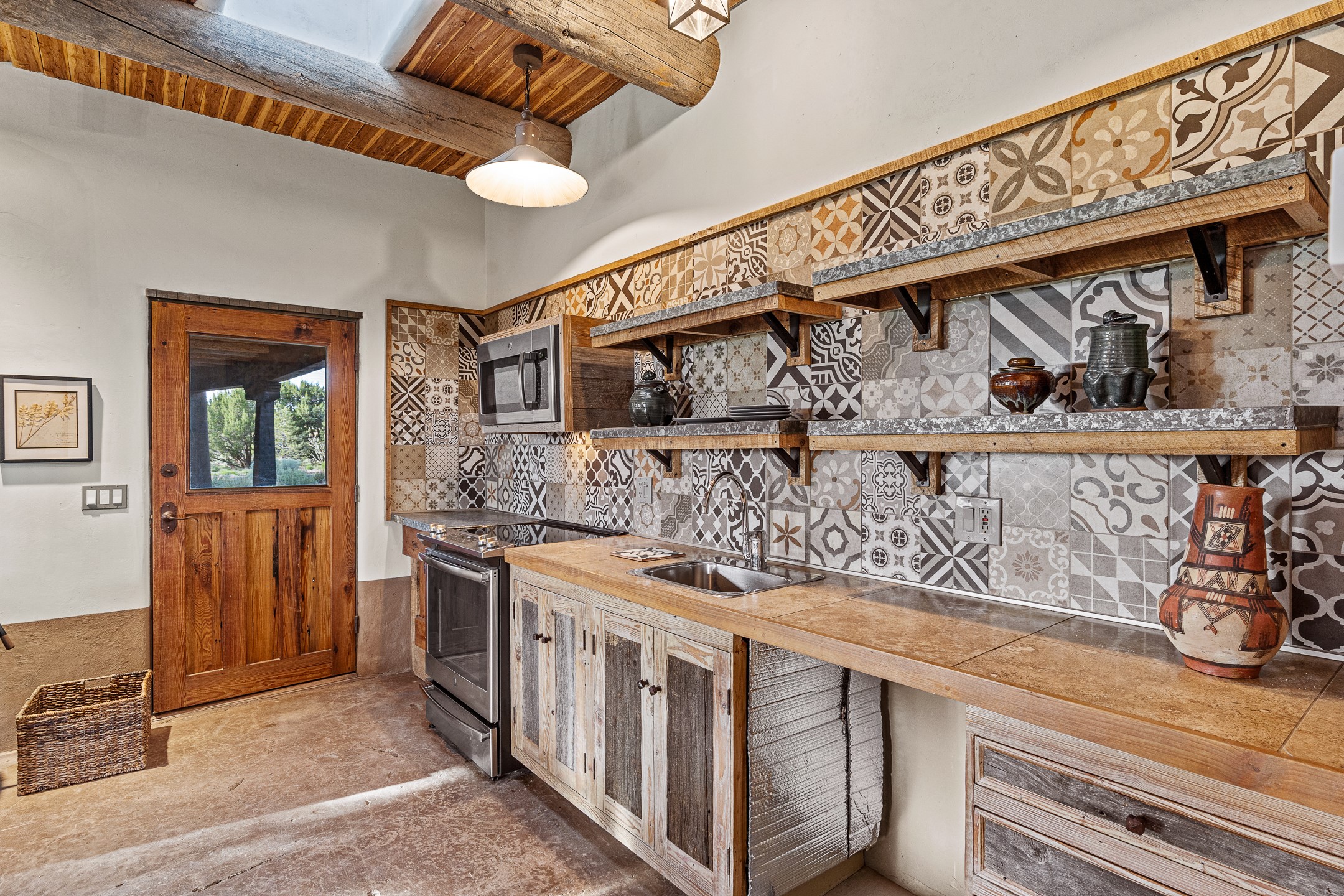 Stunning exemplary Architectural Masterpiece in Galisteo, constructed of solid adobe on 4.95 scenic acres with spectacular Ortiz Mountain views from almost every room. This gorgeous compound, recently refurbished, includes a main residence, guest house, art studio, and 1200 Sq. Ft of portal. Seamlessly integrating authentic techniques and materials with timeless and soulful elements, this home offers all the beauty, harmony and serenity one could desire. An Old Mexican archway and wooden gate lead to a zen-like courtyard with established xeriscaping. The traditional Latilla entry opens to a pitched ceiling of massive, antique, hand-hewn vigas with Arkansas split-cedar herringbone inlay. Adobe poured floors with flagstone. Clay slip wainscoted interior walls with plaster. Hand-adzed posts, beams and lintels. 80 year old hand-crafted, carved wood doors. Huge picture window and French doors to the portal. The kitchen showcases 100 year old river-retrieved heart of pine thunderbolt kitchen cabinets, Italian Bruno travertine counters, spacious island, sculptural double kiva, Viking range and cooktop, and walk-in pantry. Split bedroom plan offers maximum privacy. Primary suite is a true sanctuary with expansive, inspiring views, and an ensuite bath with double vanity, soaking tub for deep relaxation and walk-in shower. Detached Casita has an open kitchen and living area with French doors, bedroom with French doors, bath with double sink, and private portal with a kiva. The casita joins a heated and cooled attached Art studio, with carriage doors, making it possible to use as a garage. The portal leads to a charming study or sleeping nook. Professionally landscaped, there are two driveways and many quaint and private sitting areas surrounding the home, including an extraordinary Ramada with fire pit and hammocks to gaze at the stars. The adjoining walking trail leads to ancient pueblo ruins. Galisteo amenities include: community center, monthly brunches, 2 playgrounds, fire department, hiking, art tour, and Bosque River Reserve. 22 Solar panel array, whole house water purification, and underfloor heating. All baths have Noche travertine.