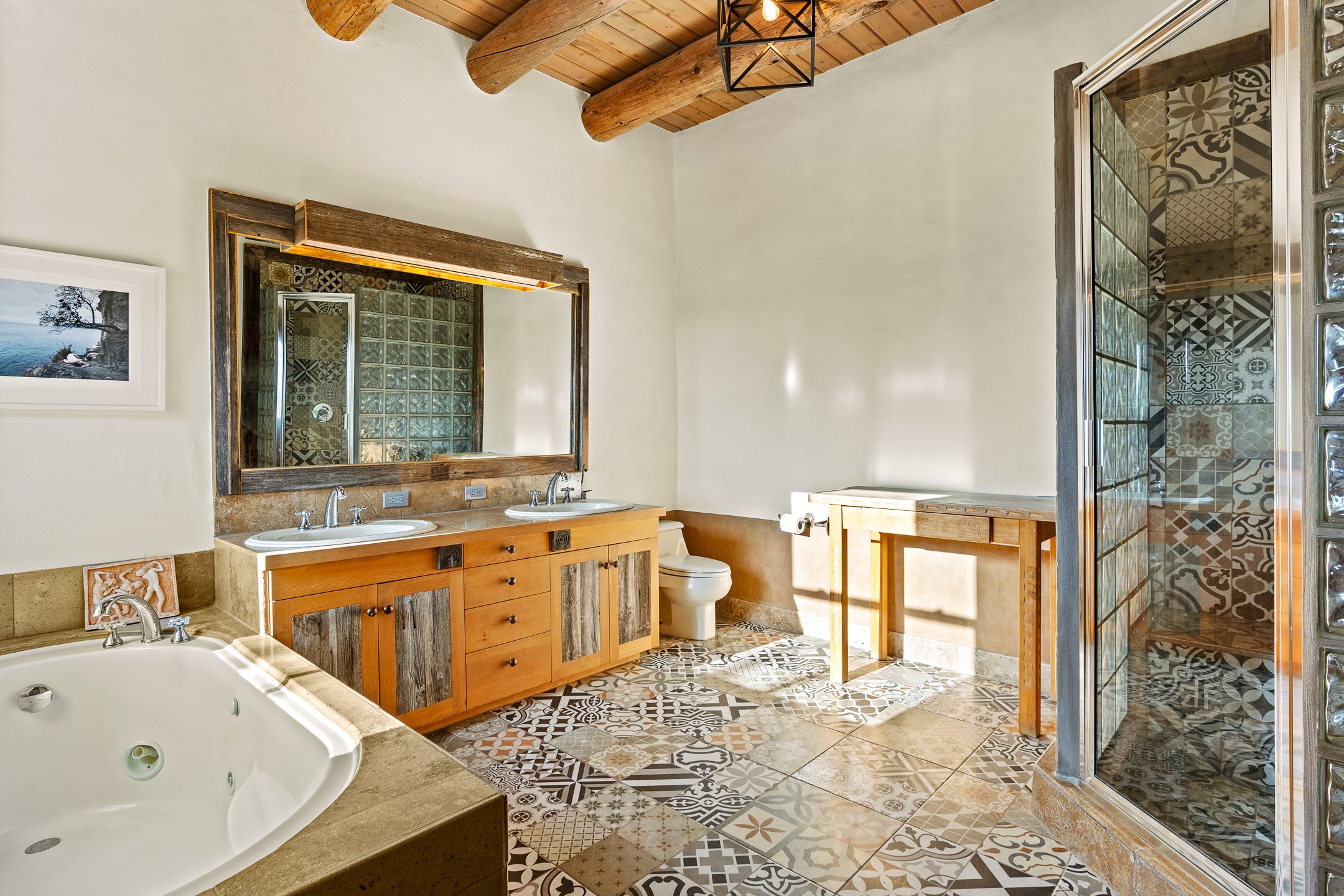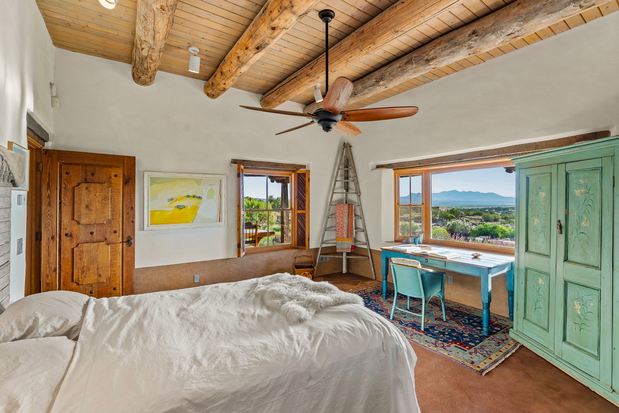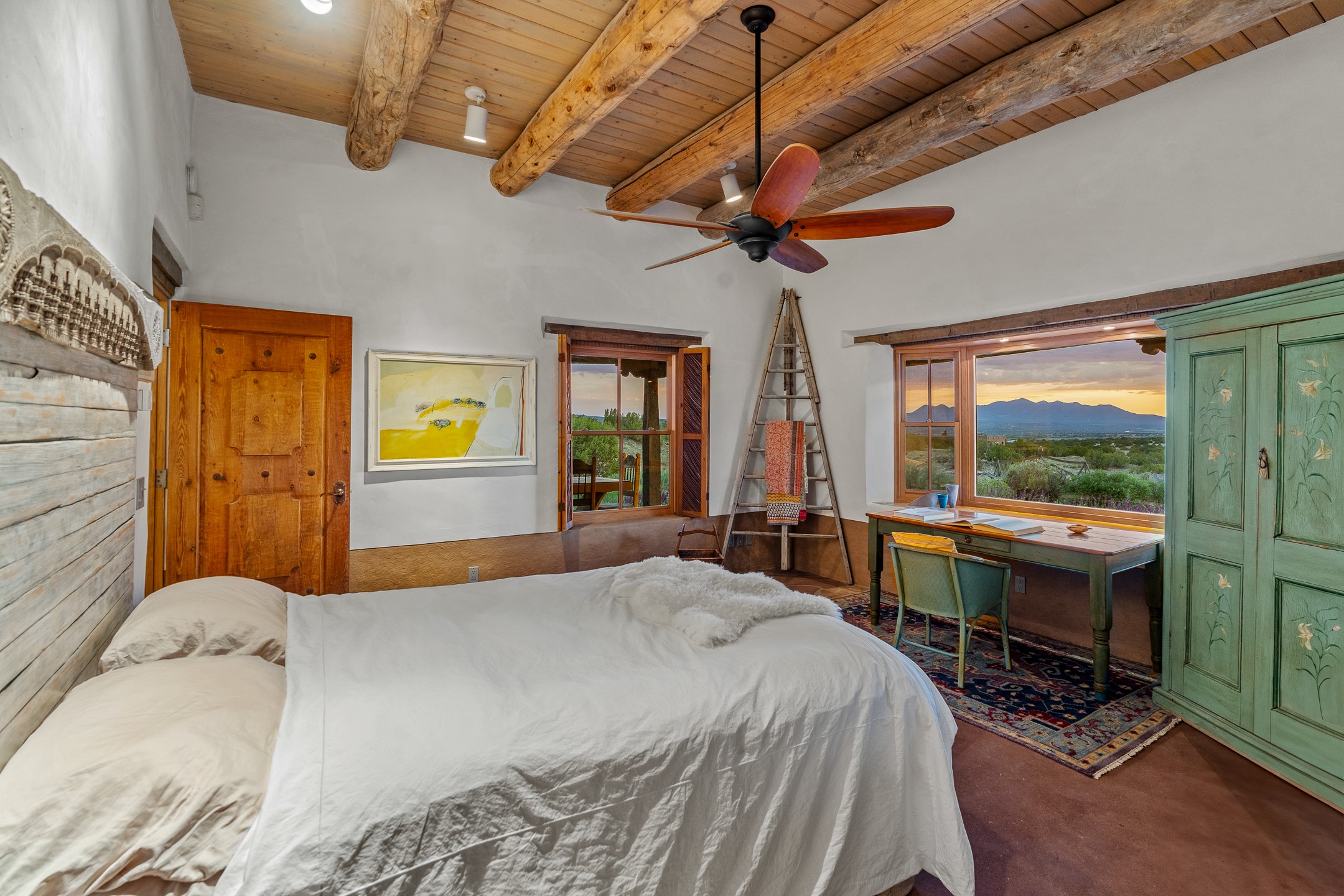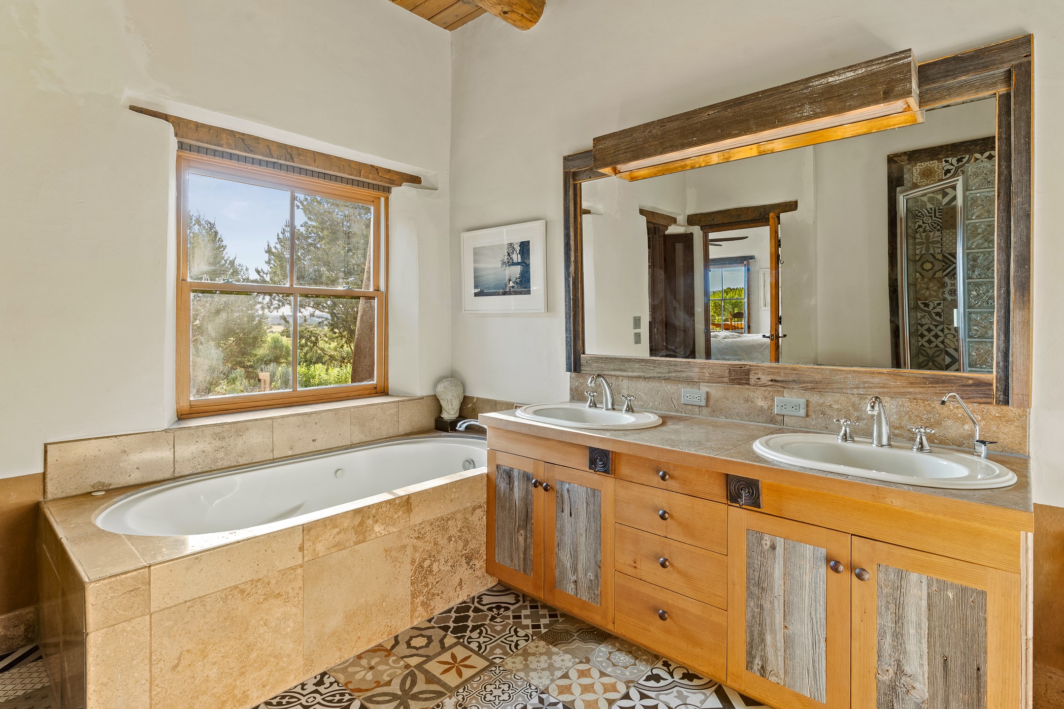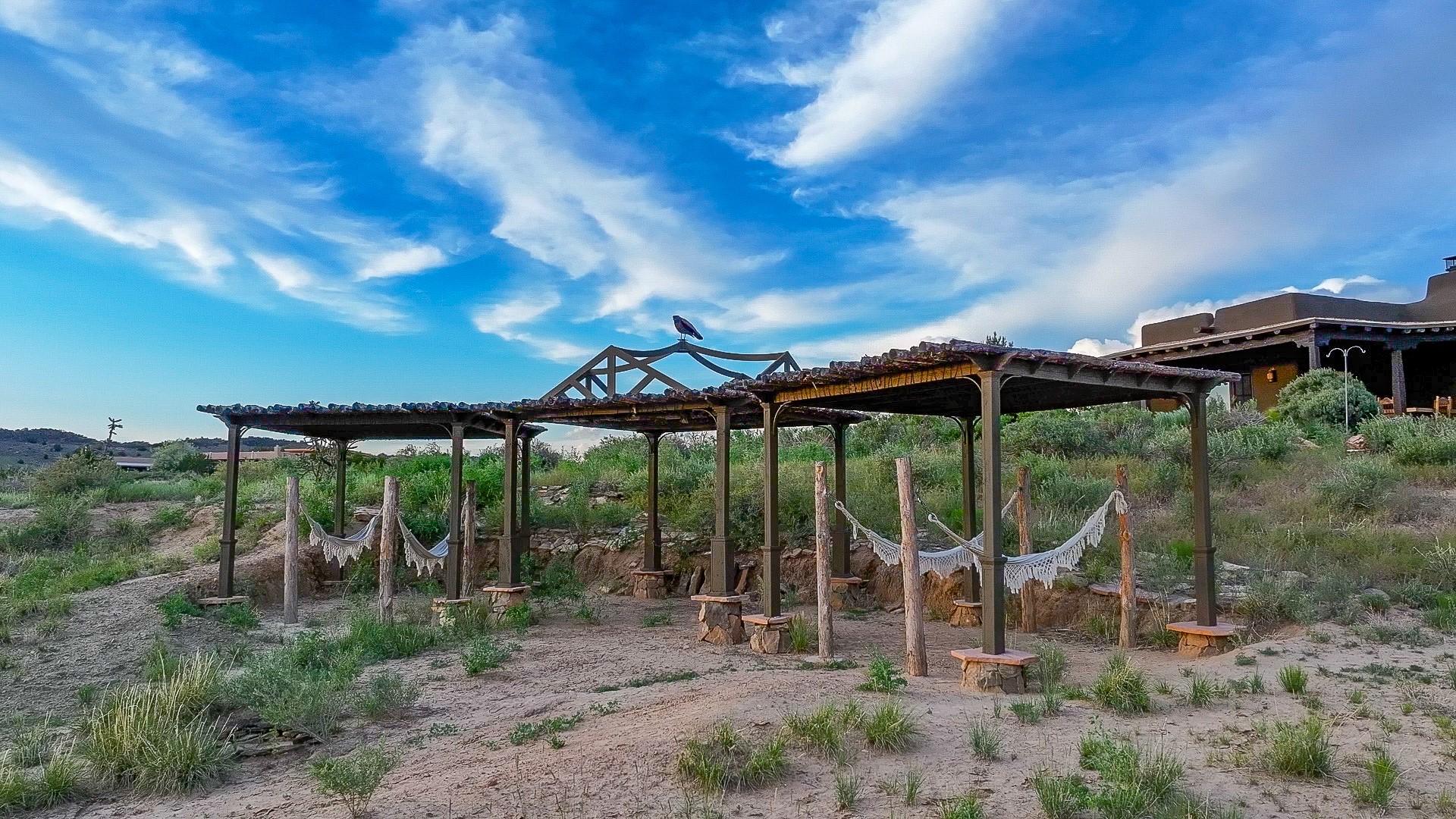 Stunning exemplary Architectural Masterpiece in Galisteo, constructed of solid adobe on 4.95 scenic acres with spectacular Ortiz Mountain views from almost every room. This gorgeous compound, recently refurbished, includes a main residence, guest house, art studio, and 1200 Sq. Ft of portal. Seamlessly integrating authentic techniques and materials with timeless and soulful elements, this home offers all the beauty, harmony and serenity one could desire. An Old Mexican archway and wooden gate lead to a zen-like courtyard with established xeriscaping. The traditional Latilla entry opens to a pitched ceiling of massive, antique, hand-hewn vigas with Arkansas split-cedar herringbone inlay. Adobe poured floors with flagstone. Clay slip wainscoted interior walls with plaster. Hand-adzed posts, beams and lintels. 80 year old hand-crafted, carved wood doors. Huge picture window and French doors to the portal. The kitchen showcases 100 year old river-retrieved heart of pine thunderbolt kitchen cabinets, Italian Bruno travertine counters, spacious island, sculptural double kiva, Viking range and cooktop, and walk-in pantry. Split bedroom plan offers maximum privacy. Primary suite is a true sanctuary with expansive, inspiring views, and an ensuite bath with double vanity, soaking tub for deep relaxation and walk-in shower. Detached Casita has an open kitchen and living area with French doors, bedroom with French doors, bath with double sink, and private portal with a kiva. The casita joins a heated and cooled attached Art studio, with carriage doors, making it possible to use as a garage. The portal leads to a charming study or sleeping nook. Professionally landscaped, there are two driveways and many quaint and private sitting areas surrounding the home, including an extraordinary Ramada with fire pit and hammocks to gaze at the stars. The adjoining walking trail leads to ancient pueblo ruins. Galisteo amenities include: community center, monthly brunches, 2 playgrounds, fire department, hiking, art tour, and Bosque River Reserve. 22 Solar panel array, whole house water purification, and underfloor heating. All baths have Noche travertine.