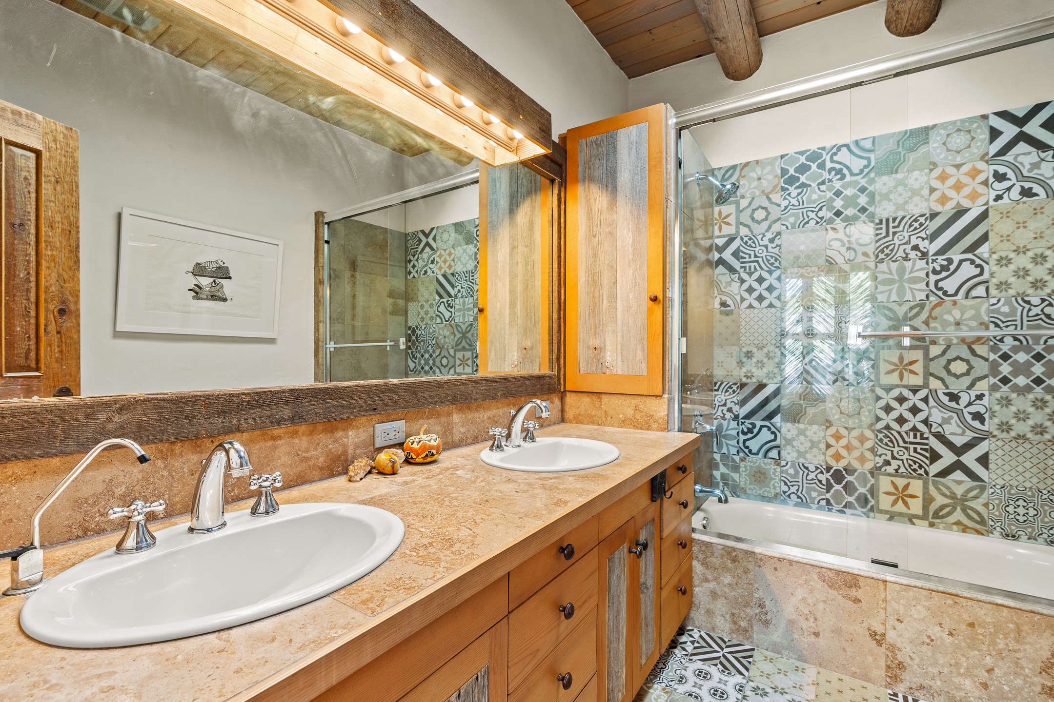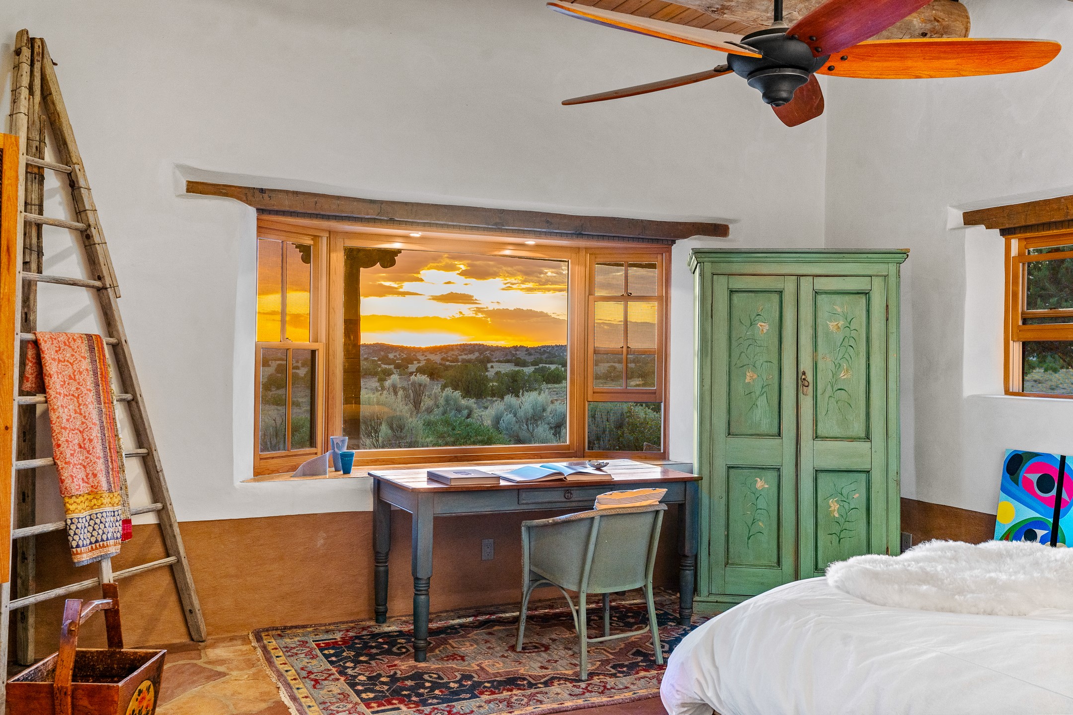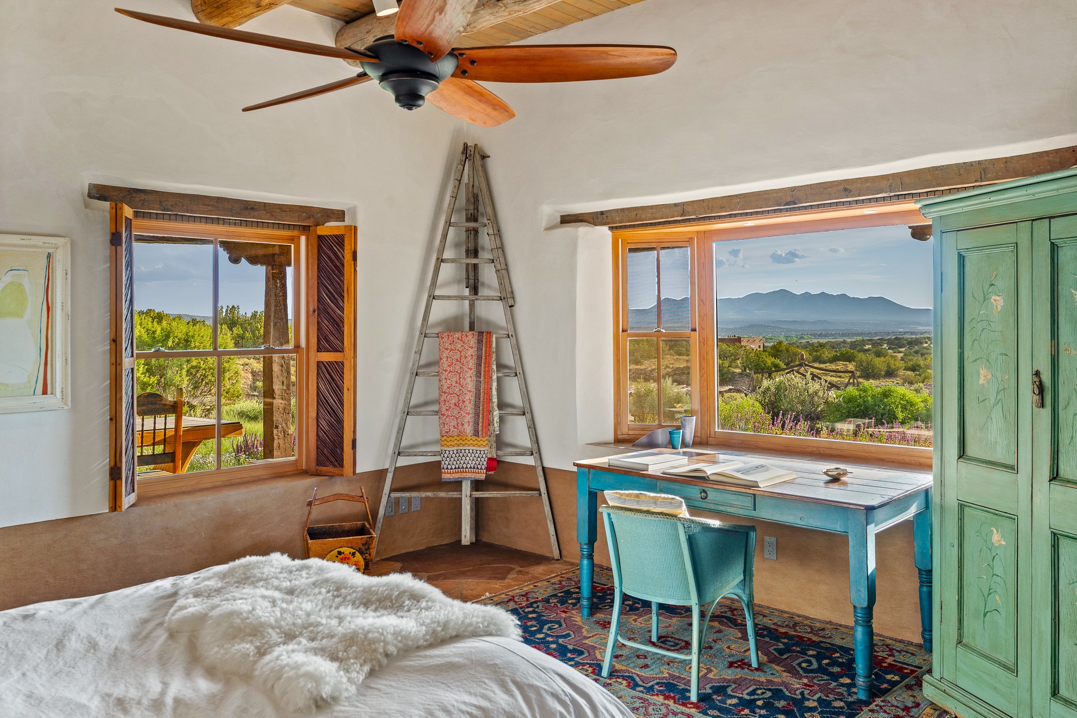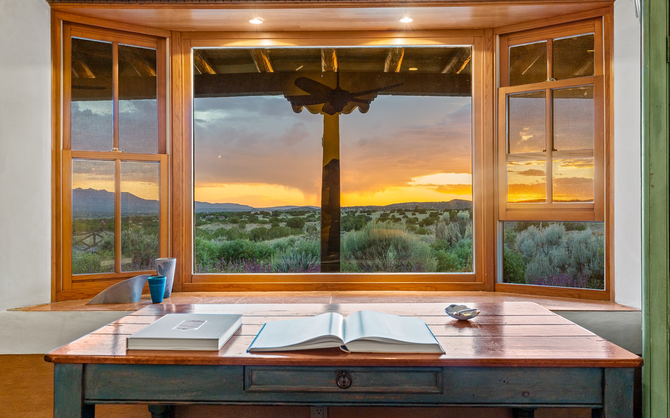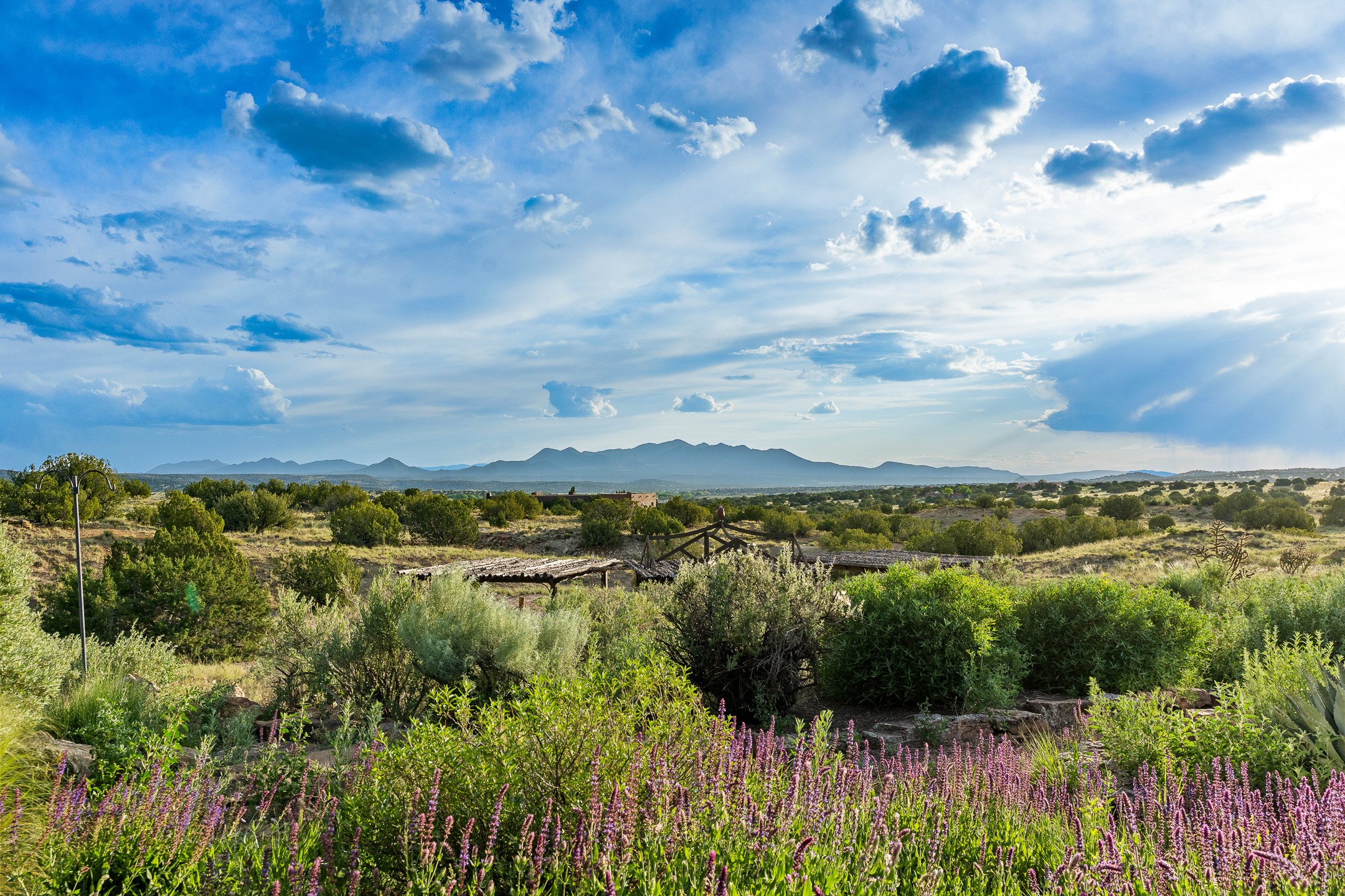 Stunning exemplary Architectural Masterpiece in Galisteo, constructed of solid adobe on 4.95 scenic acres with spectacular Ortiz Mountain views from almost every room. This gorgeous compound, recently refurbished, includes a main residence, guest house, art studio, and 1200 Sq. Ft of portal. Seamlessly integrating authentic techniques and materials with timeless and soulful elements, this home offers all the beauty, harmony and serenity one could desire. An Old Mexican archway and wooden gate lead to a zen-like courtyard with established xeriscaping. The traditional Latilla entry opens to a pitched ceiling of massive, antique, hand-hewn vigas with Arkansas split-cedar herringbone inlay. Adobe poured floors with flagstone. Clay slip wainscoted interior walls with plaster. Hand-adzed posts, beams and lintels. 80 year old hand-crafted, carved wood doors. Huge picture window and French doors to the portal. The kitchen showcases 100 year old river-retrieved heart of pine thunderbolt kitchen cabinets, Italian Bruno travertine counters, spacious island, sculptural double kiva, Viking range and cooktop, and walk-in pantry. Split bedroom plan offers maximum privacy. Primary suite is a true sanctuary with expansive, inspiring views, and an ensuite bath with double vanity, soaking tub for deep relaxation and walk-in shower. Detached Casita has an open kitchen and living area with French doors, bedroom with French doors, bath with double sink, and private portal with a kiva. The casita joins a heated and cooled attached Art studio, with carriage doors, making it possible to use as a garage. The portal leads to a charming study or sleeping nook. Professionally landscaped, there are two driveways and many quaint and private sitting areas surrounding the home, including an extraordinary Ramada with fire pit and hammocks to gaze at the stars. The adjoining walking trail leads to ancient pueblo ruins. Galisteo amenities include: community center, monthly brunches, 2 playgrounds, fire department, hiking, art tour, and Bosque River Reserve. 22 Solar panel array, whole house water purification, and underfloor heating. All baths have Noche travertine.