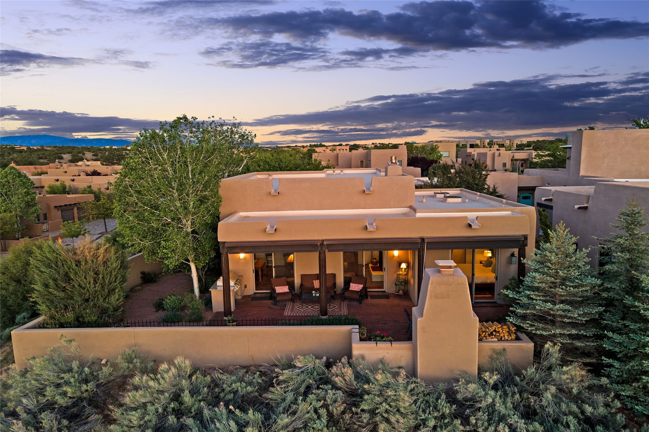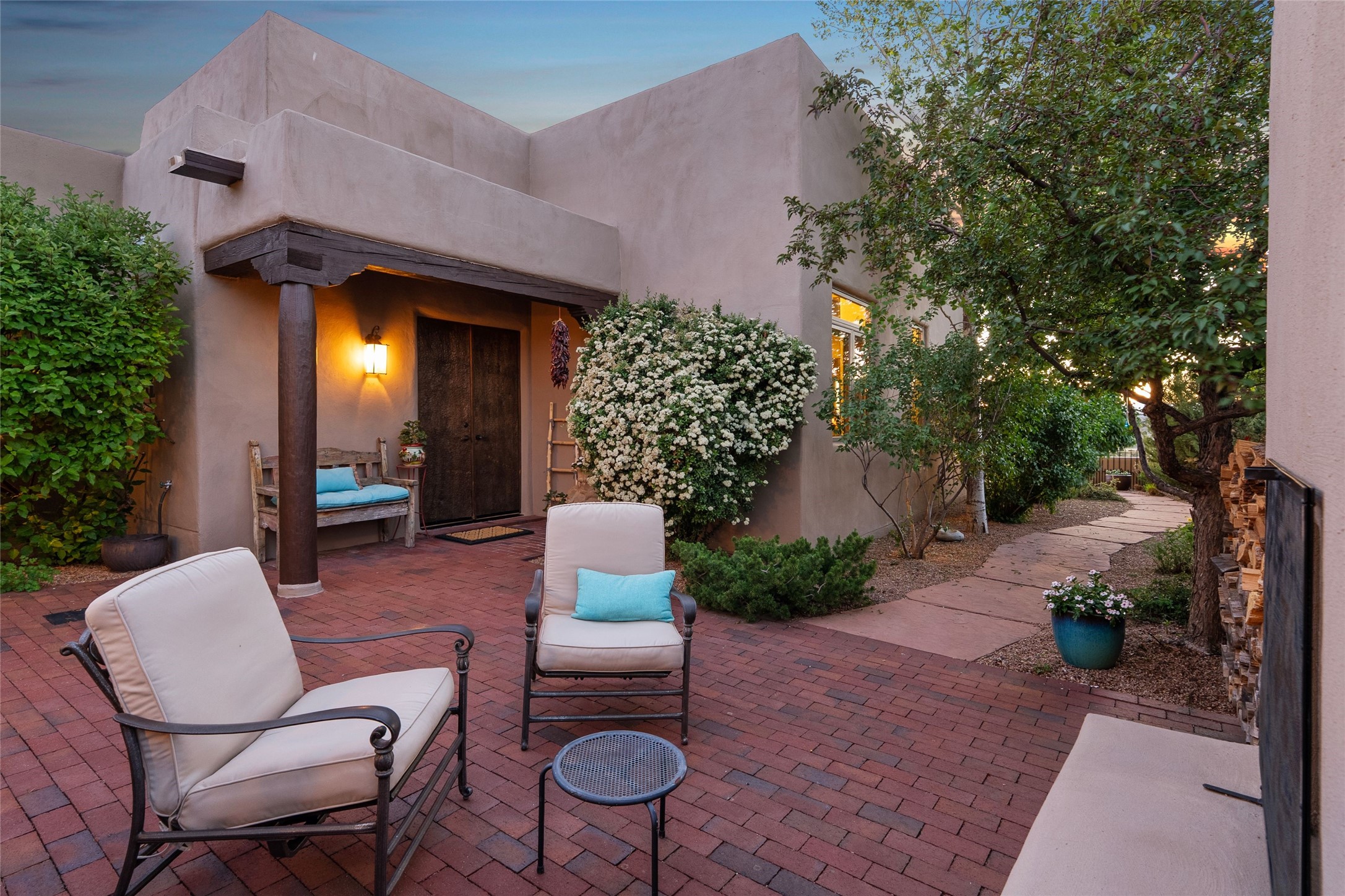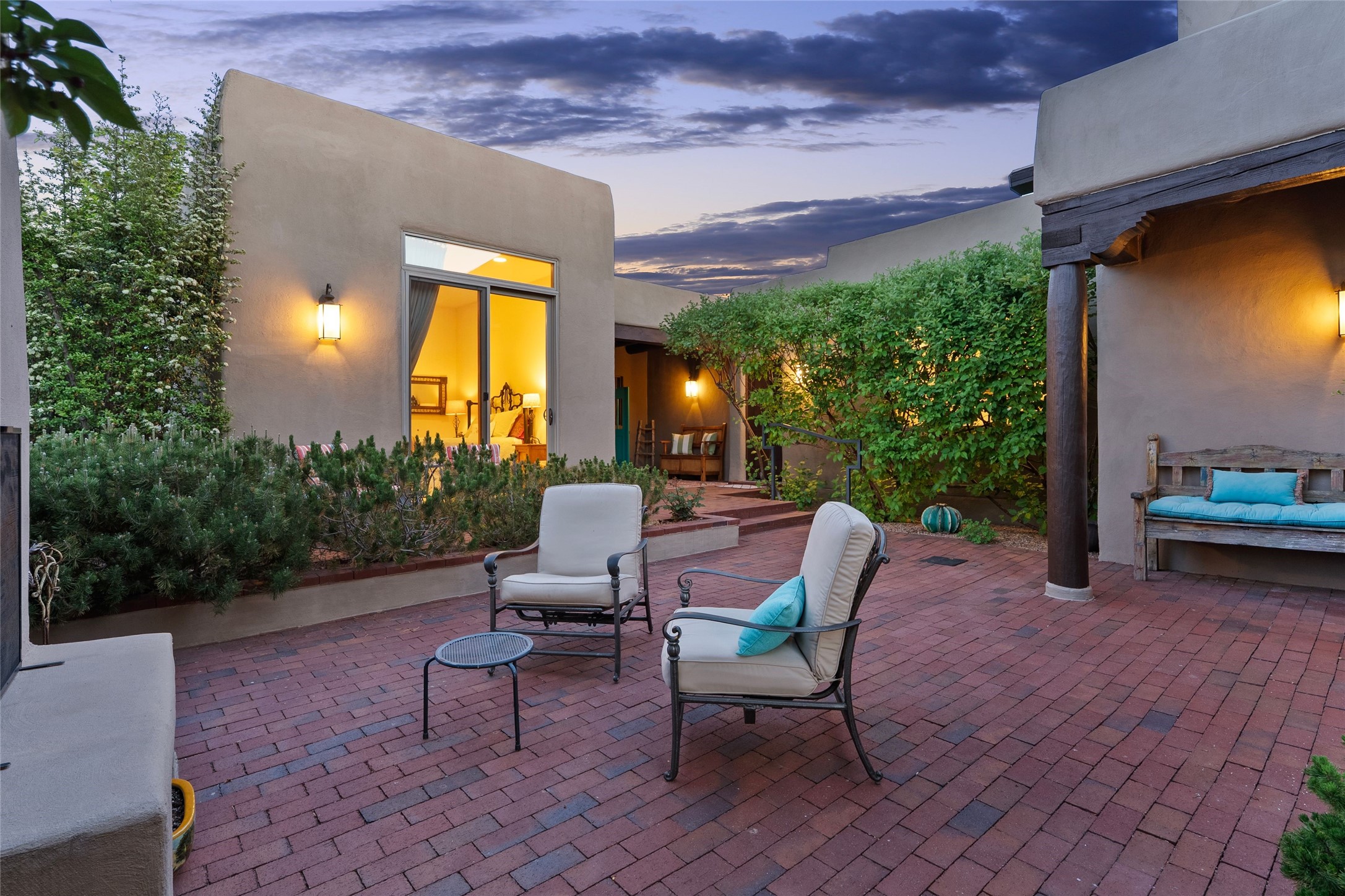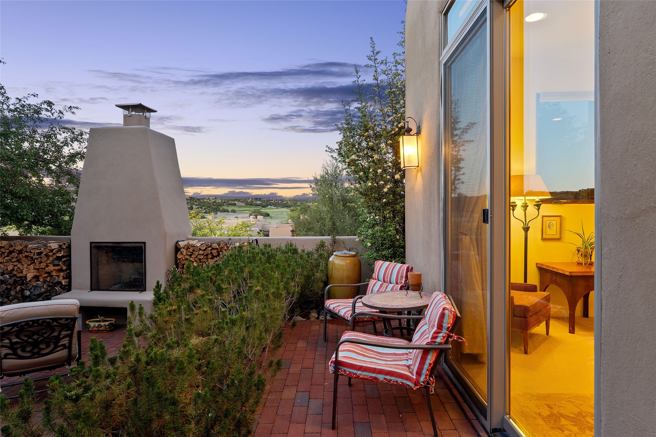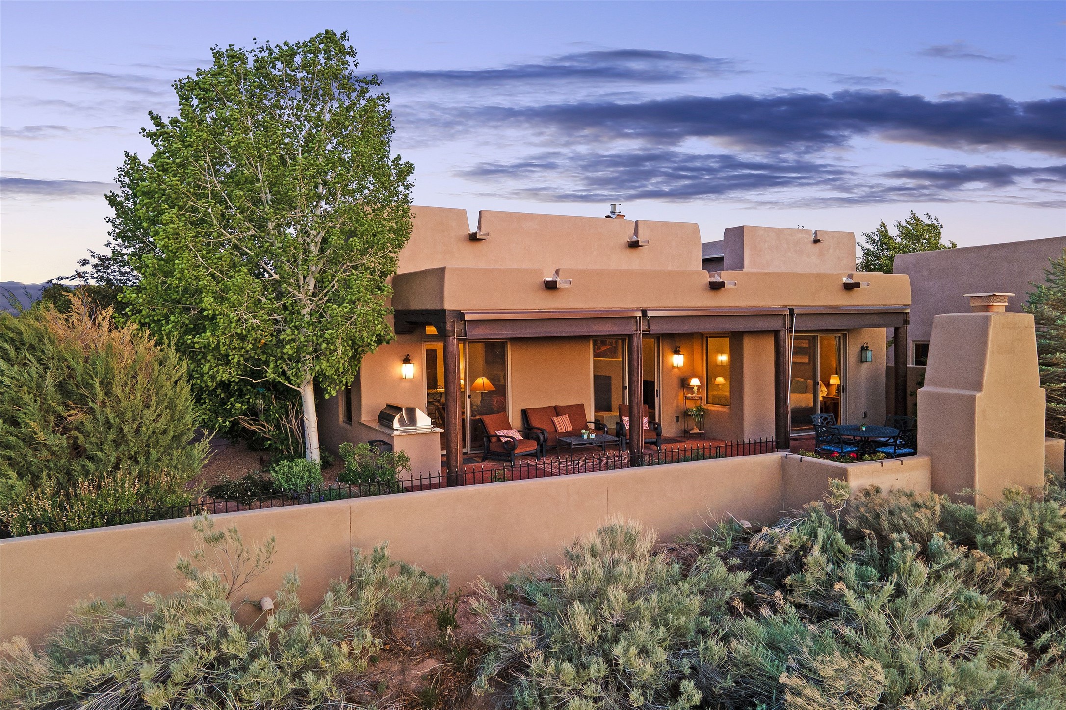 Enjoy Panoramic views of the Golf Course as well as the Jemez & Sangre de Cristo Mountainsfrom this 3 Bed / 3 Bath "Lock & Leave" home with a private, detached casita, located on anelevated corner lot in Gated Las Campanas. Double courtyard doors lead to a private oasiswith a brick patio surrounded by mature trees, flagstone walkways & a soothing outdoor waterfeature. Dining al fresco with a Mountain view is your choice at either of 2 outdoor wood-burning fireplaces. Upon entering the home, 2 hand-hewn doors open to a full-length foyerwindow looking into an inviting entry courtyard, awaiting the perfect sculpture or water feature.The Living / Dining area is an open concept layout with a gas fireplace plus 2 sliding doors thatlead to the Back Portal with Golf Course & Jemez Views. The Kitchen includes a 36"KitchenAid 6-Burner Gas Range/Oven, Microwave, Bosch Dishwasher, Whirlpool French DoorRefrigerator & large bar for casual meals. The Master Bedroom Suite enjoys the same Golf &Jemez views with its own private patio, en-suite bathroom with 2 separate sinks, walk-in closet,glass walk-in shower, deep soaking tub & compartmented water closet. Bedroom Two issequestered from the Master and has direct access to Bath Two. Steps away from the mainhome, through the entry courtyard, guests will be delighted with the welcoming 1 Bed / 1 BathCasita with a wet bar, microwave & refrigerator. This Lock & Leave home with Golf Course,Jemez & Sangre de Cristo Mountain views is the perfect Santa Fe get-away or primary homefor the ultimate Santa Fe lifestyle.