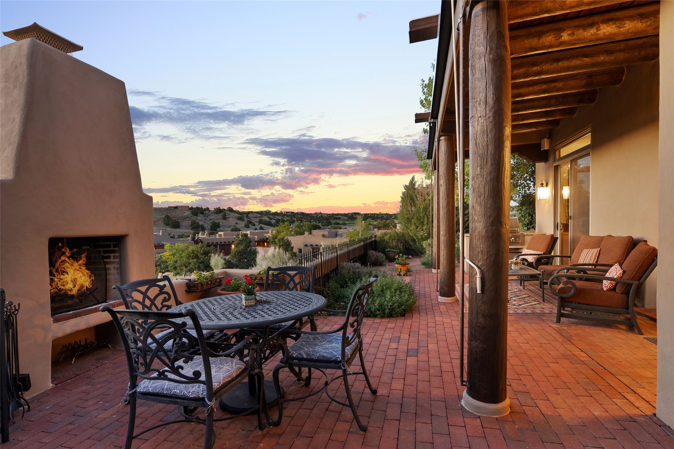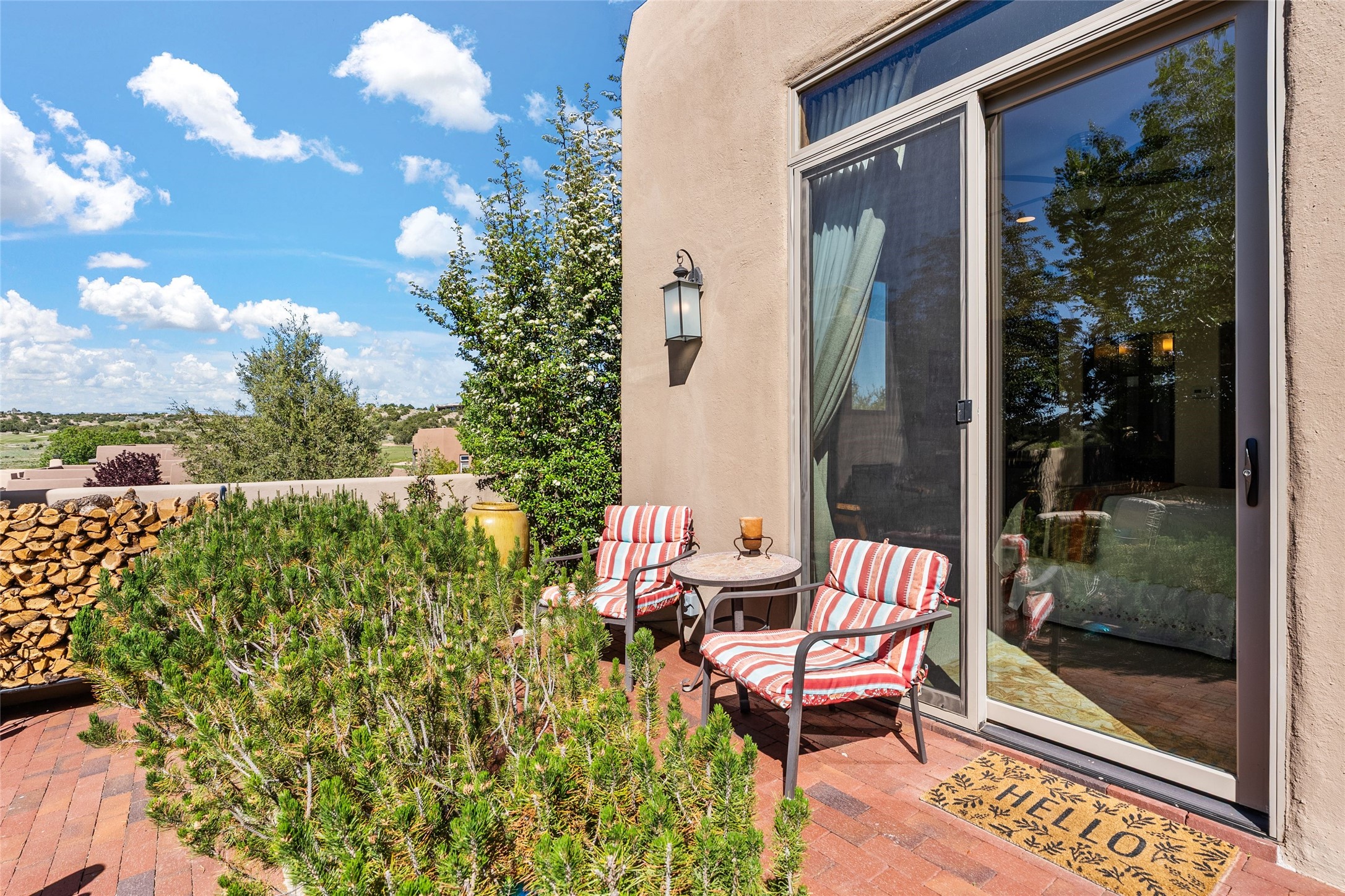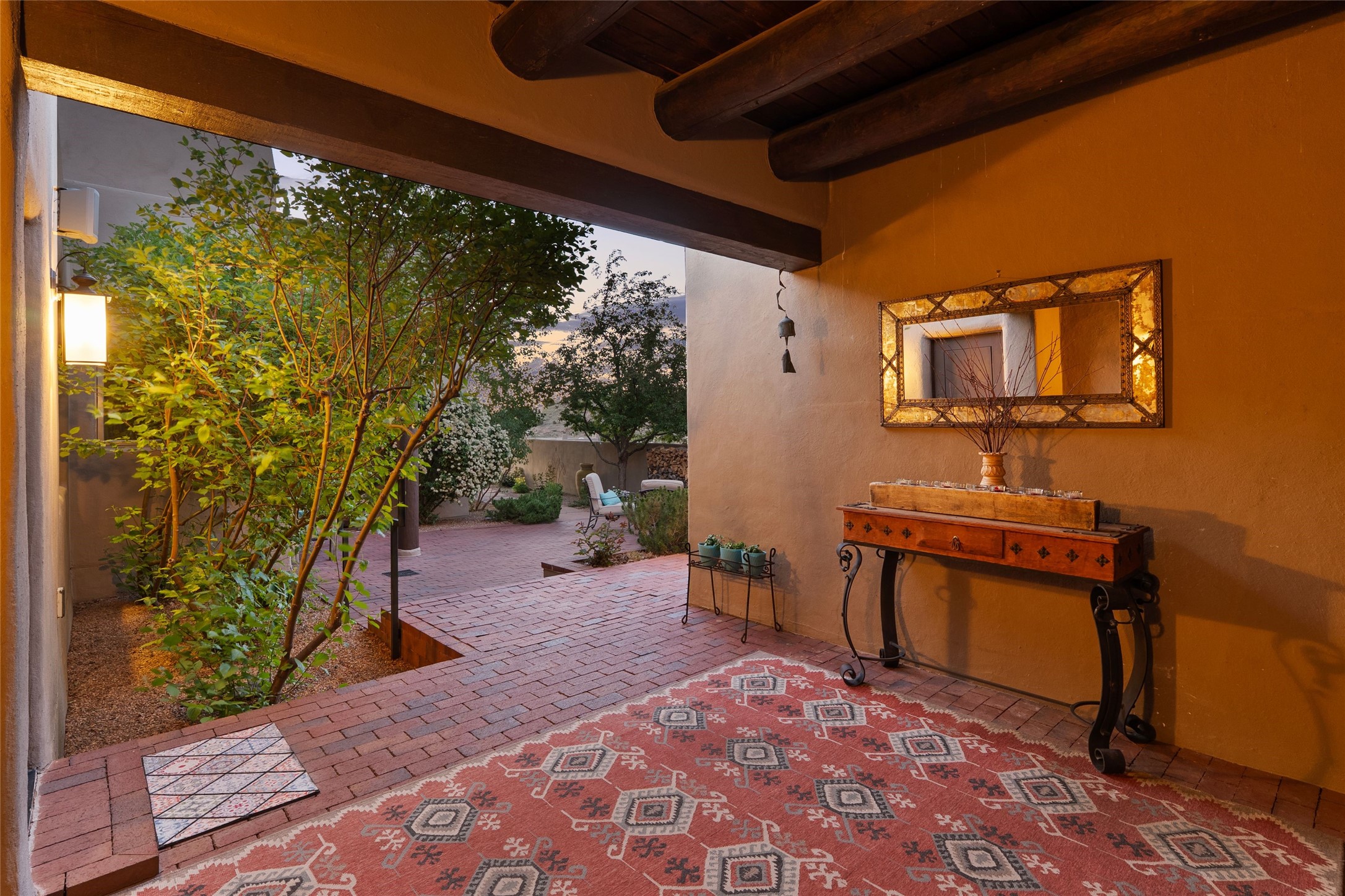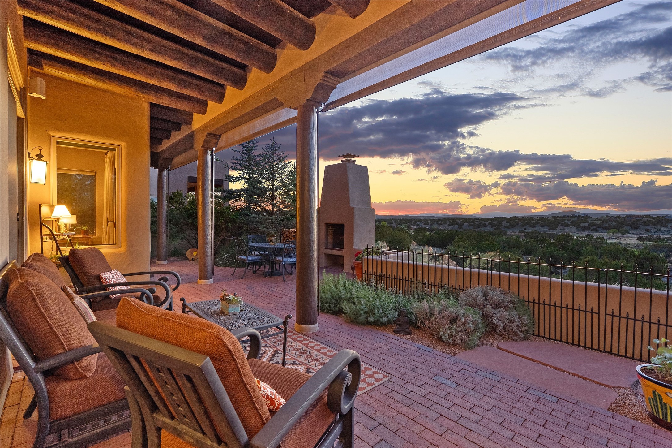 Enjoy Panoramic views of the Golf Course as well as the Jemez & Sangre de Cristo Mountainsfrom this 3 Bed / 3 Bath "Lock & Leave" home with a private, detached casita, located on anelevated corner lot in Gated Las Campanas. Double courtyard doors lead to a private oasiswith a brick patio surrounded by mature trees, flagstone walkways & a soothing outdoor waterfeature. Dining al fresco with a Mountain view is your choice at either of 2 outdoor wood-burning fireplaces. Upon entering the home, 2 hand-hewn doors open to a full-length foyerwindow looking into an inviting entry courtyard, awaiting the perfect sculpture or water feature.The Living / Dining area is an open concept layout with a gas fireplace plus 2 sliding doors thatlead to the Back Portal with Golf Course & Jemez Views. The Kitchen includes a 36"KitchenAid 6-Burner Gas Range/Oven, Microwave, Bosch Dishwasher, Whirlpool French DoorRefrigerator & large bar for casual meals. The Master Bedroom Suite enjoys the same Golf &Jemez views with its own private patio, en-suite bathroom with 2 separate sinks, walk-in closet,glass walk-in shower, deep soaking tub & compartmented water closet. Bedroom Two issequestered from the Master and has direct access to Bath Two. Steps away from the mainhome, through the entry courtyard, guests will be delighted with the welcoming 1 Bed / 1 BathCasita with a wet bar, microwave & refrigerator. This Lock & Leave home with Golf Course,Jemez & Sangre de Cristo Mountain views is the perfect Santa Fe get-away or primary homefor the ultimate Santa Fe lifestyle.