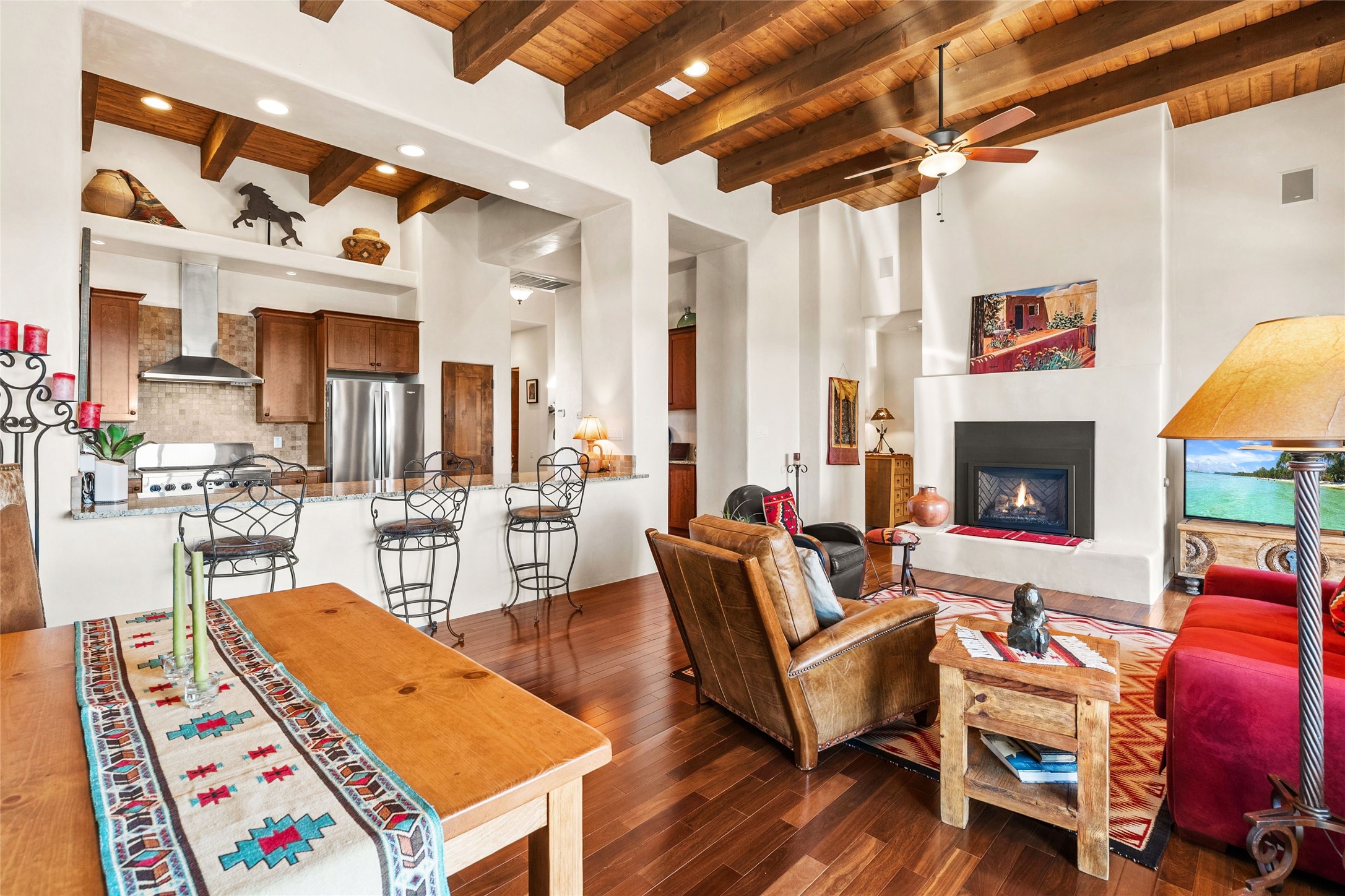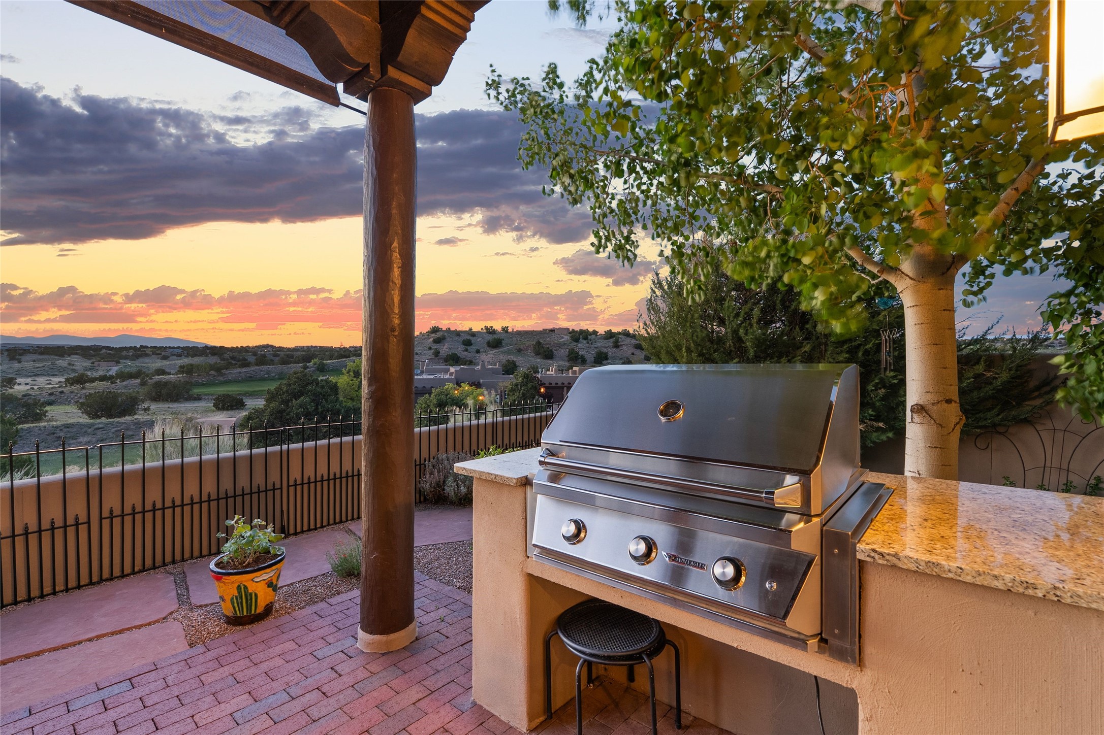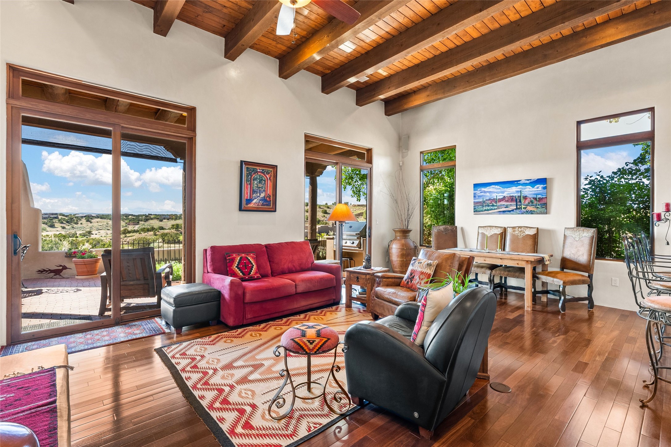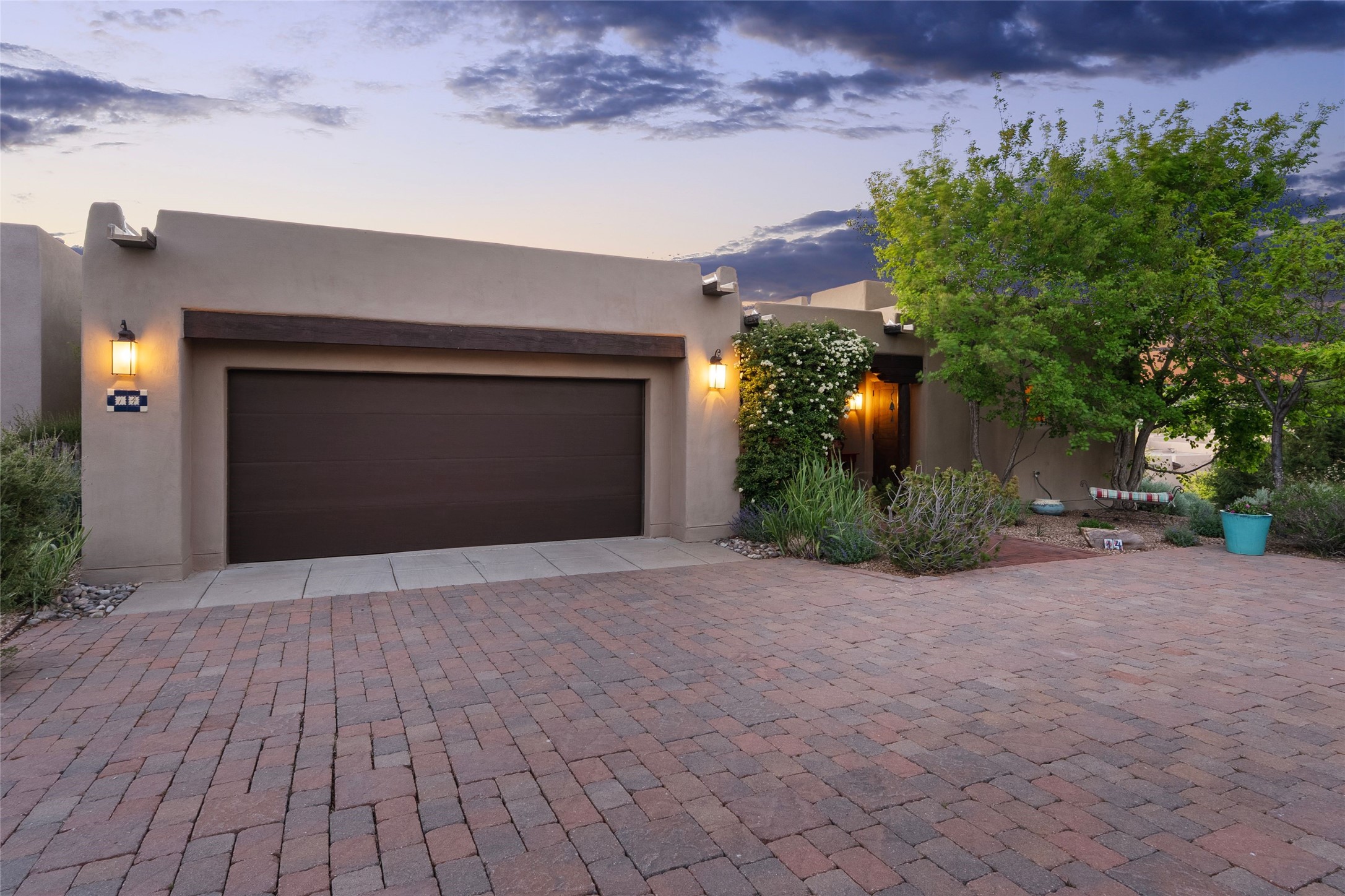 Enjoy Panoramic views of the Golf Course as well as the Jemez & Sangre de Cristo Mountainsfrom this 3 Bed / 3 Bath "Lock & Leave" home with a private, detached casita, located on anelevated corner lot in Gated Las Campanas. Double courtyard doors lead to a private oasiswith a brick patio surrounded by mature trees, flagstone walkways & a soothing outdoor waterfeature. Dining al fresco with a Mountain view is your choice at either of 2 outdoor wood-burning fireplaces. Upon entering the home, 2 hand-hewn doors open to a full-length foyerwindow looking into an inviting entry courtyard, awaiting the perfect sculpture or water feature.The Living / Dining area is an open concept layout with a gas fireplace plus 2 sliding doors thatlead to the Back Portal with Golf Course & Jemez Views. The Kitchen includes a 36"KitchenAid 6-Burner Gas Range/Oven, Microwave, Bosch Dishwasher, Whirlpool French DoorRefrigerator & large bar for casual meals. The Master Bedroom Suite enjoys the same Golf &Jemez views with its own private patio, en-suite bathroom with 2 separate sinks, walk-in closet,glass walk-in shower, deep soaking tub & compartmented water closet. Bedroom Two issequestered from the Master and has direct access to Bath Two. Steps away from the mainhome, through the entry courtyard, guests will be delighted with the welcoming 1 Bed / 1 BathCasita with a wet bar, microwave & refrigerator. This Lock & Leave home with Golf Course,Jemez & Sangre de Cristo Mountain views is the perfect Santa Fe get-away or primary homefor the ultimate Santa Fe lifestyle.