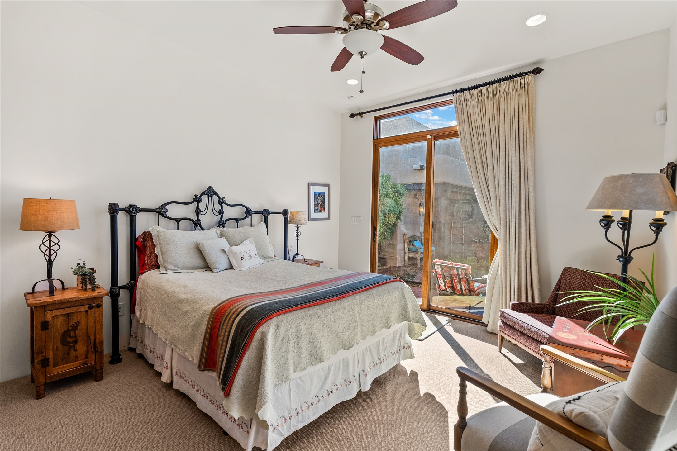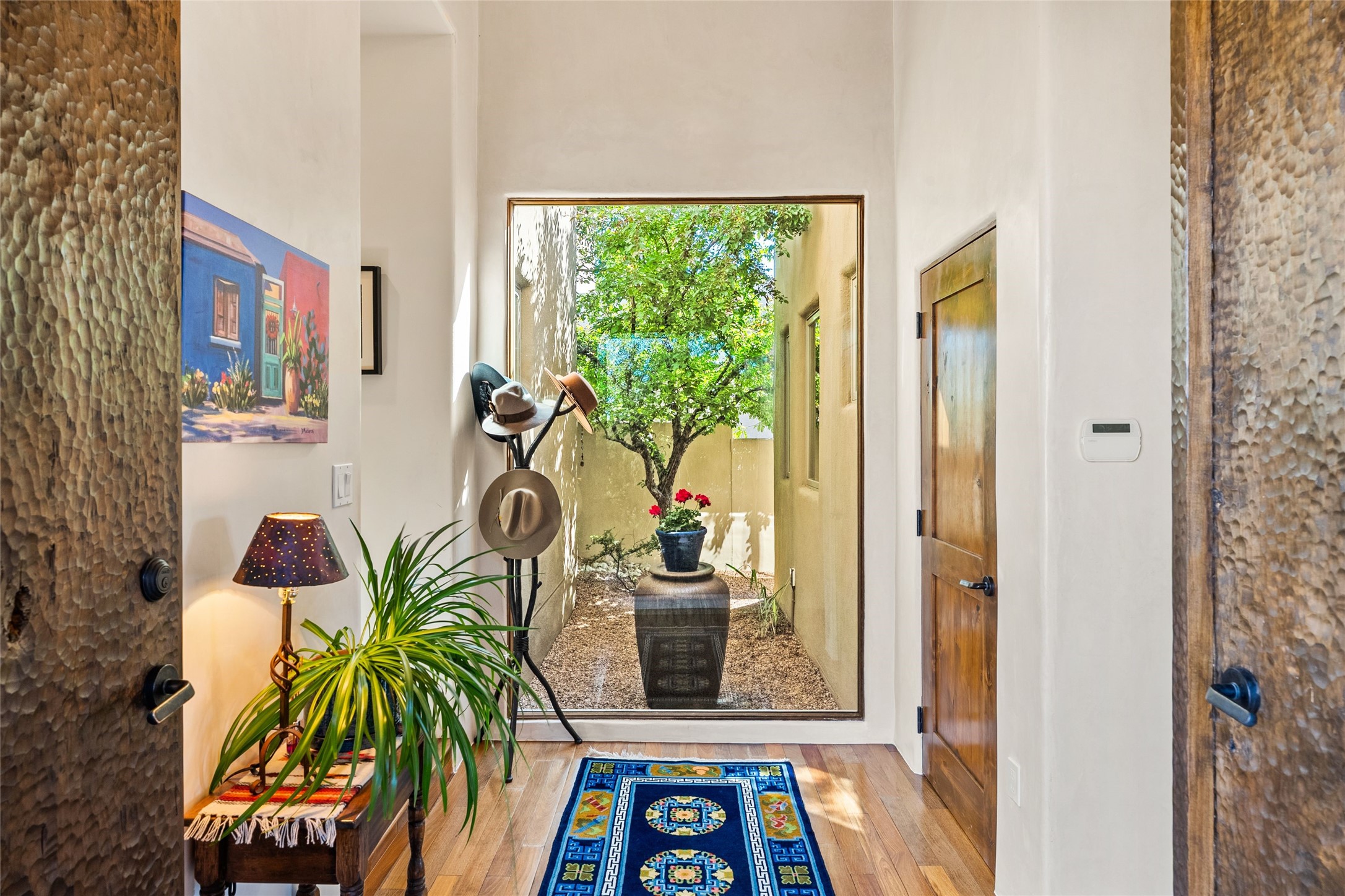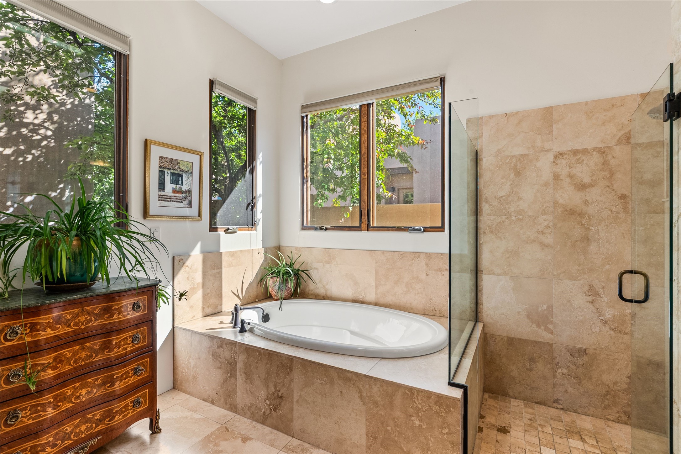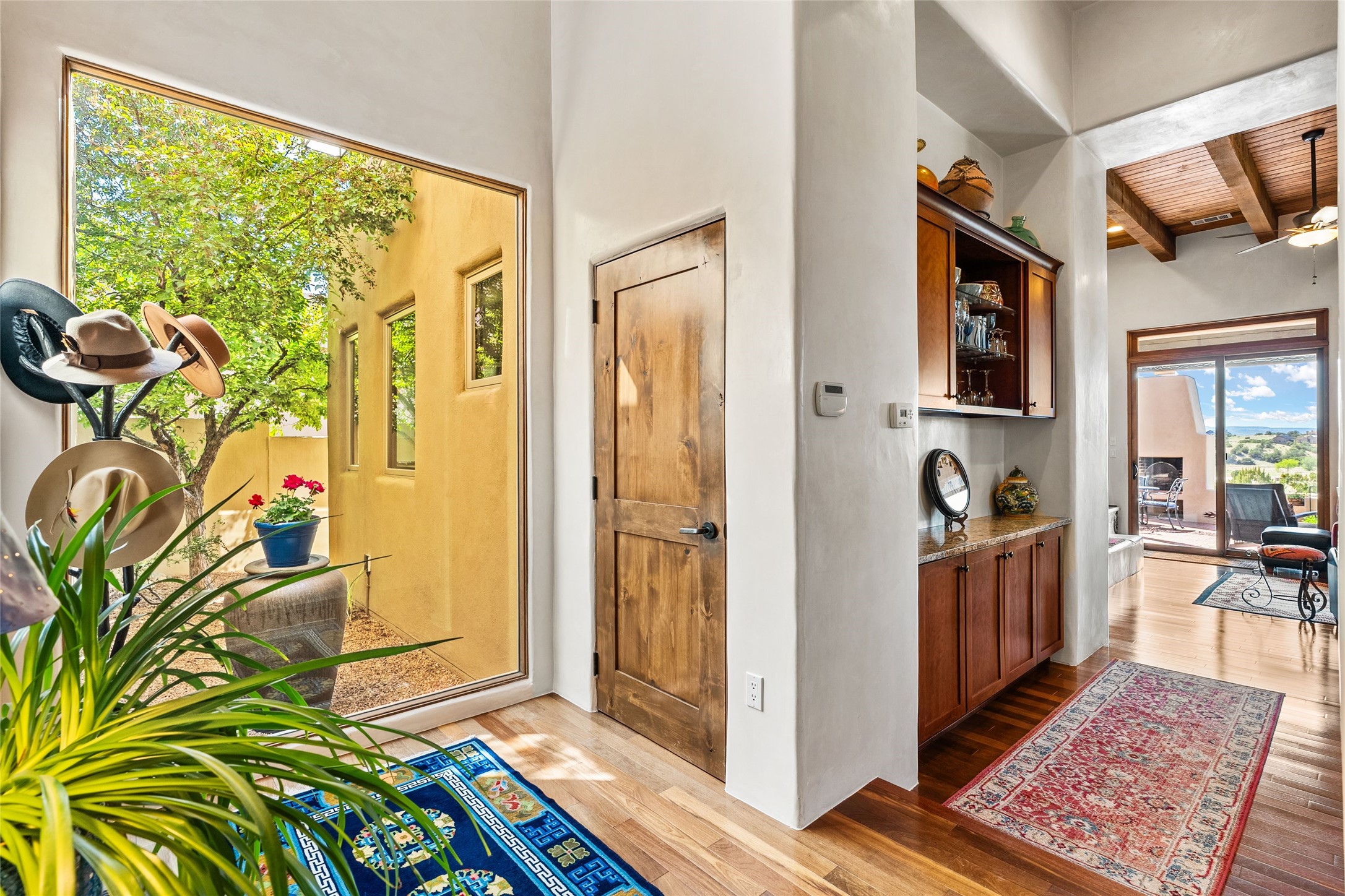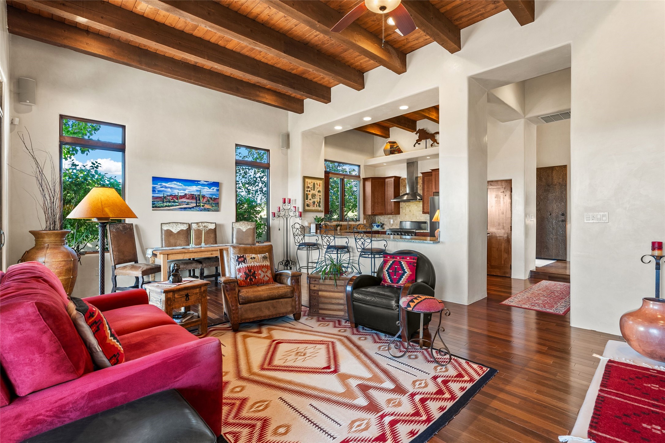 Enjoy Panoramic views of the Golf Course as well as the Jemez & Sangre de Cristo Mountainsfrom this 3 Bed / 3 Bath "Lock & Leave" home with a private, detached casita, located on anelevated corner lot in Gated Las Campanas. Double courtyard doors lead to a private oasiswith a brick patio surrounded by mature trees, flagstone walkways & a soothing outdoor waterfeature. Dining al fresco with a Mountain view is your choice at either of 2 outdoor wood-burning fireplaces. Upon entering the home, 2 hand-hewn doors open to a full-length foyerwindow looking into an inviting entry courtyard, awaiting the perfect sculpture or water feature.The Living / Dining area is an open concept layout with a gas fireplace plus 2 sliding doors thatlead to the Back Portal with Golf Course & Jemez Views. The Kitchen includes a 36"KitchenAid 6-Burner Gas Range/Oven, Microwave, Bosch Dishwasher, Whirlpool French DoorRefrigerator & large bar for casual meals. The Master Bedroom Suite enjoys the same Golf &Jemez views with its own private patio, en-suite bathroom with 2 separate sinks, walk-in closet,glass walk-in shower, deep soaking tub & compartmented water closet. Bedroom Two issequestered from the Master and has direct access to Bath Two. Steps away from the mainhome, through the entry courtyard, guests will be delighted with the welcoming 1 Bed / 1 BathCasita with a wet bar, microwave & refrigerator. This Lock & Leave home with Golf Course,Jemez & Sangre de Cristo Mountain views is the perfect Santa Fe get-away or primary homefor the ultimate Santa Fe lifestyle.