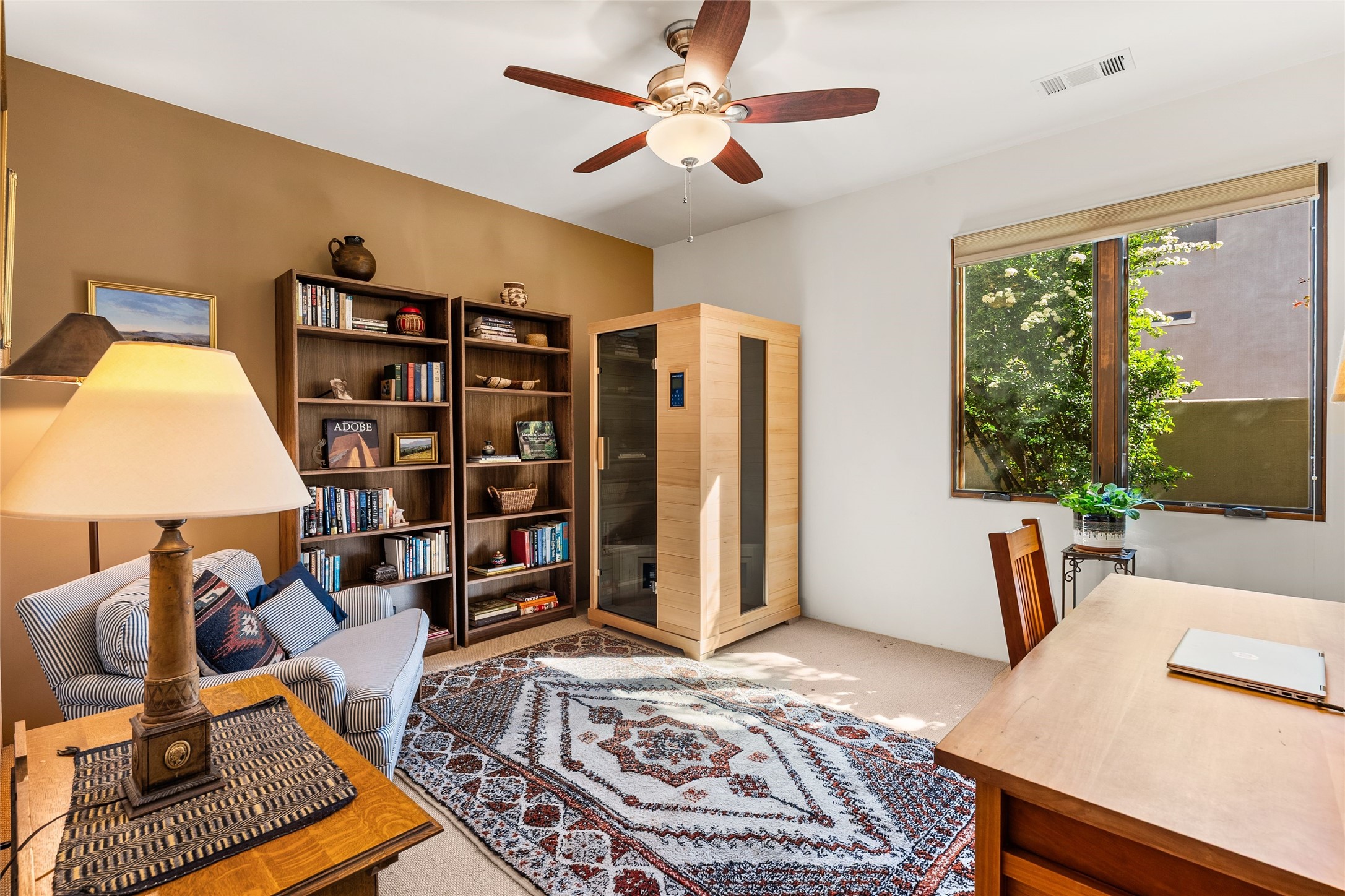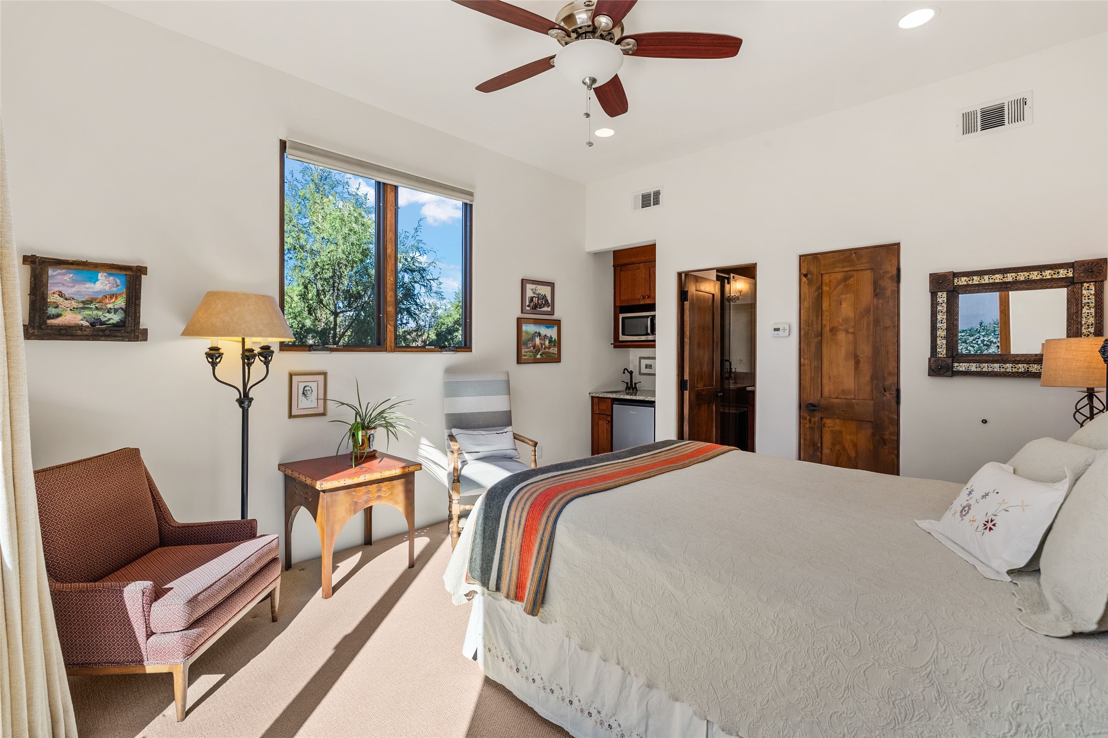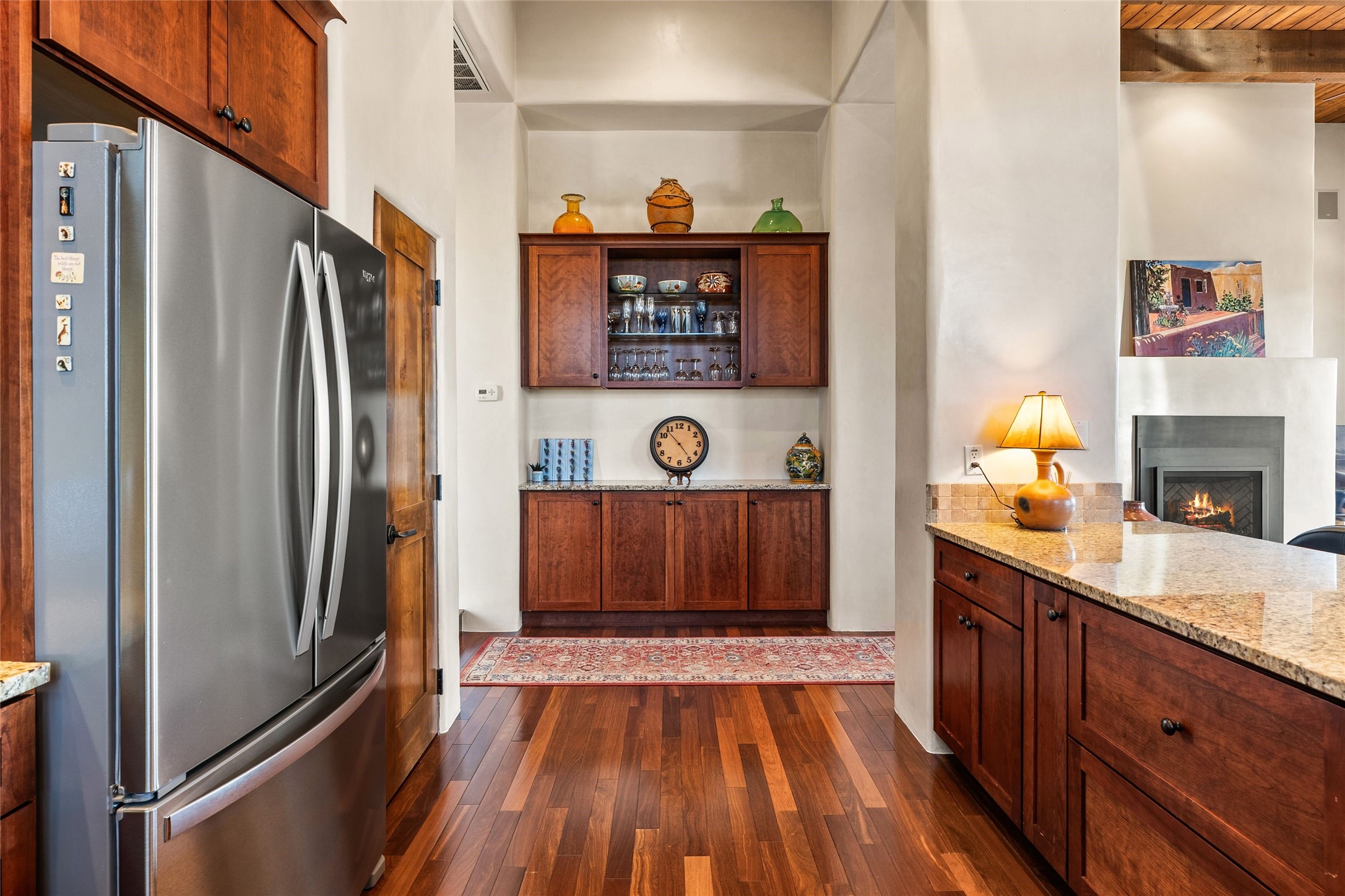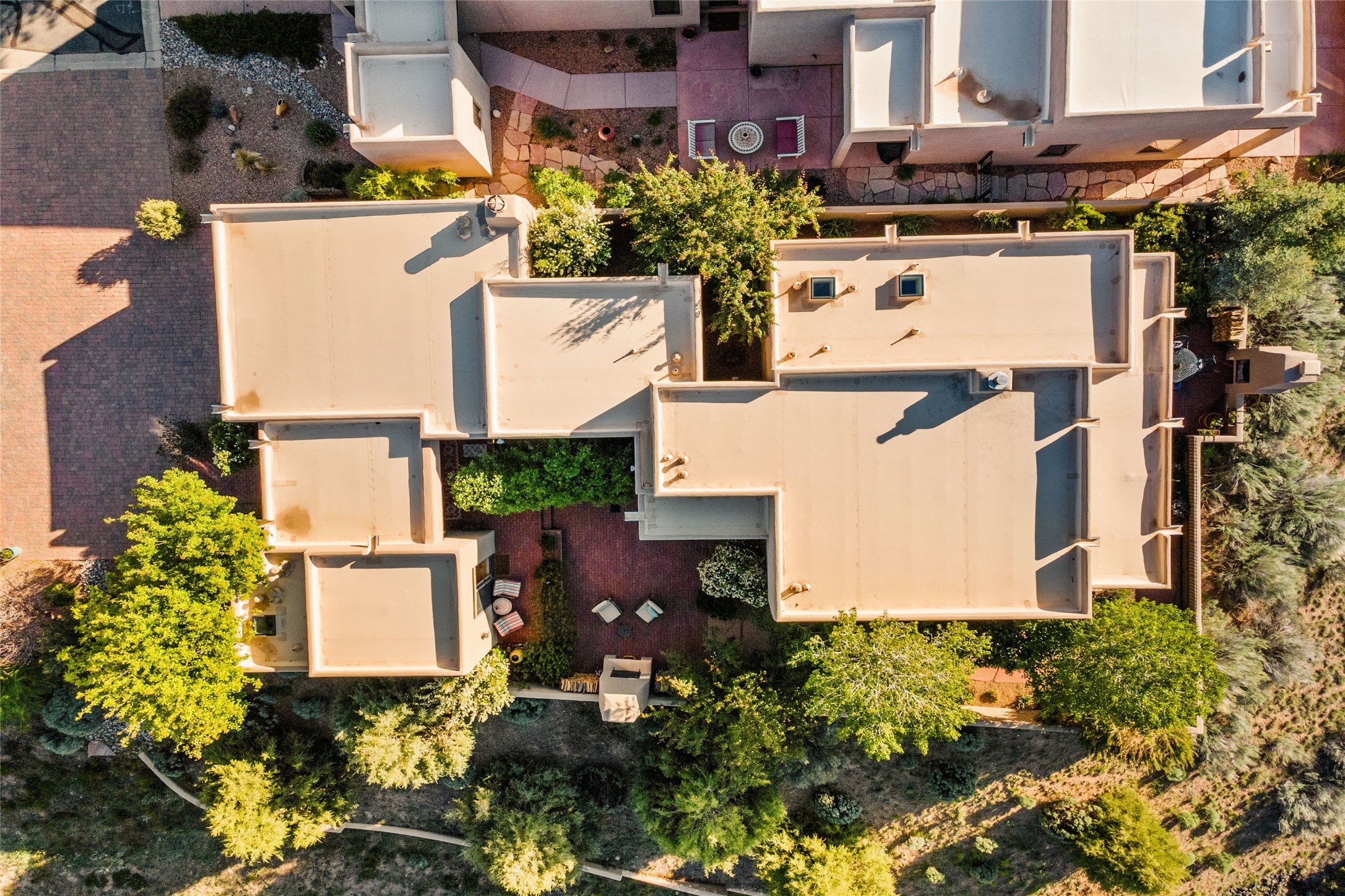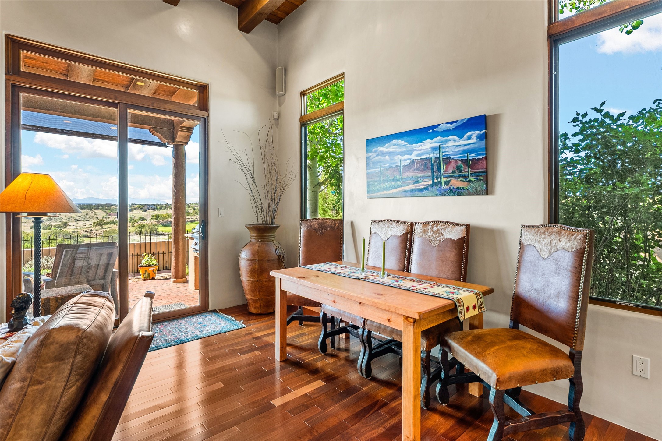 Enjoy Panoramic views of the Golf Course as well as the Jemez & Sangre de Cristo Mountainsfrom this 3 Bed / 3 Bath "Lock & Leave" home with a private, detached casita, located on anelevated corner lot in Gated Las Campanas. Double courtyard doors lead to a private oasiswith a brick patio surrounded by mature trees, flagstone walkways & a soothing outdoor waterfeature. Dining al fresco with a Mountain view is your choice at either of 2 outdoor wood-burning fireplaces. Upon entering the home, 2 hand-hewn doors open to a full-length foyerwindow looking into an inviting entry courtyard, awaiting the perfect sculpture or water feature.The Living / Dining area is an open concept layout with a gas fireplace plus 2 sliding doors thatlead to the Back Portal with Golf Course & Jemez Views. The Kitchen includes a 36"KitchenAid 6-Burner Gas Range/Oven, Microwave, Bosch Dishwasher, Whirlpool French DoorRefrigerator & large bar for casual meals. The Master Bedroom Suite enjoys the same Golf &Jemez views with its own private patio, en-suite bathroom with 2 separate sinks, walk-in closet,glass walk-in shower, deep soaking tub & compartmented water closet. Bedroom Two issequestered from the Master and has direct access to Bath Two. Steps away from the mainhome, through the entry courtyard, guests will be delighted with the welcoming 1 Bed / 1 BathCasita with a wet bar, microwave & refrigerator. This Lock & Leave home with Golf Course,Jemez & Sangre de Cristo Mountain views is the perfect Santa Fe get-away or primary homefor the ultimate Santa Fe lifestyle.