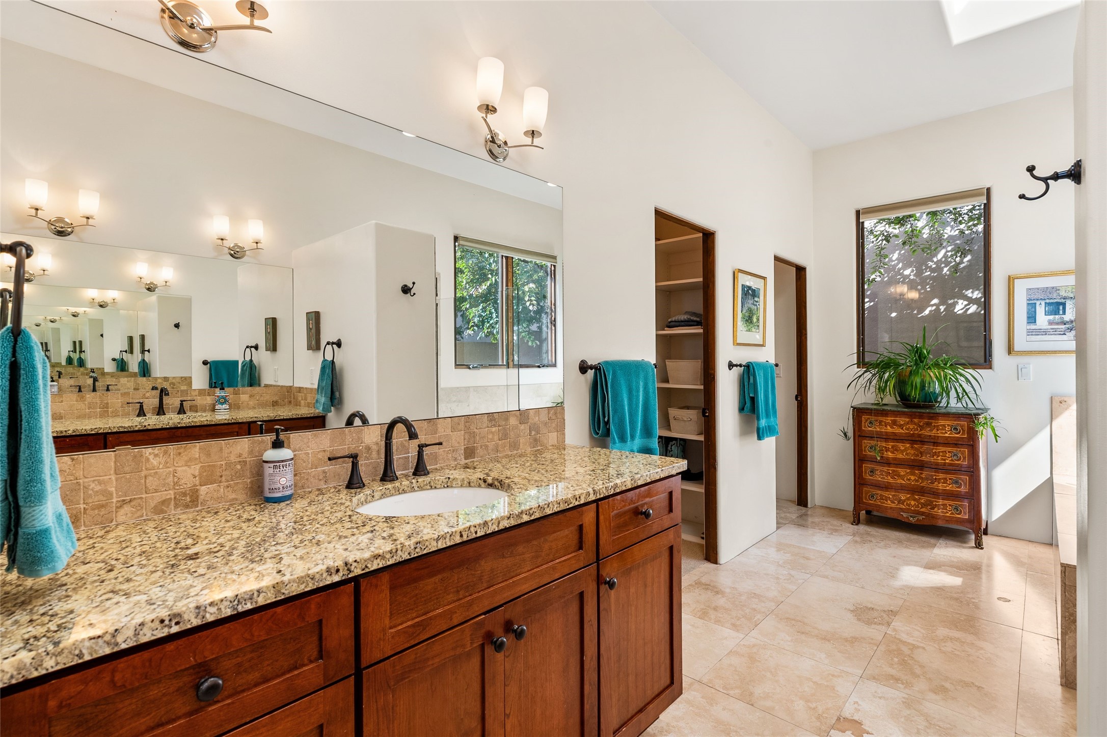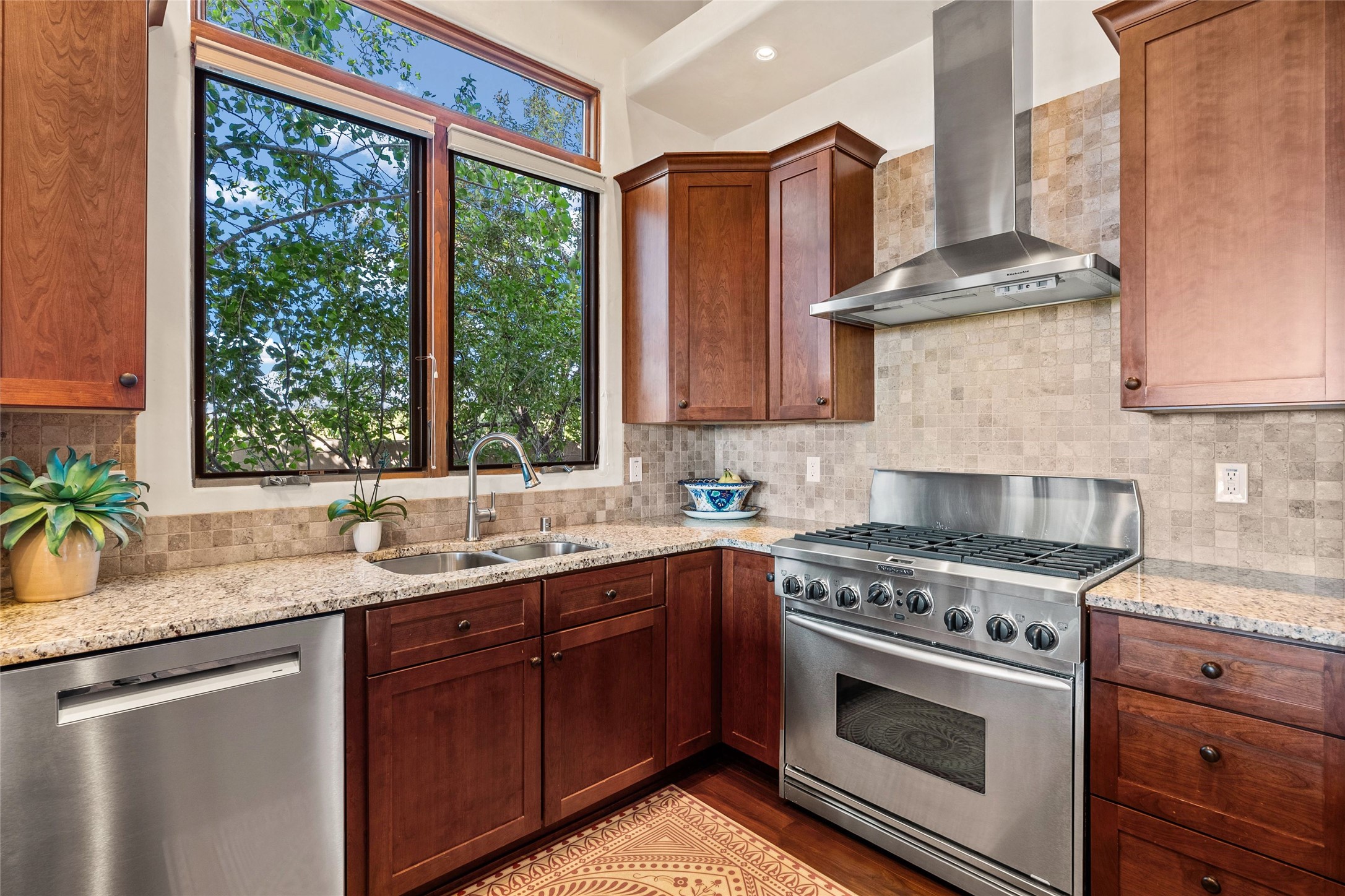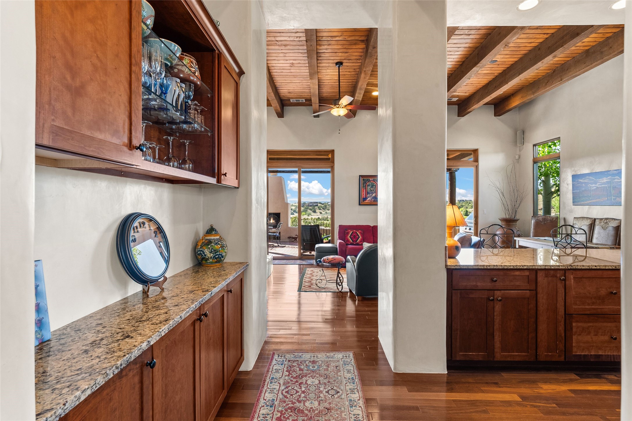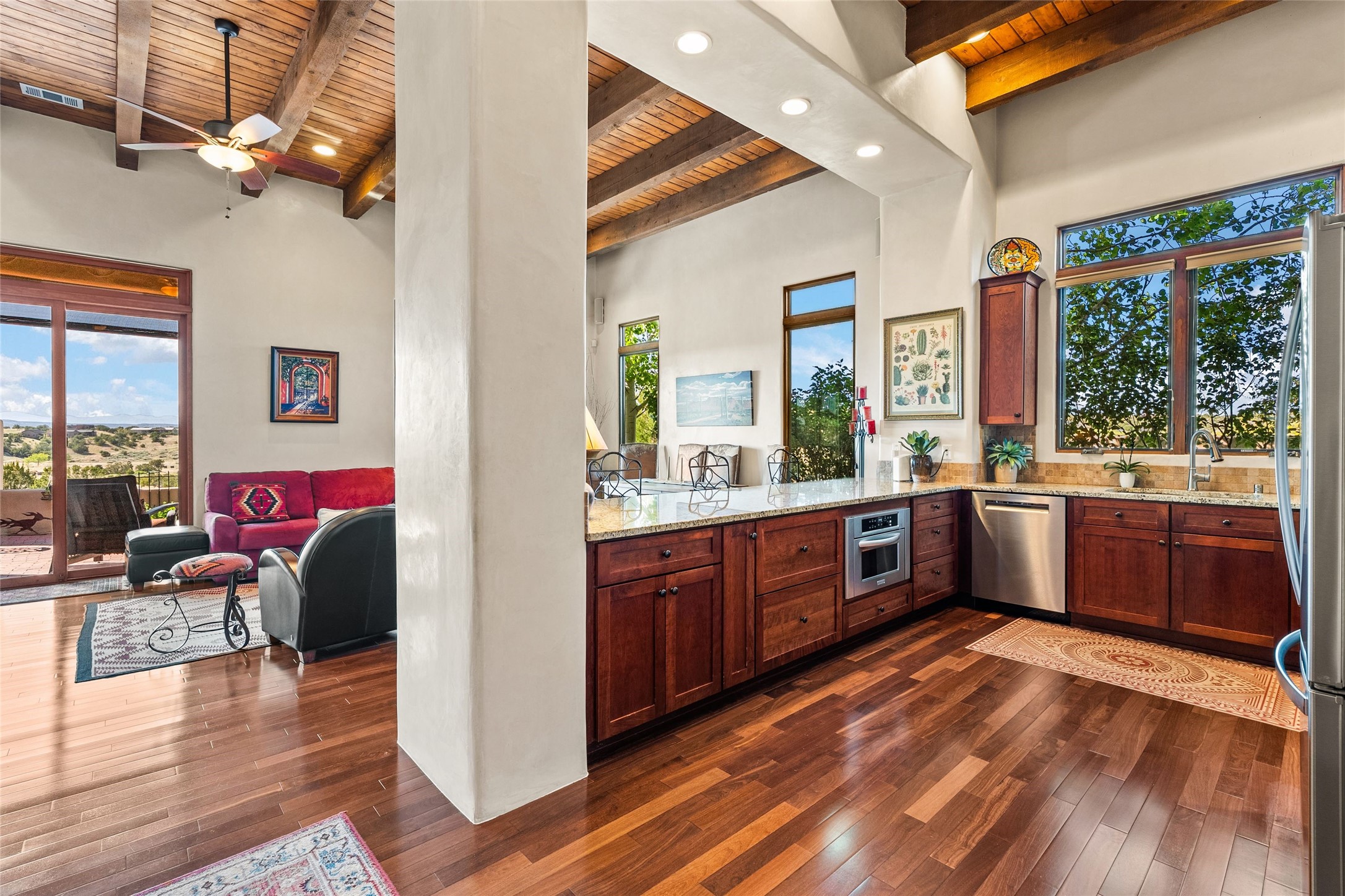 Enjoy Panoramic views of the Golf Course as well as the Jemez & Sangre de Cristo Mountainsfrom this 3 Bed / 3 Bath "Lock & Leave" home with a private, detached casita, located on anelevated corner lot in Gated Las Campanas. Double courtyard doors lead to a private oasiswith a brick patio surrounded by mature trees, flagstone walkways & a soothing outdoor waterfeature. Dining al fresco with a Mountain view is your choice at either of 2 outdoor wood-burning fireplaces. Upon entering the home, 2 hand-hewn doors open to a full-length foyerwindow looking into an inviting entry courtyard, awaiting the perfect sculpture or water feature.The Living / Dining area is an open concept layout with a gas fireplace plus 2 sliding doors thatlead to the Back Portal with Golf Course & Jemez Views. The Kitchen includes a 36"KitchenAid 6-Burner Gas Range/Oven, Microwave, Bosch Dishwasher, Whirlpool French DoorRefrigerator & large bar for casual meals. The Master Bedroom Suite enjoys the same Golf &Jemez views with its own private patio, en-suite bathroom with 2 separate sinks, walk-in closet,glass walk-in shower, deep soaking tub & compartmented water closet. Bedroom Two issequestered from the Master and has direct access to Bath Two. Steps away from the mainhome, through the entry courtyard, guests will be delighted with the welcoming 1 Bed / 1 BathCasita with a wet bar, microwave & refrigerator. This Lock & Leave home with Golf Course,Jemez & Sangre de Cristo Mountain views is the perfect Santa Fe get-away or primary homefor the ultimate Santa Fe lifestyle.
