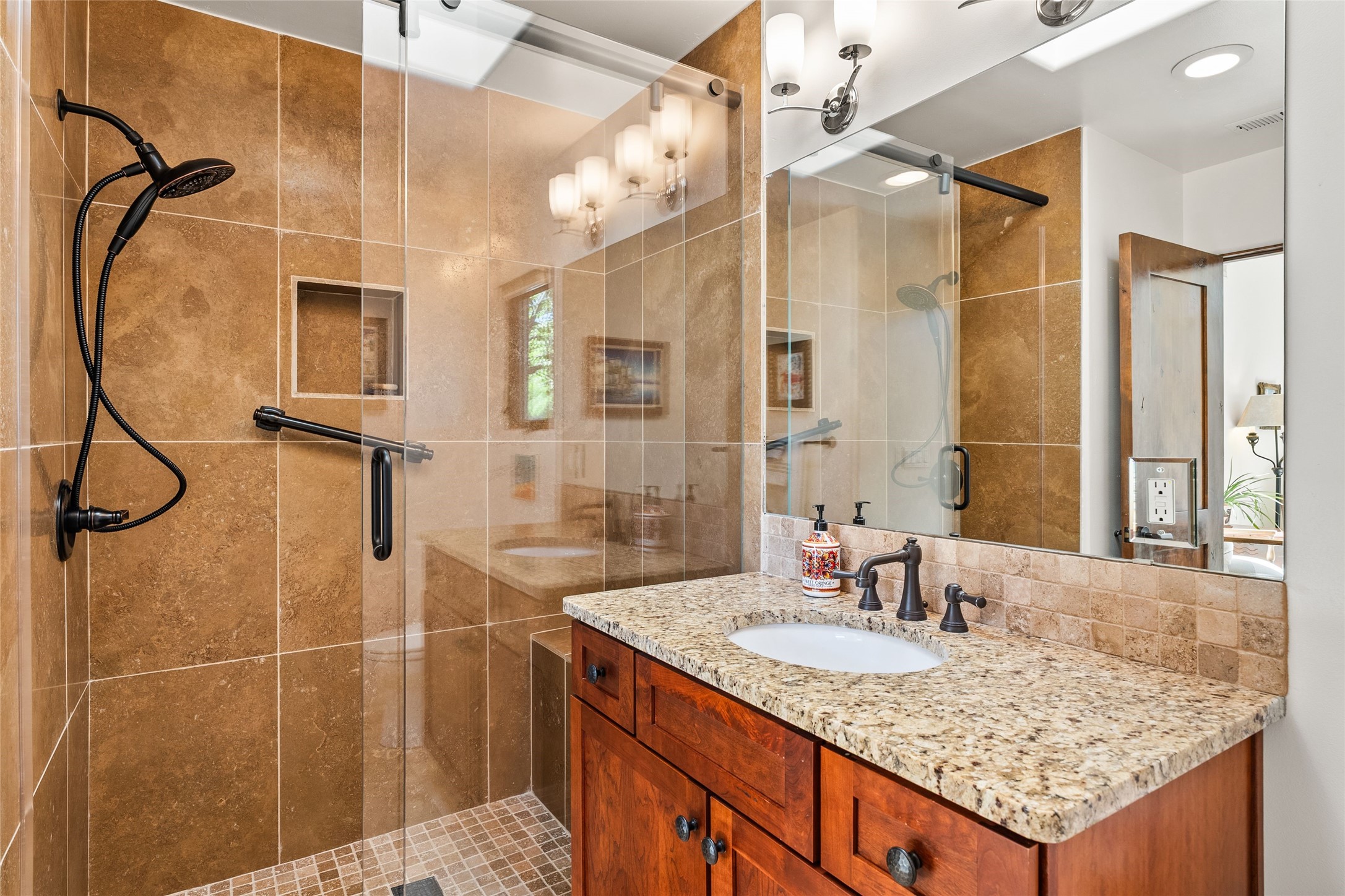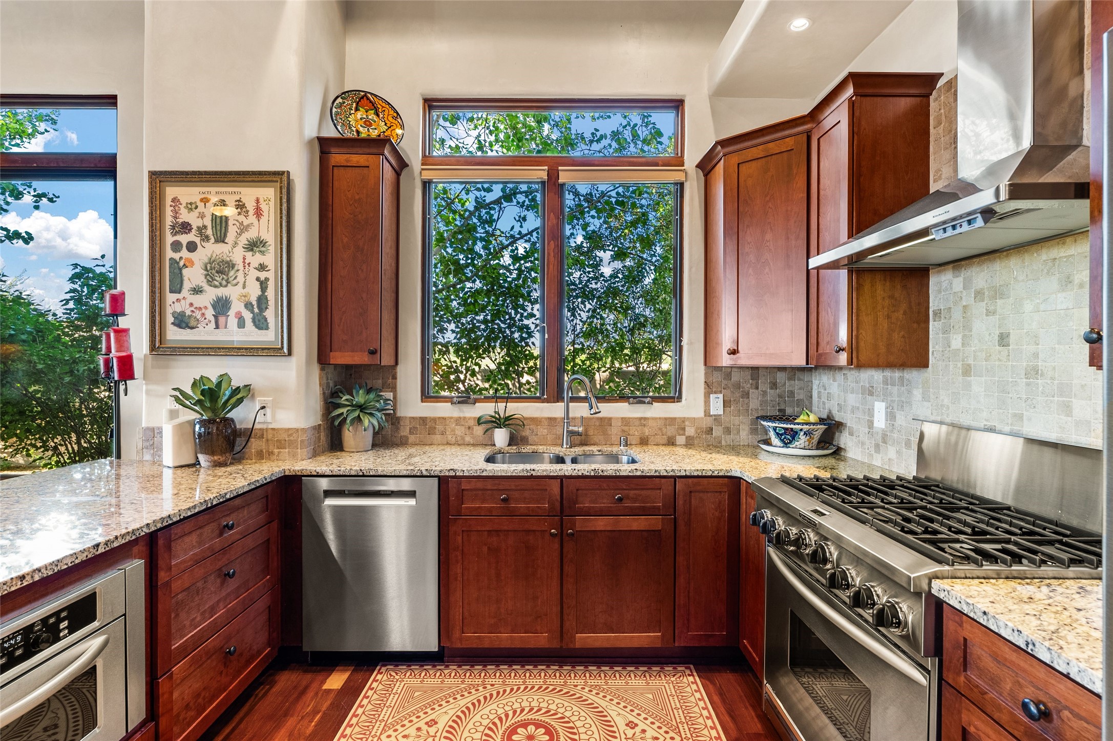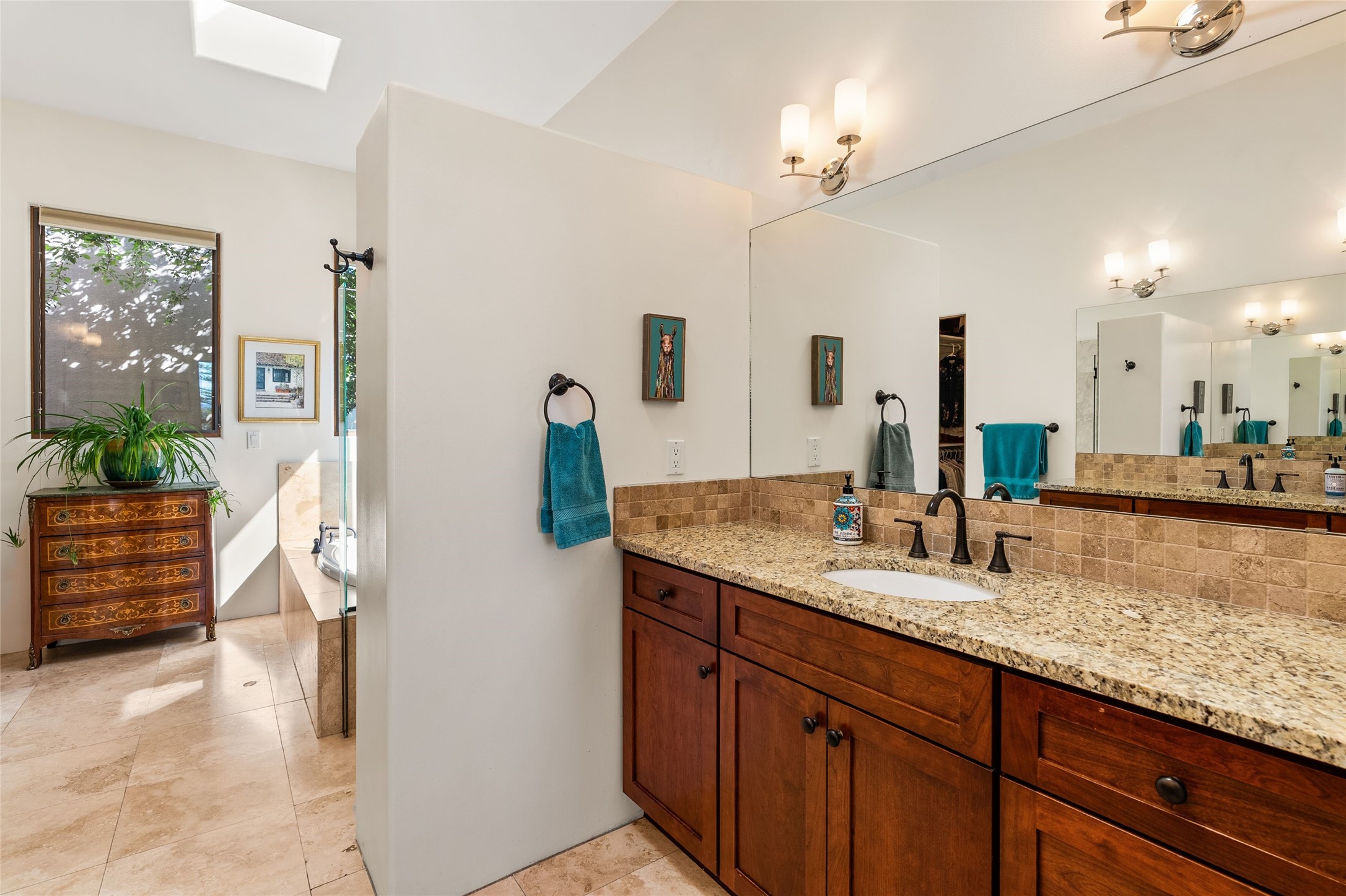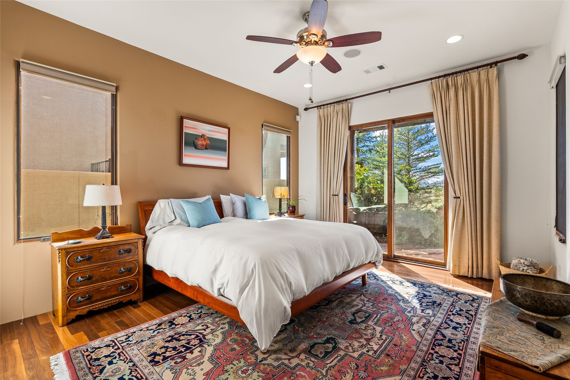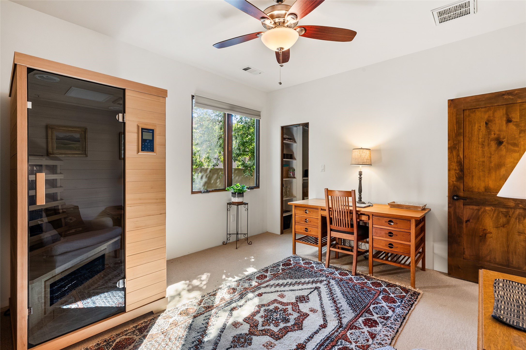 Enjoy Panoramic views of the Golf Course as well as the Jemez & Sangre de Cristo Mountainsfrom this 3 Bed / 3 Bath "Lock & Leave" home with a private, detached casita, located on anelevated corner lot in Gated Las Campanas. Double courtyard doors lead to a private oasiswith a brick patio surrounded by mature trees, flagstone walkways & a soothing outdoor waterfeature. Dining al fresco with a Mountain view is your choice at either of 2 outdoor wood-burning fireplaces. Upon entering the home, 2 hand-hewn doors open to a full-length foyerwindow looking into an inviting entry courtyard, awaiting the perfect sculpture or water feature.The Living / Dining area is an open concept layout with a gas fireplace plus 2 sliding doors thatlead to the Back Portal with Golf Course & Jemez Views. The Kitchen includes a 36"KitchenAid 6-Burner Gas Range/Oven, Microwave, Bosch Dishwasher, Whirlpool French DoorRefrigerator & large bar for casual meals. The Master Bedroom Suite enjoys the same Golf &Jemez views with its own private patio, en-suite bathroom with 2 separate sinks, walk-in closet,glass walk-in shower, deep soaking tub & compartmented water closet. Bedroom Two issequestered from the Master and has direct access to Bath Two. Steps away from the mainhome, through the entry courtyard, guests will be delighted with the welcoming 1 Bed / 1 BathCasita with a wet bar, microwave & refrigerator. This Lock & Leave home with Golf Course,Jemez & Sangre de Cristo Mountain views is the perfect Santa Fe get-away or primary homefor the ultimate Santa Fe lifestyle.