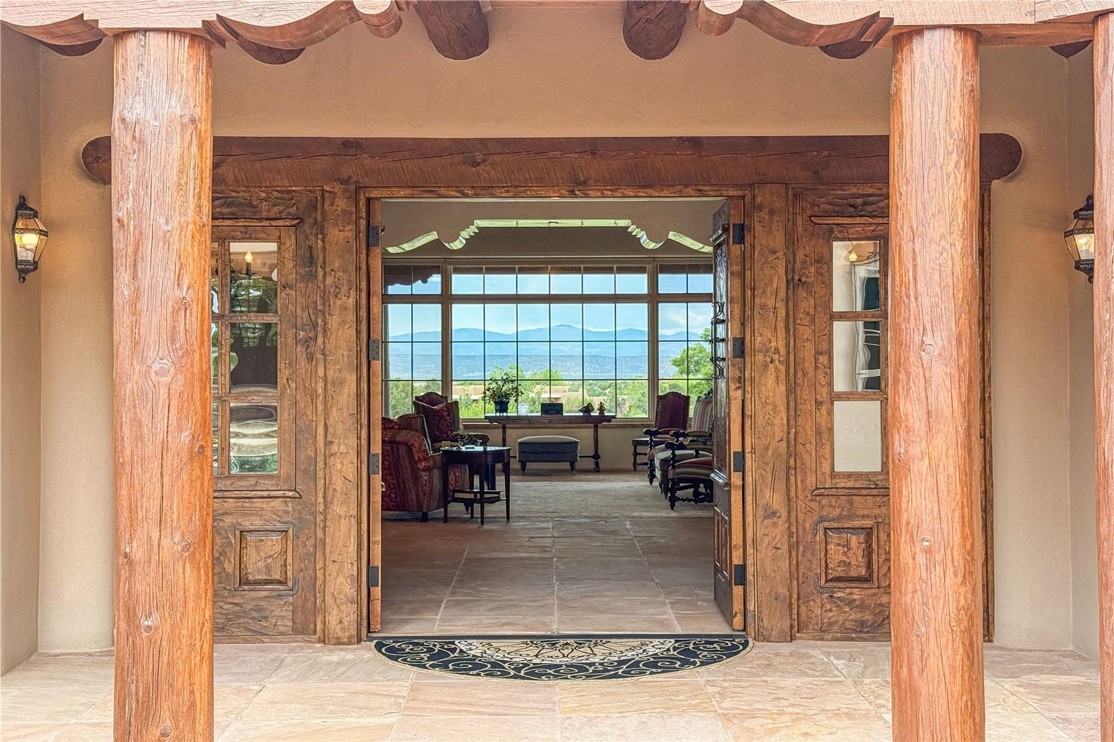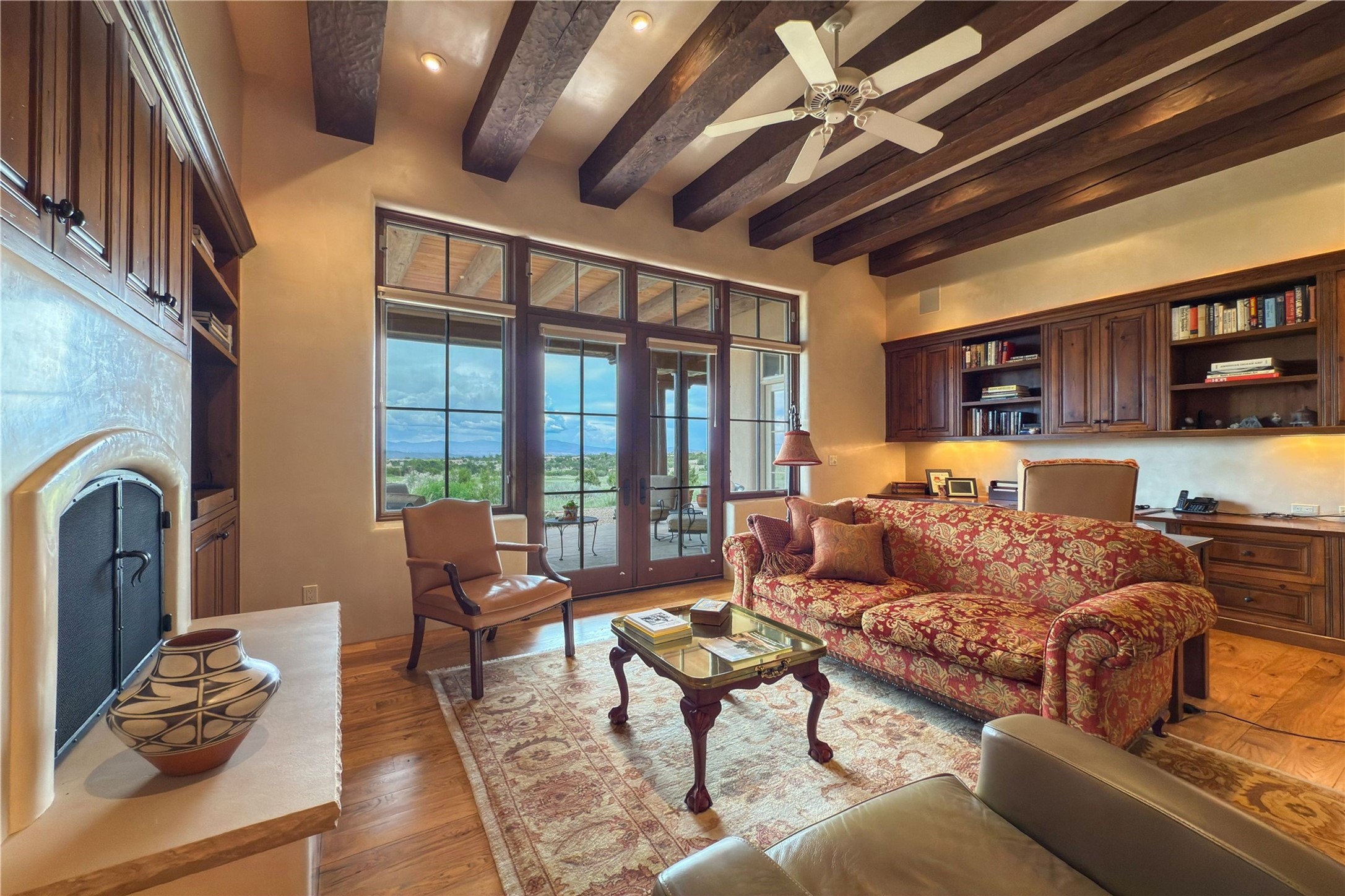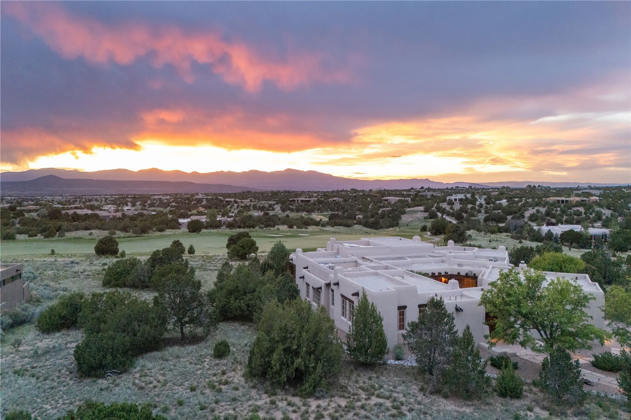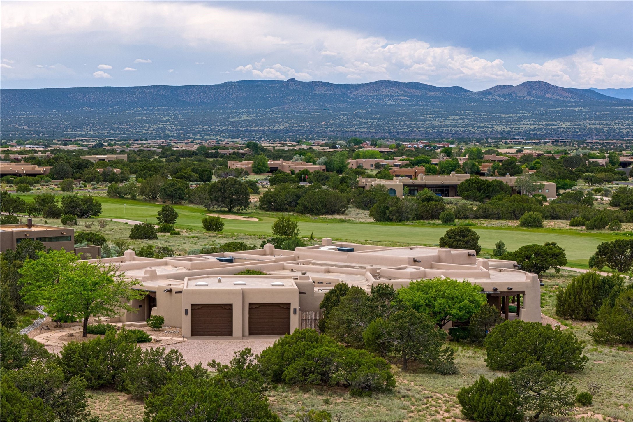 Sophisticated Country Estate with Panoramic Mountain Views in Prestigious Las Campanas.Discover unparalleled luxury in this meticulously crafted estate that seamlessly blends timeless elegance with regional architectural charm. Set within a private courtyard sanctuary surrounded by mature trees, this exceptional home offers breathtaking Jemez and Sangre de Cristo mountain vistas alongside Las Campanas golf course views.Enter through impressive carved alder double doors into soaring ceilings and rich woodwork throughout. The light-filled living room centers around a magnificent fireplace, perfectly framing mountain and golf course panoramas. Hickory wood floors add warmth while shuttered windows enhance the sophisticated country aesthetic.The chef's dream kitchen features a substantial island, granite countertops, and premium appliances ideal for culinary enthusiasts. The curved dining room showcases custom limestone floors, with stunning dual mountain range views leading to a tranquil portal with fireplace--perfect for morning coffee or evening cocktails.Retreat to the spacious primary suite featuring a private portal, mountain vistas, dual walk-in closets, and separate his-and-hers bathroom spaces. All four bathrooms in this home showcase custom decorative tile designed exclusively for this home by renowned Taos artist Jill Rounds.Additional Amenities include a dedicated study offering peaceful views, built-in shelving, and custom alder desk. Two generous guest en-suites share a convenient wet bar and courtyard access. Practical features include a spacious laundry room, kitchen office nook, and mudroom with ample storage. Multiple portal access points maximize indoor-outdoor living.Las Campanas provides 24-hour security and EMT services. Club memberships available for purchase upon approval.