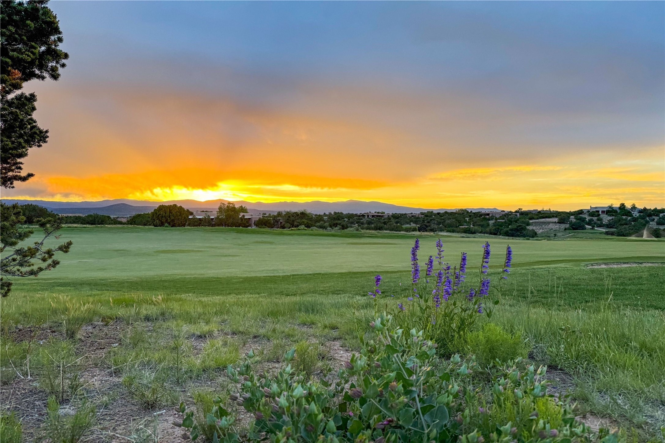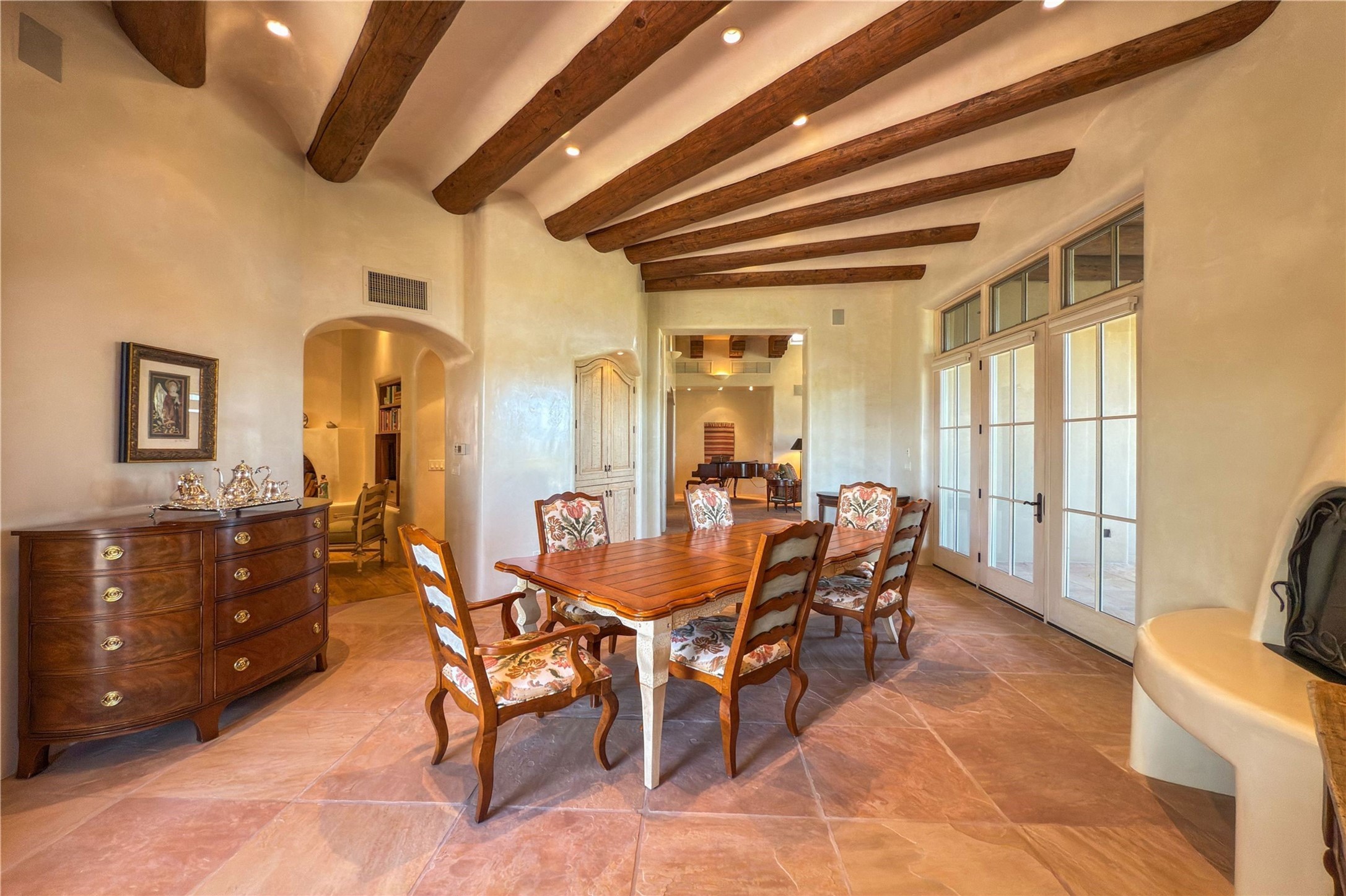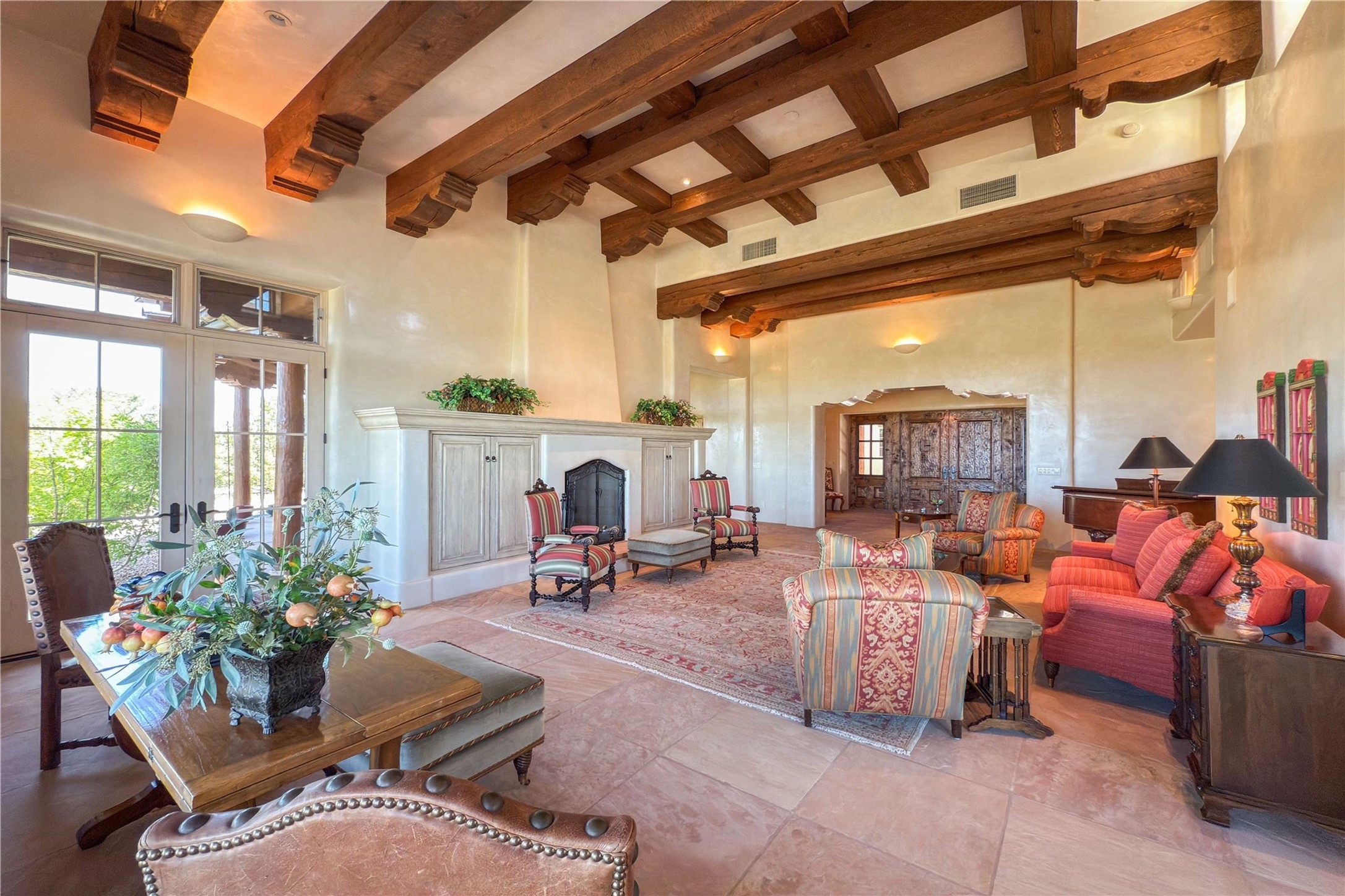 Sophisticated Country Estate with Panoramic Mountain Views in Prestigious Las Campanas.Discover unparalleled luxury in this meticulously crafted estate that seamlessly blends timeless elegance with regional architectural charm. Set within a private courtyard sanctuary surrounded by mature trees, this exceptional home offers breathtaking Jemez and Sangre de Cristo mountain vistas alongside Las Campanas golf course views.Enter through impressive carved alder double doors into soaring ceilings and rich woodwork throughout. The light-filled living room centers around a magnificent fireplace, perfectly framing mountain and golf course panoramas. Hickory wood floors add warmth while shuttered windows enhance the sophisticated country aesthetic.The chef's dream kitchen features a substantial island, granite countertops, and premium appliances ideal for culinary enthusiasts. The curved dining room showcases custom limestone floors, with stunning dual mountain range views leading to a tranquil portal with fireplace--perfect for morning coffee or evening cocktails.Retreat to the spacious primary suite featuring a private portal, mountain vistas, dual walk-in closets, and separate his-and-hers bathroom spaces. All four bathrooms in this home showcase custom decorative tile designed exclusively for this home by renowned Taos artist Jill Rounds.Additional Amenities include a dedicated study offering peaceful views, built-in shelving, and custom alder desk. Two generous guest en-suites share a convenient wet bar and courtyard access. Practical features include a spacious laundry room, kitchen office nook, and mudroom with ample storage. Multiple portal access points maximize indoor-outdoor living.Las Campanas provides 24-hour security and EMT services. Club memberships available for purchase upon approval.