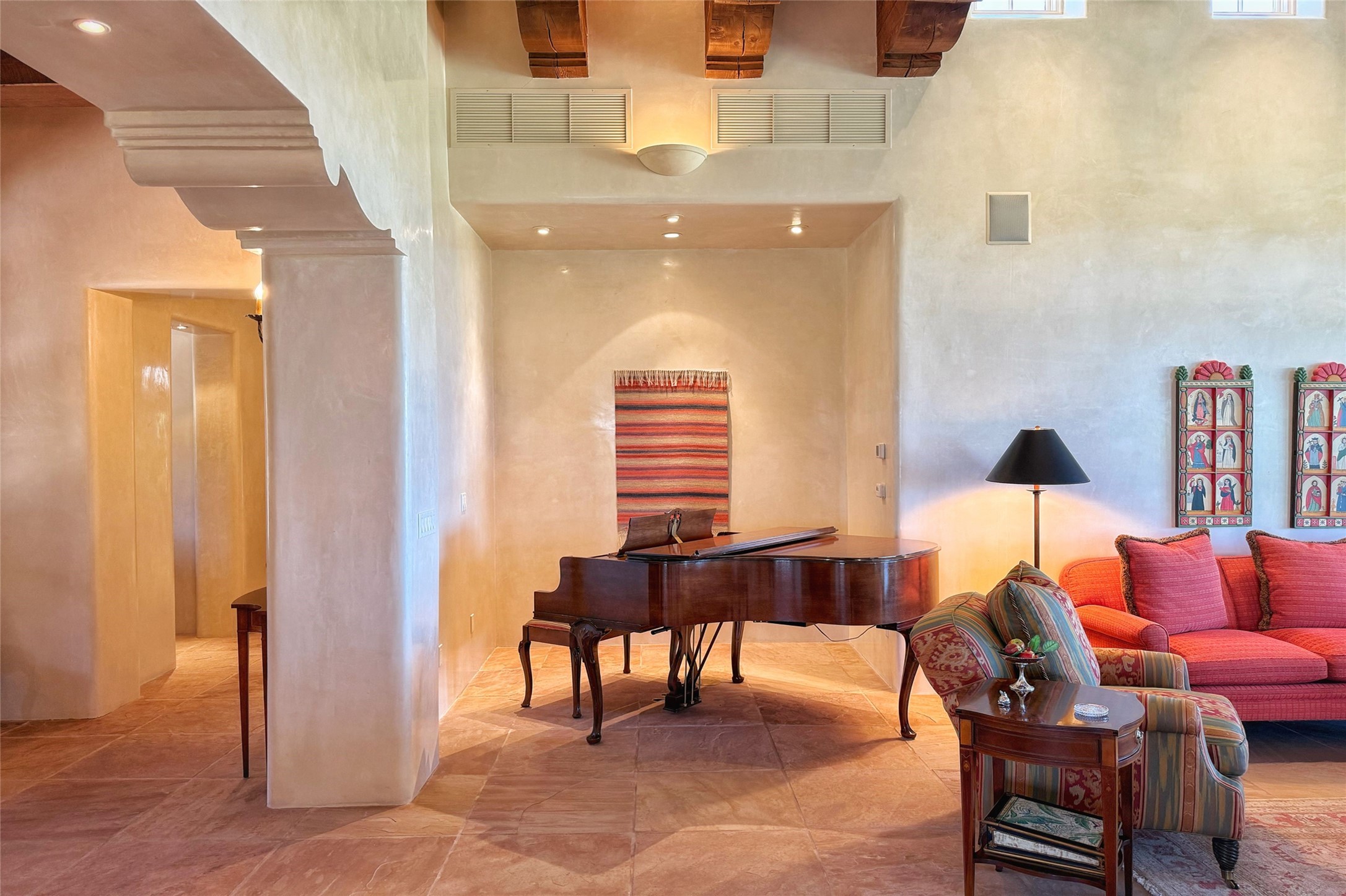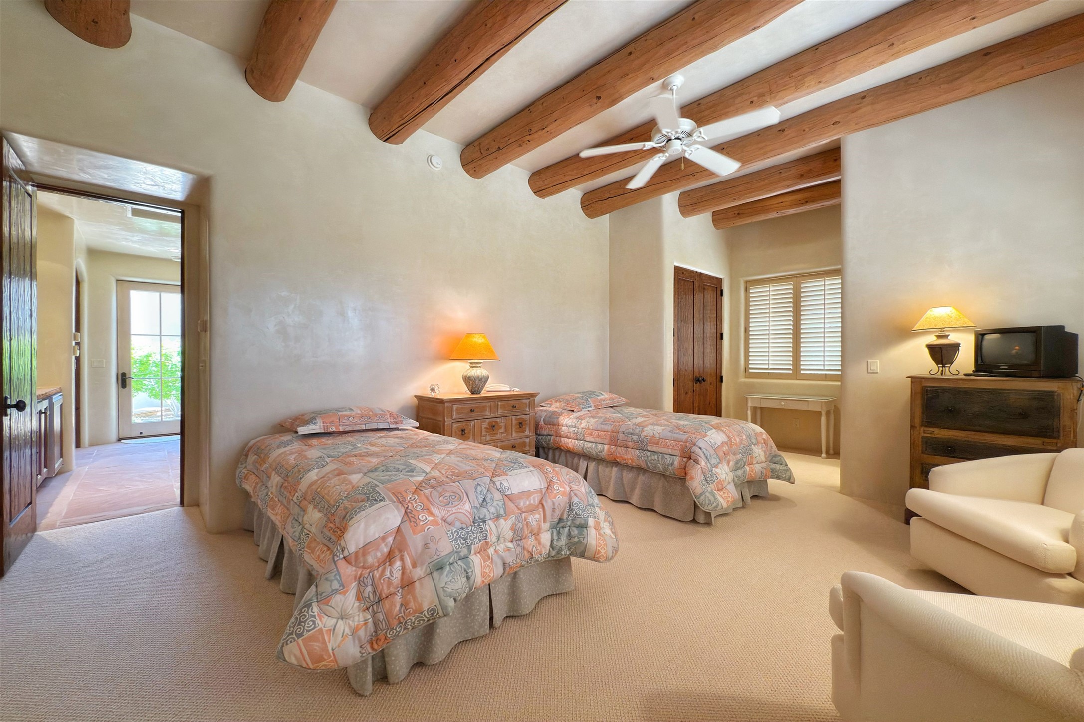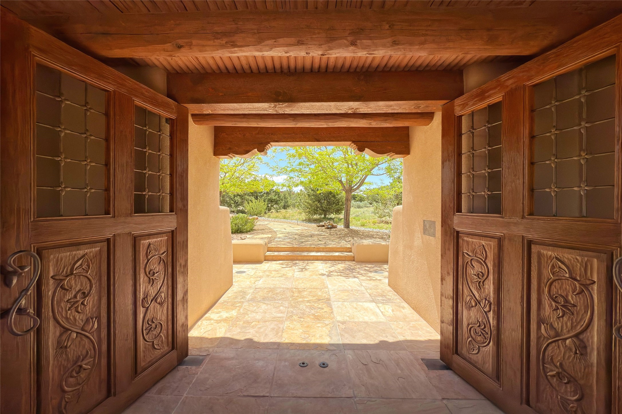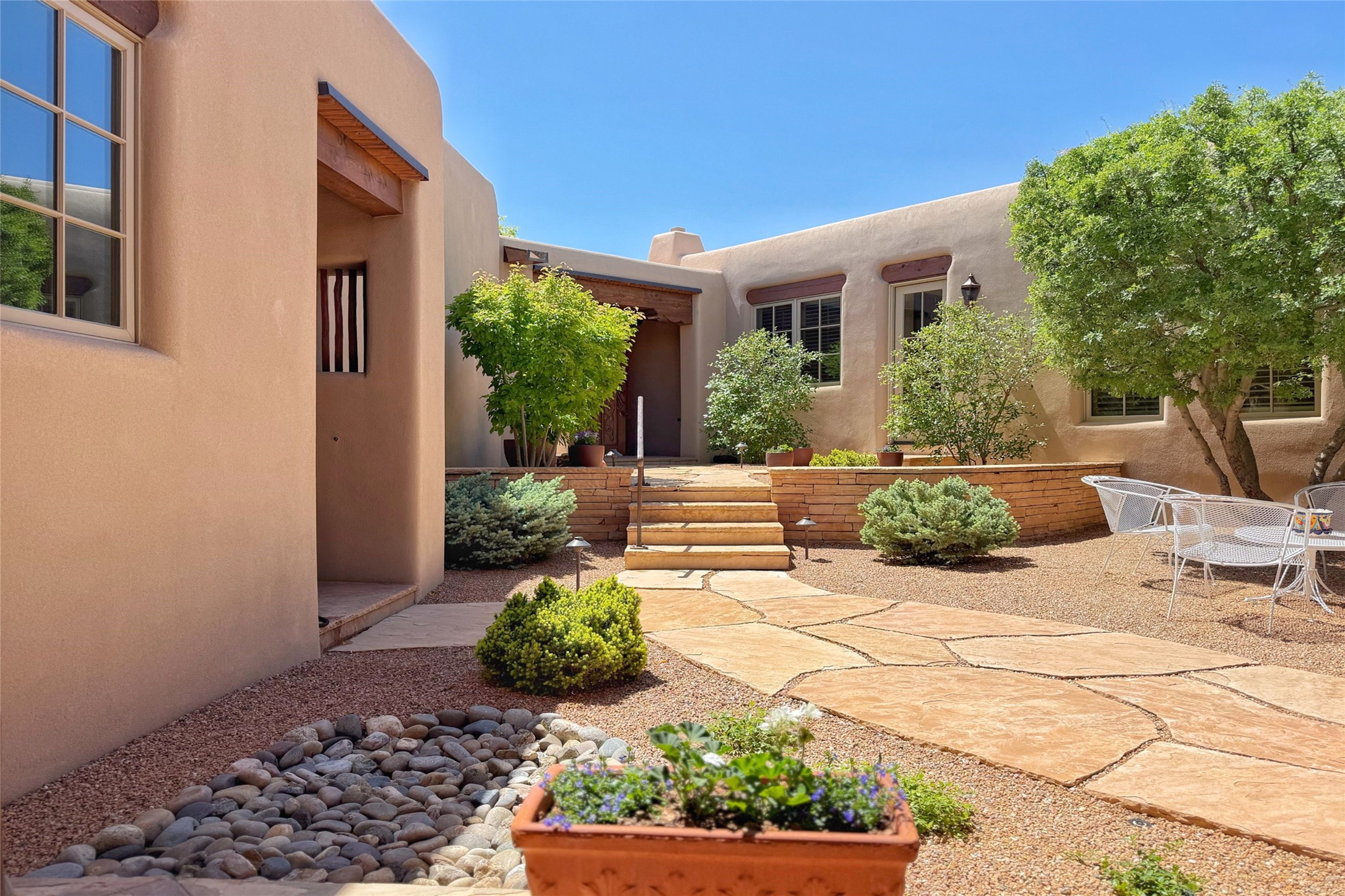 Sophisticated Country Estate with Panoramic Mountain Views in Prestigious Las Campanas.Discover unparalleled luxury in this meticulously crafted estate that seamlessly blends timeless elegance with regional architectural charm. Set within a private courtyard sanctuary surrounded by mature trees, this exceptional home offers breathtaking Jemez and Sangre de Cristo mountain vistas alongside Las Campanas golf course views.Enter through impressive carved alder double doors into soaring ceilings and rich woodwork throughout. The light-filled living room centers around a magnificent fireplace, perfectly framing mountain and golf course panoramas. Hickory wood floors add warmth while shuttered windows enhance the sophisticated country aesthetic.The chef's dream kitchen features a substantial island, granite countertops, and premium appliances ideal for culinary enthusiasts. The curved dining room showcases custom limestone floors, with stunning dual mountain range views leading to a tranquil portal with fireplace--perfect for morning coffee or evening cocktails.Retreat to the spacious primary suite featuring a private portal, mountain vistas, dual walk-in closets, and separate his-and-hers bathroom spaces. All four bathrooms in this home showcase custom decorative tile designed exclusively for this home by renowned Taos artist Jill Rounds.Additional Amenities include a dedicated study offering peaceful views, built-in shelving, and custom alder desk. Two generous guest en-suites share a convenient wet bar and courtyard access. Practical features include a spacious laundry room, kitchen office nook, and mudroom with ample storage. Multiple portal access points maximize indoor-outdoor living.Las Campanas provides 24-hour security and EMT services. Club memberships available for purchase upon approval.