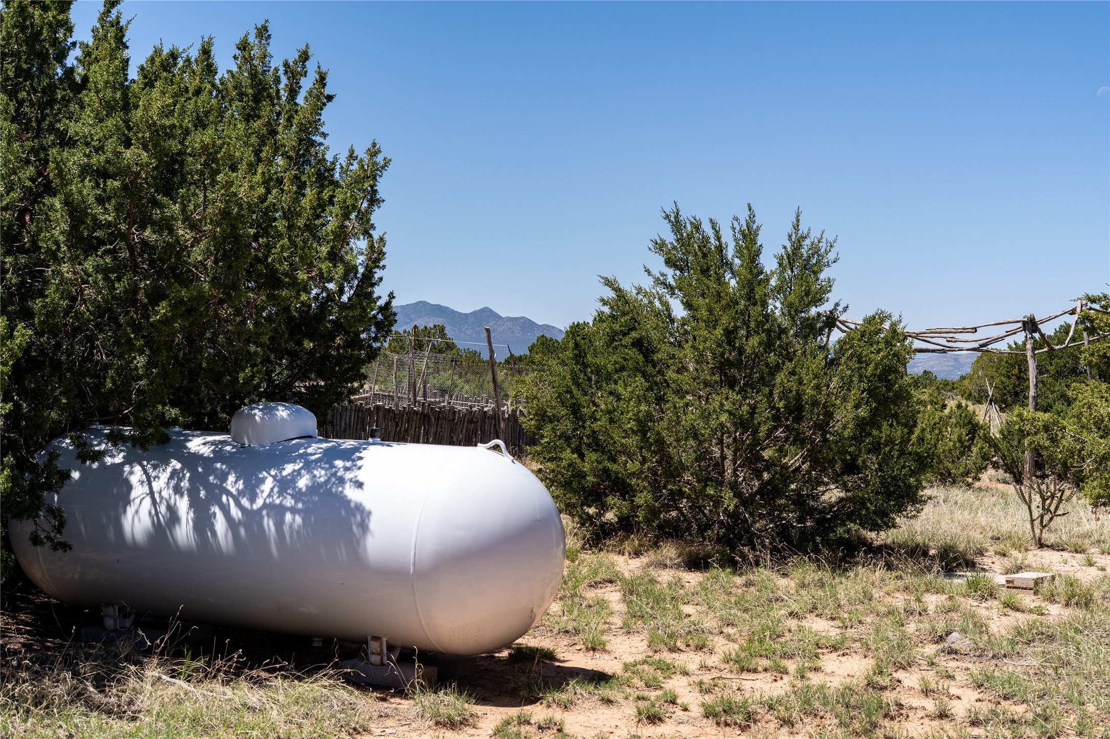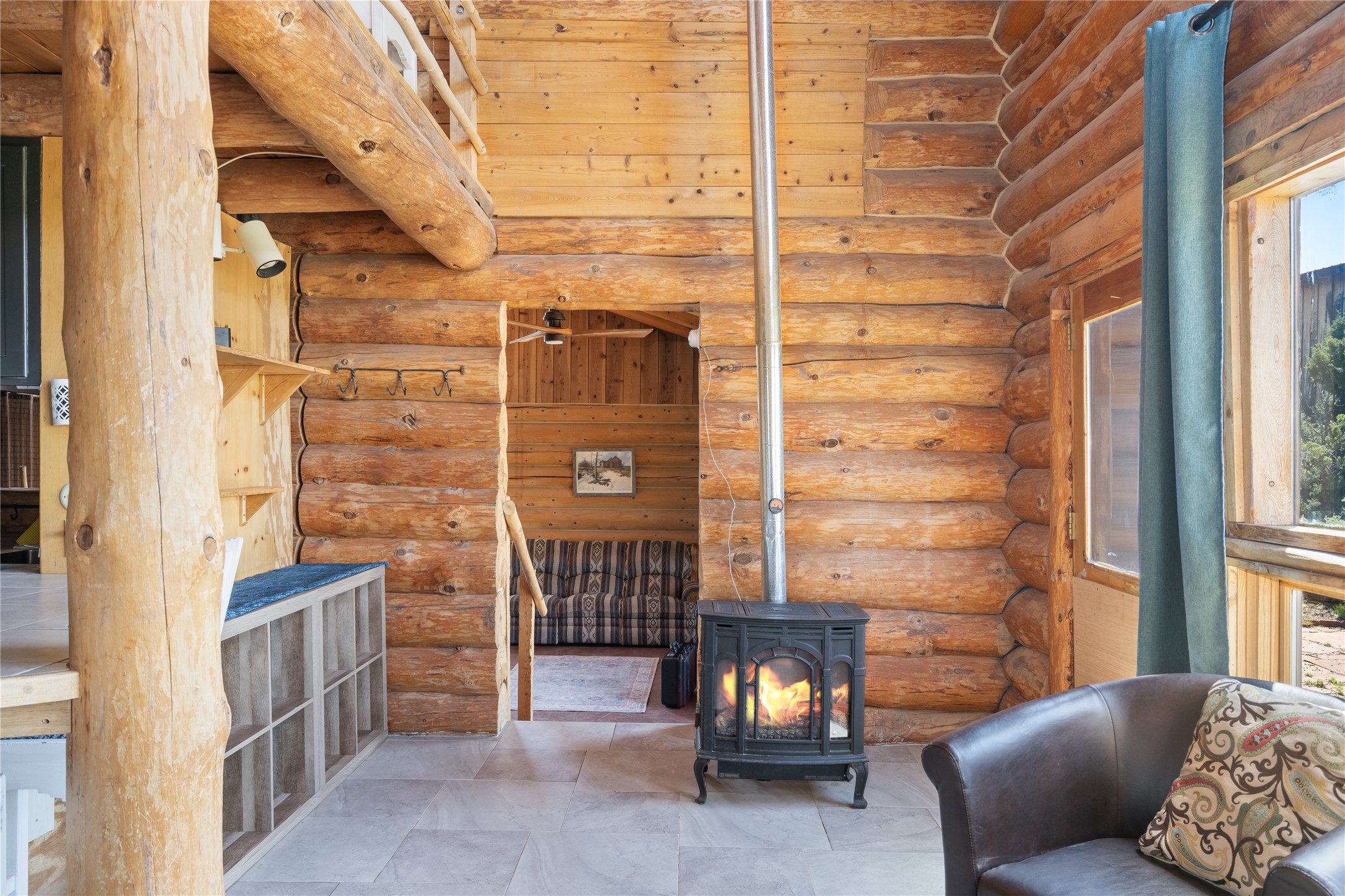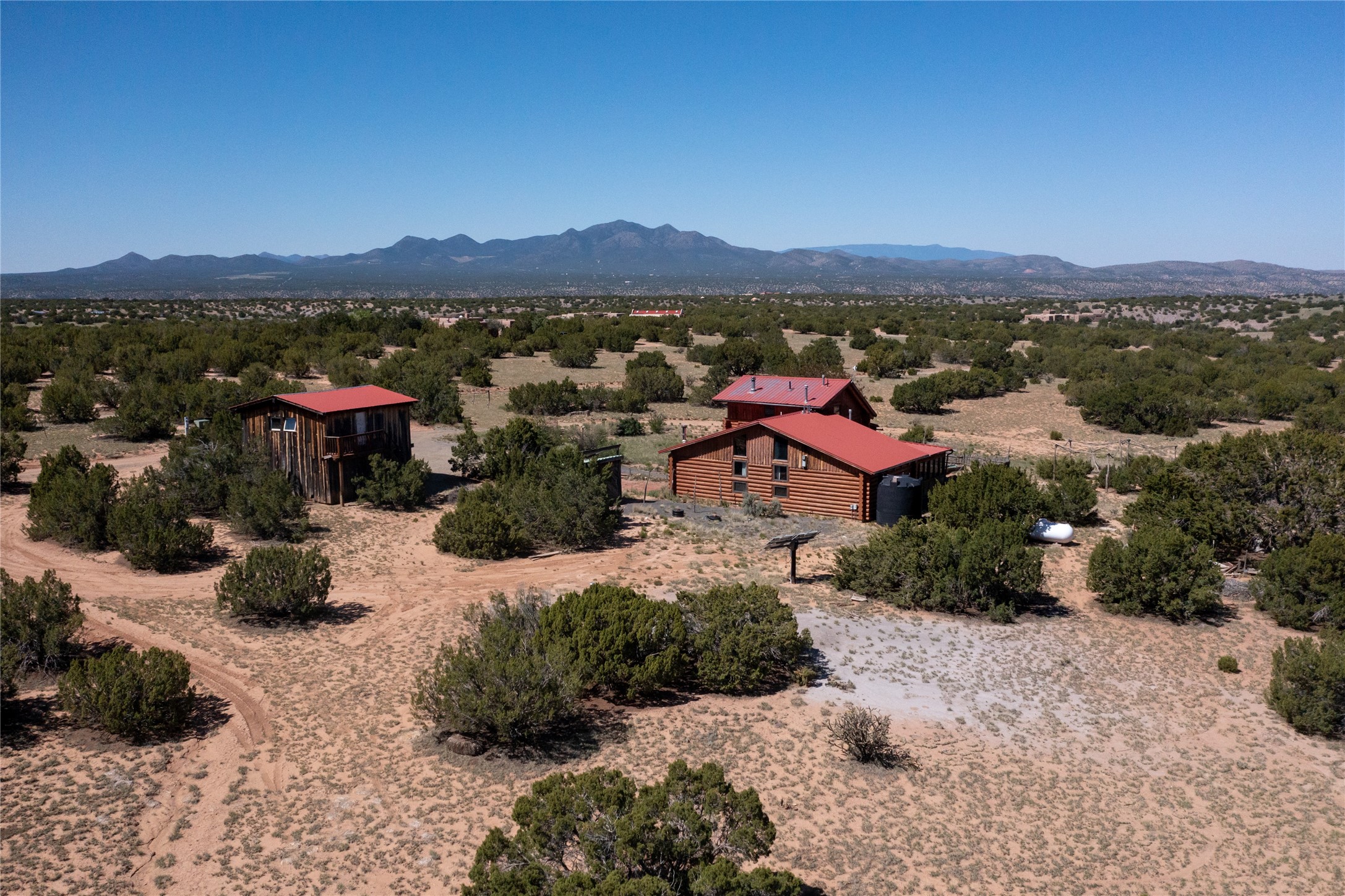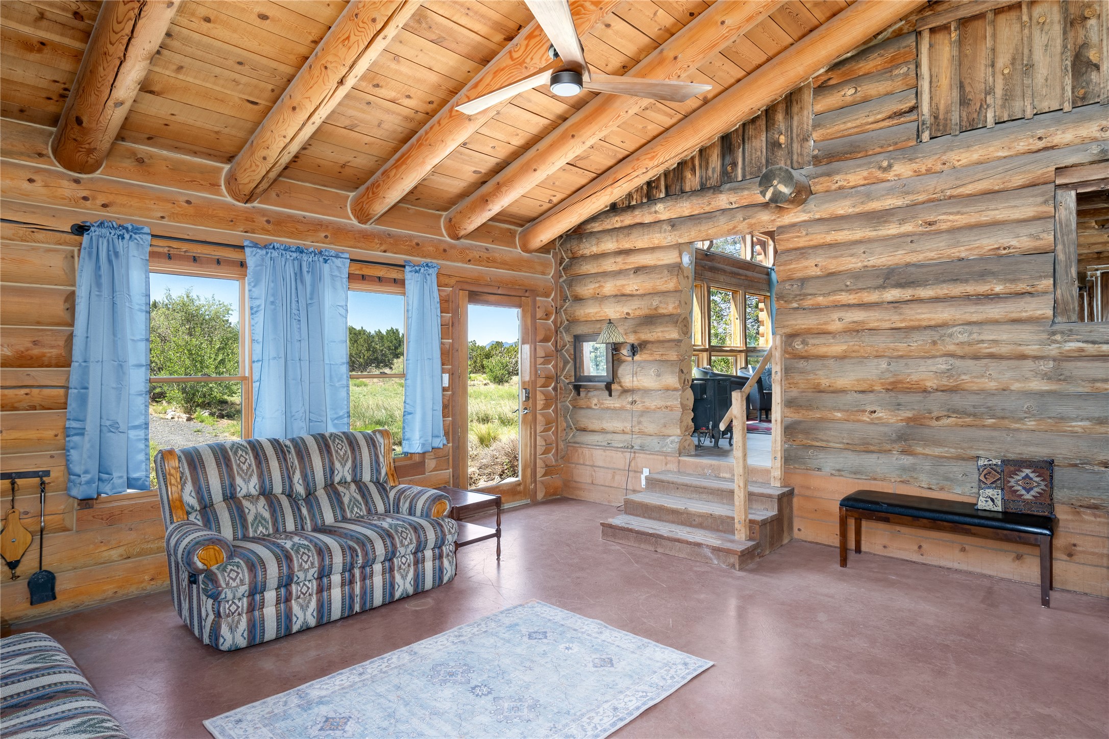 Escape to your private slice of the Wild West with this stunning 2-story, 2-bedroom, 2-bathroom true log cabin. Nestled on over 10 sprawling acres with an enviable address on the historic Camino Los Abuelos, this home is surrounded by wide open skies and rolling desert terrain, and enjoys paved road the whole way to the driveway.Step inside and enjoy the warmth of handcrafted log walls, soaring ceilings, and a cozy wood-burning stove. Downstairs, a well-appointed kitchen flows into 2 living spaces, the primary suite, and an unfinished sunroom. Upstairs, a spacious loft-style bedroom with its own 3/4 bath is perched, awaiting your southwestern accents.Whether you're sipping coffee on the porch, stargazing in the clear New Mexico skies, or exploring your very own high desert acreage, this home is a true retreat. Ideal for artists, adventurers, homesteaders, or anyone craving solitude and inspiration. Located within minutes of the San Marcos Feed Store and Beer Creek Brewery, and close enough to Santa Fe's rich culture, galleries, and cuisine--but far enough to enjoy peace, privacy, and panoramic views.