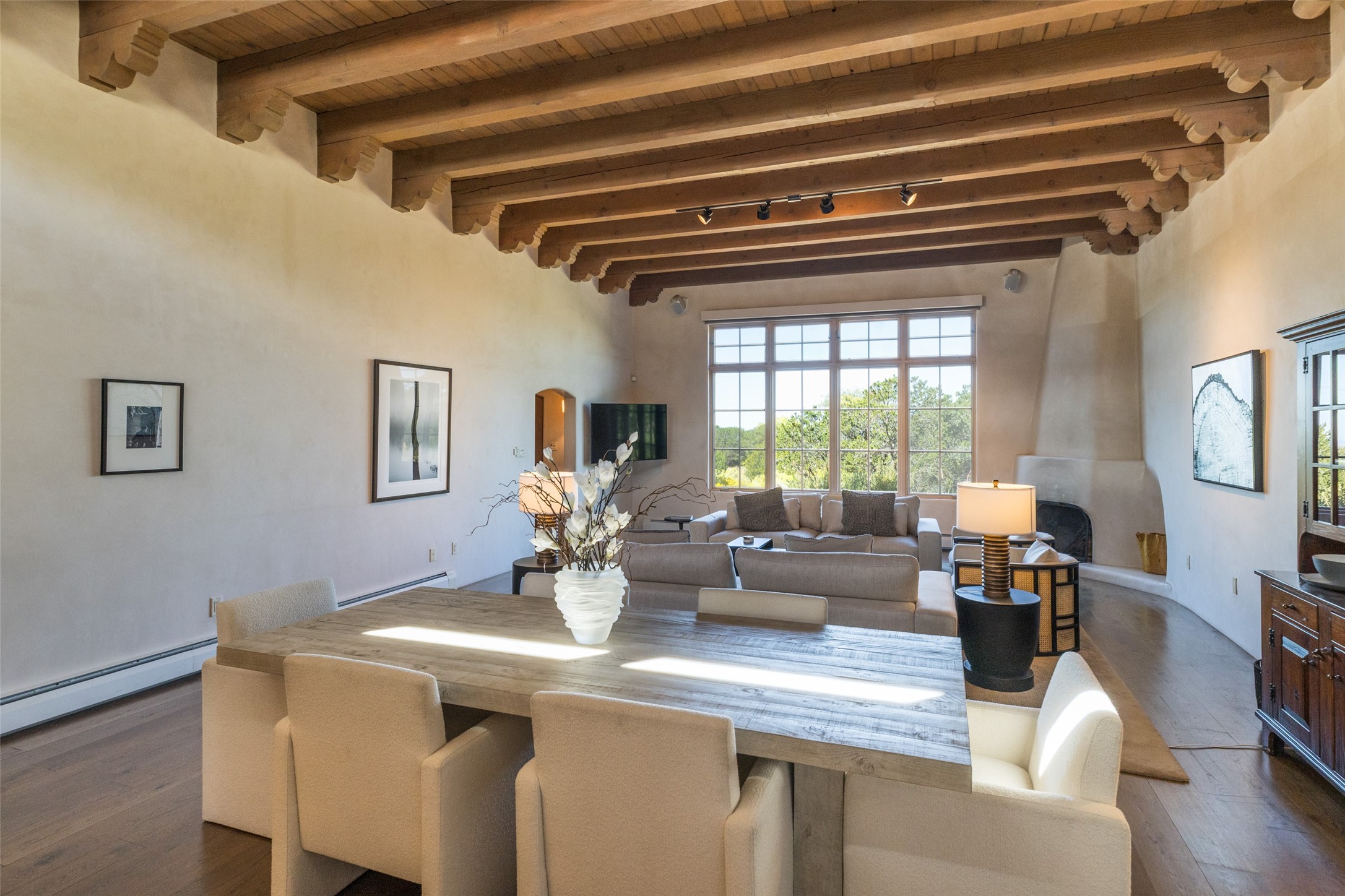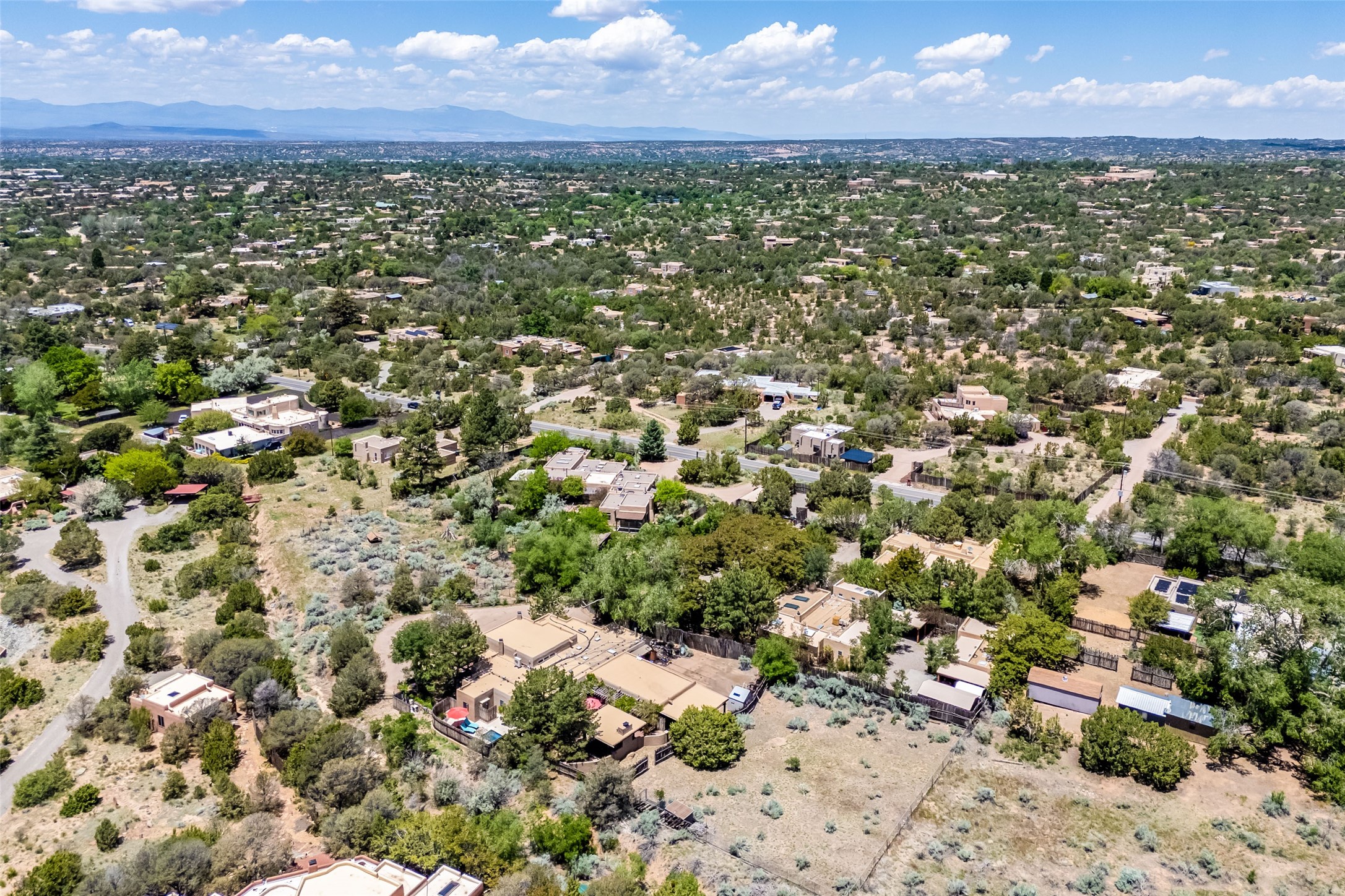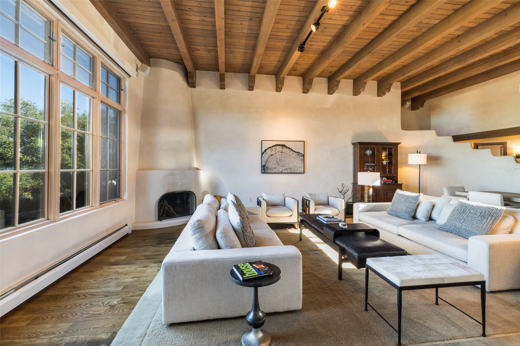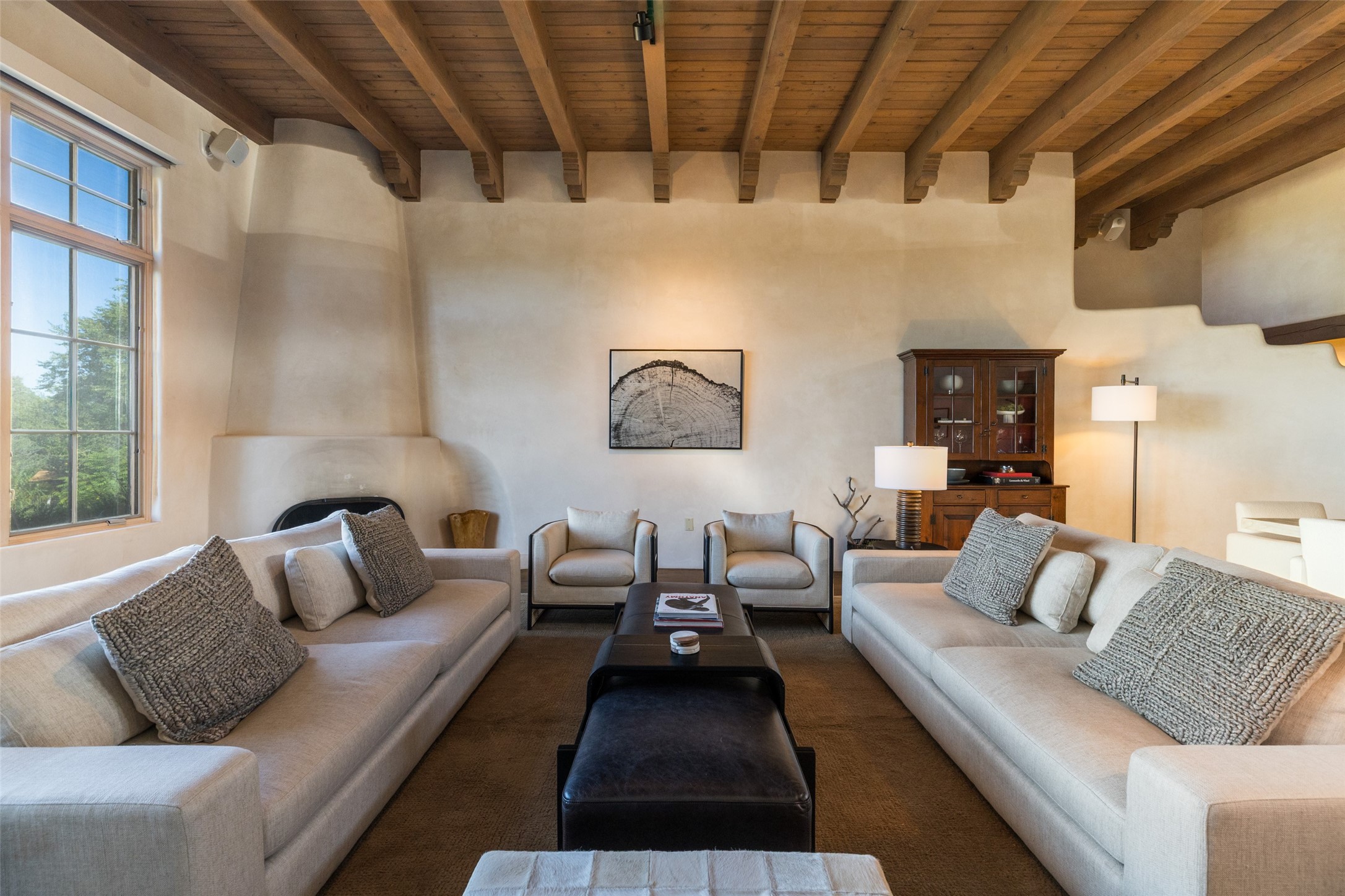 Built in 1983-84 by Grover/Ivey, nestled in the cherished Santa Fe Eastside, this home sits on a very private 1.045 acre parcel just off the Old Santa Fe Trail with magnificent East and West views of Sun & Moon Mountains as well as the Jemez Range, all but assuring the daily drama of powerful sunrise and sunset views. A very inviting and large living room immediately sets a gracious entertaining ambience with 12' ceilings, long elegant vigas and embossed corbels that are accented with a west facing picture window and accompanying corner kiva fireplace. A grand Chef's kitchen stands ready for friends and family equally providing outdoor access to a large terraced dining and media venue with a recently added (2022) heated plunge pool festive zone nearby!The house footprint (3,640 sq ft) includes three formal bedrooms (one being primary), two larger optional use suites for creative uses and needs, three and one half bathrooms surround these rooms with 3 interior Kiva fireplaces and one exterior stone fireplace surround for those Winter moments! The Primary bedroom has a newly renovated bathroom, shower, sink and closet installs by Lisa Samuel's Alchemy providing a nice Contemporary feel to the Owner quarters.Neighborhood access to E Zia Road as well as Old SF Trail provides quick & easy shopping, grocery, health care and athletic services. Sun Mountain Trailhead is 5 minutes away...and various local School possibilities are nearby. A Lifetime fiberglass storage shed with double door entry two skylights and fixed window convey on to Buyer at Closing. Should new Owner be wondering about a Casita possibility onsite, there is ample room to build eastwards in the open field subject to Historic Review District overlay approval. Mature and abundant landscaping is readily apparent throughout the property. Privacy and grace are signature features of this lovely distinguished home.