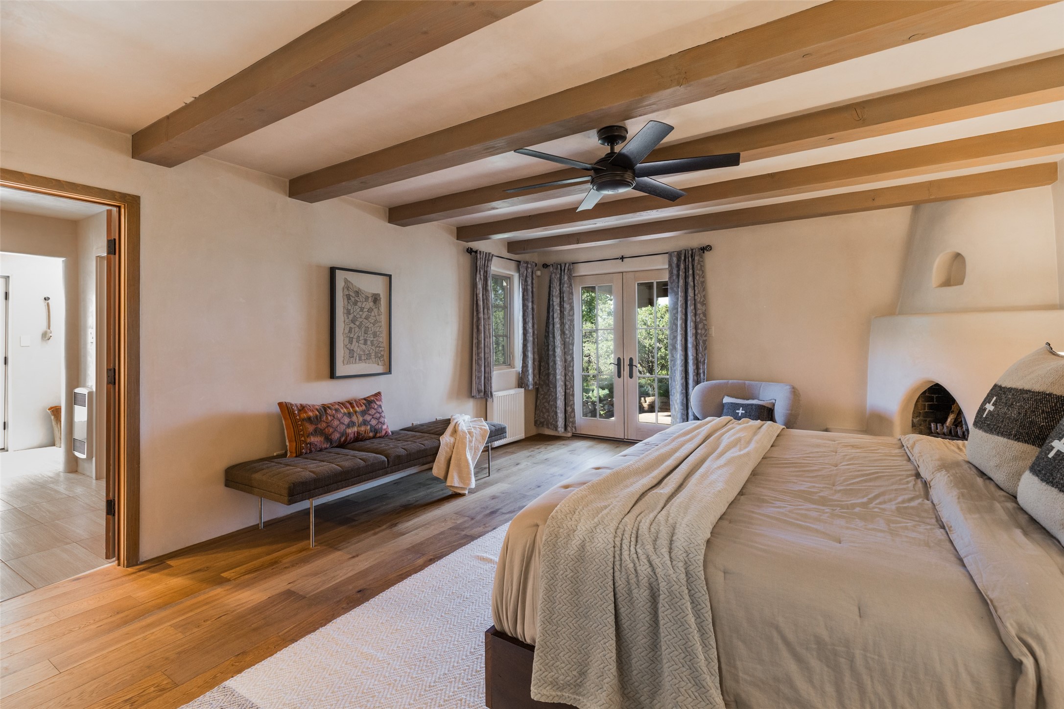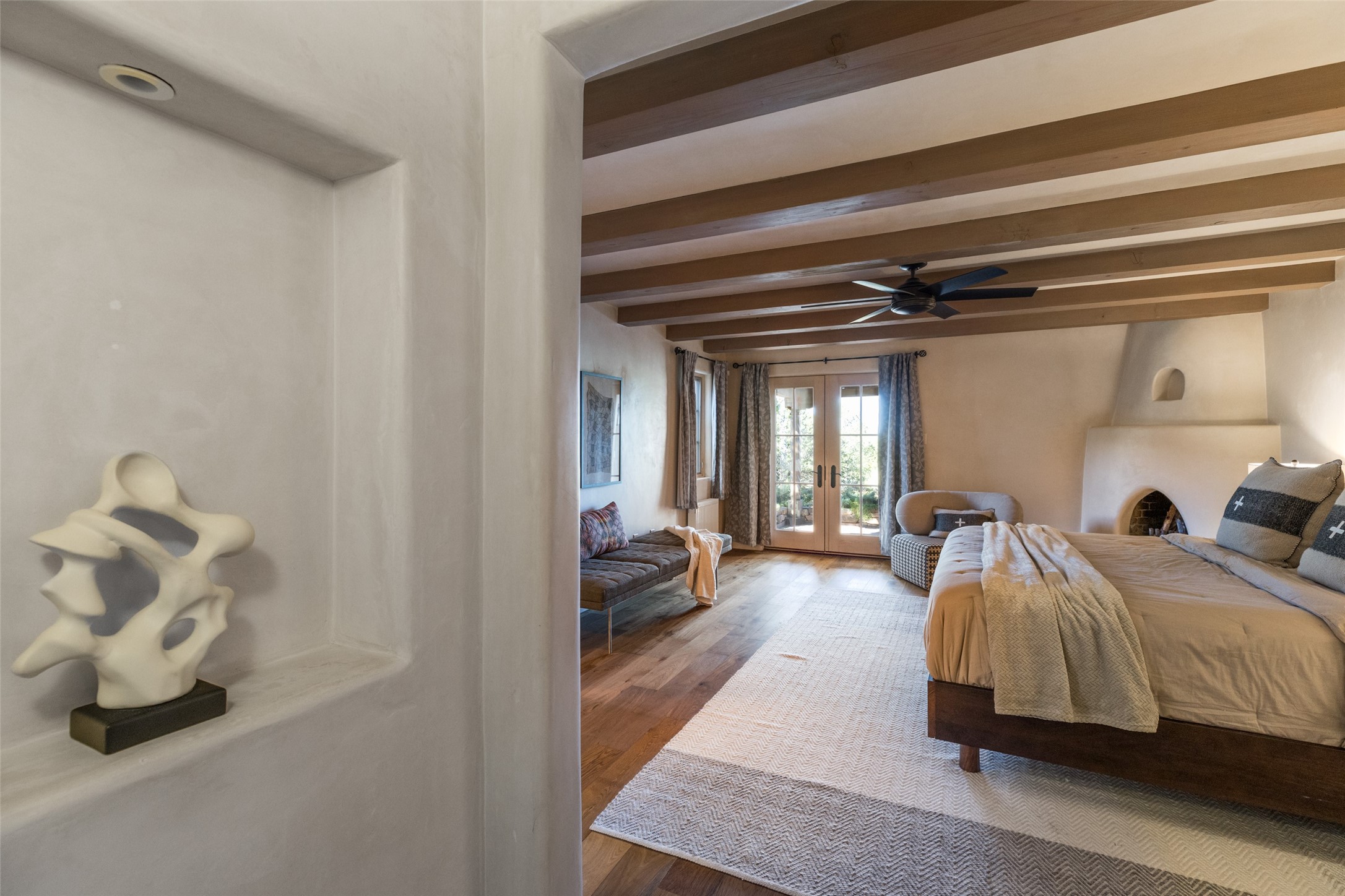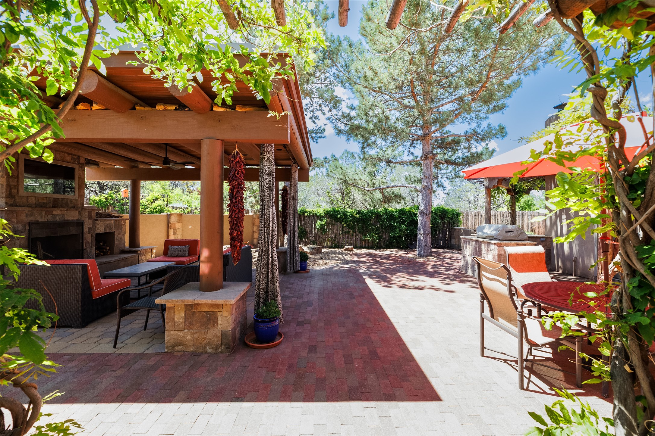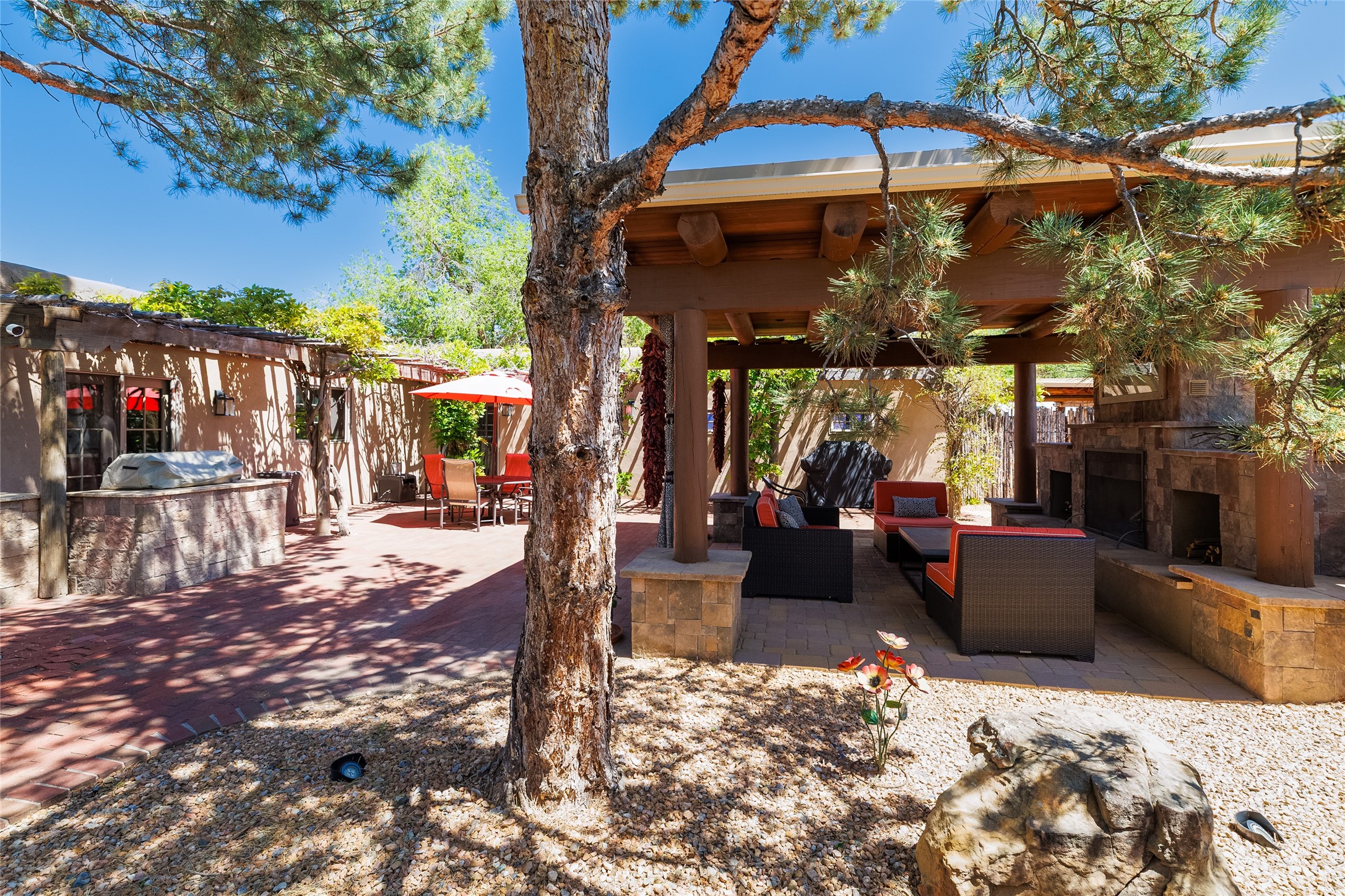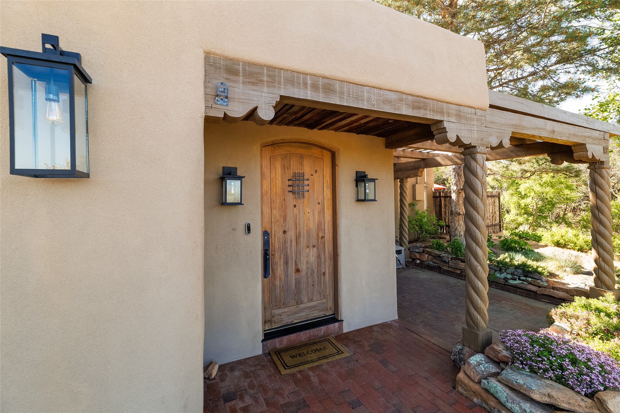 Built in 1983-84 by Grover/Ivey, nestled in the cherished Santa Fe Eastside, this home sits on a very private 1.045 acre parcel just off the Old Santa Fe Trail with magnificent East and West views of Sun & Moon Mountains as well as the Jemez Range, all but assuring the daily drama of powerful sunrise and sunset views. A very inviting and large living room immediately sets a gracious entertaining ambience with 12' ceilings, long elegant vigas and embossed corbels that are accented with a west facing picture window and accompanying corner kiva fireplace. A grand Chef's kitchen stands ready for friends and family equally providing outdoor access to a large terraced dining and media venue with a recently added (2022) heated plunge pool festive zone nearby!The house footprint (3,640 sq ft) includes three formal bedrooms (one being primary), two larger optional use suites for creative uses and needs, three and one half bathrooms surround these rooms with 3 interior Kiva fireplaces and one exterior stone fireplace surround for those Winter moments! The Primary bedroom has a newly renovated bathroom, shower, sink and closet installs by Lisa Samuel's Alchemy providing a nice Contemporary feel to the Owner quarters.Neighborhood access to E Zia Road as well as Old SF Trail provides quick & easy shopping, grocery, health care and athletic services. Sun Mountain Trailhead is 5 minutes away...and various local School possibilities are nearby. A Lifetime fiberglass storage shed with double door entry two skylights and fixed window convey on to Buyer at Closing. Should new Owner be wondering about a Casita possibility onsite, there is ample room to build eastwards in the open field subject to Historic Review District overlay approval. Mature and abundant landscaping is readily apparent throughout the property. Privacy and grace are signature features of this lovely distinguished home.
