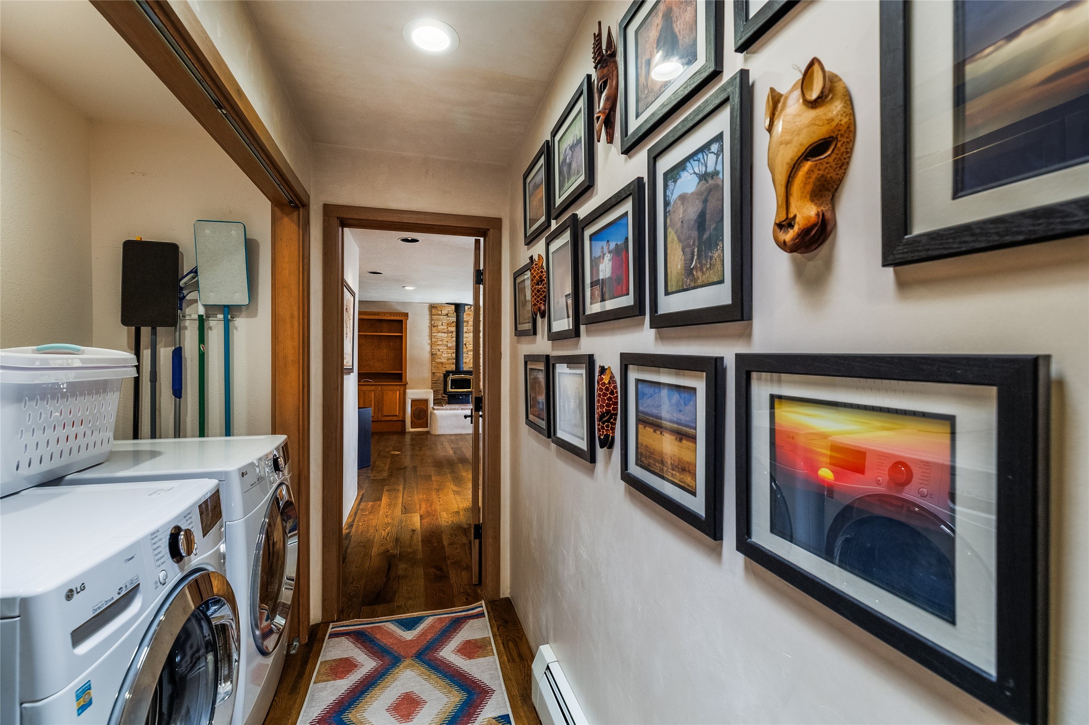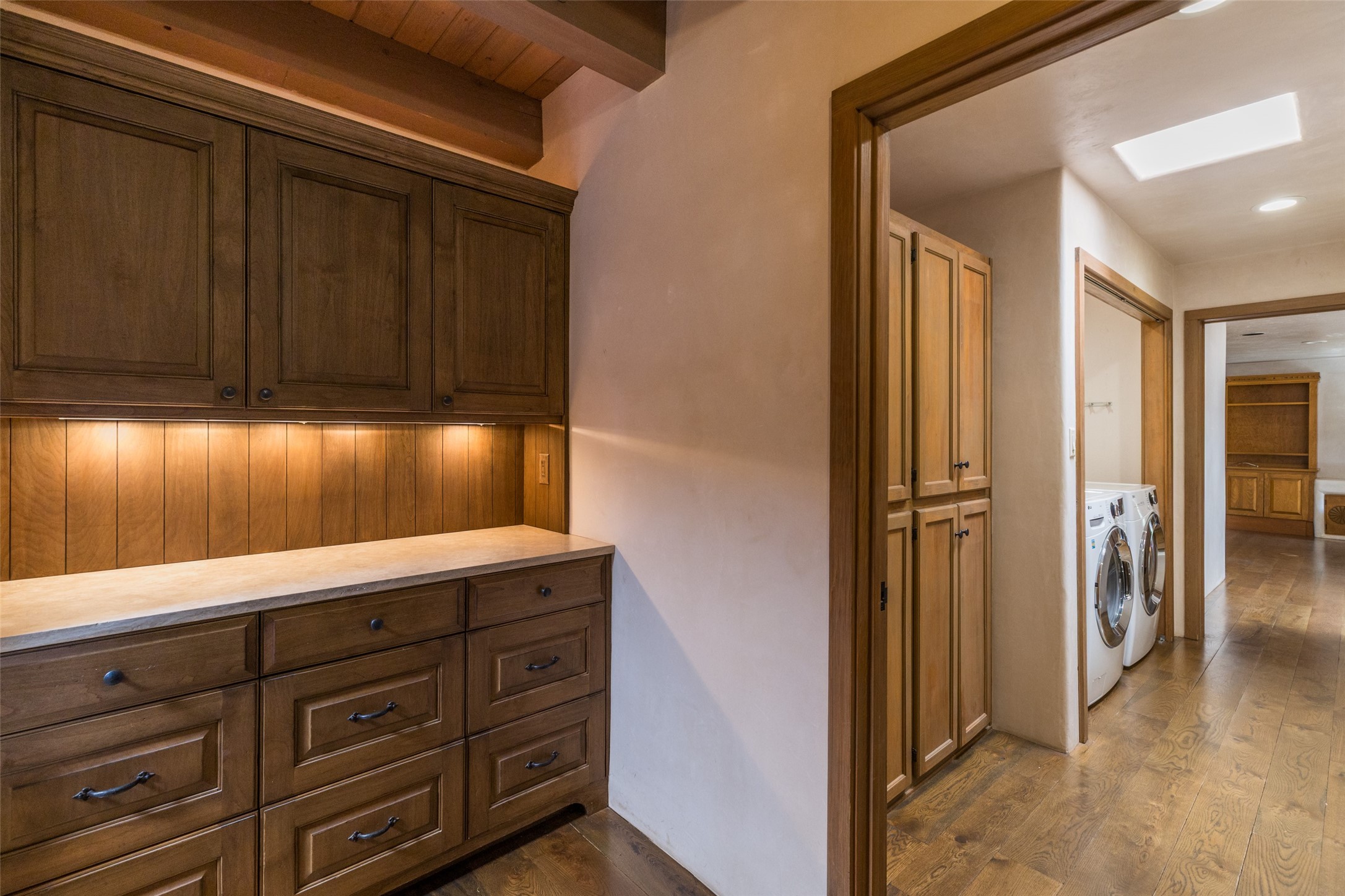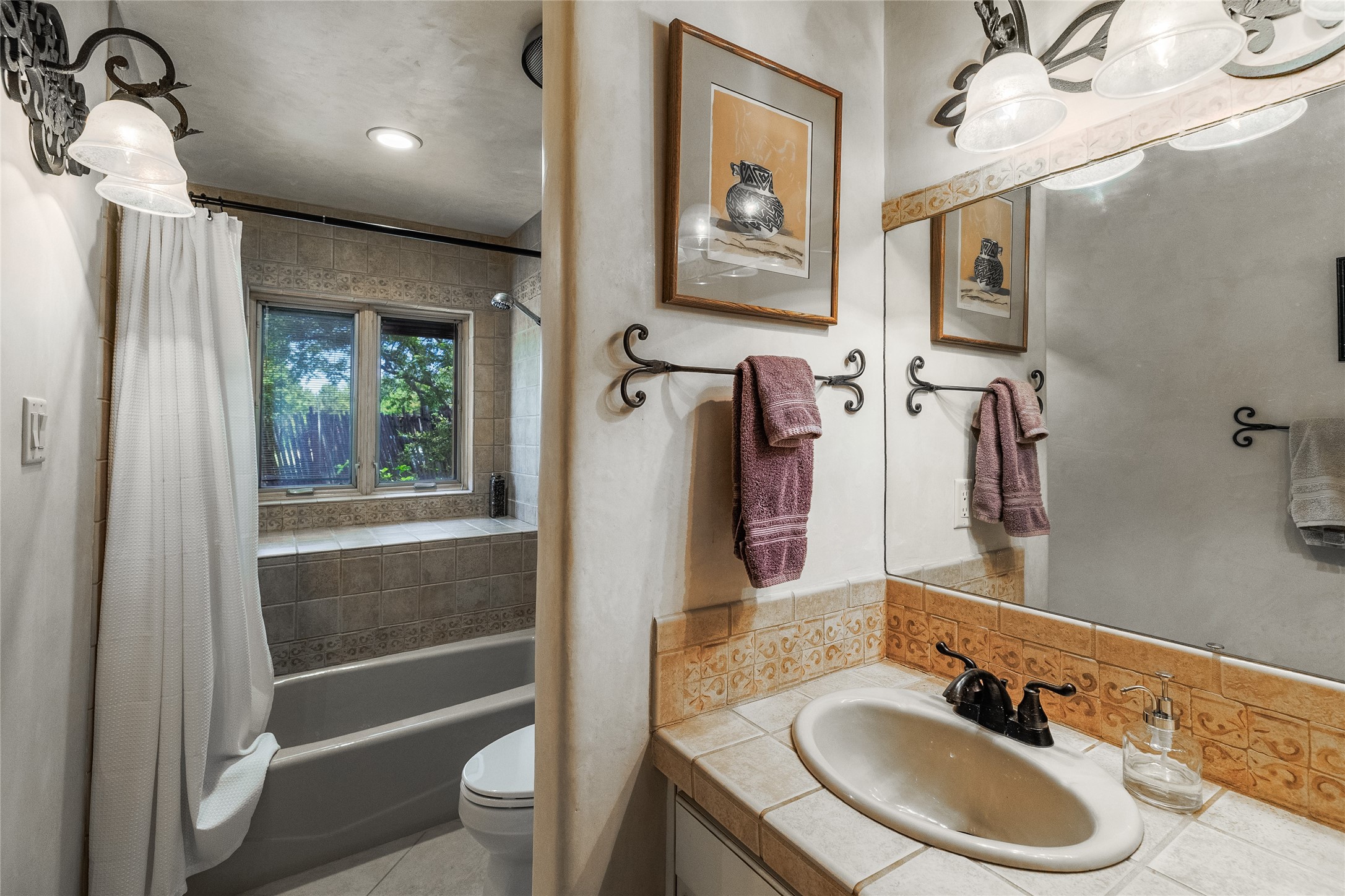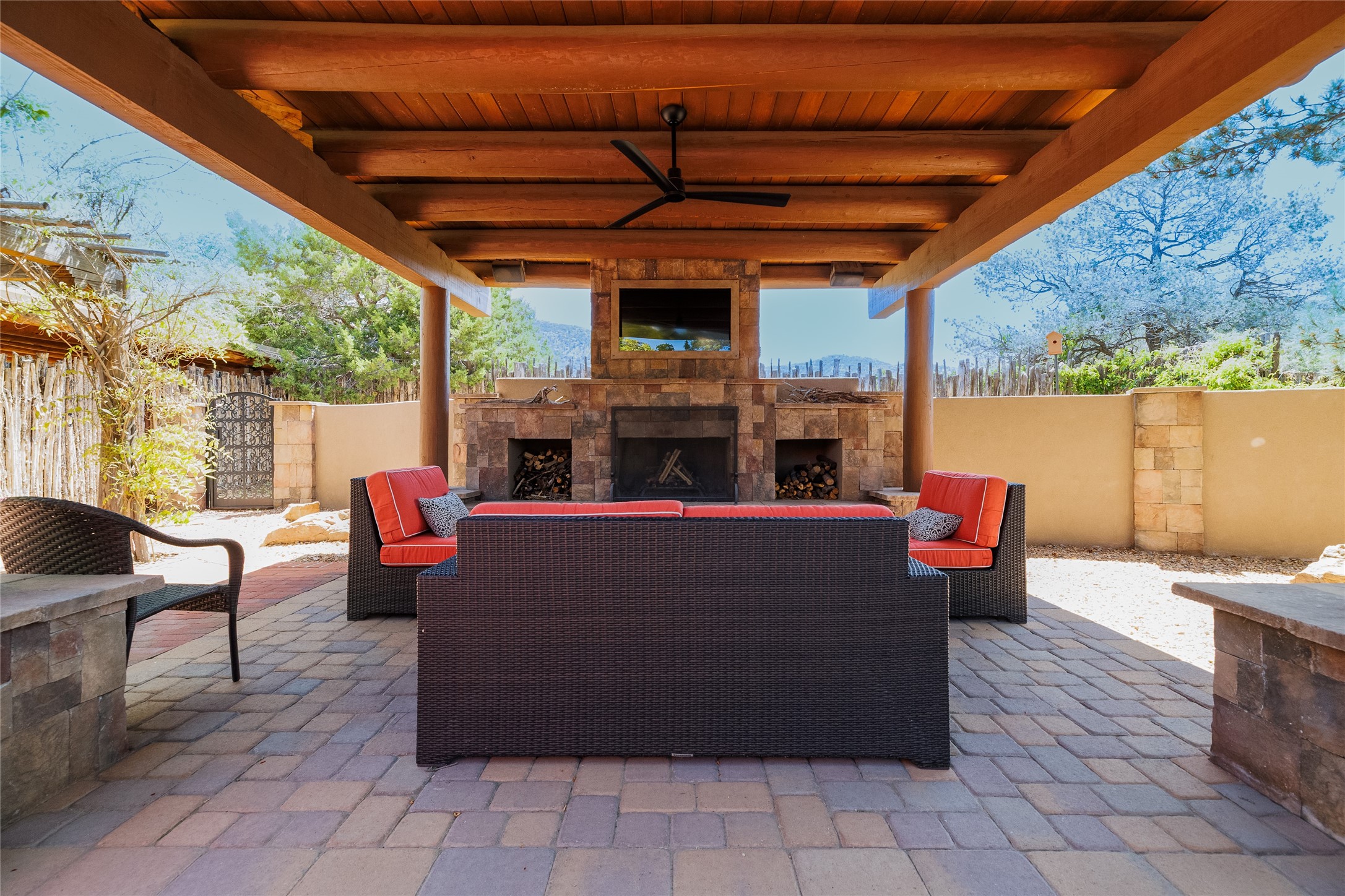 Built in 1983-84 by Grover/Ivey, nestled in the cherished Santa Fe Eastside, this home sits on a very private 1.045 acre parcel just off the Old Santa Fe Trail with magnificent East and West views of Sun & Moon Mountains as well as the Jemez Range, all but assuring the daily drama of powerful sunrise and sunset views. A very inviting and large living room immediately sets a gracious entertaining ambience with 12' ceilings, long elegant vigas and embossed corbels that are accented with a west facing picture window and accompanying corner kiva fireplace. A grand Chef's kitchen stands ready for friends and family equally providing outdoor access to a large terraced dining and media venue with a recently added (2022) heated plunge pool festive zone nearby!The house footprint (3,640 sq ft) includes three formal bedrooms (one being primary), two larger optional use suites for creative uses and needs, three and one half bathrooms surround these rooms with 3 interior Kiva fireplaces and one exterior stone fireplace surround for those Winter moments! The Primary bedroom has a newly renovated bathroom, shower, sink and closet installs by Lisa Samuel's Alchemy providing a nice Contemporary feel to the Owner quarters.Neighborhood access to E Zia Road as well as Old SF Trail provides quick & easy shopping, grocery, health care and athletic services. Sun Mountain Trailhead is 5 minutes away...and various local School possibilities are nearby. A Lifetime fiberglass storage shed with double door entry two skylights and fixed window convey on to Buyer at Closing. Should new Owner be wondering about a Casita possibility onsite, there is ample room to build eastwards in the open field subject to Historic Review District overlay approval. Mature and abundant landscaping is readily apparent throughout the property. Privacy and grace are signature features of this lovely distinguished home.