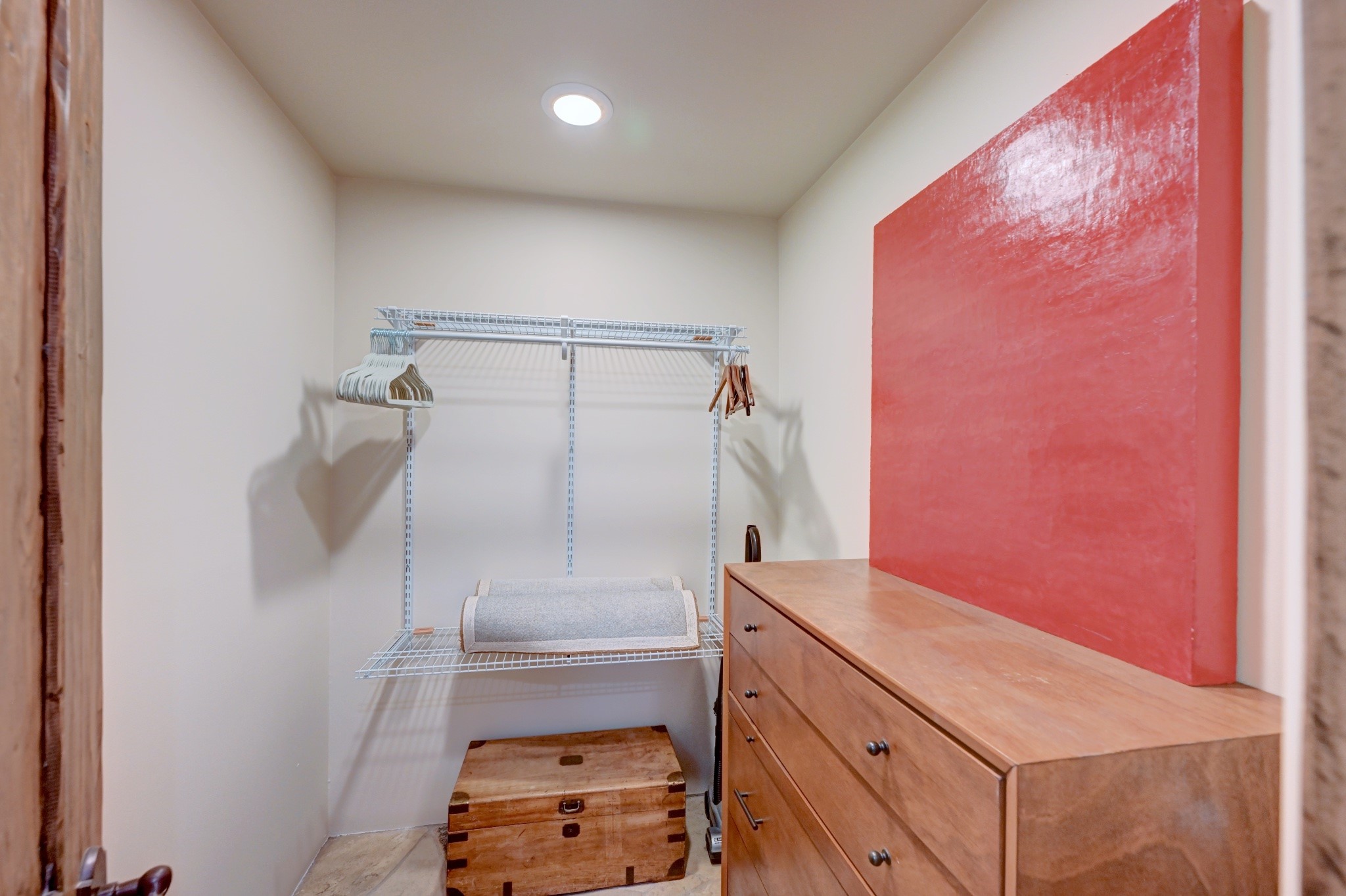 Nestled in the heart of Santa Fe's coveted historic Eastside and located off of Gonzales Rd, this elegant condo captures the essence of Southwestern living. Just a short walk from the famed Canyon Road art district, you'll find yourself perfectly positioned to enjoy the city's rich culture. Step inside to discover authentic Santa Fe style throughout this 1,352 +/- square foot retreat within a two-condo development. Admire beautiful beam and wood-plank ceilings, while gorgeous hand-hewn flagstone floors ground the space in traditional craftsmanship. The well-appointed cook's kitchen flows seamlessly into the living and dining areas, featuring thoughtful touches like a two-drawer dishwasher, convenient pot-filler, and a microwave drawer. Unwind by the kiva fireplace in the living room or step outside to your enchanting garden. This outdoor oasis boasts a hand-stacked rock wall, carved Buddha wooden gate, large, mature Wisteria vine and a soothing fountain surrounded by two distinct seating areas--all beautifully landscaped for easy care. Upstairs, the primary bedroom suite offers a private deck with lovely views, plus an ensuite bathroom featuring a double sink vanity, large soaking tub, and luxurious steam shower. Artistic details abound throughout, from wrought iron stair rails and light fixtures to hand painting on a nicho and fireplace. A charming wooden door with hand-painted Santos leads to the second bedroom, which doubles perfectly as a home office. Every room showcases custom cabinetry, doors, and true divided-light windows. Modern comforts include radiant in-floor heating, ductless mini-splits for cooling comfort, and a new tankless hot water heater. One dedicated parking space completes this package. Located minutes from Canyon Road's galleries, world renown restaurants and the Santa Fe Plaza's downtown attractions, this condo offers both convenience and tranquility. Whether as your Santa Fe pied--terre or full-time residence, this lock-and-leave lifestyle puts the best of The City Different at your doorstep. Please see the Matterport 3-D walkthrough in the listing. An extensive furniture package is available for purchase separately.