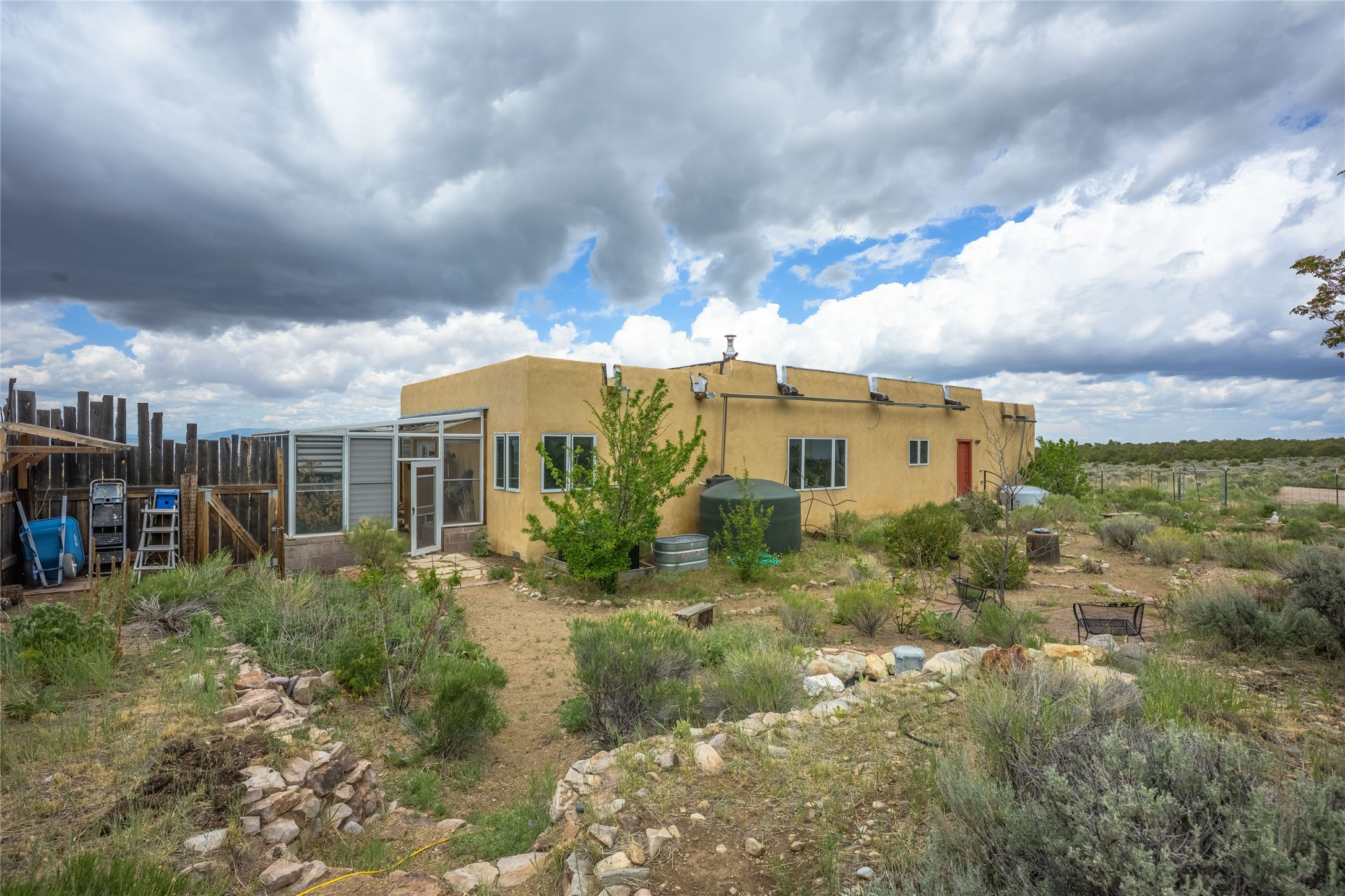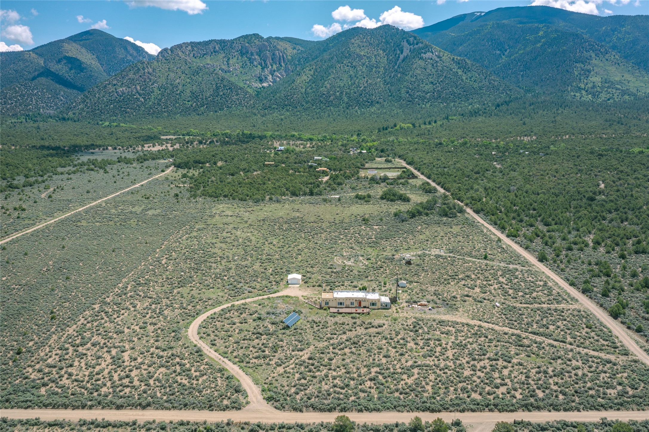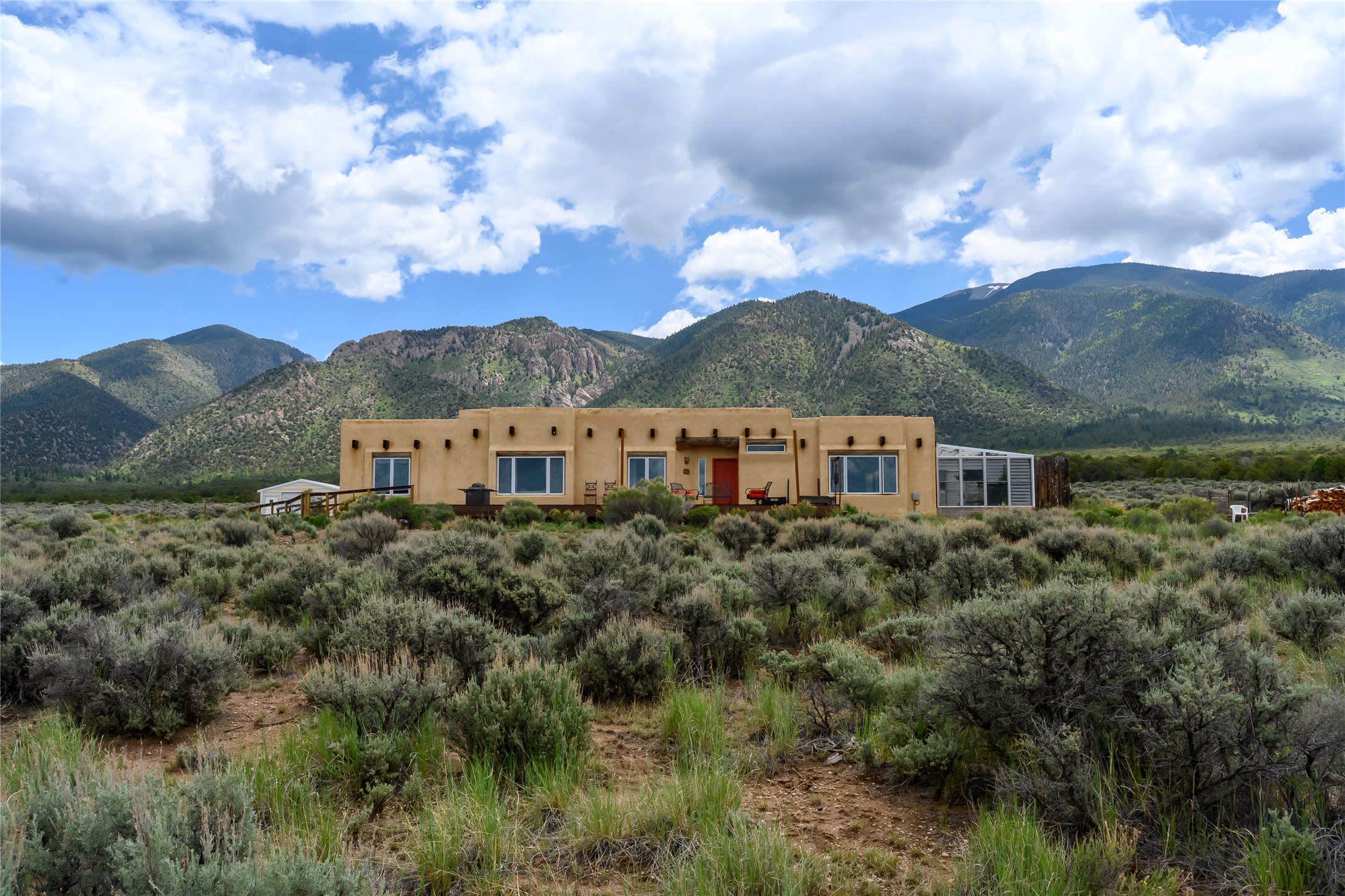 Escape to 8 acres of unparalleled solitude and serenity at the base of the stunning Latir cliffs. This unique property, located just north of Questa in the heart of the famous Taos sage, offers profound peace with breathtaking views in every direction. Greet the day with sunrise over the Latirs to the east and enjoy expansive views of Ute Mountain and San Antonio Mountain to the north.This well-maintained, single-level home is designed for comfort and sustainability. A photovoltaic solar array provides backup to your most essential conveniences, and a private well is complemented by an extensive water catchment system that nourishes fruit trees and gardens.Inside, the home is flooded with natural light, with views from every window. The fairly open living, kitchen, and dining areas offer a sense of connection while maintaining a separation of space. A welcoming indoor planter greets you at the entry, and a cozy kiva fireplace with an insert anchors the living area.The 3-bedroom, 2-bathroom layout includes a master suite with a unique greenhouse, providing passive solar heat and a beautiful wash of natural light.Step outside onto the large deck to witness spectacular sunsets over the vast Taos Mesa and Cerro de la Olla to the west. A detached garage provides ample space for vehicles and storage. Experience true tranquility in this thoughtfully designed 1996 off-site built home, where sustainable living meets the raw beauty of Northern New Mexico.