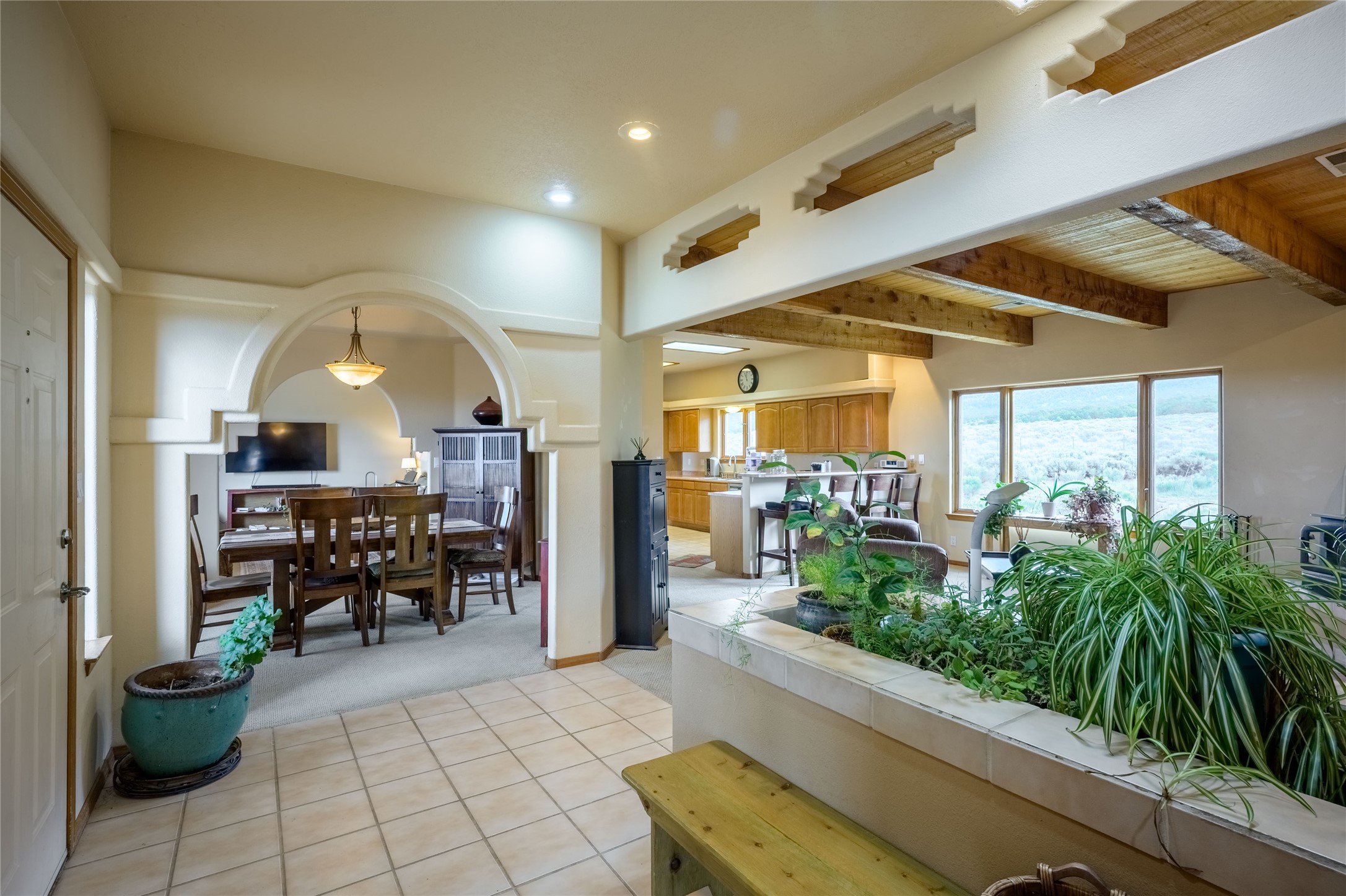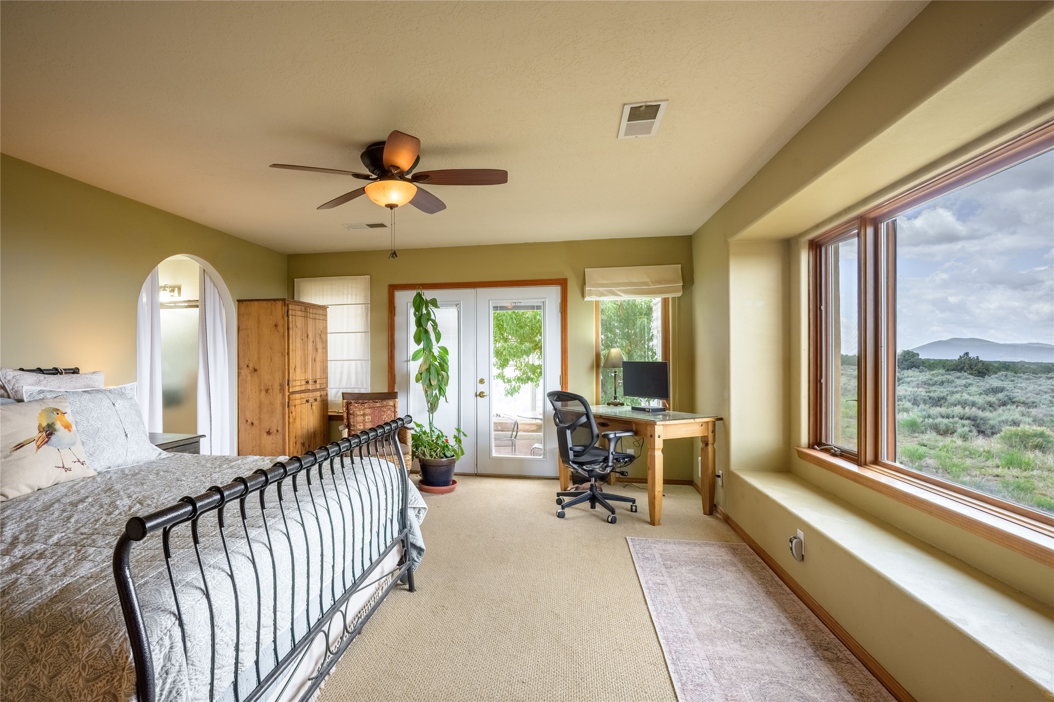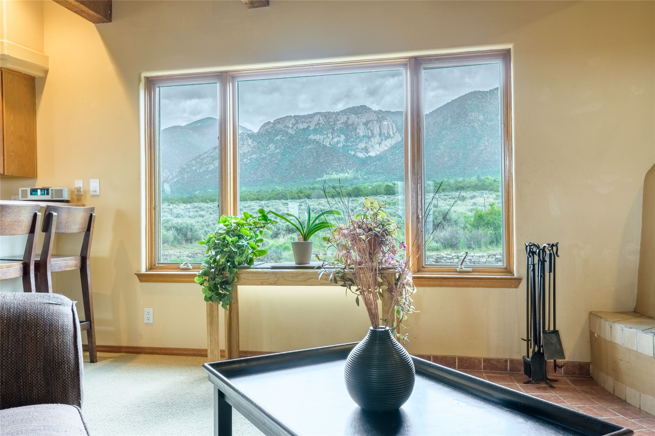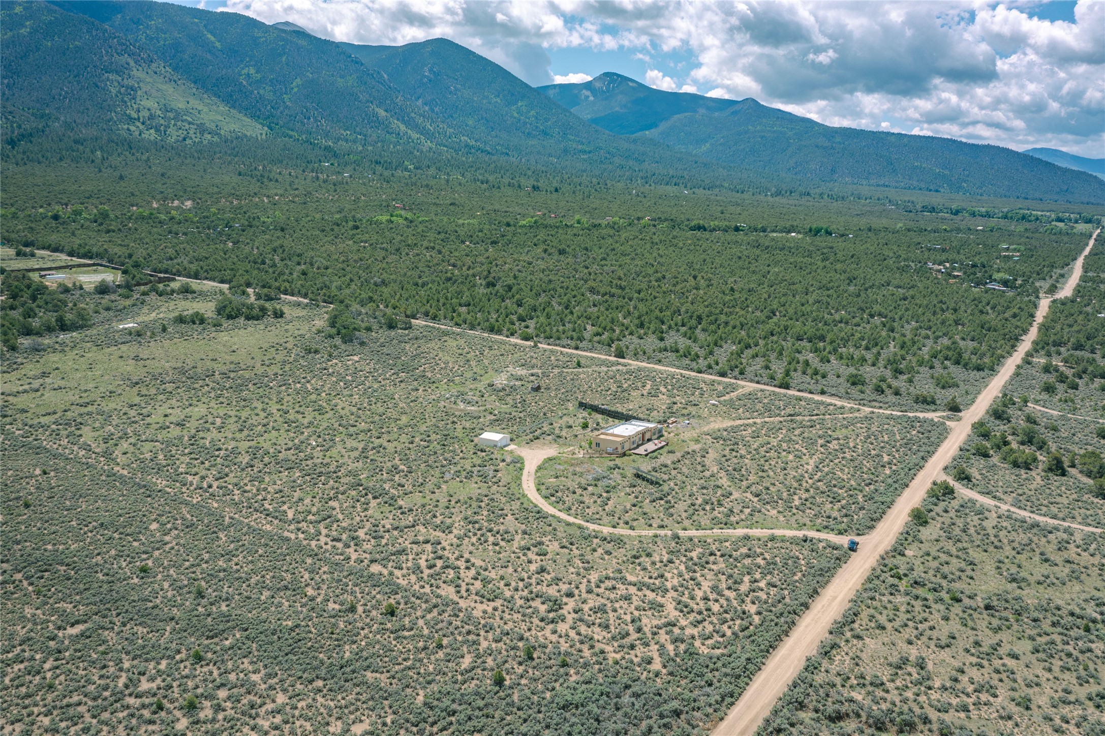 Escape to 8 acres of unparalleled solitude and serenity at the base of the stunning Latir cliffs. This unique property, located just north of Questa in the heart of the famous Taos sage, offers profound peace with breathtaking views in every direction. Greet the day with sunrise over the Latirs to the east and enjoy expansive views of Ute Mountain and San Antonio Mountain to the north.This well-maintained, single-level home is designed for comfort and sustainability. A photovoltaic solar array provides backup to your most essential conveniences, and a private well is complemented by an extensive water catchment system that nourishes fruit trees and gardens.Inside, the home is flooded with natural light, with views from every window. The fairly open living, kitchen, and dining areas offer a sense of connection while maintaining a separation of space. A welcoming indoor planter greets you at the entry, and a cozy kiva fireplace with an insert anchors the living area.The 3-bedroom, 2-bathroom layout includes a master suite with a unique greenhouse, providing passive solar heat and a beautiful wash of natural light.Step outside onto the large deck to witness spectacular sunsets over the vast Taos Mesa and Cerro de la Olla to the west. A detached garage provides ample space for vehicles and storage. Experience true tranquility in this thoughtfully designed 1996 off-site built home, where sustainable living meets the raw beauty of Northern New Mexico.
