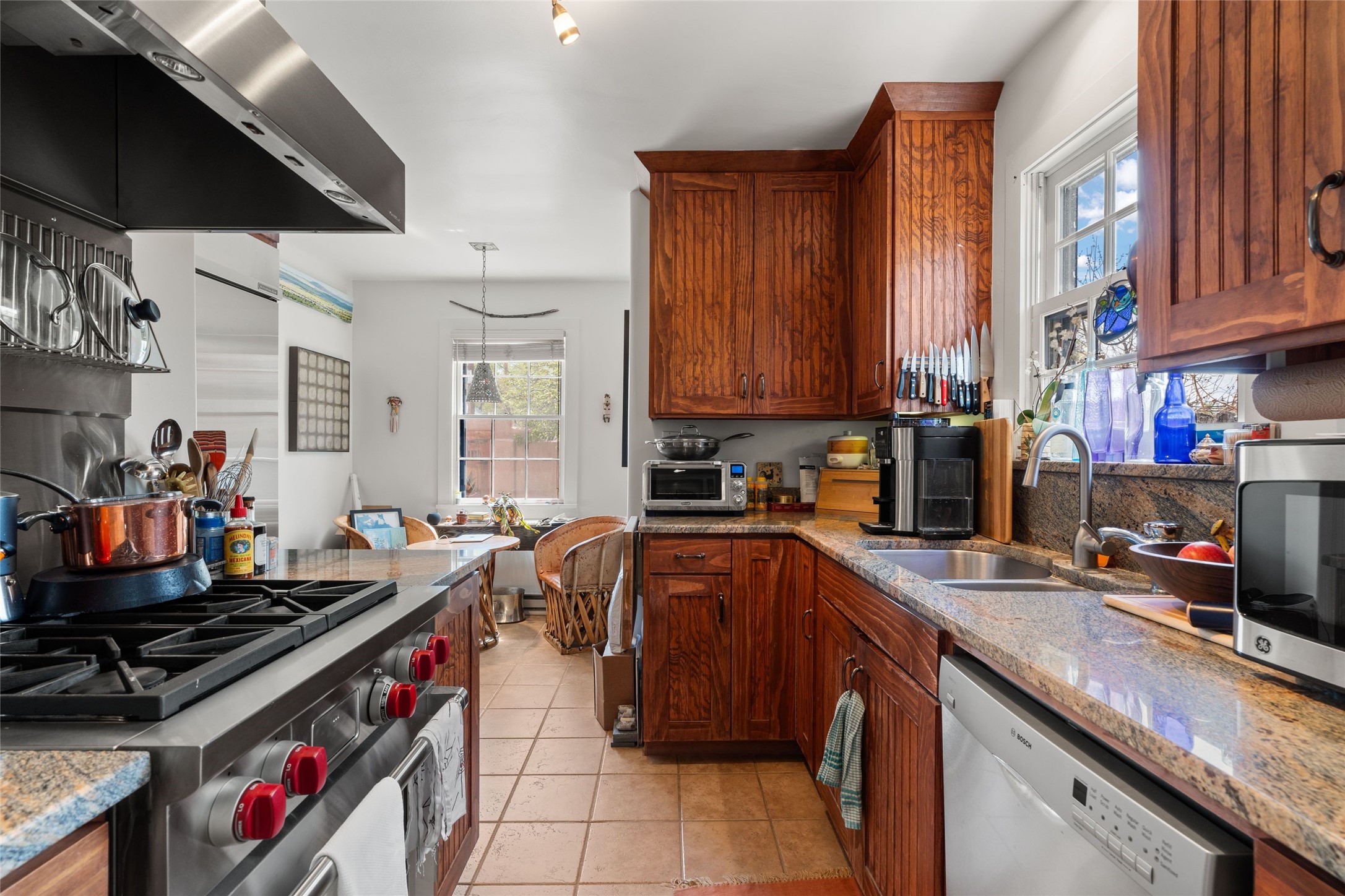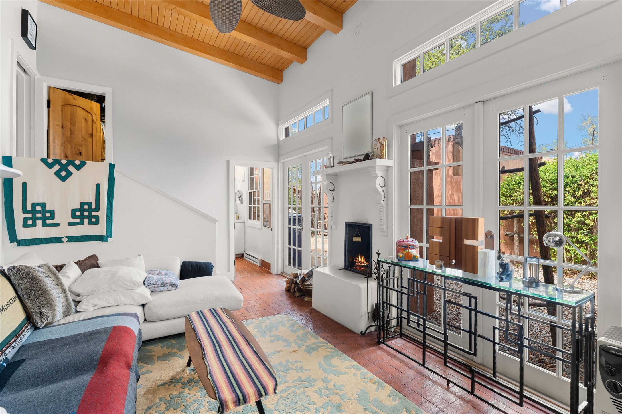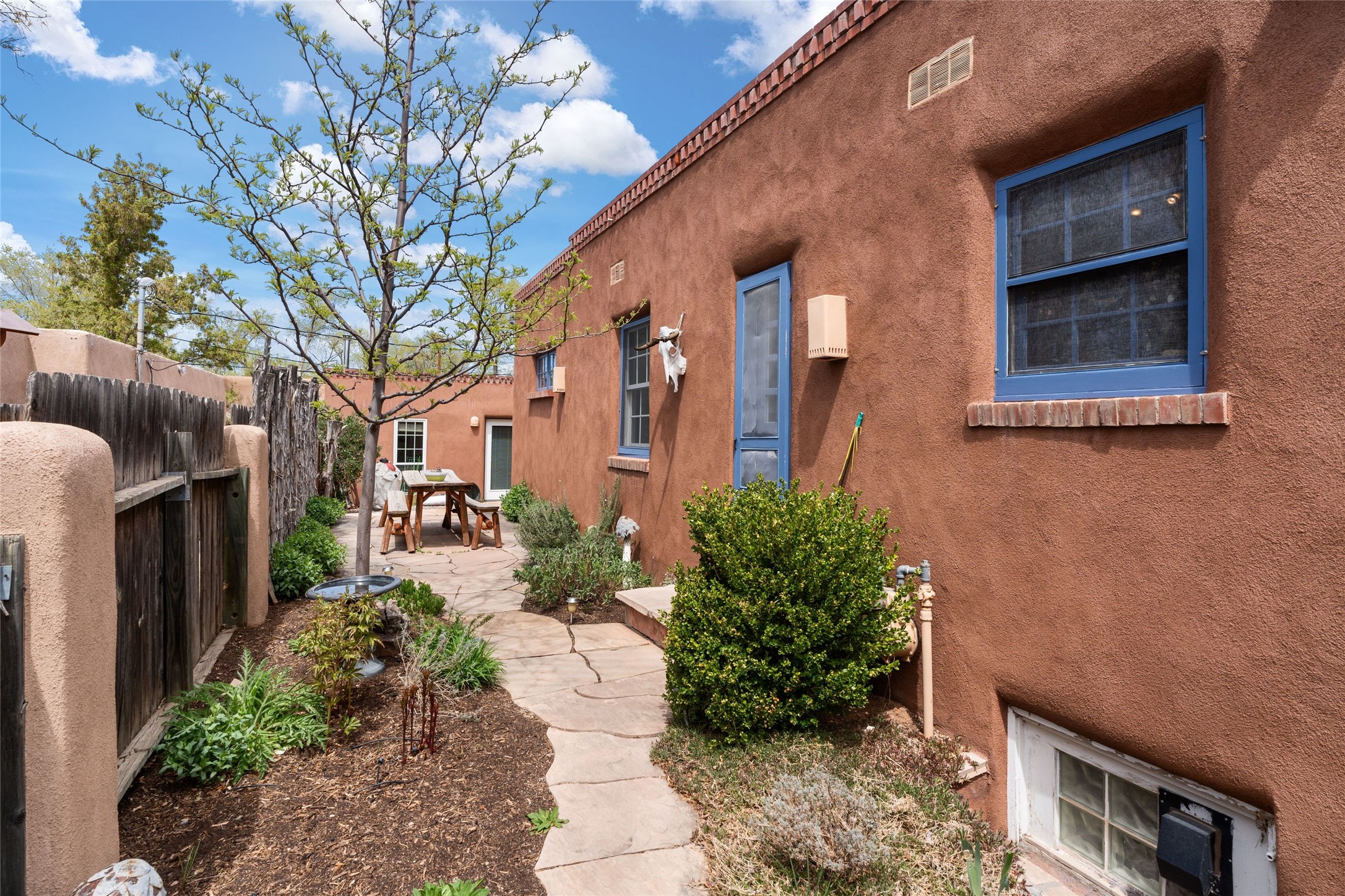 Perfect downtown pied--terre located in the heart of Santa Fe's South Capitol neighborhood. This residence combines classic architecture with modern amenities, creating an inviting atmosphere in a sought-after area. With 1,273 square feet, the main house features a thoughtfully designed layout that includes two spacious bedrooms and two bathrooms. The separate dining room offers an ideal space for gatherings, while the primary suite is a true highlight, complete with its own fireplace and French doors that open to a picturesque courtyard. Culinary enthusiasts will appreciate the well-appointed kitchen, which features a Wolf range and a built-in refrigerator. The charm extends beyond the main house with a detached guesthouse, offering 390 square feet of additional living space. This cozy retreat includes a kitchenette and a full bath, perfect for hosting visitors or enjoying personal time. Outside, the private courtyard showcases lush landscaping, featuring fruit trees that invites relaxation. It serves as a serene escape, ideal for unwinding amidst nature's beauty. An extra bonus is a basement with a washer/dryer and additional storage space. Off street parking for one car. Conveniently positioned in Santa Fe's Historic District, this property is just a stone's throw away from notable attractions, including the Roundhouse, Whole Foods, the Railyard, the Farmers Market, and the lively Santa Fe Plaza.