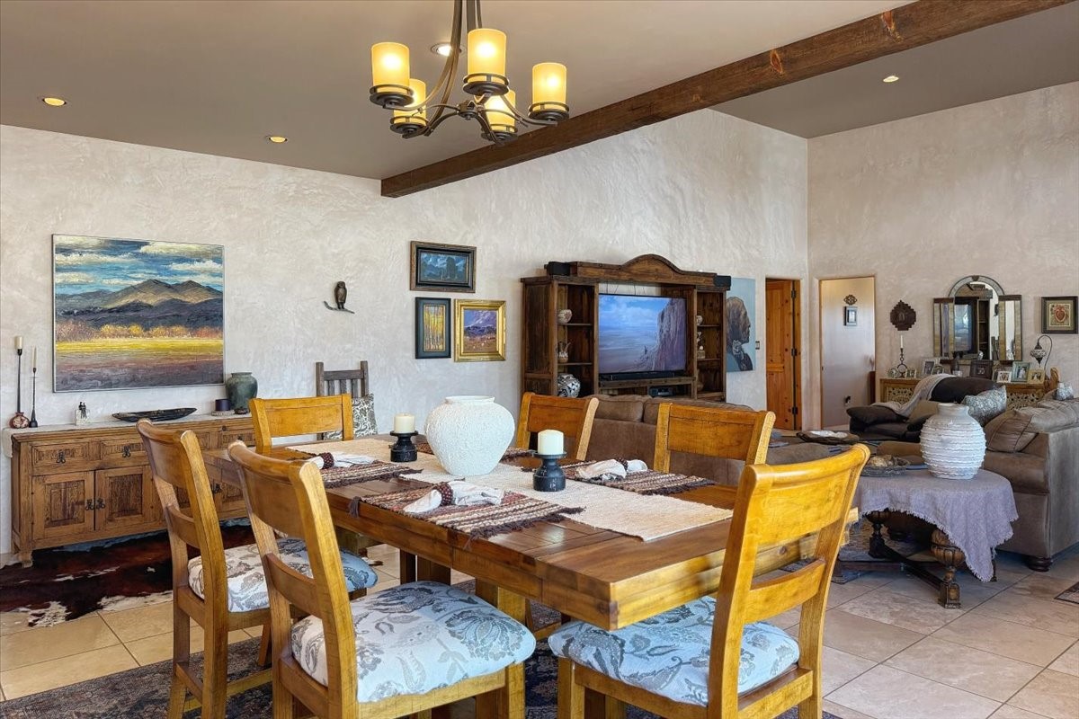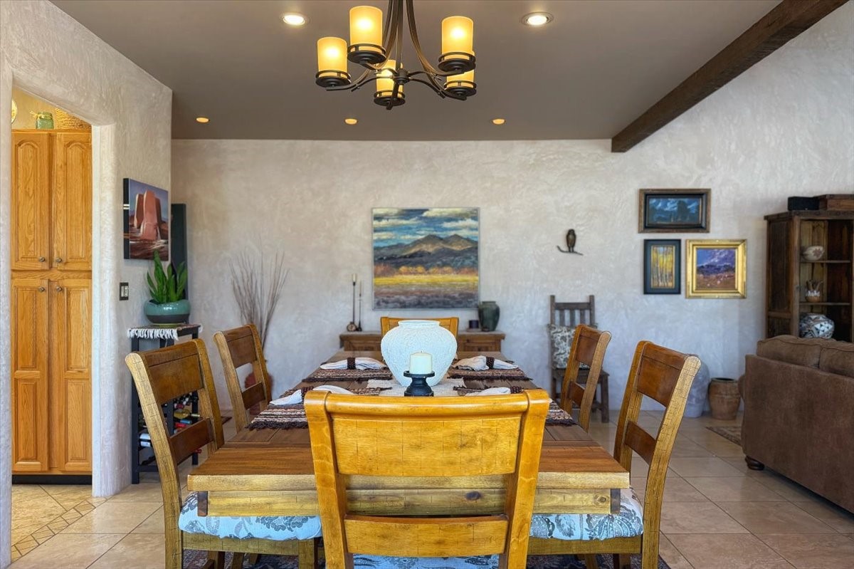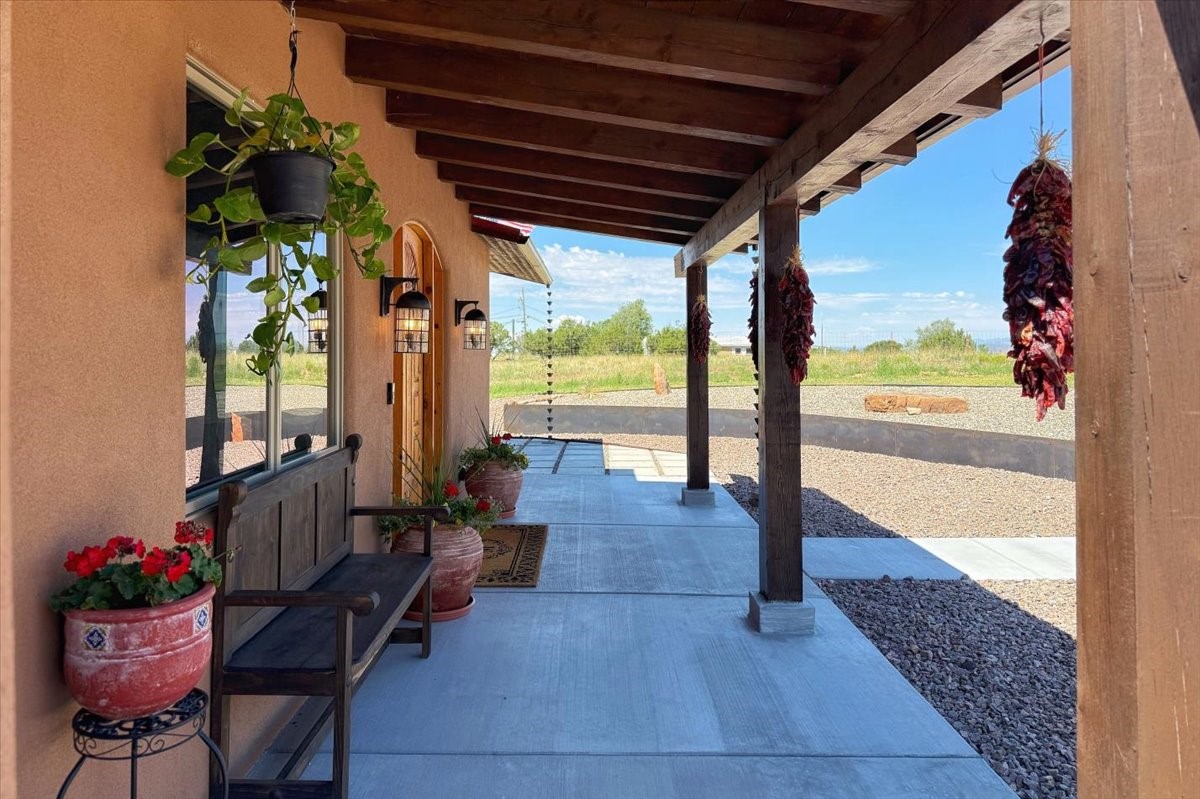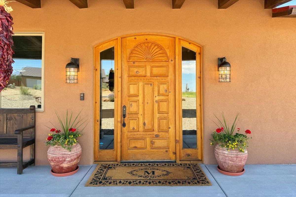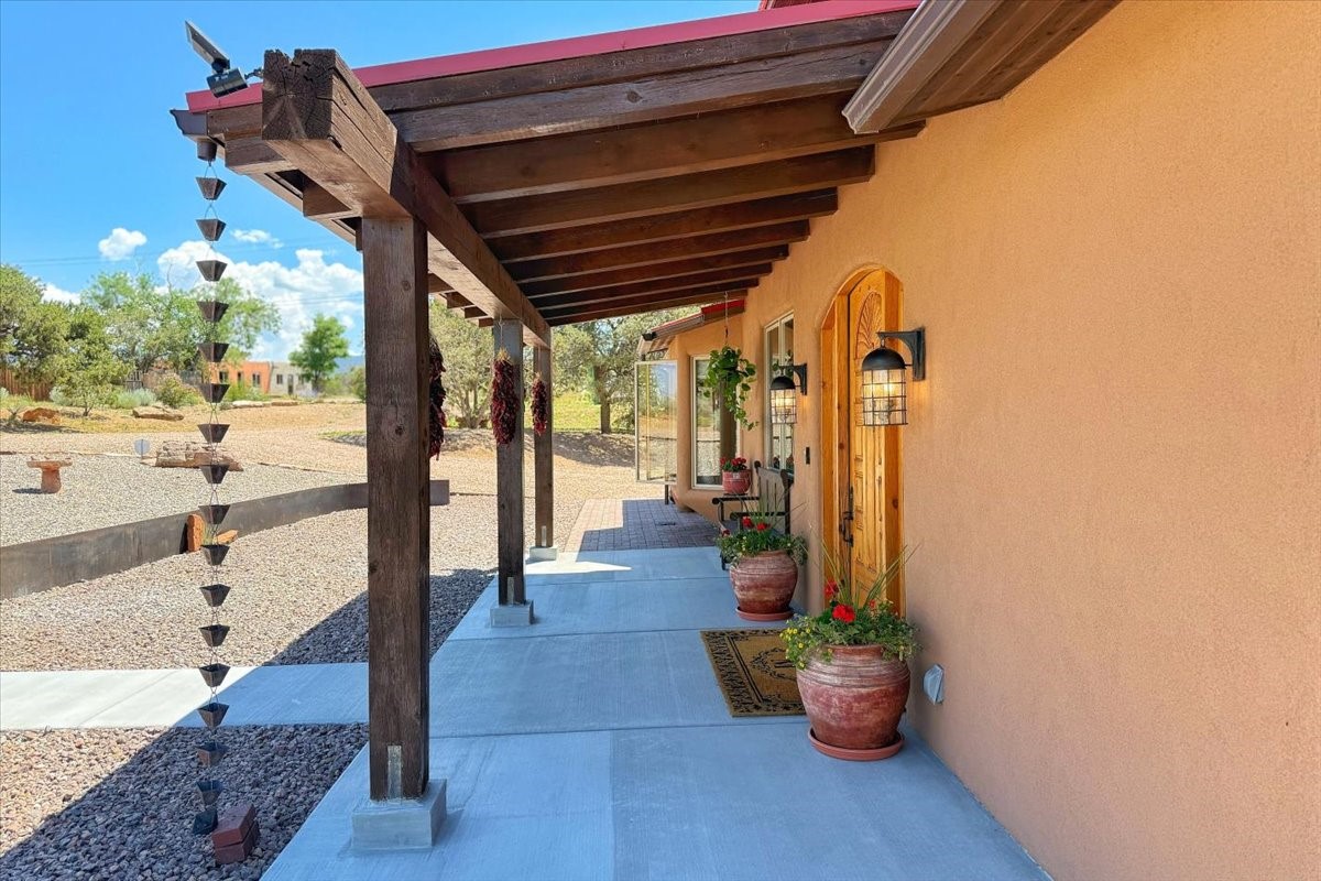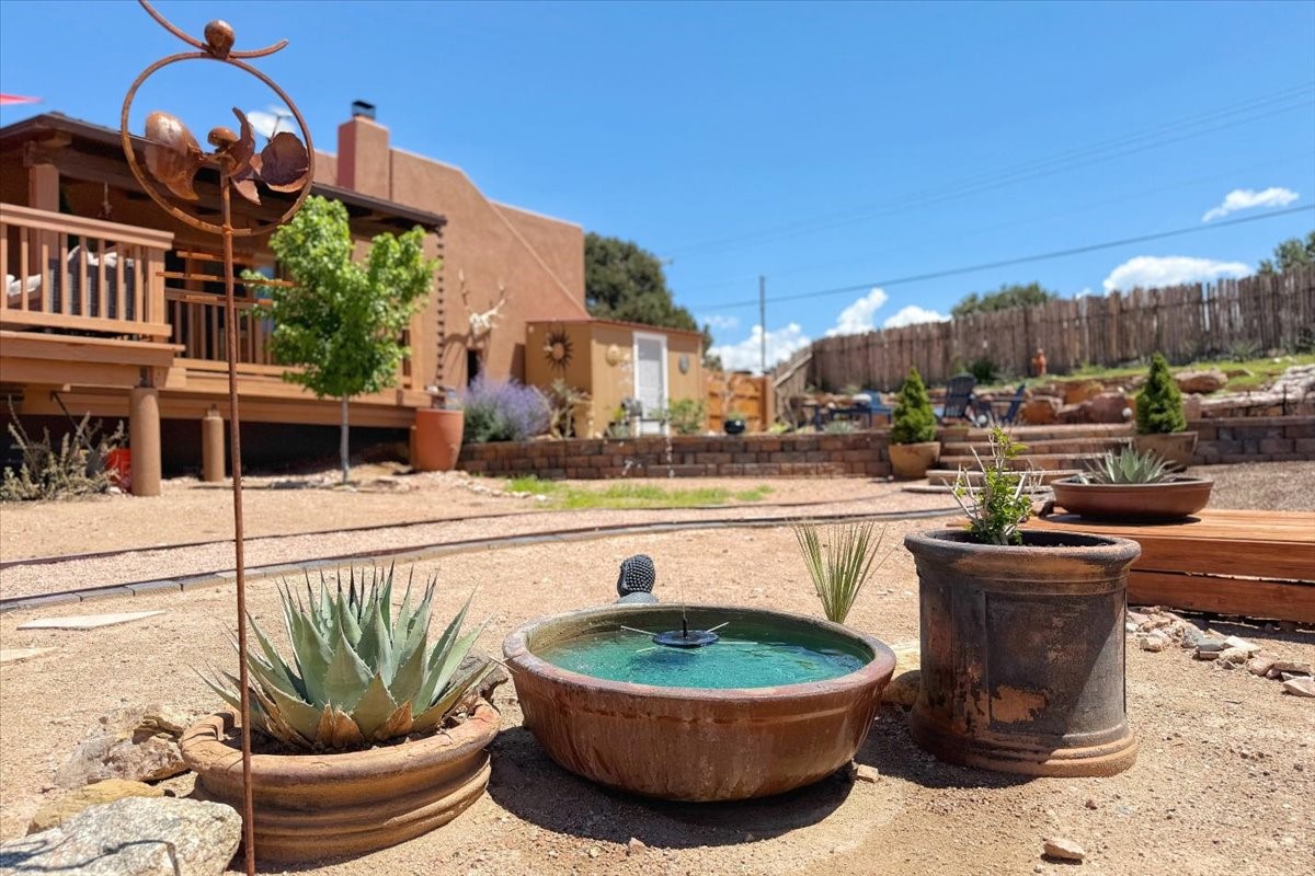 Discover this stunning updated home in the heart of Santa Fe on 1.4 acres of privacy, with Santa Fe touches and no HOA. This exquisite home boasts of natural light and plaster walls, 14' Ft. Ceilings, custom paint throughout, natural stone flooring in living room and kitchen, beautiful kitchen has granite counter tops, 6-burner Jenn Air range, brand newSmart-Double oven, Dual pane windows, updated flooring in every bedroom, all bedrooms have private suites, updated fixtures, two of three tubs are jetted, it's time to relax when you walk into your large primary suite, two separate walk-in closets, Kiva fireplace, each side of the bathroom has custom vessel sinks, separate shower, double doors that will lead you onto the brand new deck, radiant floor heating throughout including heating the garage for those cold nights, 6-zone heating zone, indoor laundry room, tankless water heater, New RO system, New water softener, New stucco 2024 with transferable warranty, propanol roof, stairs that lead you onto the TPO roof above the garage walk on up the stairs enjoy a 360 degree view of Sangre Cristo Mountains, walking and biking trails, new coyote fence and landscaping, new gas fire pit for those cozy nights, new concrete front patio, new screen doors, private well, new well pump, this home offers both luxury and convenience, 10 minutes from the plaza and major shopping. See attached list of upgrades. This home is turnkey and complete. Schedule your private tour today!