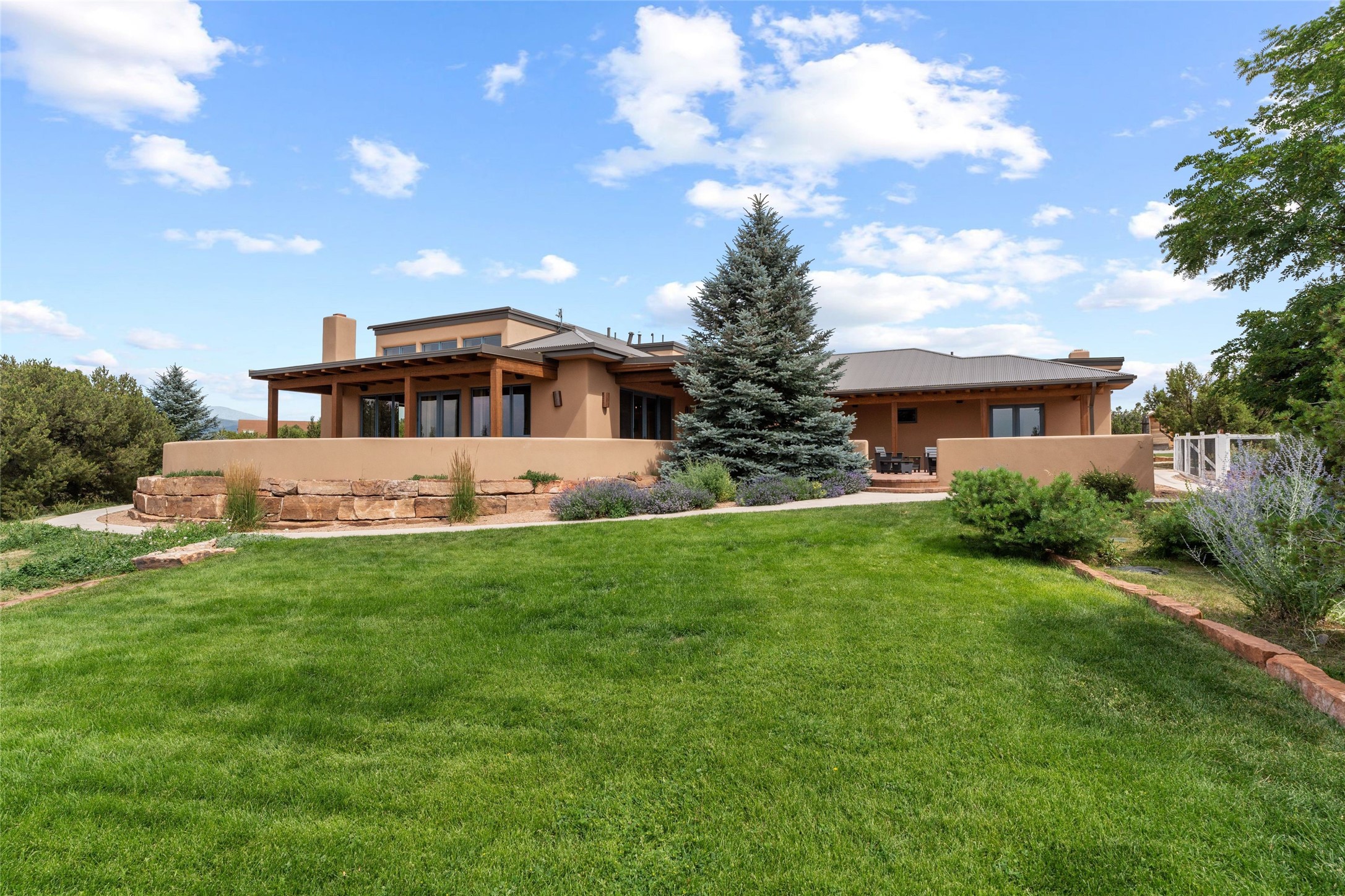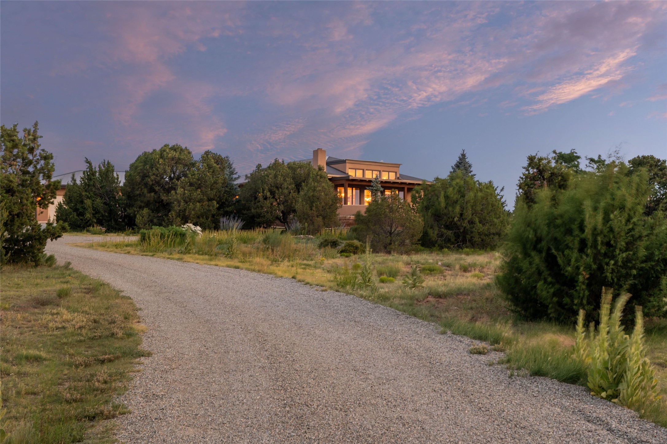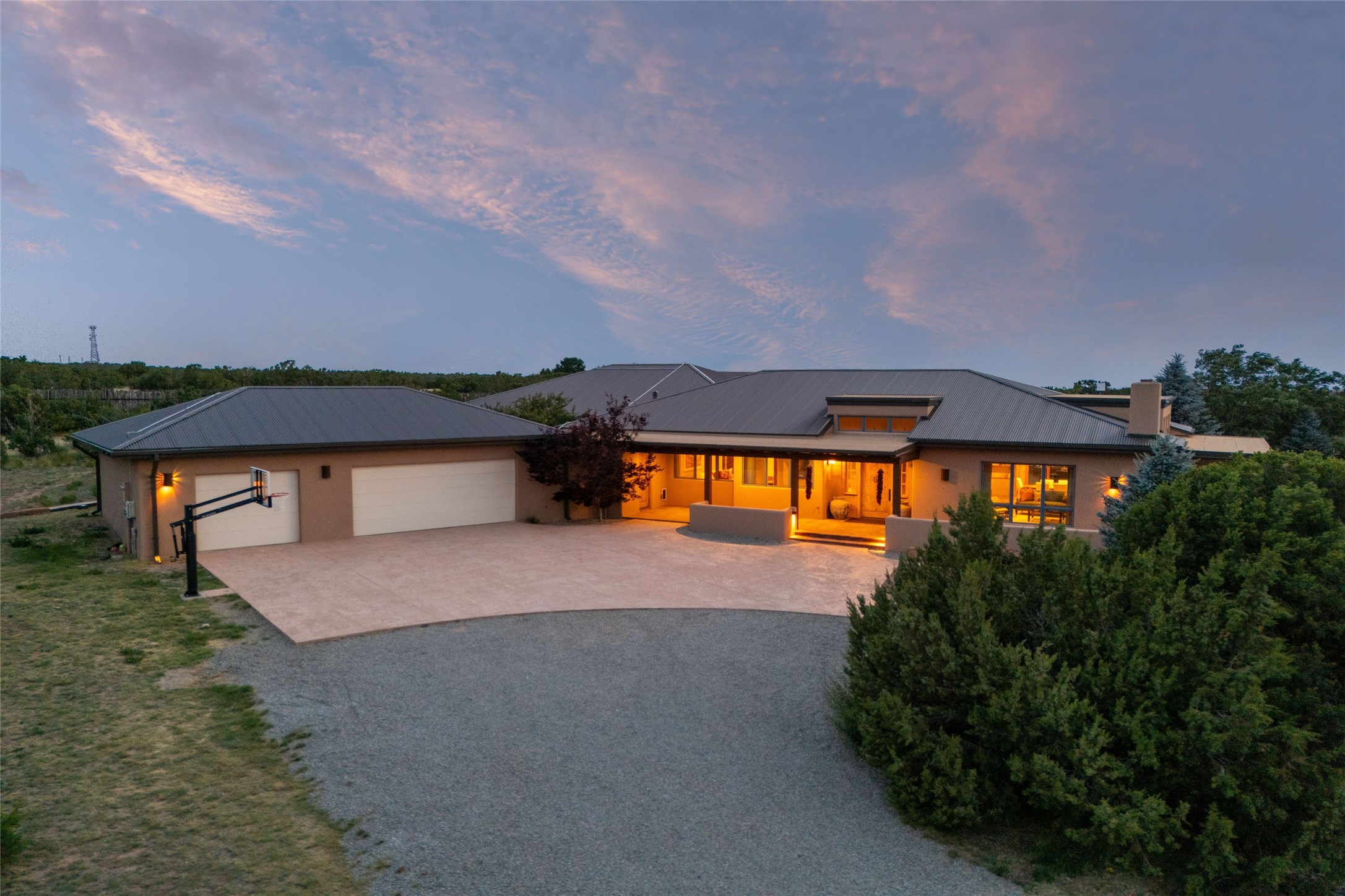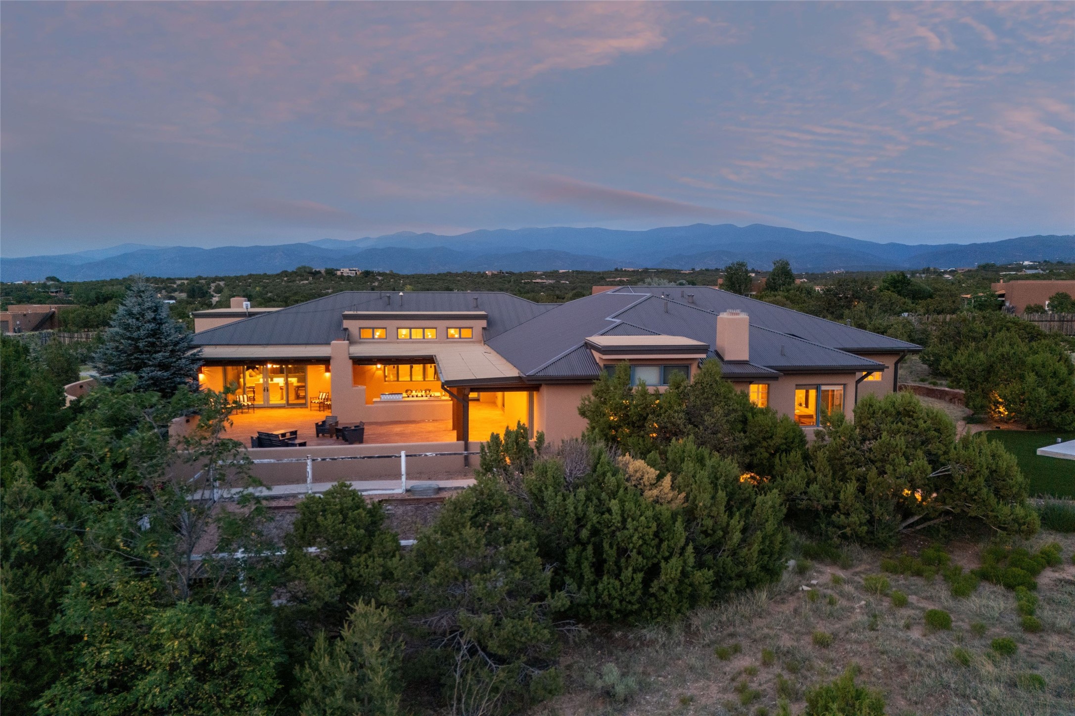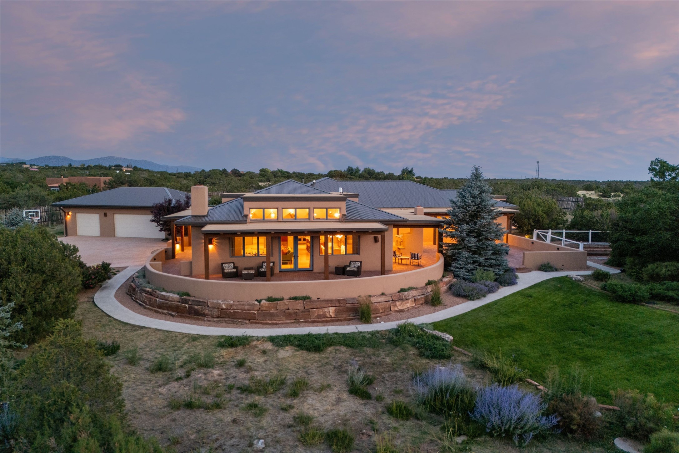 Northern New Mexican style 5-bedroom, 4.5-bath custom-built 5,200 sq. ft. home spanning over 2.5 acres offers panoramic 180-degree views that stretch from the majestic Sangre de Cristo Mountains to the captivating Badlands and Los Alamos.Positioned at the end of a private, gated drive and surrounded by an 8-foot-high coyote fence, this residence is a true entertainer's delight. The open floor plan flows effortlessly into spacious covered and uncovered patios, ideal for hosting both intimate gatherings and grand celebrations. Crafted by Driscoll Construction in 2015, the home showcases bespoke design elements, including custom solid wood doors, white oak flooring, and elegant plaster walls throughout the common areas and primary suite. Enjoy the warmth of three fireplaces, including one on the expansive 1,500 sq. ft. portal, where you can relish both sunrise and sunset vistas.The gourmet kitchen invites culinary creativity with its generous center island, clerestory windows, premium appliances, and double dishwashers. Prioritize wellness with a primary bath steam shower, a 300 sq. ft. gym, an outdoor 6-person sauna, a vegetable garden on drip irrigation, and a fully enclosed chicken coop.Additional highlights include a pitched metal roof, an oversized 3-car garage, photovoltaic solar energy, and rainwater harvesting. Recent upgrades in 2023 encompass new stucco, water filtration, a dog run, and an outdoor grill. Enjoy convenient access to downtown Santa Fe, all while embracing the serene beauty of this exceptional property.